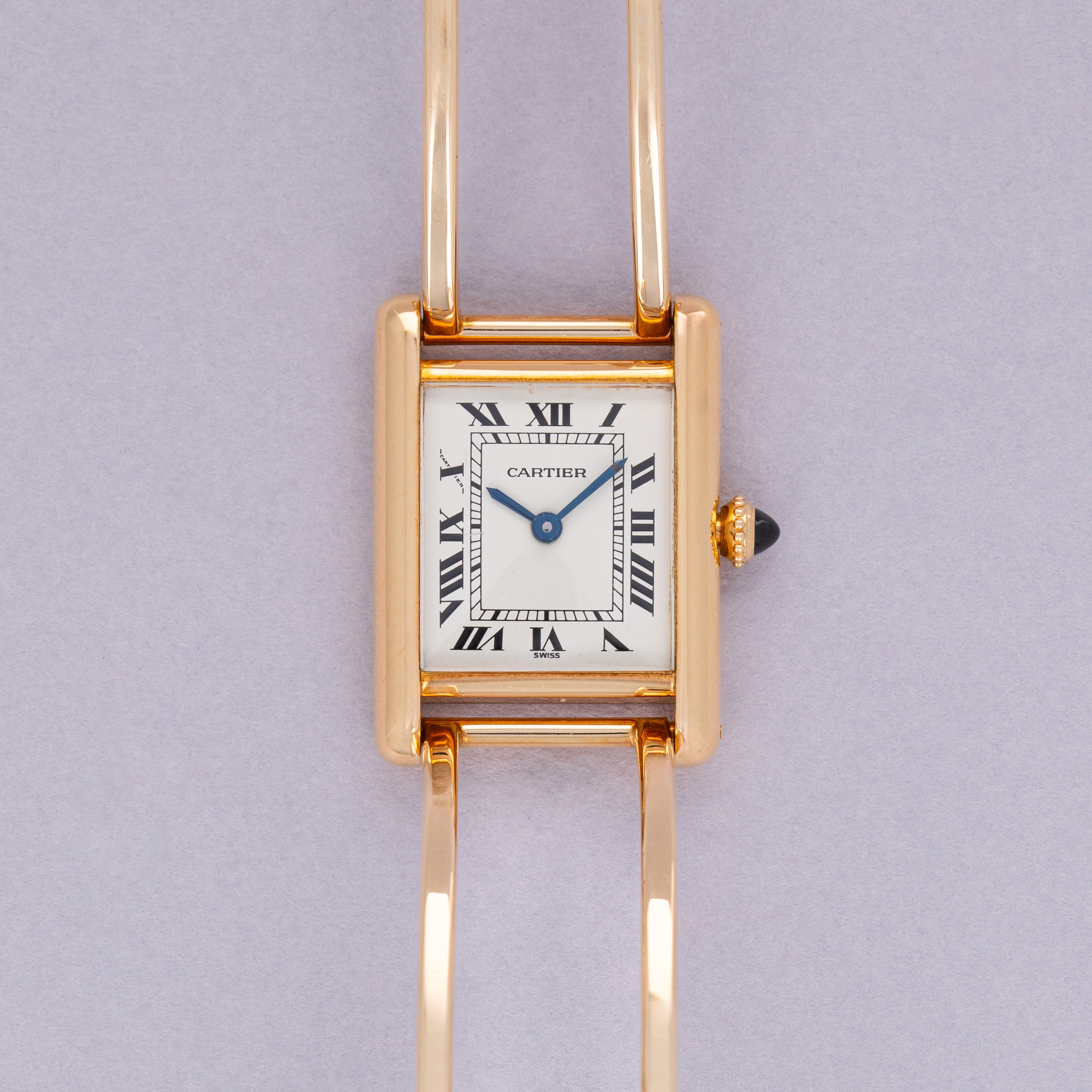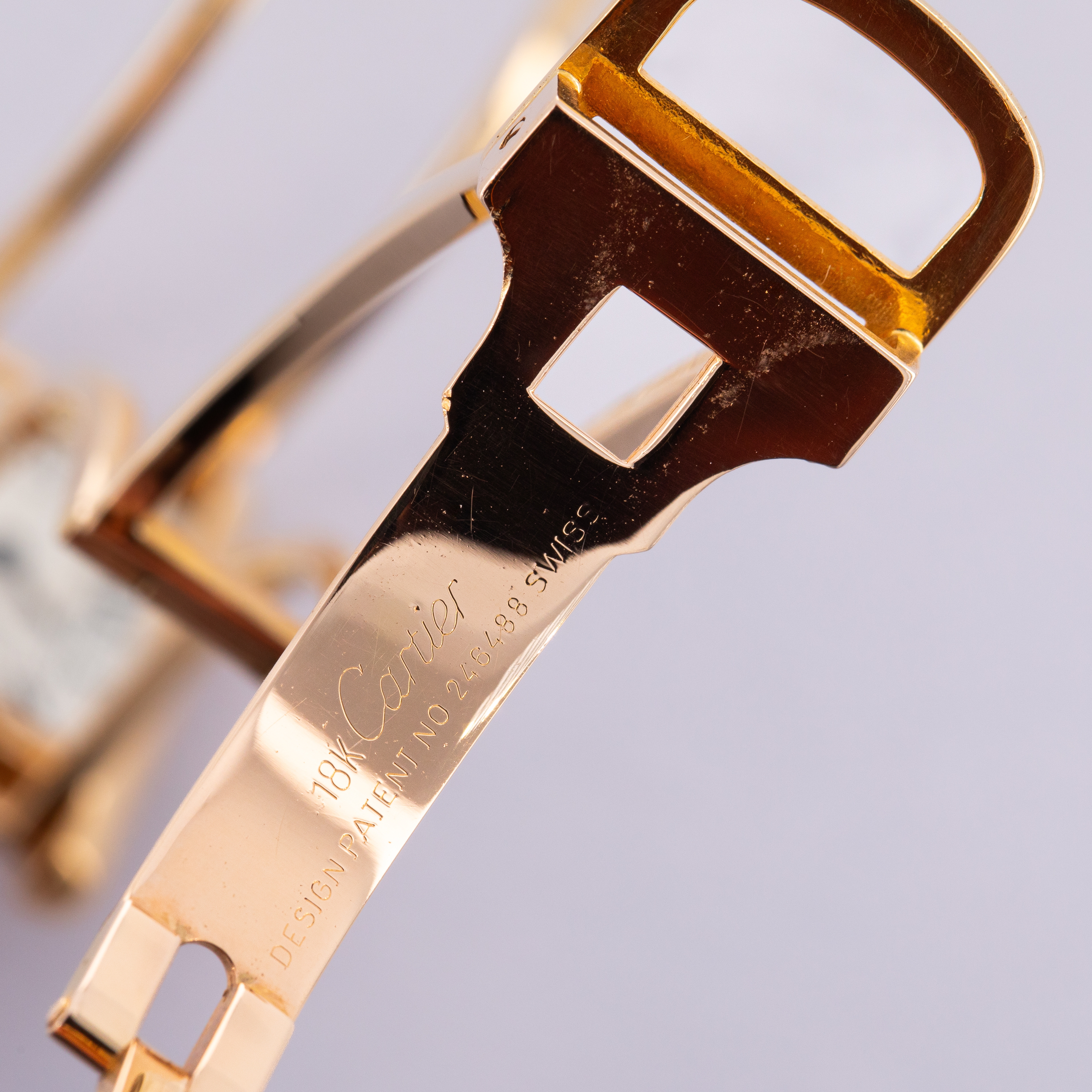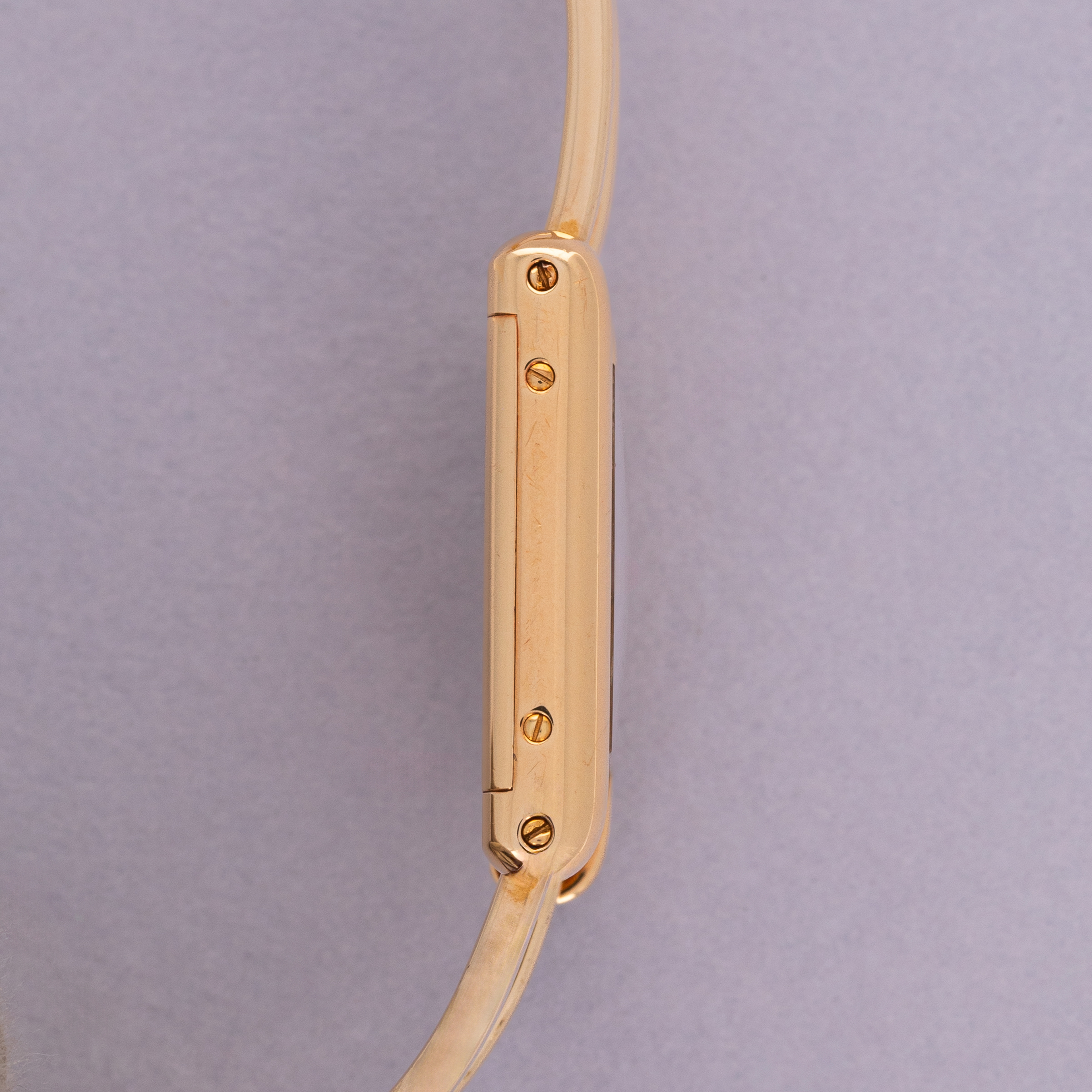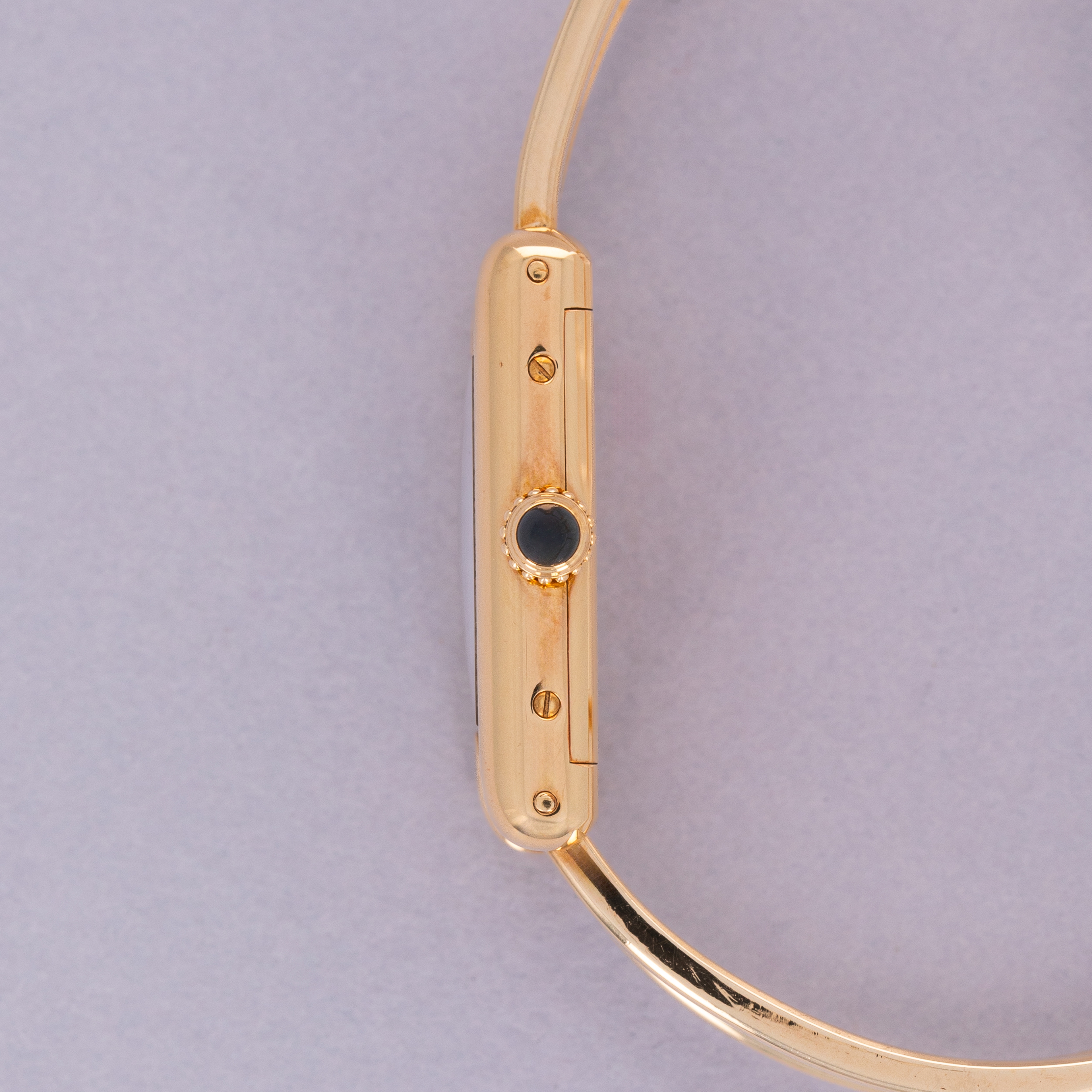 Offered as the smaller of the two Tank Louis options at the time, the ref. 78087 is 28mm x 20mm, making it slightly more svelte than its big brother, the ref. 78086. Adding some presence to its otherwise understated 18kt yellow gld construction, however, this example is offered on a custom 18kt yellow gold bangle-style bracelet that closes using a Cartier deployant clasp.
