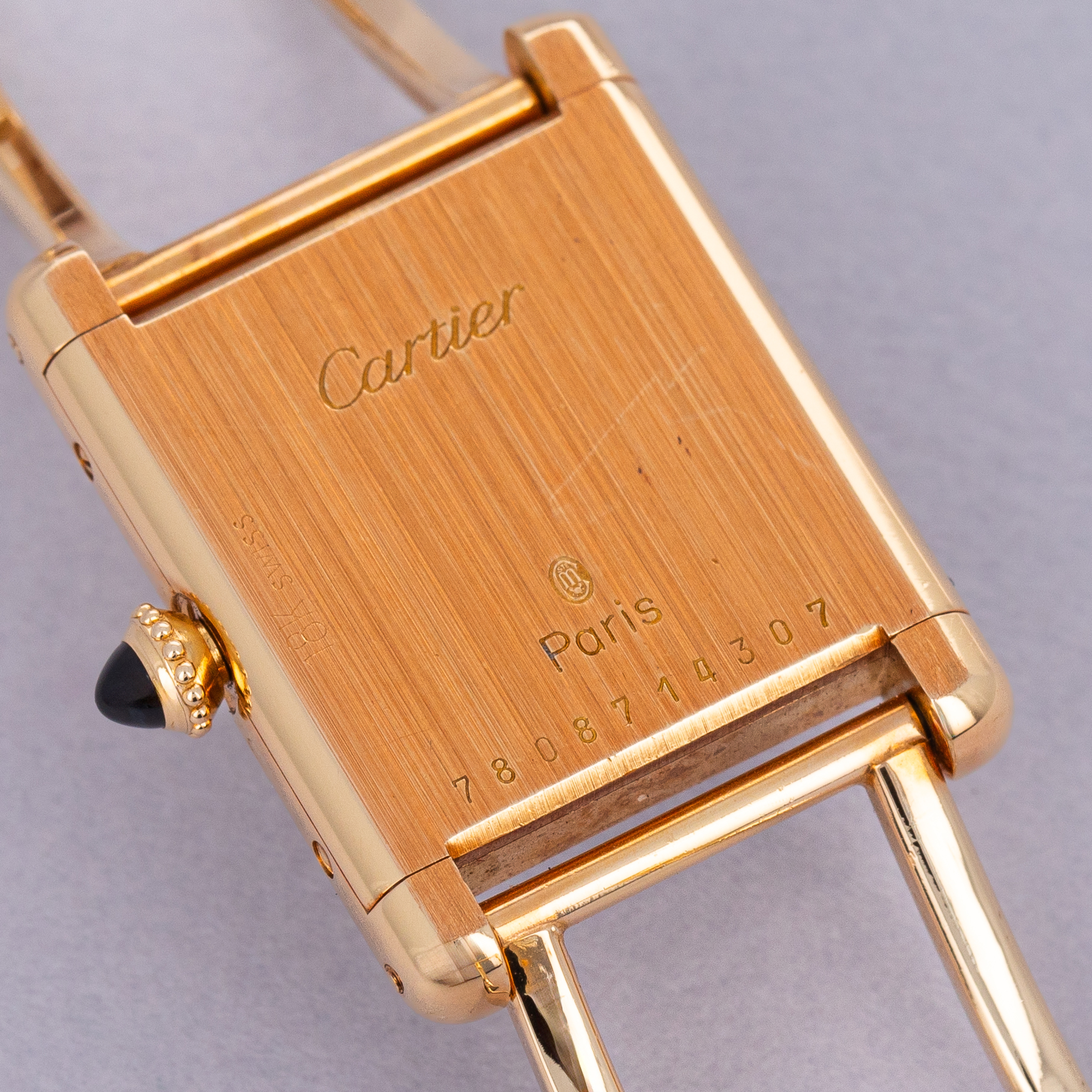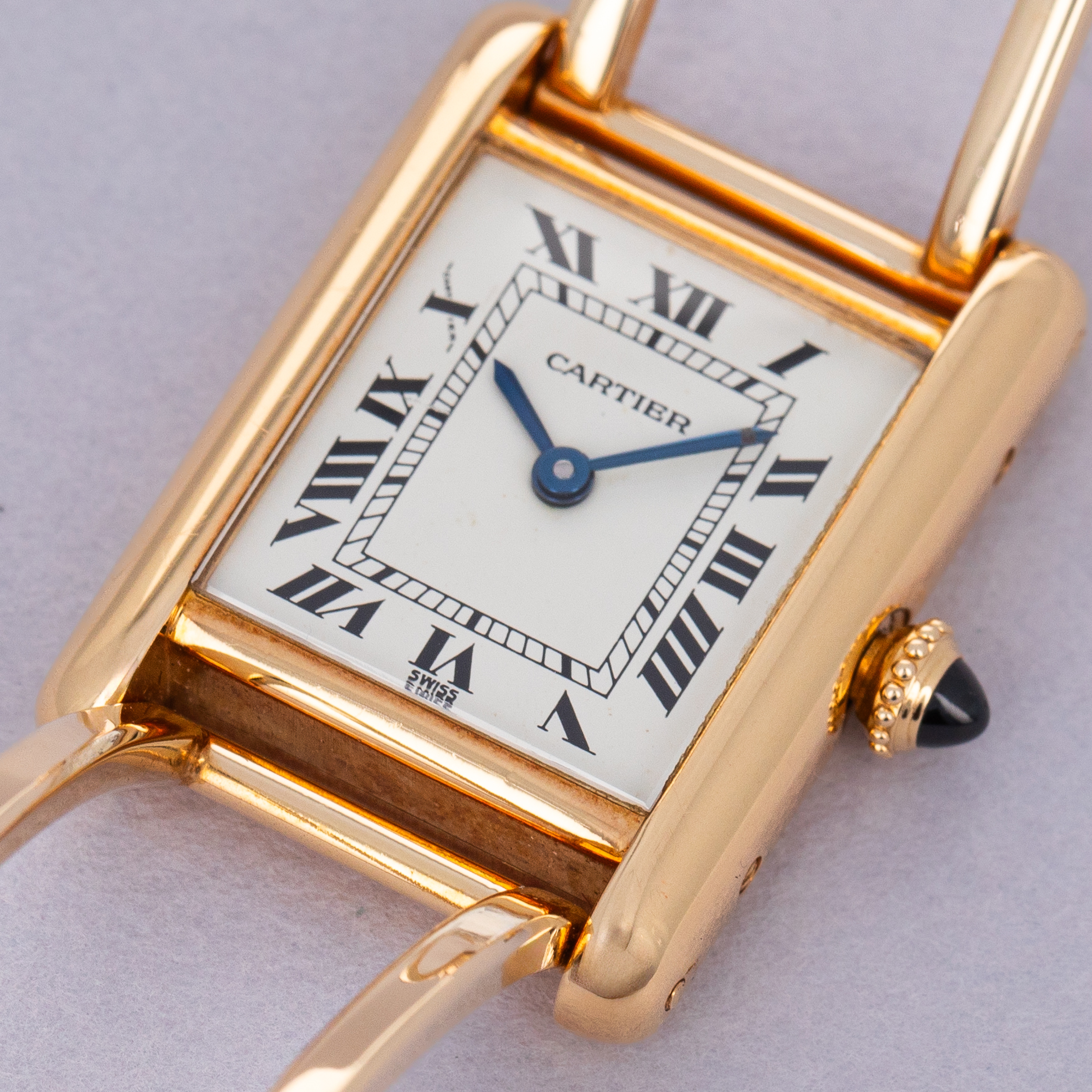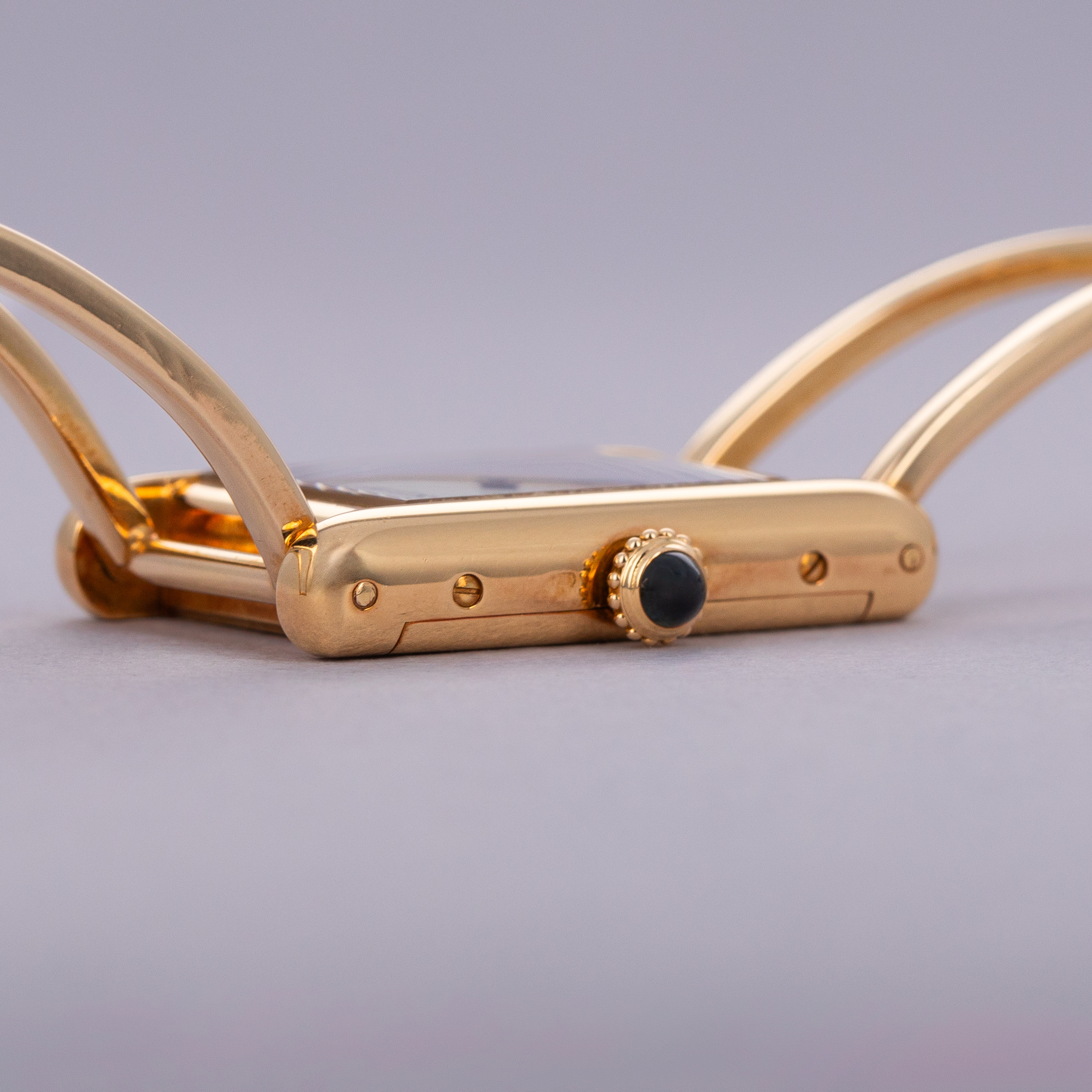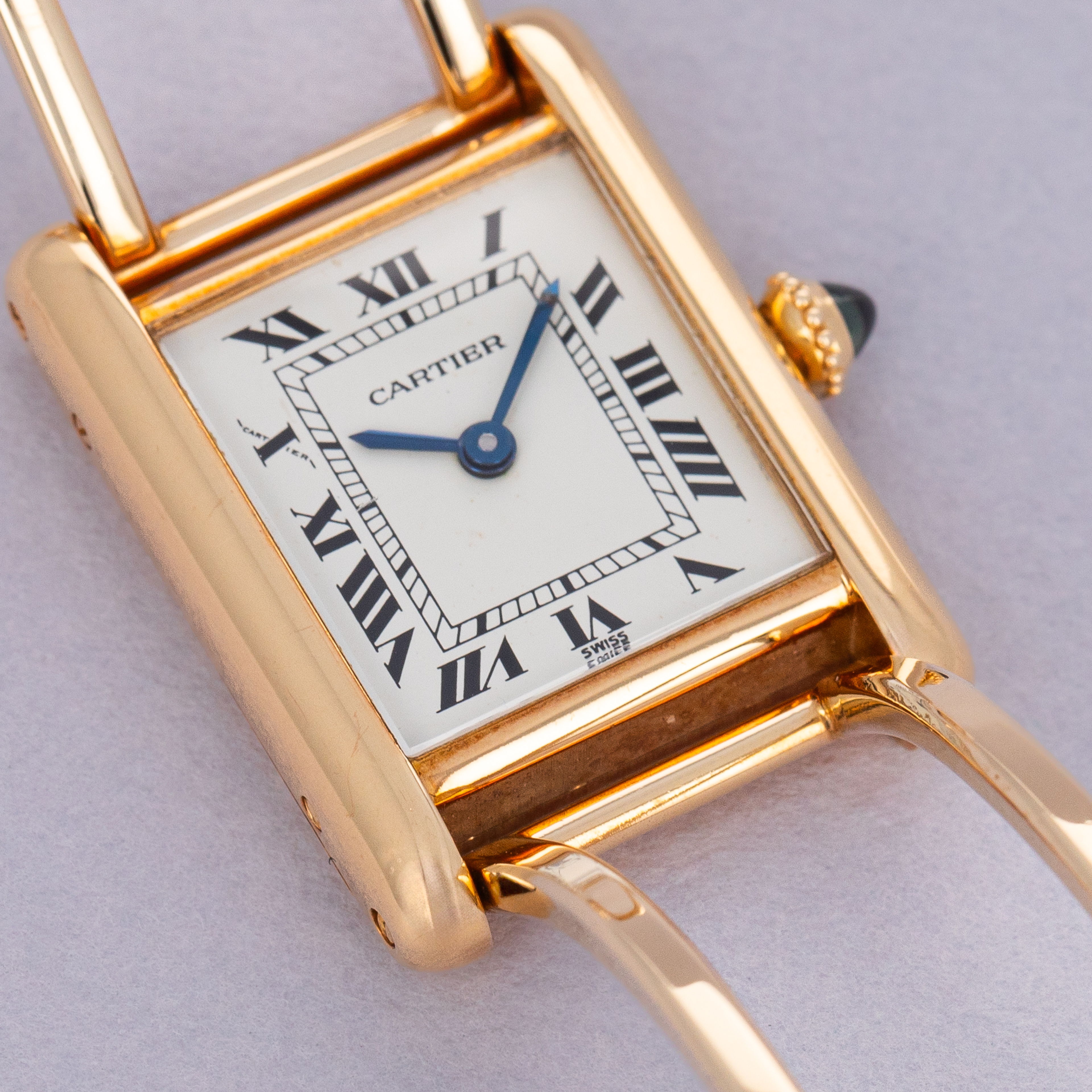 Offered as the smaller of the two Tank Louis options at the time, the ref. 78087 is 28mm x 20mm, making it slightly more svelte than its big brother, the ref. 78086. Adding some presence to its otherwise understated 18kt yellow gld construction, however, this example is offered on a custom 18kt yellow gold bangle-style bracelet that closes using a Cartier deployant clasp.