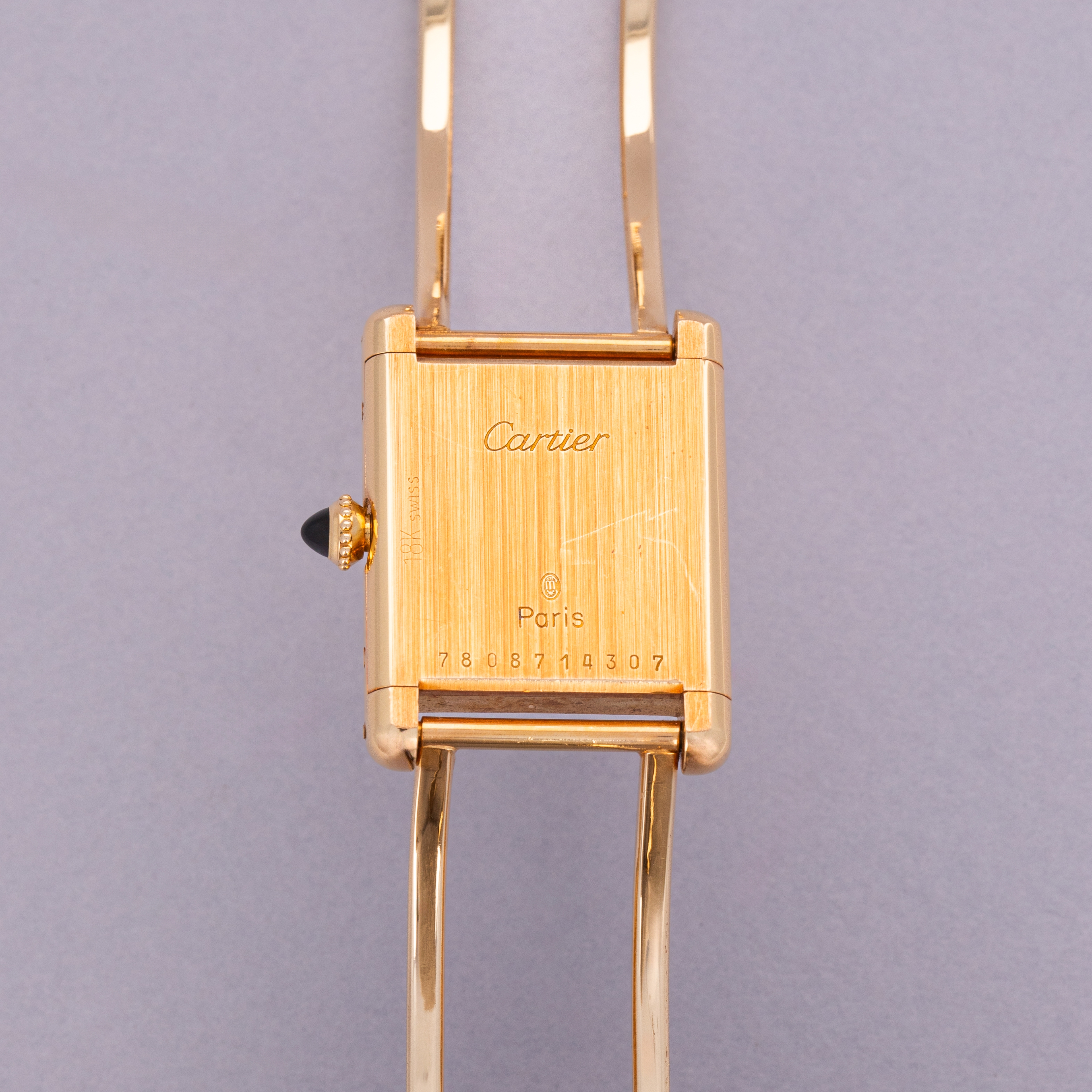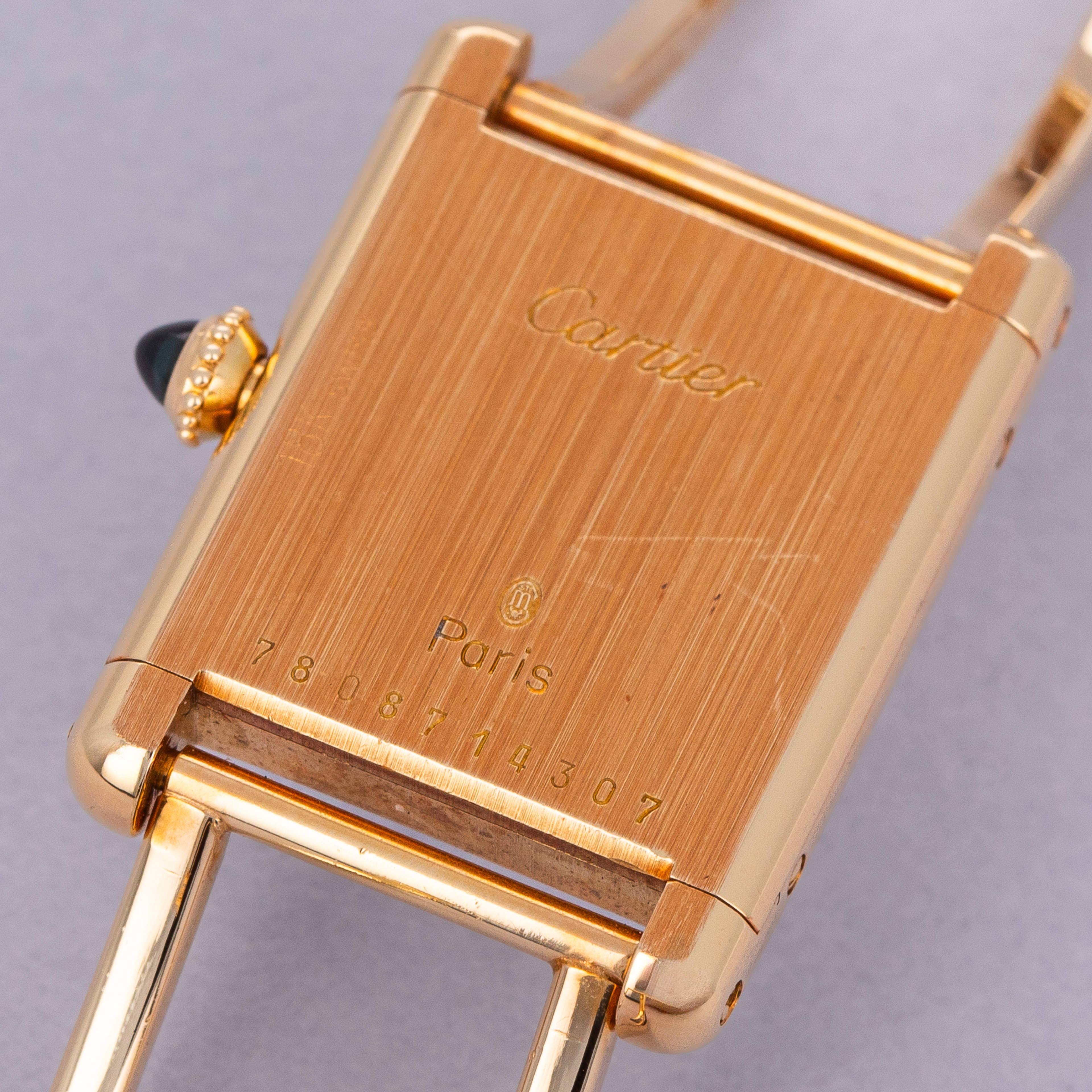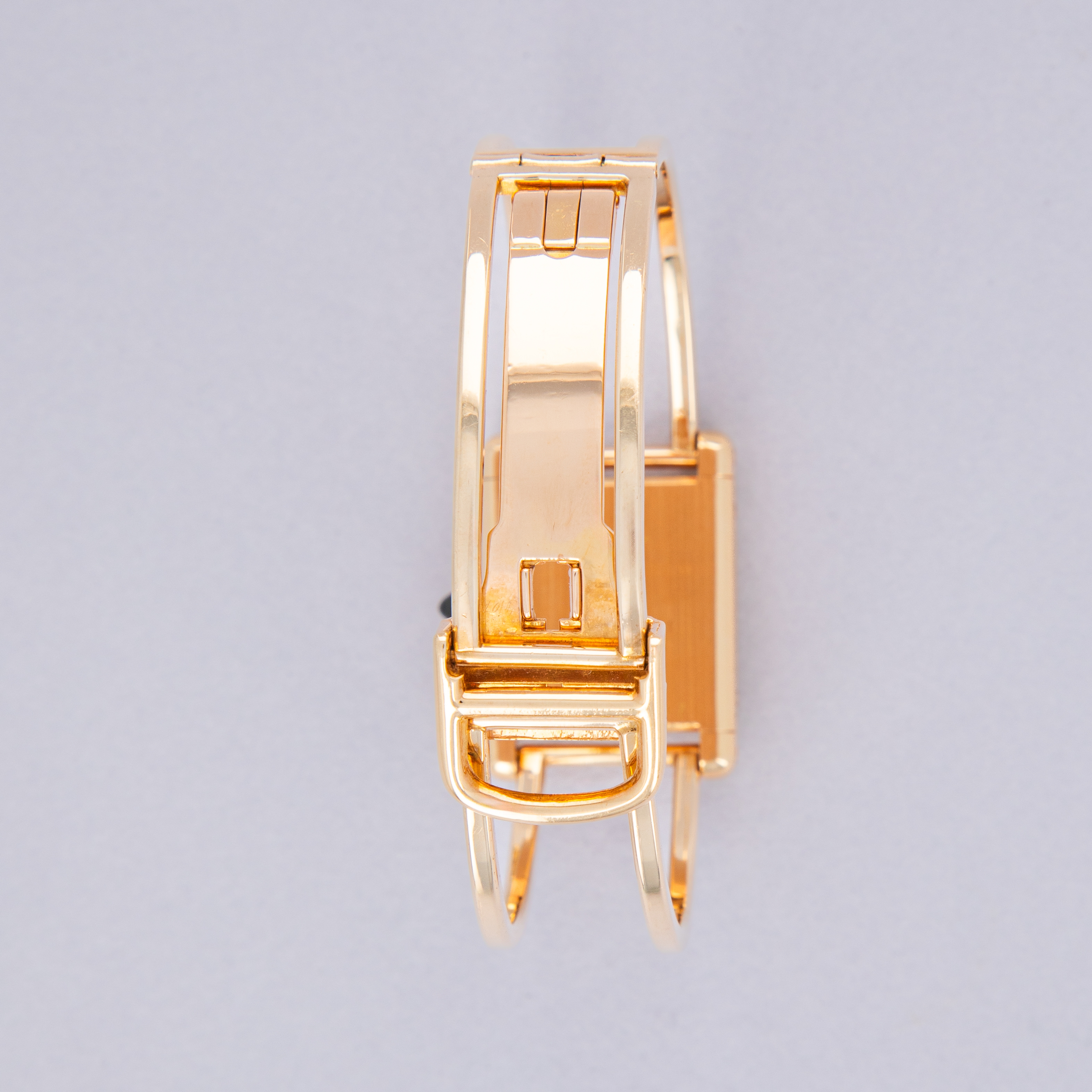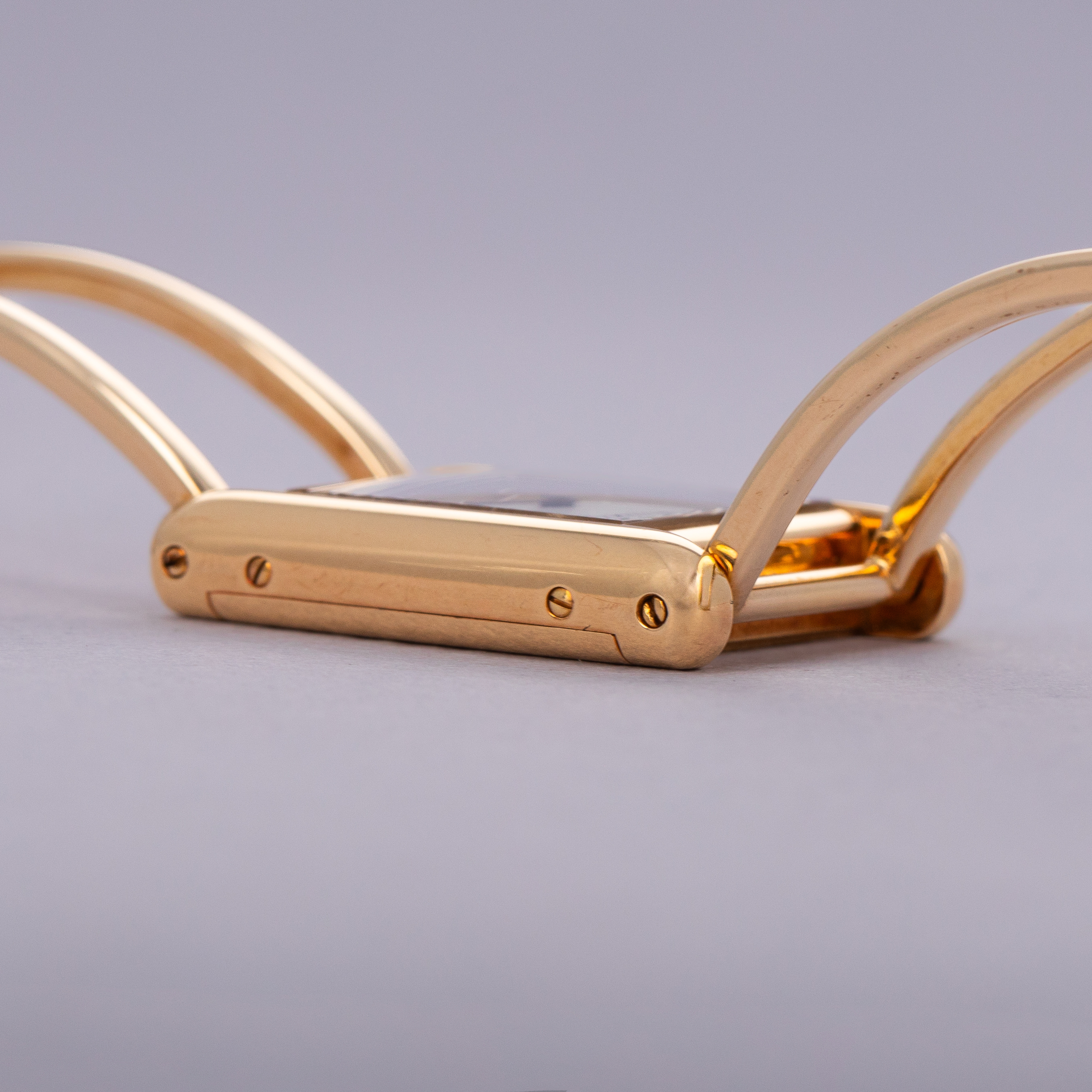 Offered as the smaller of the two Tank Louis options at the time, the ref. 78087 is 28mm x 20mm, making it slightly more svelte than its big brother, the ref. 78086. Adding some presence to its otherwise understated 18kt yellow gld construction, however, this example is offered on a custom 18kt yellow gold bangle-style bracelet that closes using a Cartier deployant clasp.