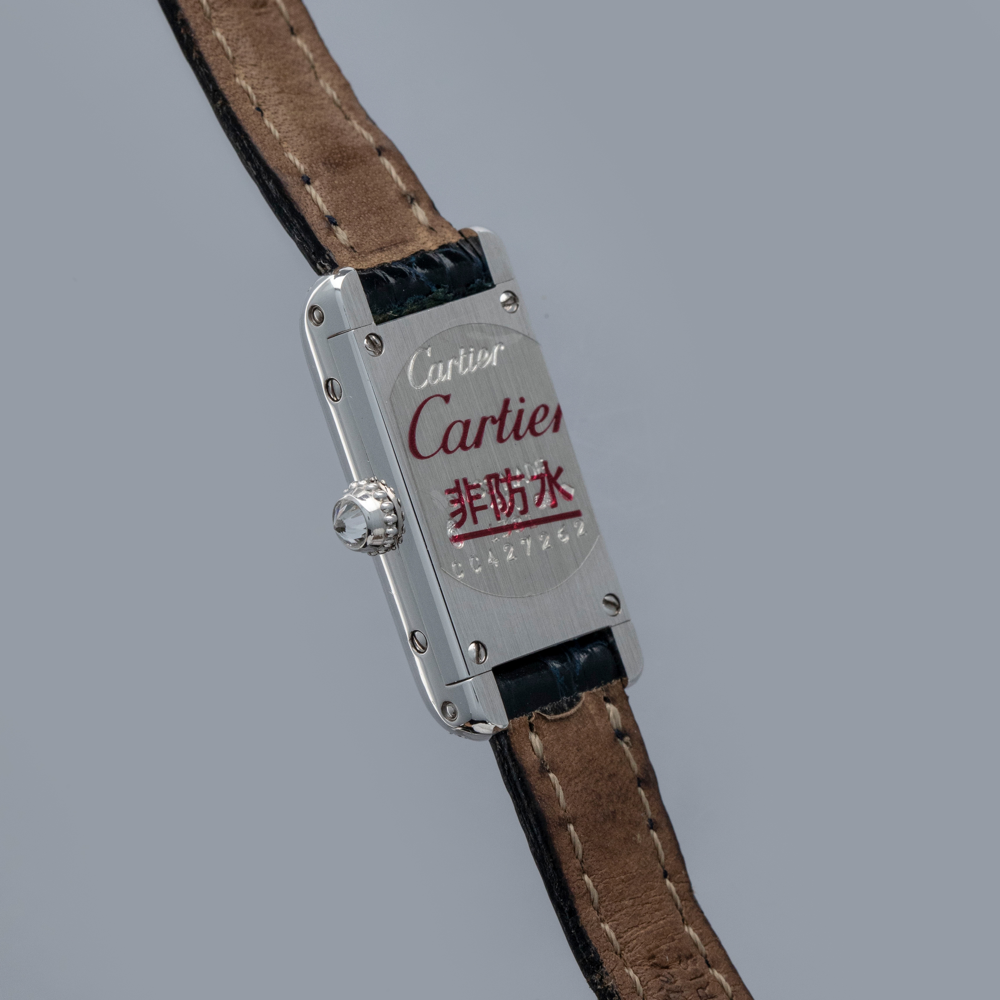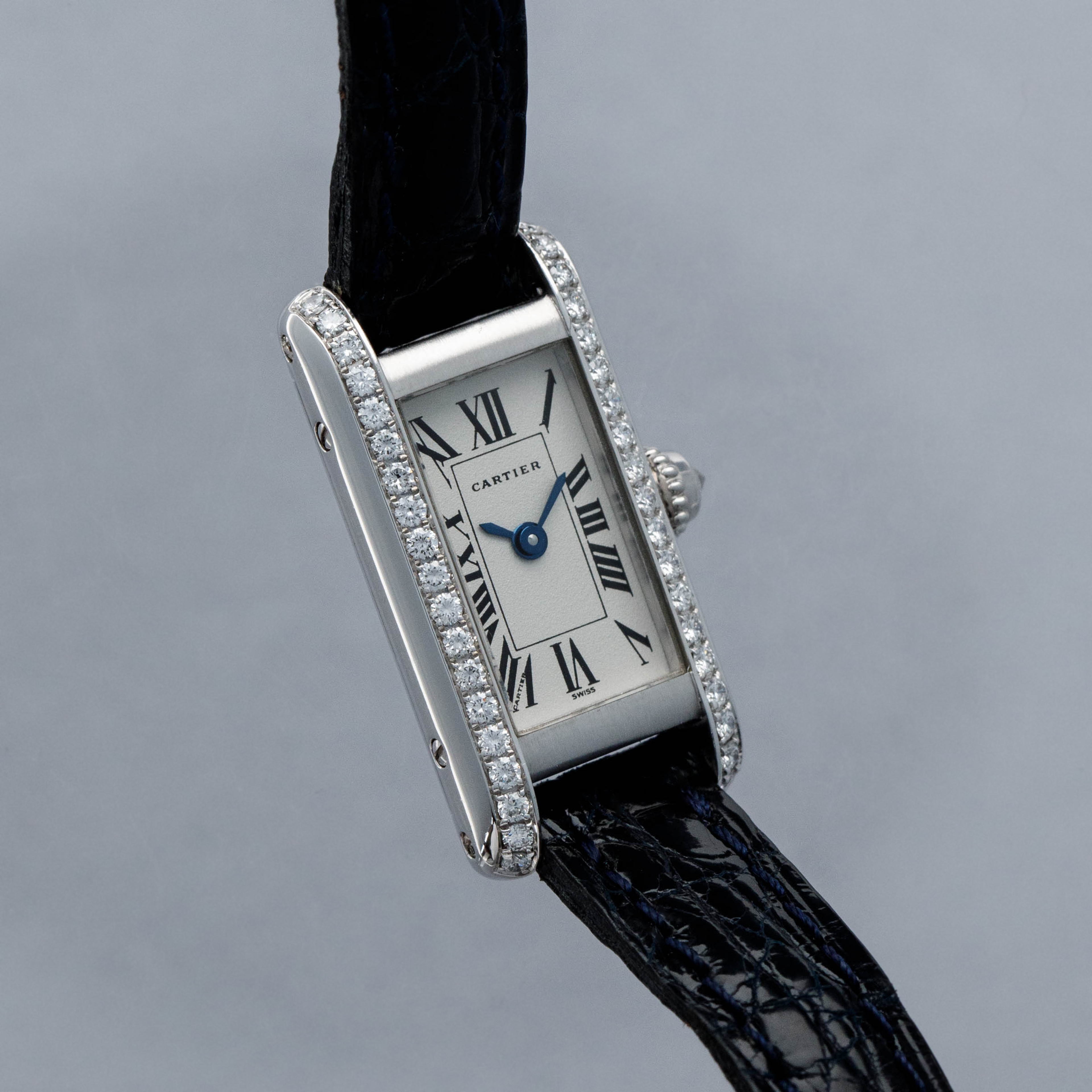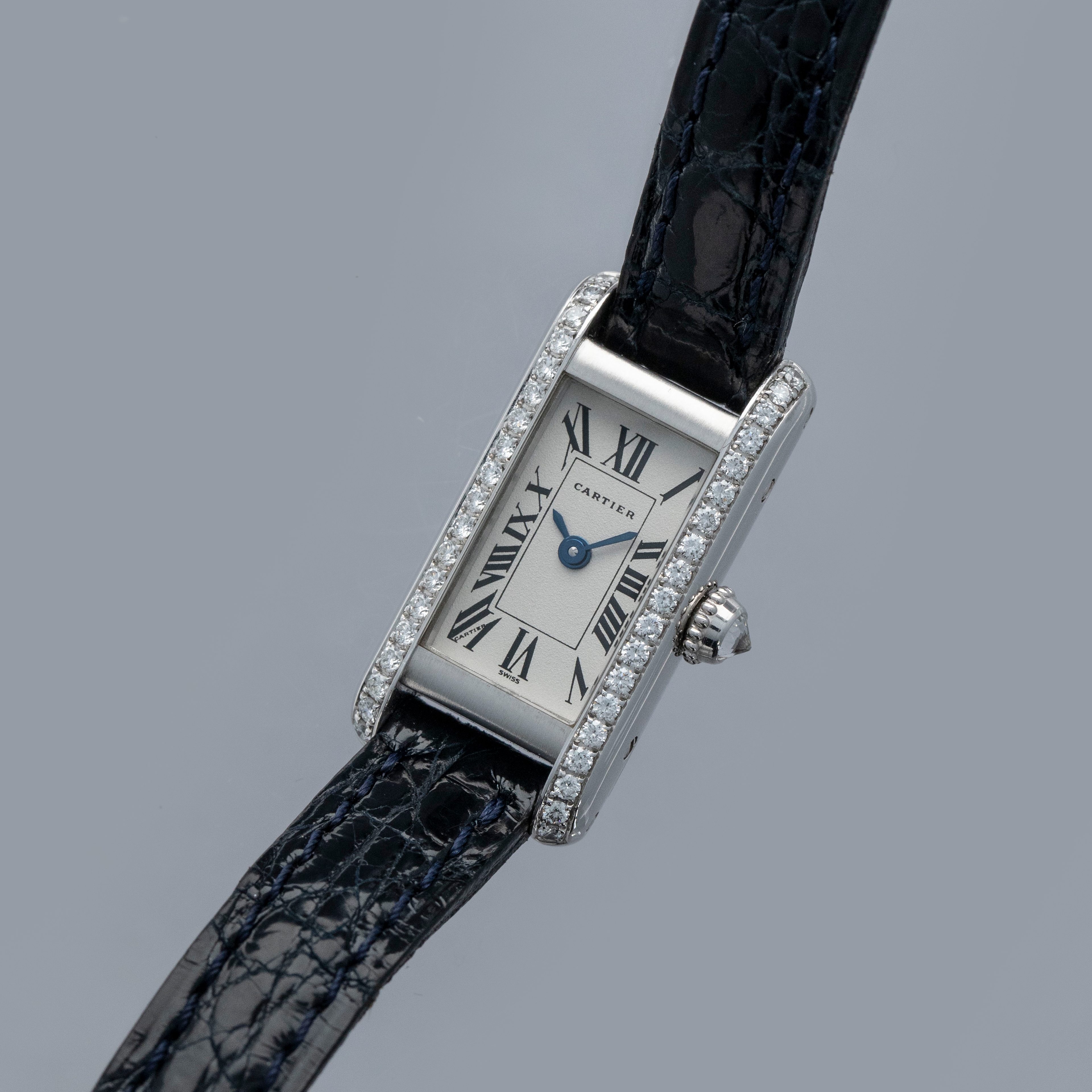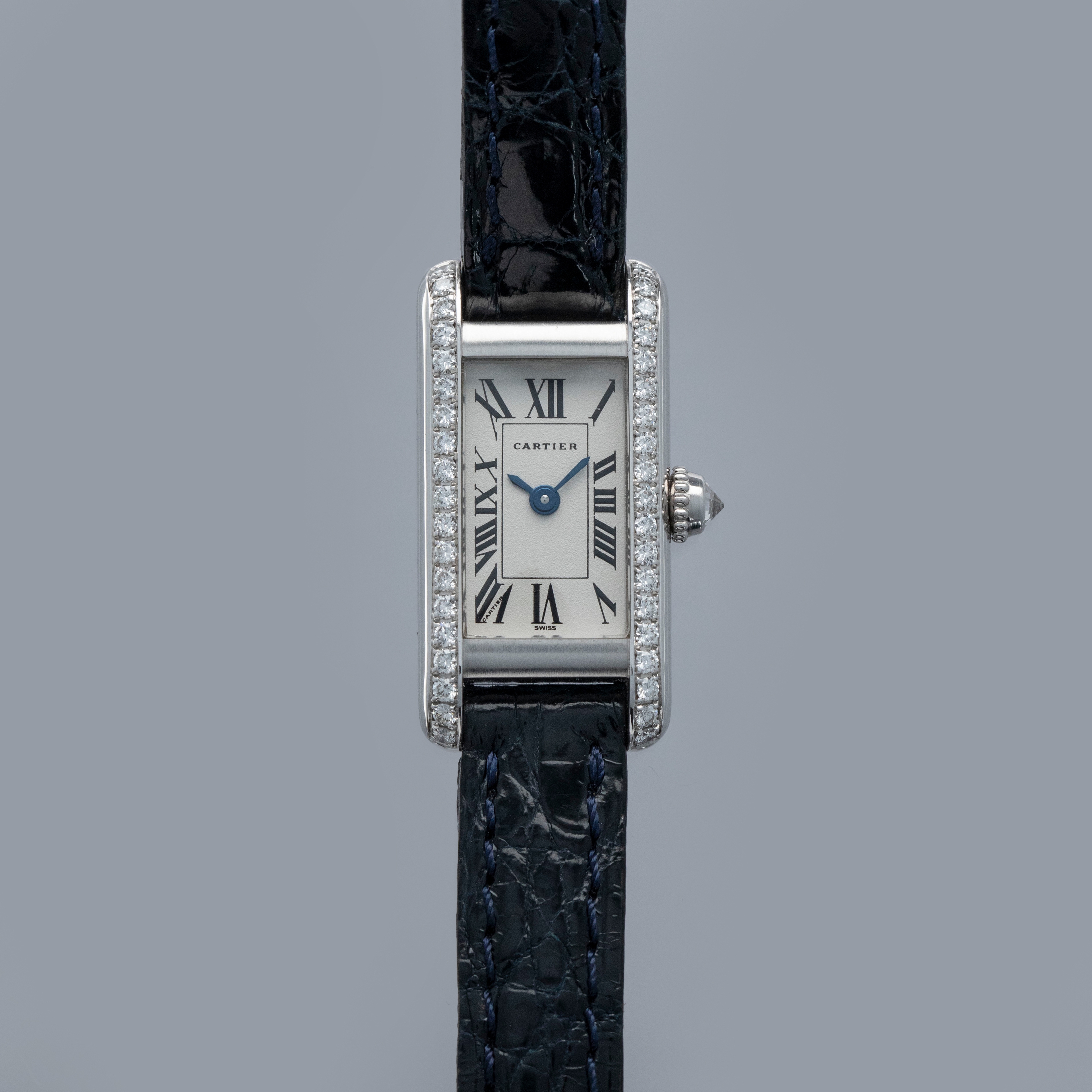 Made of 18kt white gold, the Tank Mini's svelte 14.5mm-wide, diamond-set case will stand the test of time as a truly timeless piece of horological design, thanks to its iconic heritage.