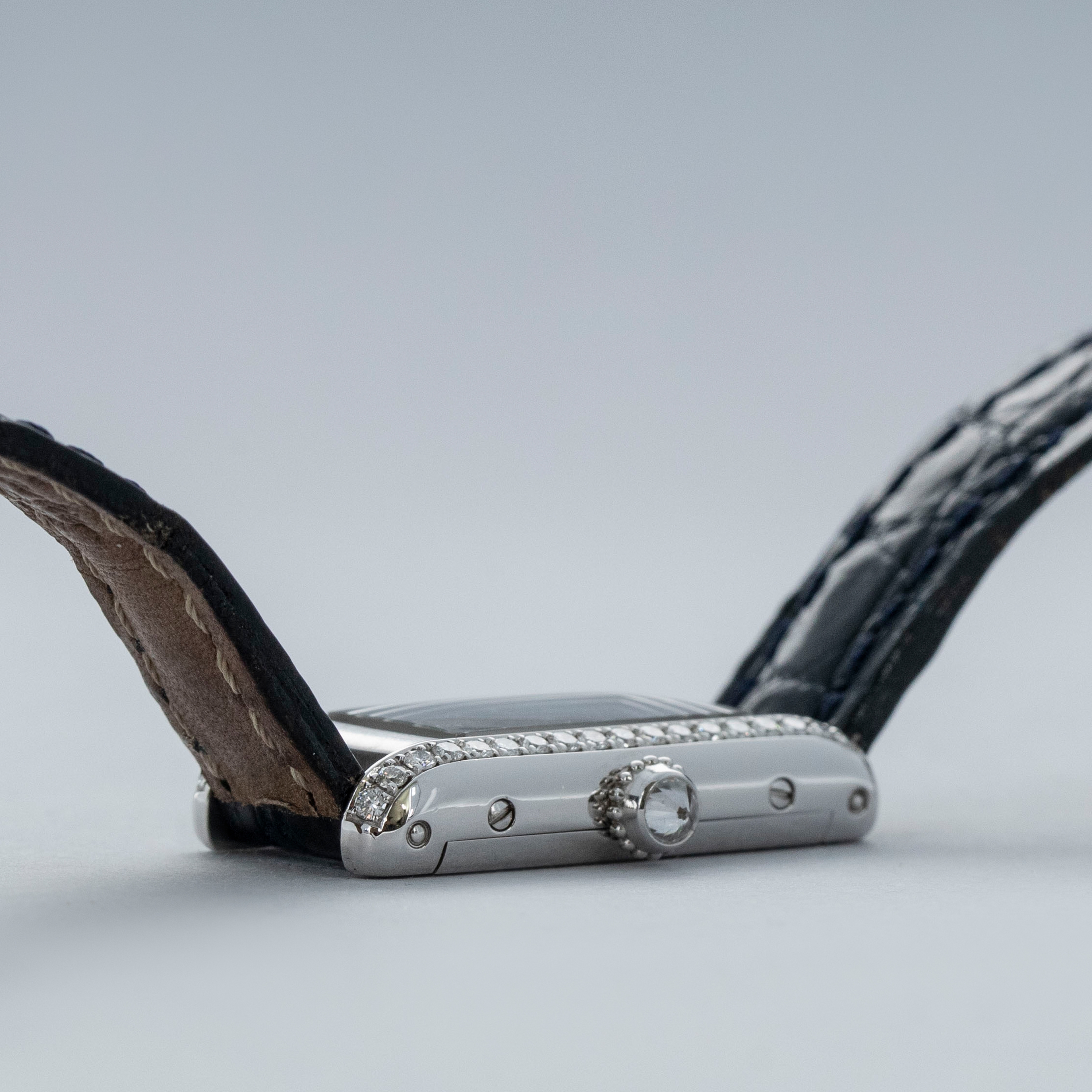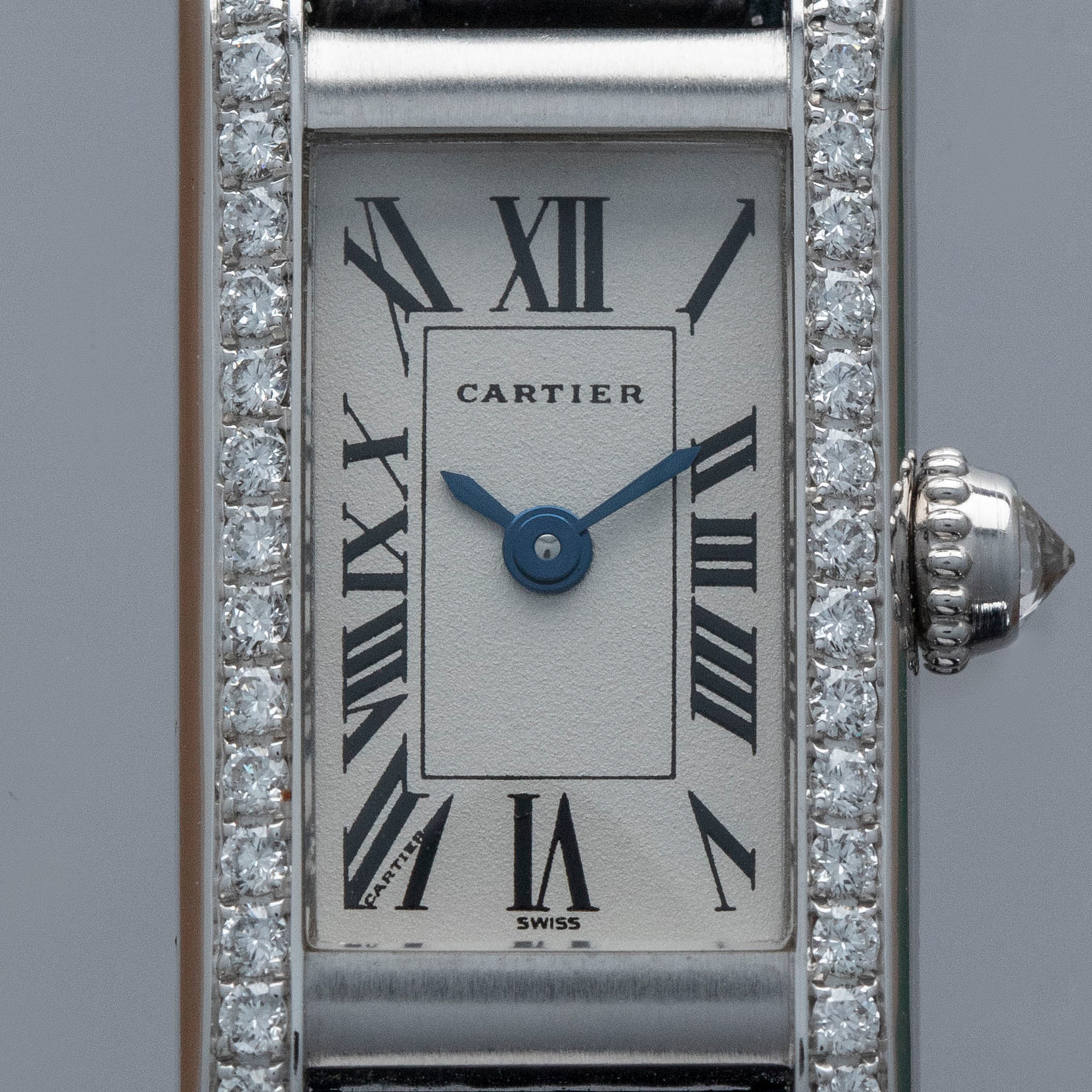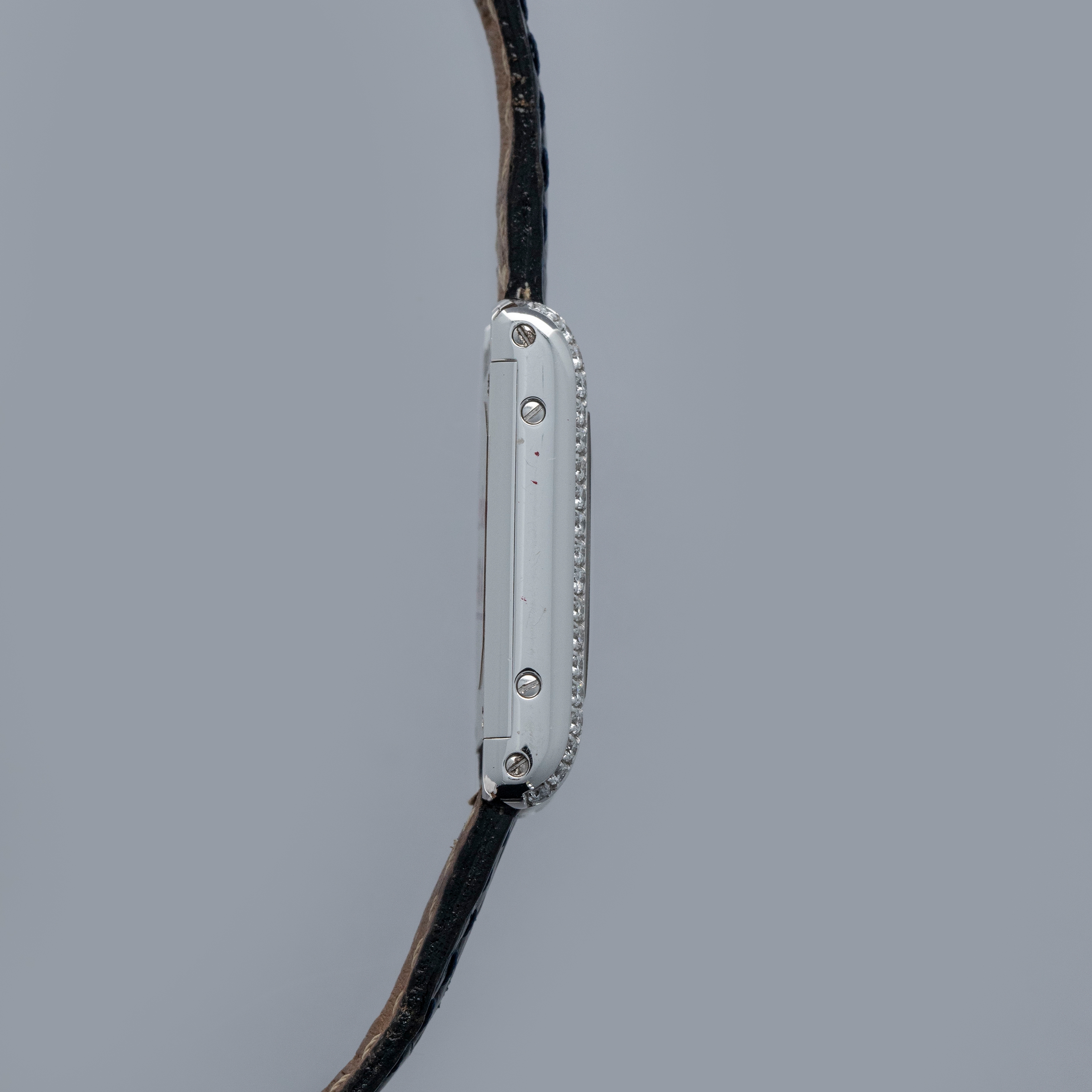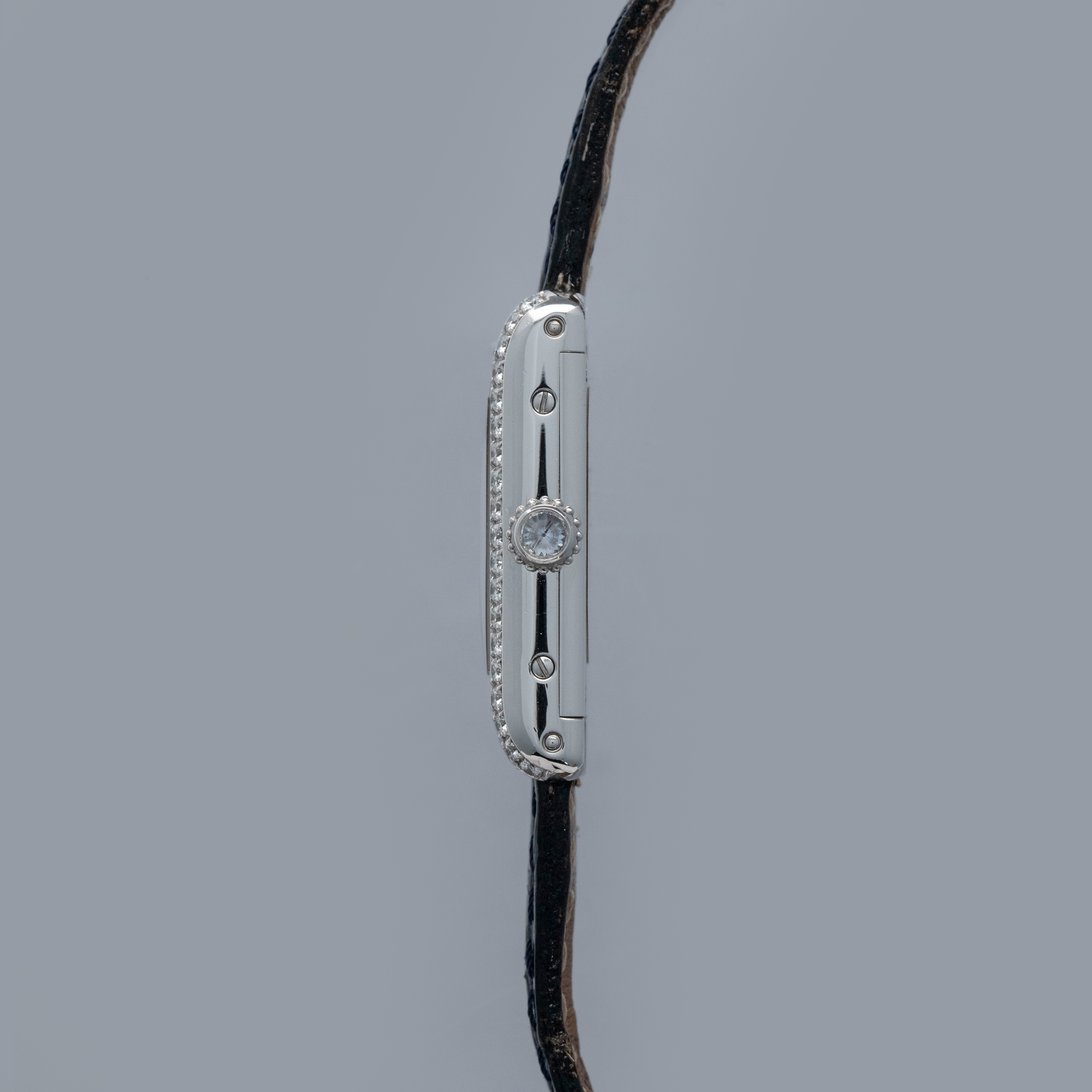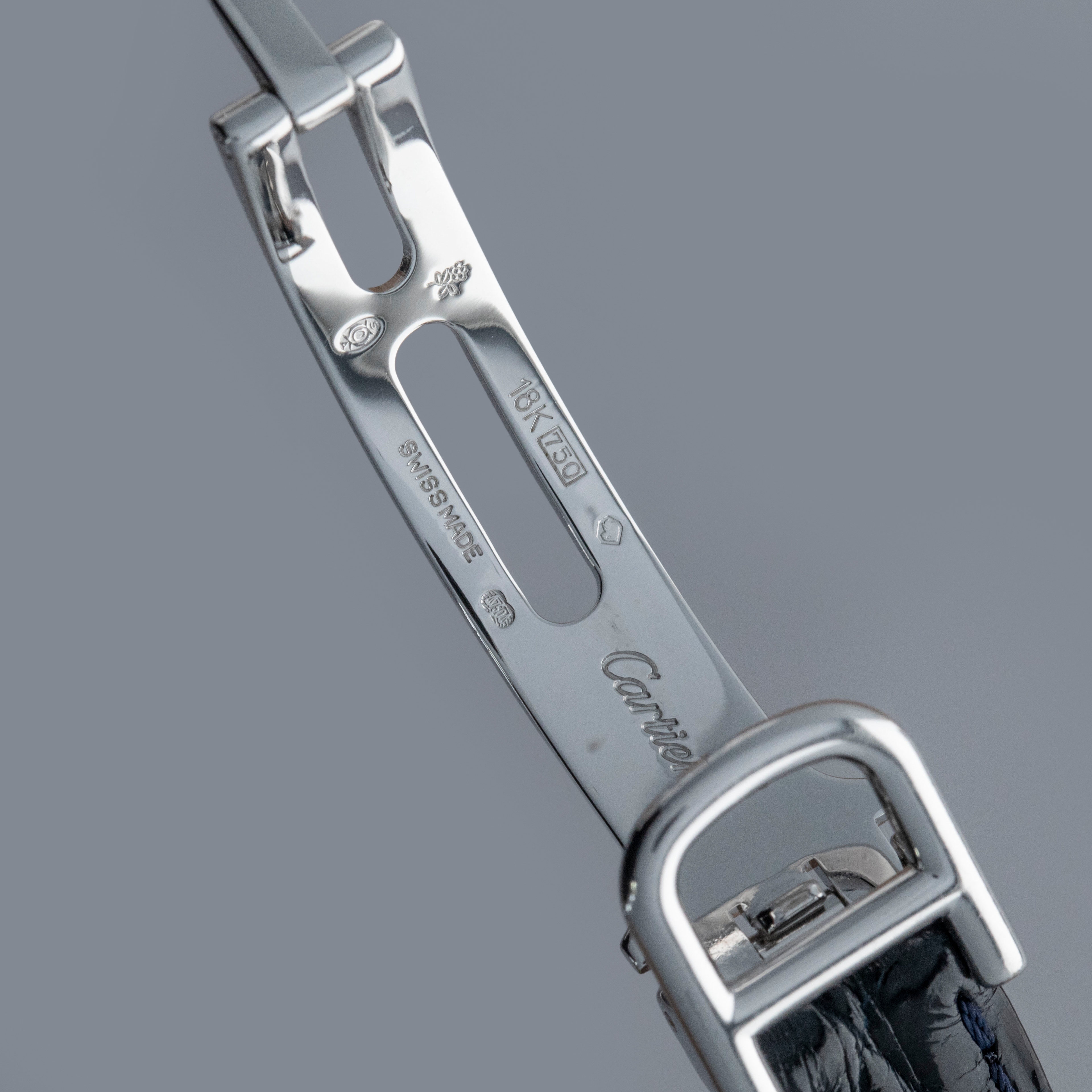 Watch is in overall excellent condition. The white gold case has some light scratches and marks, with minor wear to the screw heads on the case side. All diamonds and settings on the bezel and crown are in excellent condition. The case back features well-defined engravings and hallmarks beneath a Cartier sticker. The dial and hands are near mint. It is fitted with a Cartier crocodile strap and white gold deployant clasp, both in excellent condition. Fits approximately a 5 3/4” wrist.