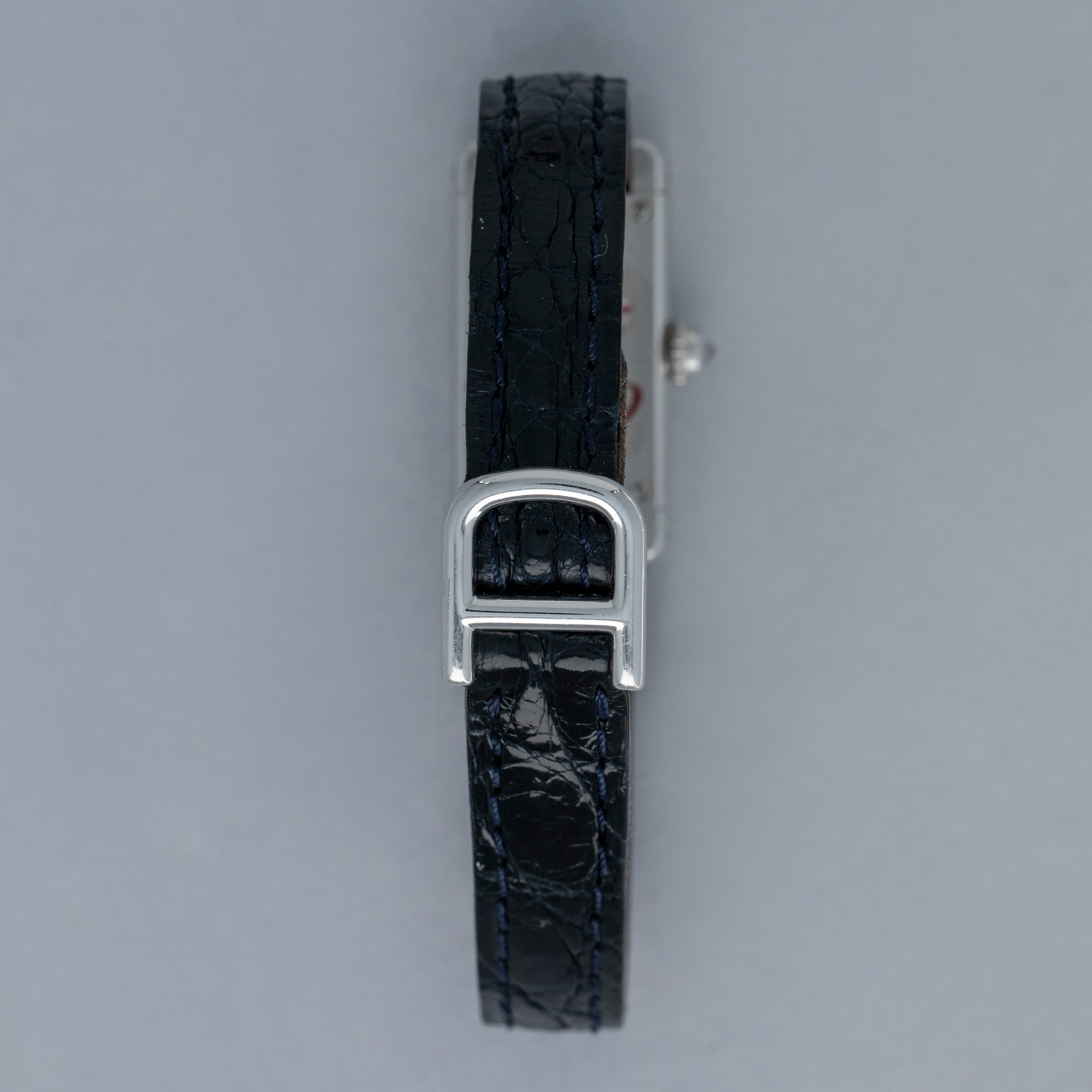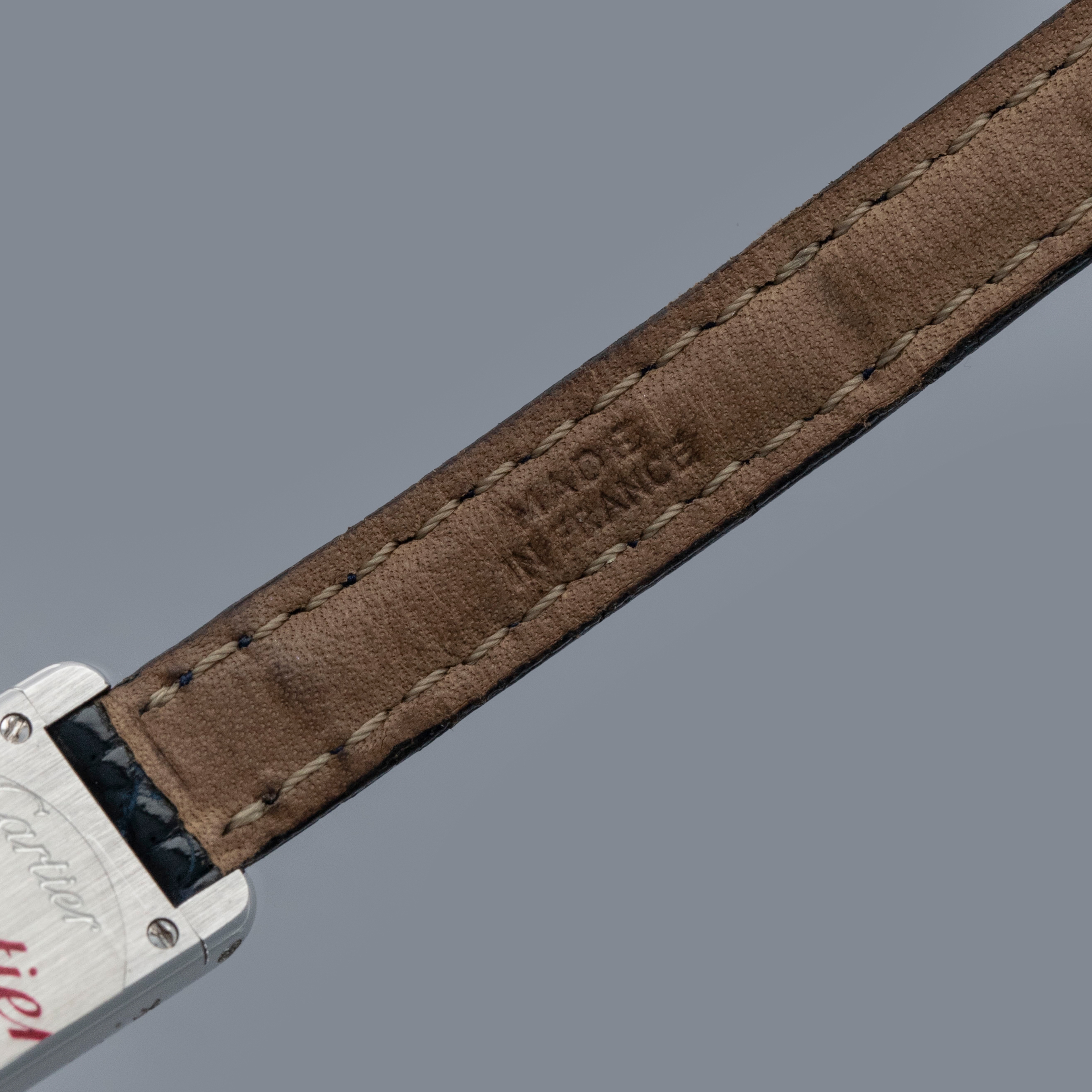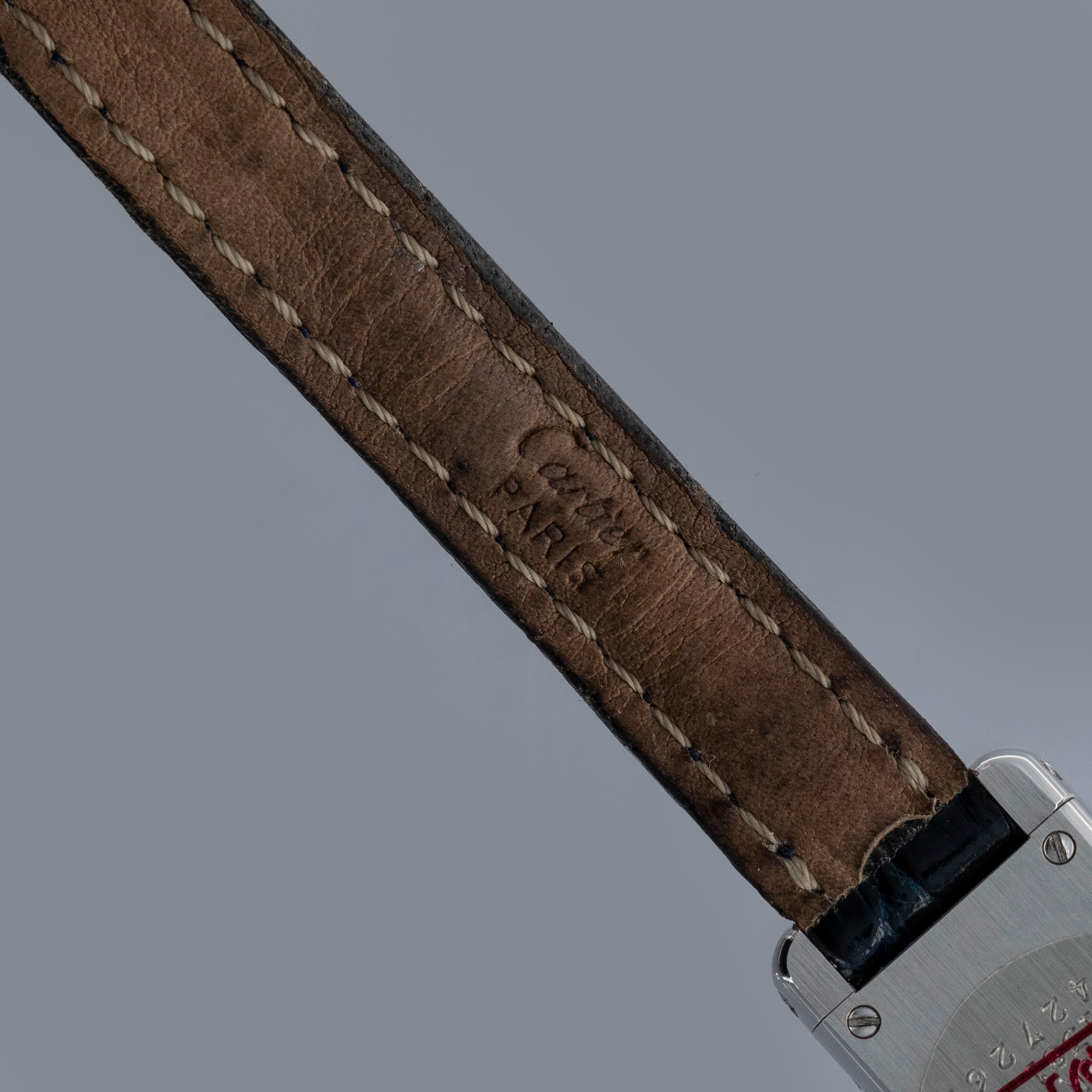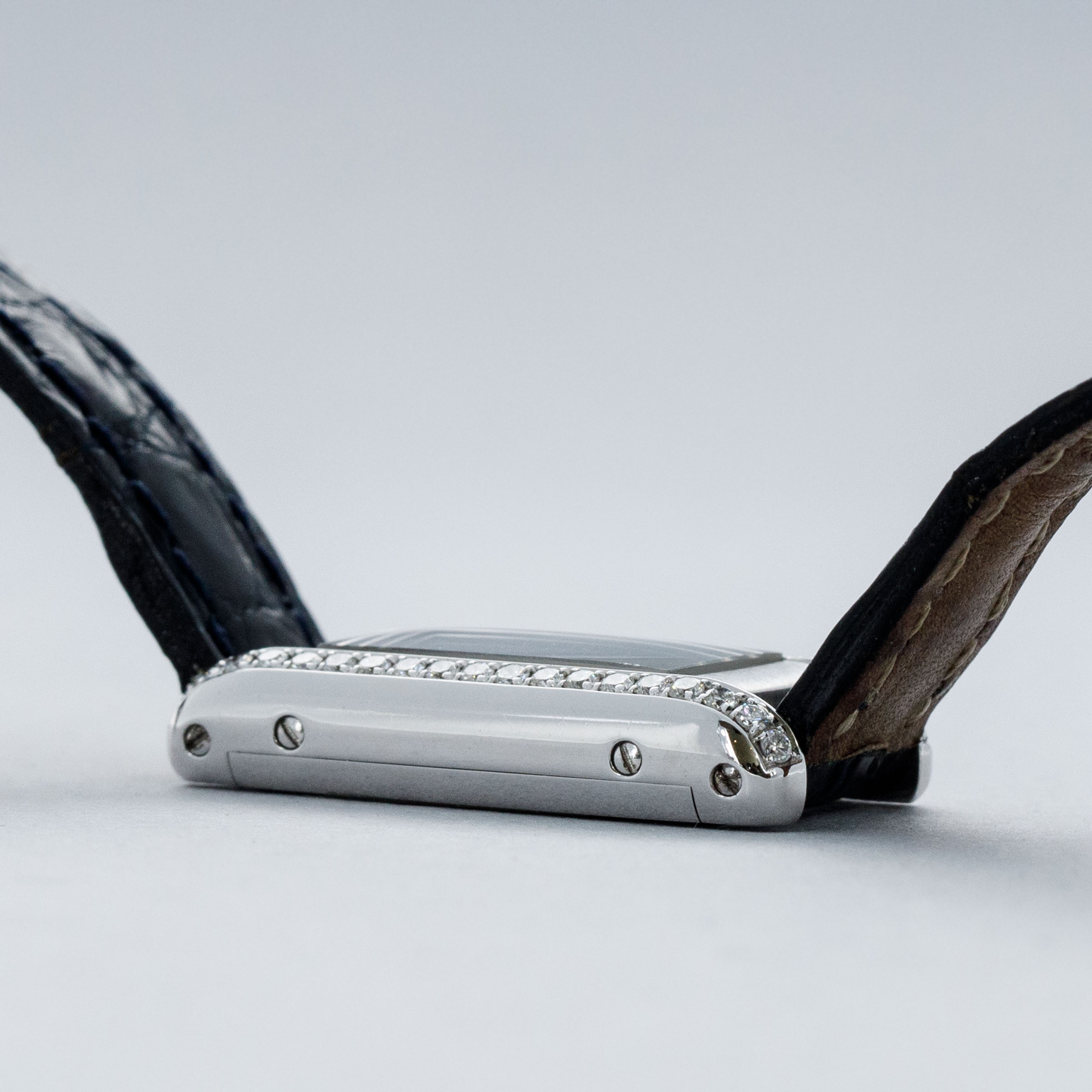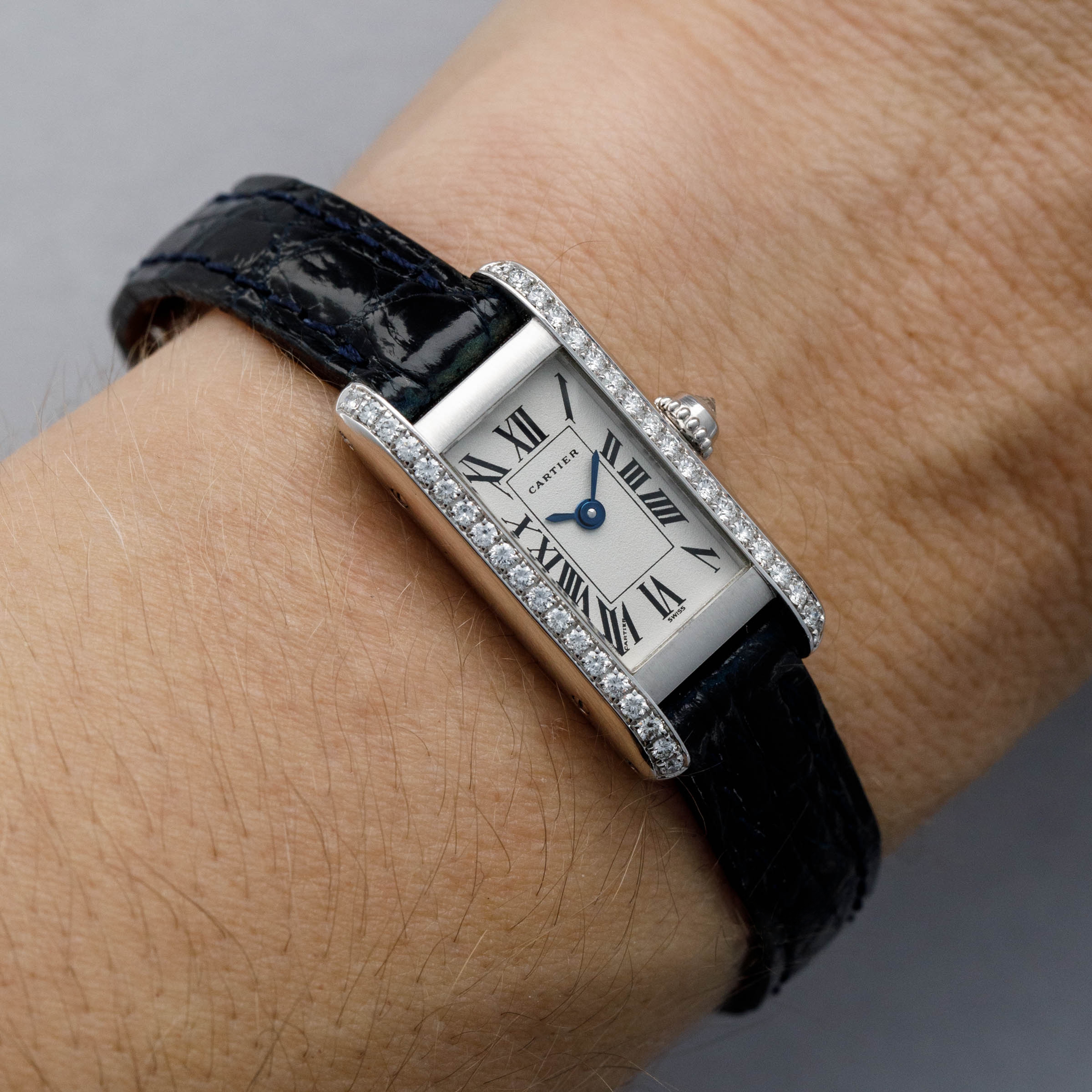 Watch is in overall excellent condition. The white gold case has some light scratches and marks, with minor wear to the screw heads on the case side. All diamonds and settings on the bezel and crown are in excellent condition. The case back features well-defined engravings and hallmarks beneath a Cartier sticker. The dial and hands are near mint. It is fitted with a Cartier crocodile strap and white gold deployant clasp, both in excellent condition. Fits approximately a 5 3/4” wrist.