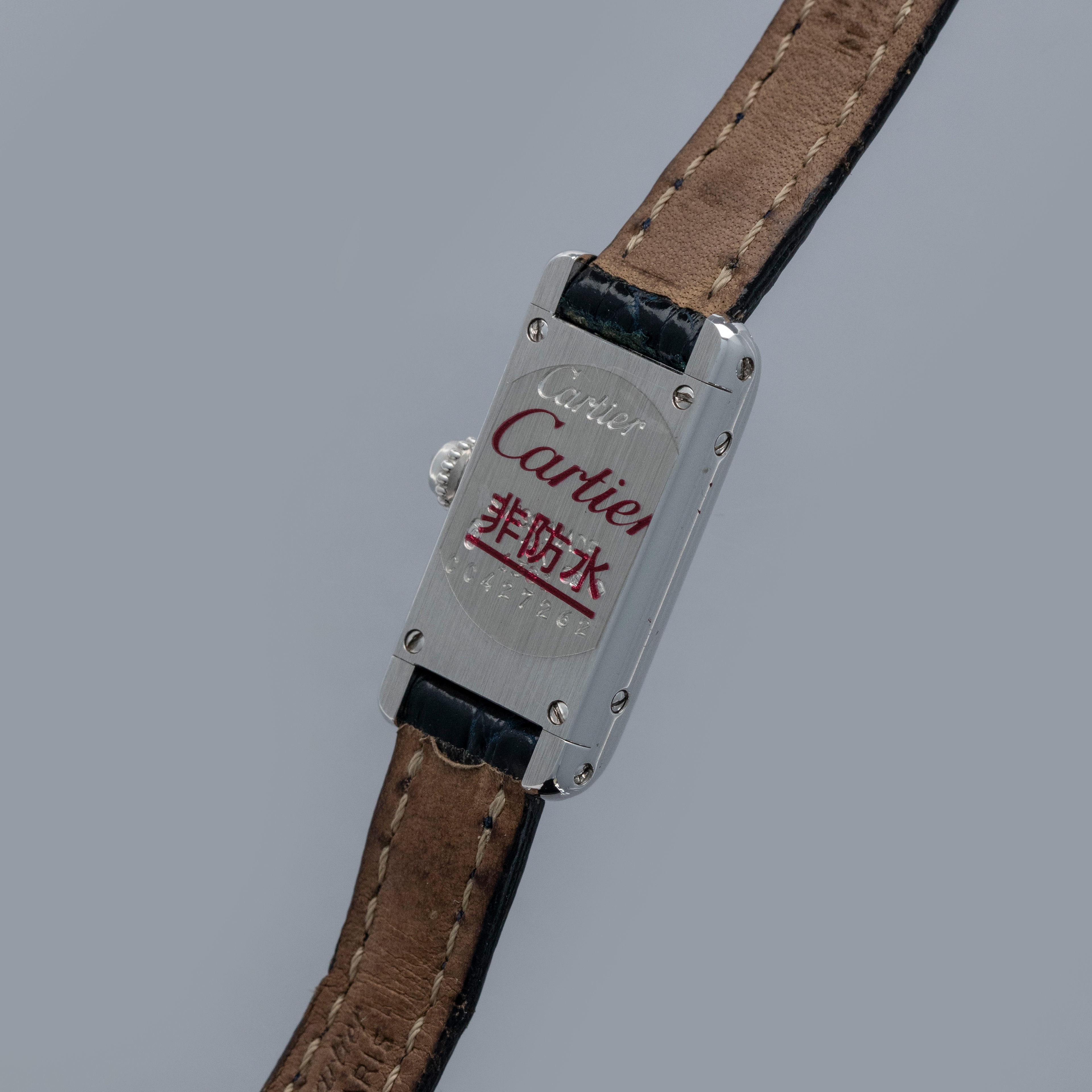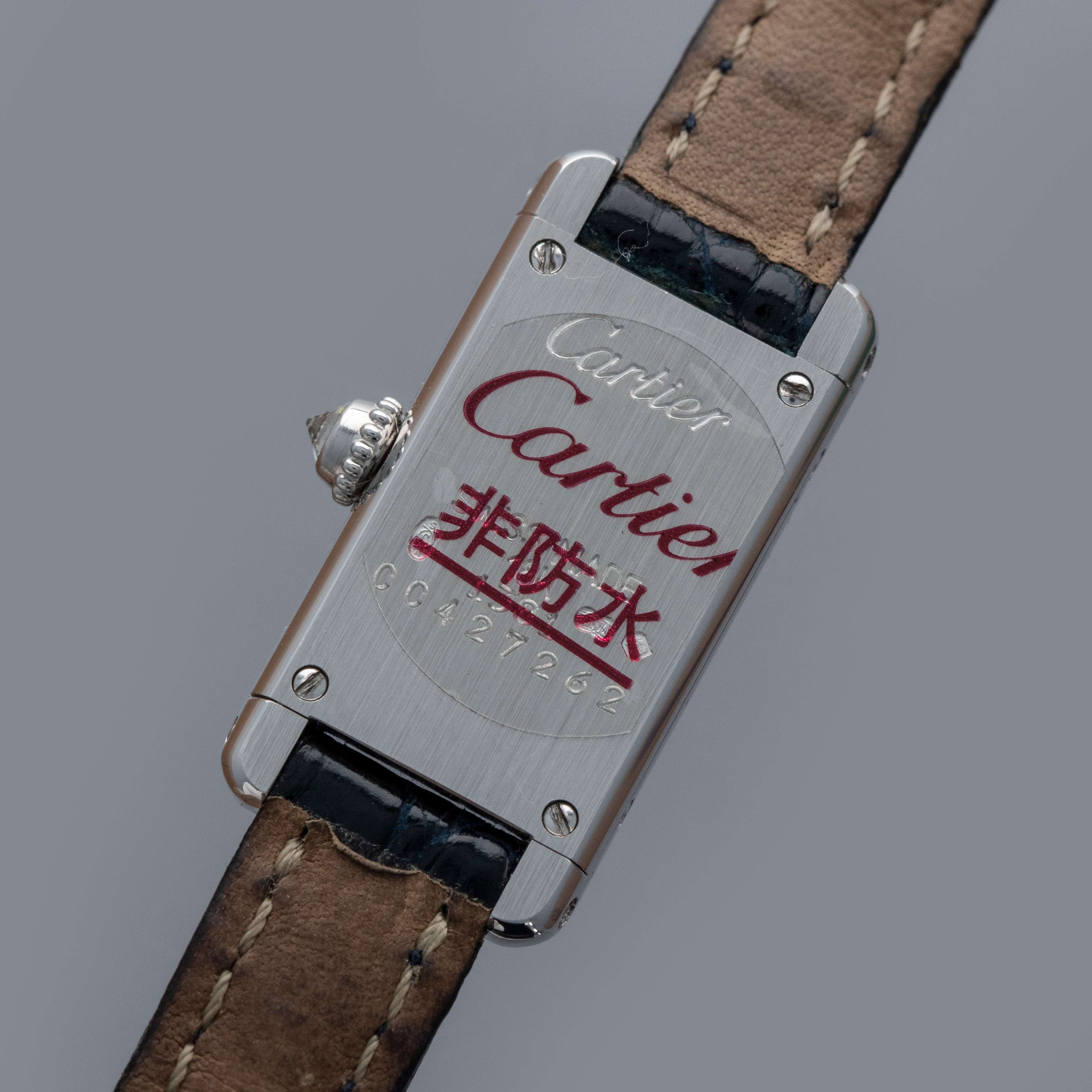 Boasting a flat design that sits perfectly on the wrist thanks to its quartz movement, the Tank Mini's rectangular profile is easily recognisable at a glance, albeit its diamond cabochon winding crown is one clear departure from the Tank's standard sapphire cabochon.