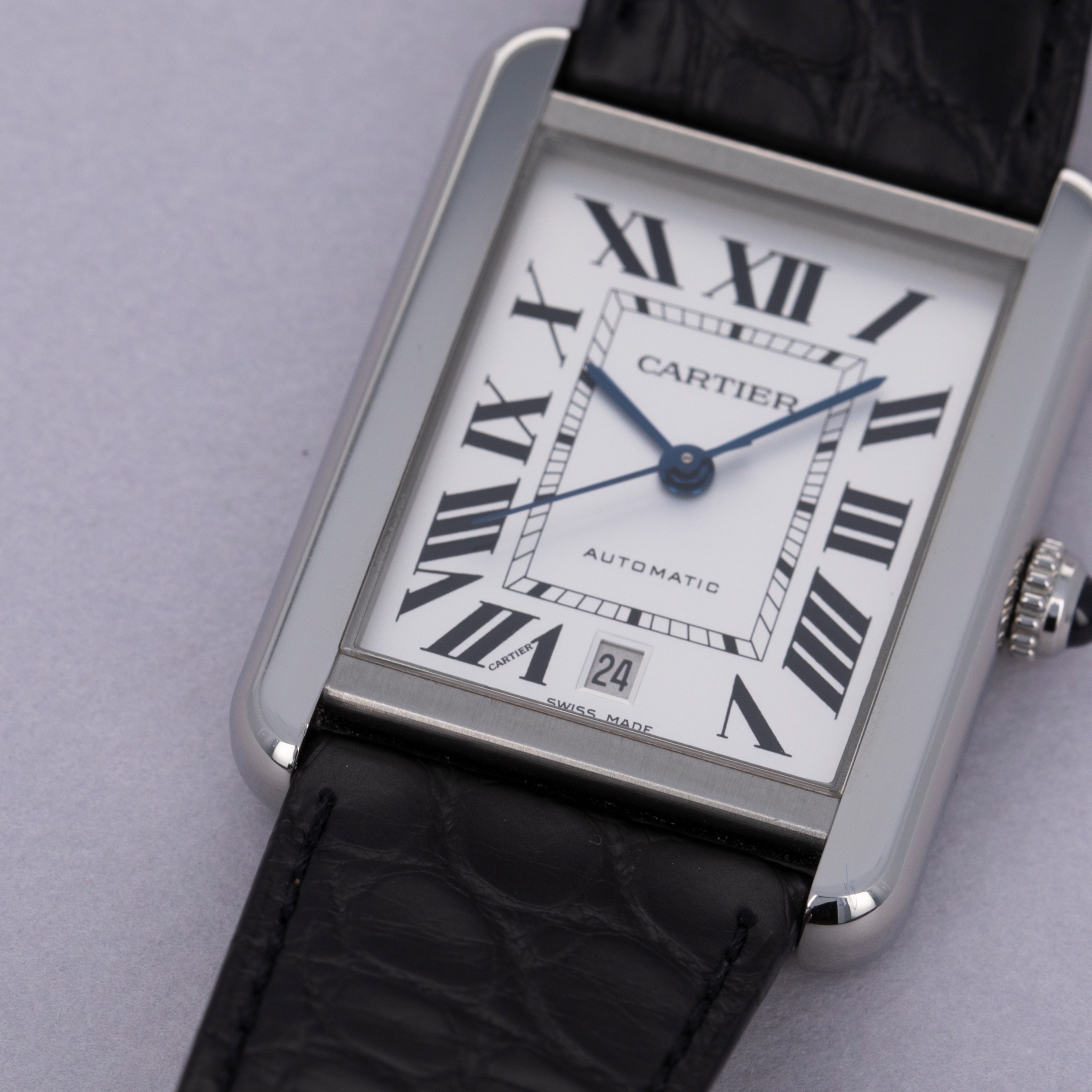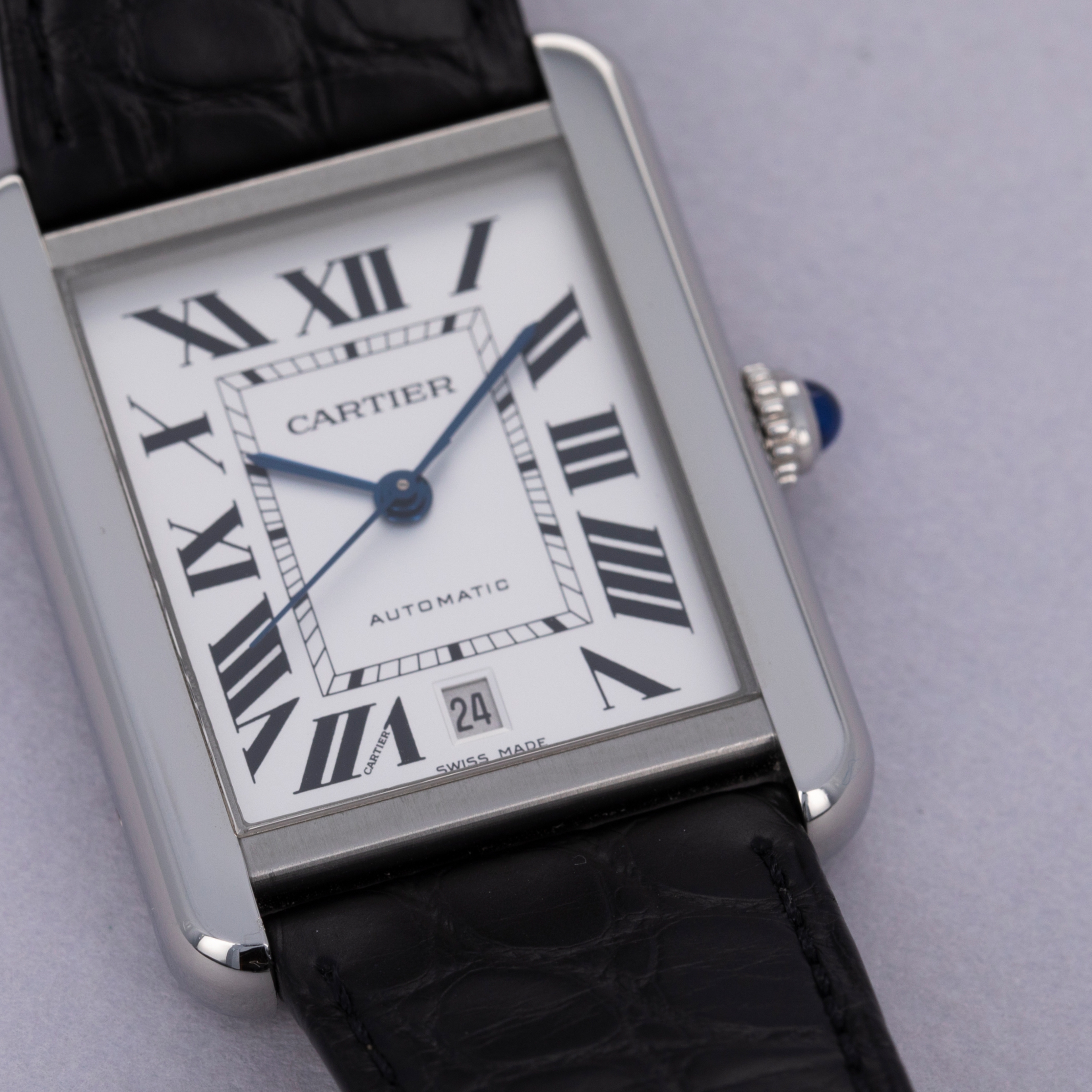 Boasting the Tank's signature dial design, the Tank Solo features black Roman numerals, blued steel hands and a railroad style minute track just like the plethora of Tank models that have come before it.