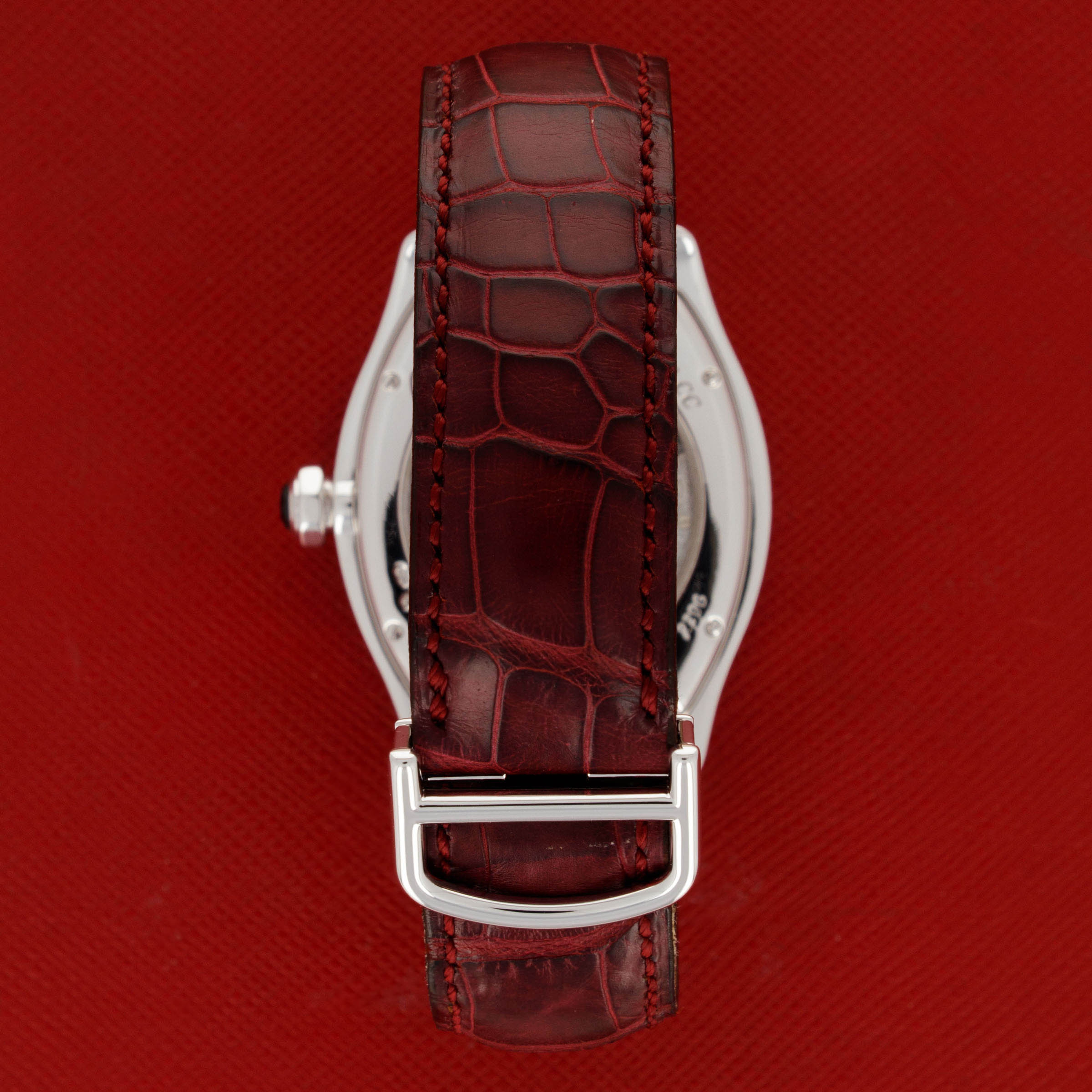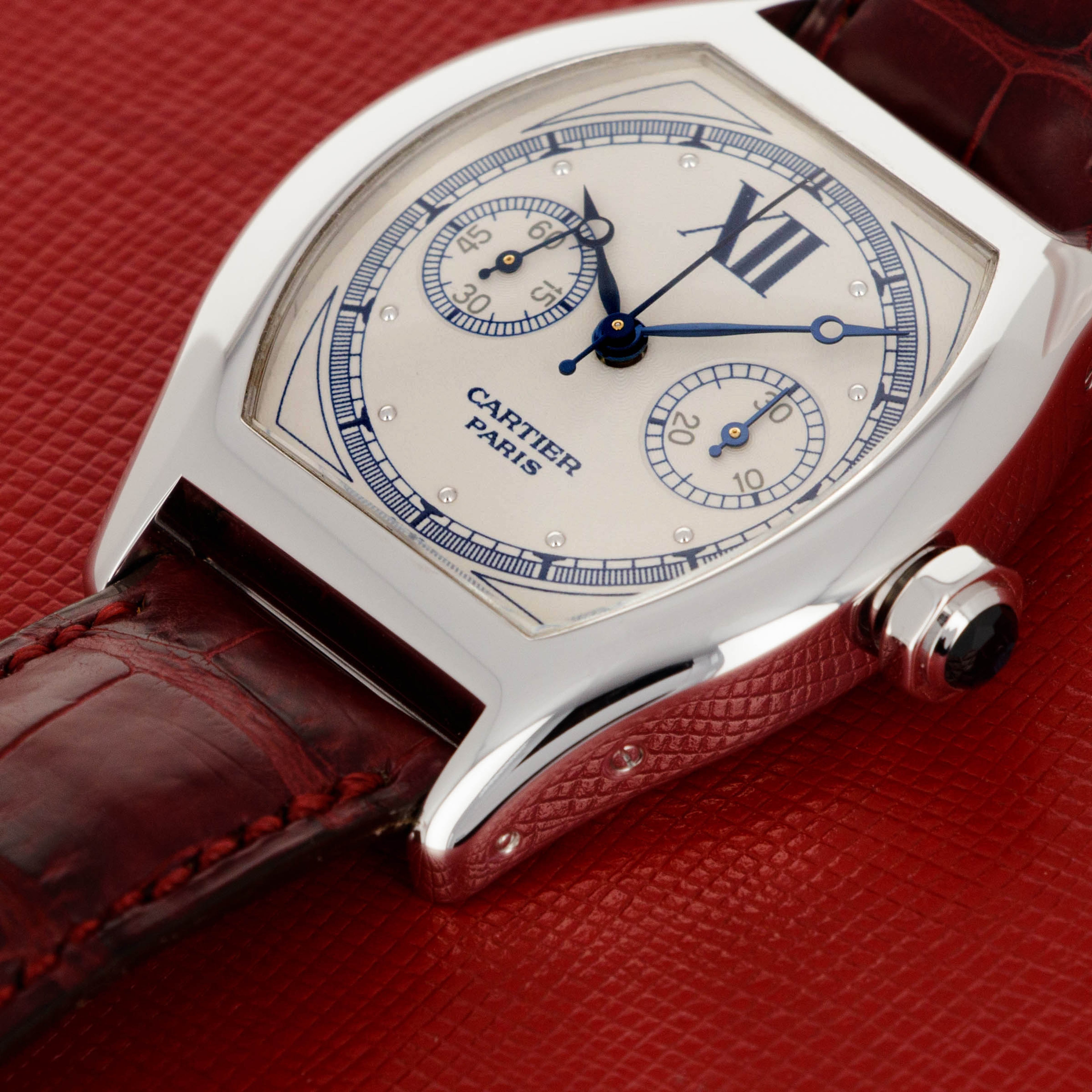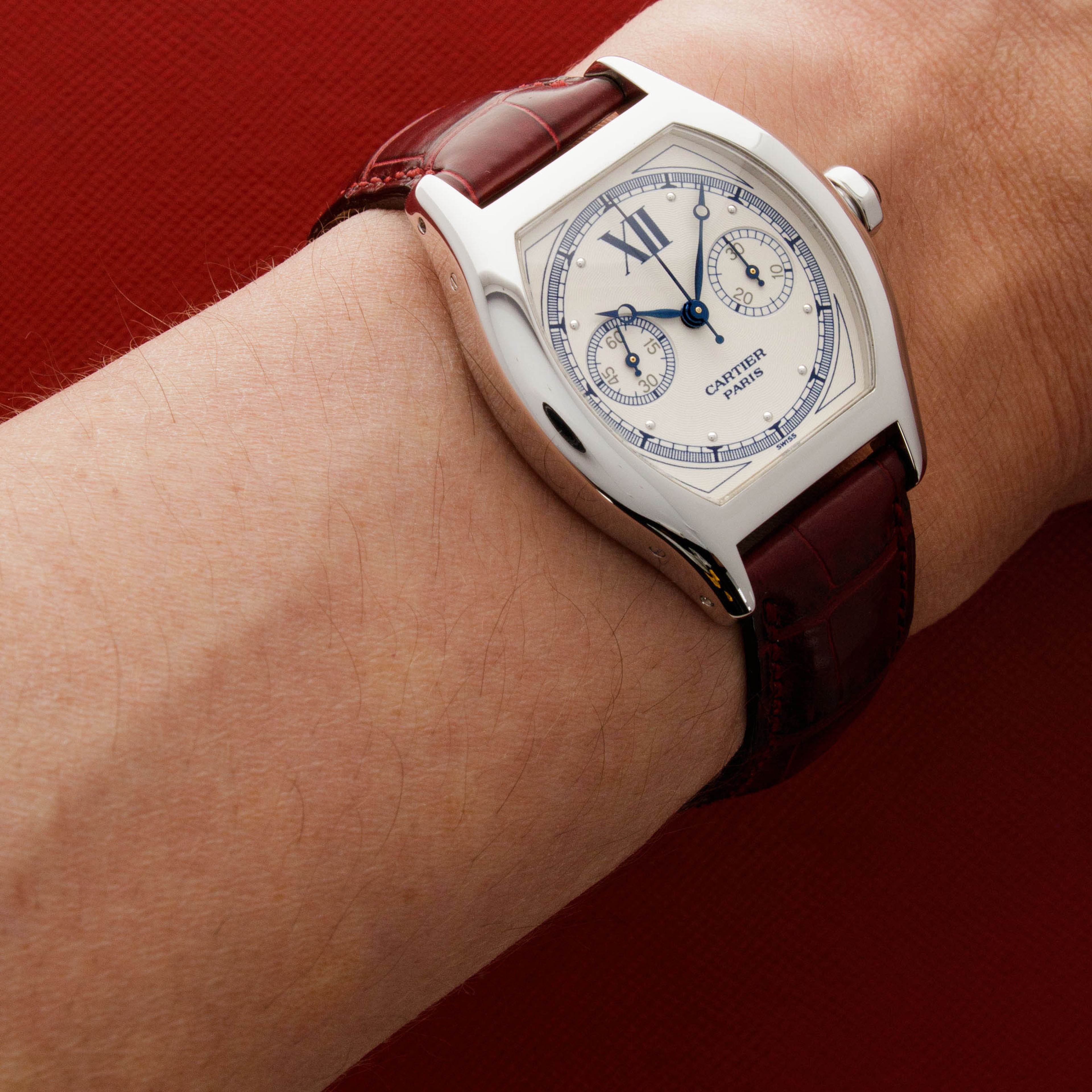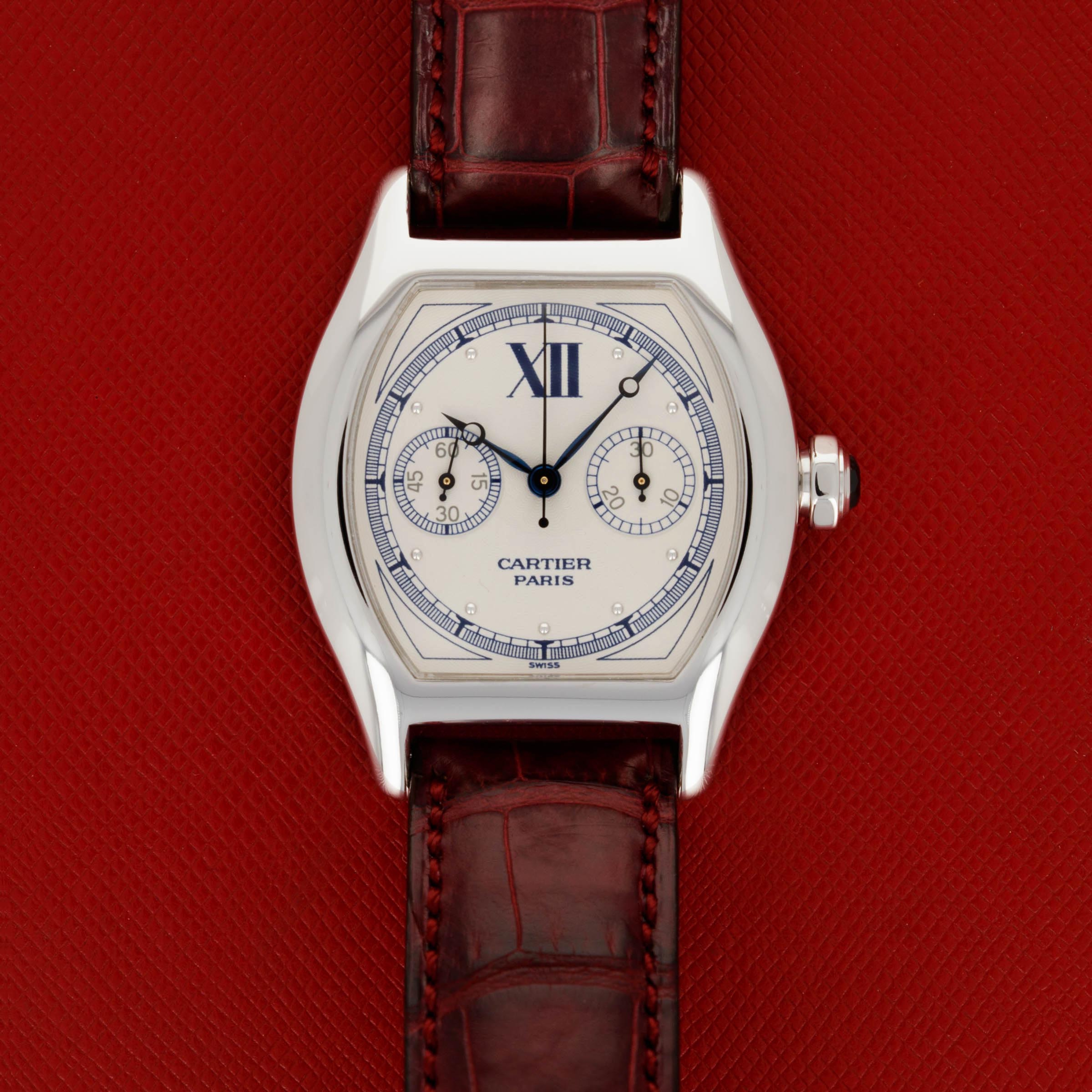 Based on Louis Cartier’s 3rd ever design, a watch from 1912, the Cartier Tortue Monopouissor was released as part of the CPCP in 1999 like their other throwback designs to Cartier's earliest days. Powered by the beautifully finished manually wound cal. 045 MC movement, the Cartier Tortue Monopouissor is a technically astute timepiece. With its gorgeous cream and blue dial, it is an mondern rendition of the original models that it calls back to. With its elegant curved white gold case hugging the wrist comfortably and its cream and blue dial’s general aesthetic matching that of the iconic French Maison's designs of old, this piece stands as a monolith of Cartier's engineering prowess, iconic design and longstanding heritage.