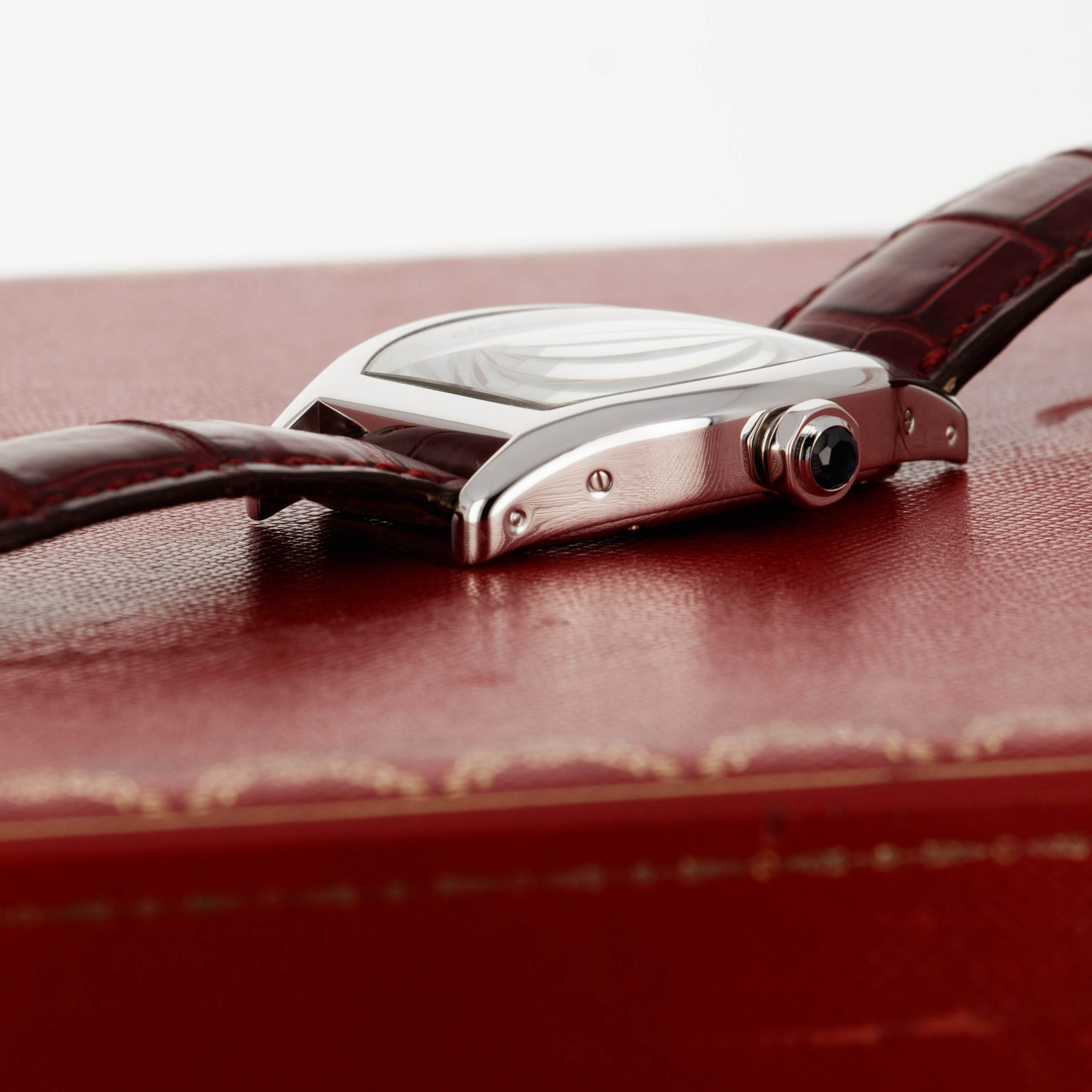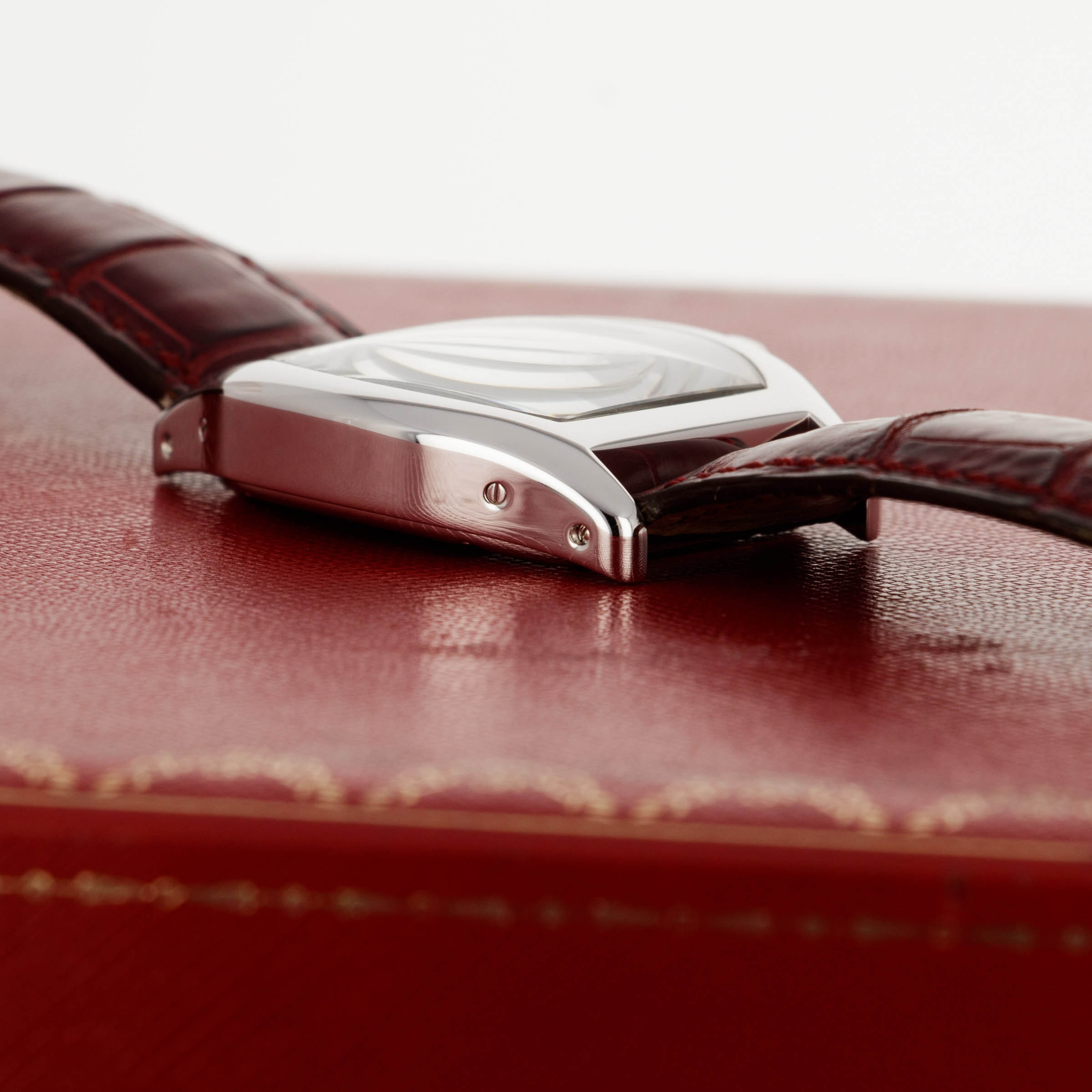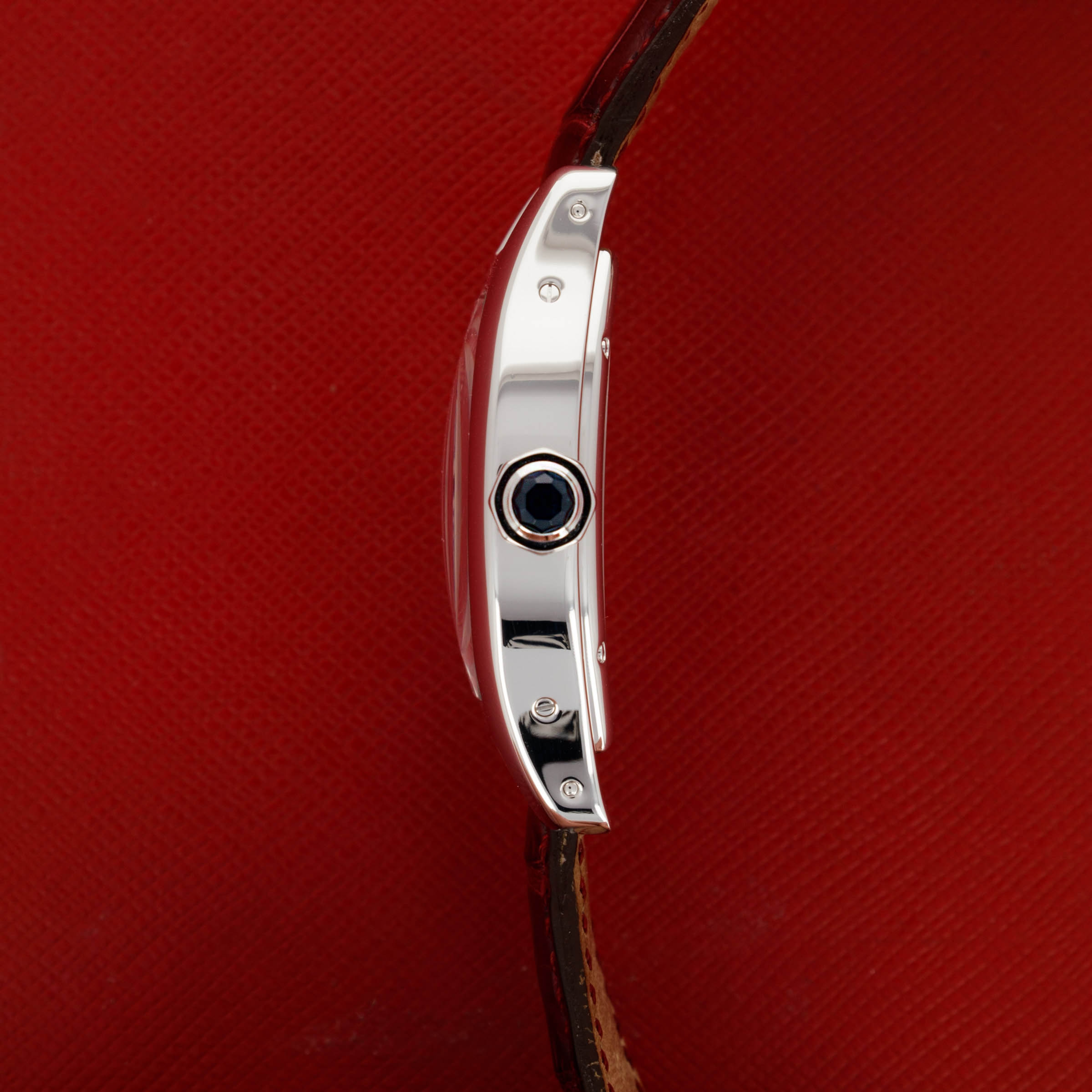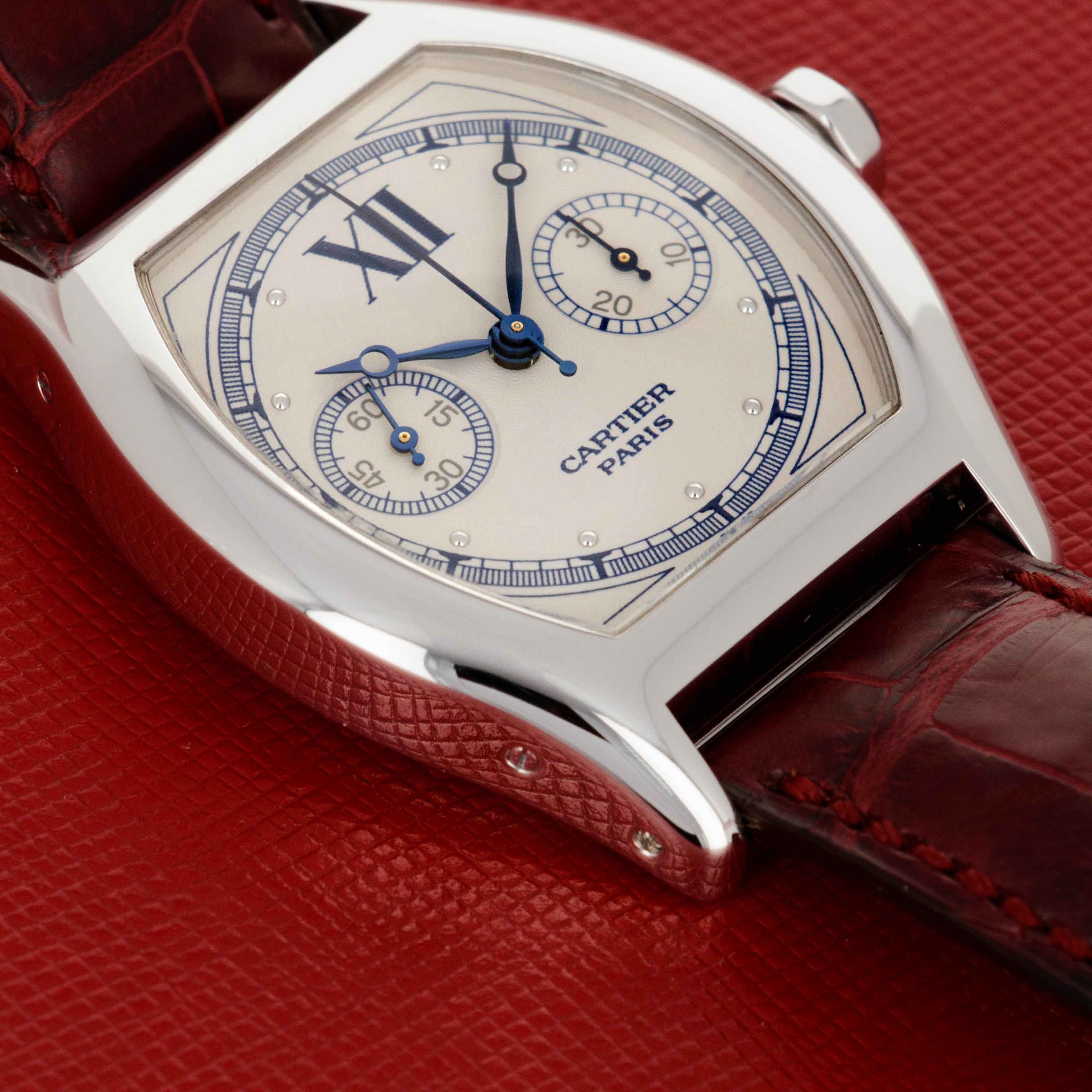 Based on Louis Cartier’s 3rd ever design, a watch from 1912, the Cartier Tortue Monopouissor was released as part of the CPCP in 1999 like their other throwback designs to Cartier's earliest days. Powered by the beautifully finished manually wound cal. 045 MC movement, the Cartier Tortue Monopouissor is a technically astute timepiece. With its gorgeous cream and blue dial, it is an mondern rendition of the original models that it calls back to. With its elegant curved white gold case hugging the wrist comfortably and its cream and blue dial’s general aesthetic matching that of the iconic French Maison's designs of old, this piece stands as a monolith of Cartier's engineering prowess, iconic design and longstanding heritage.