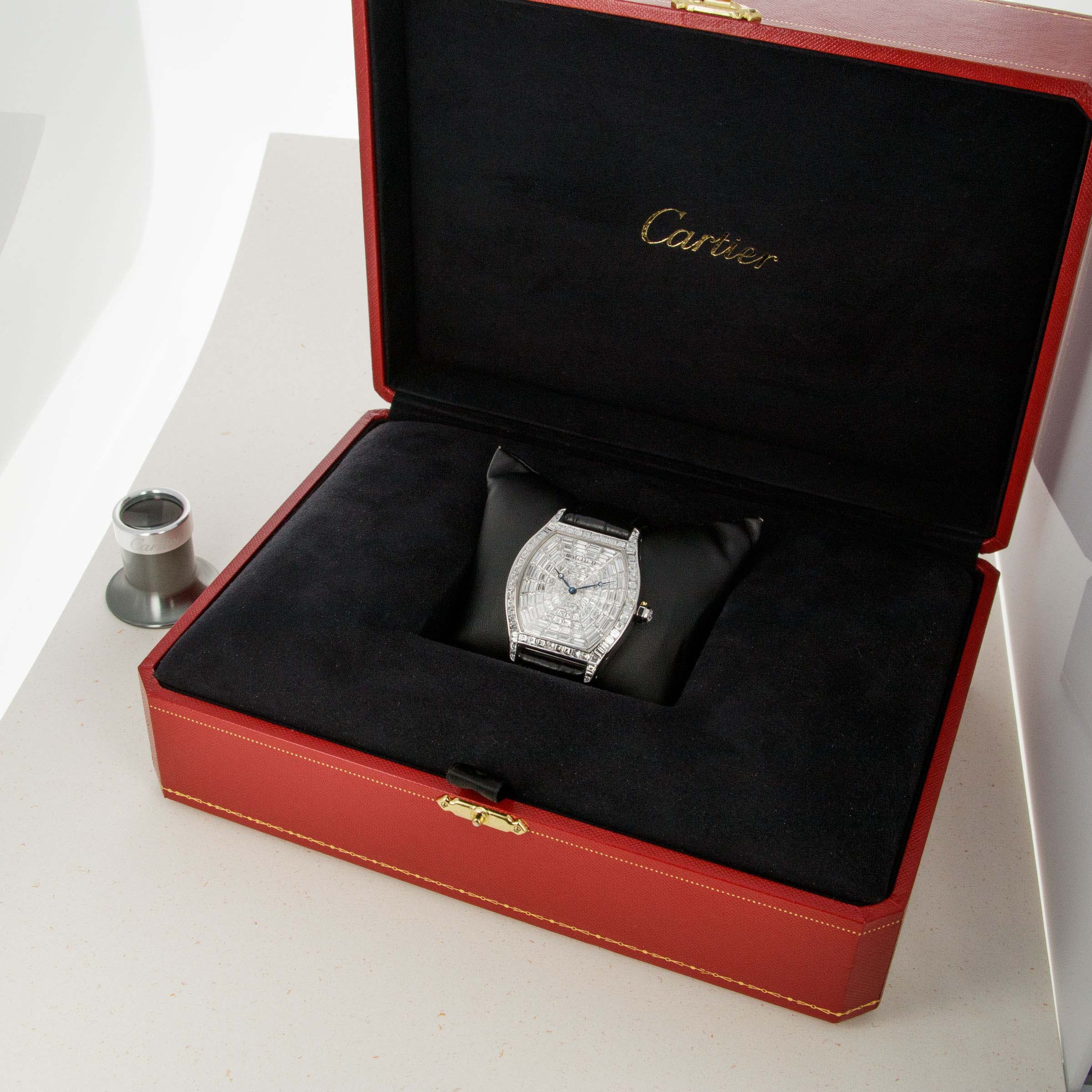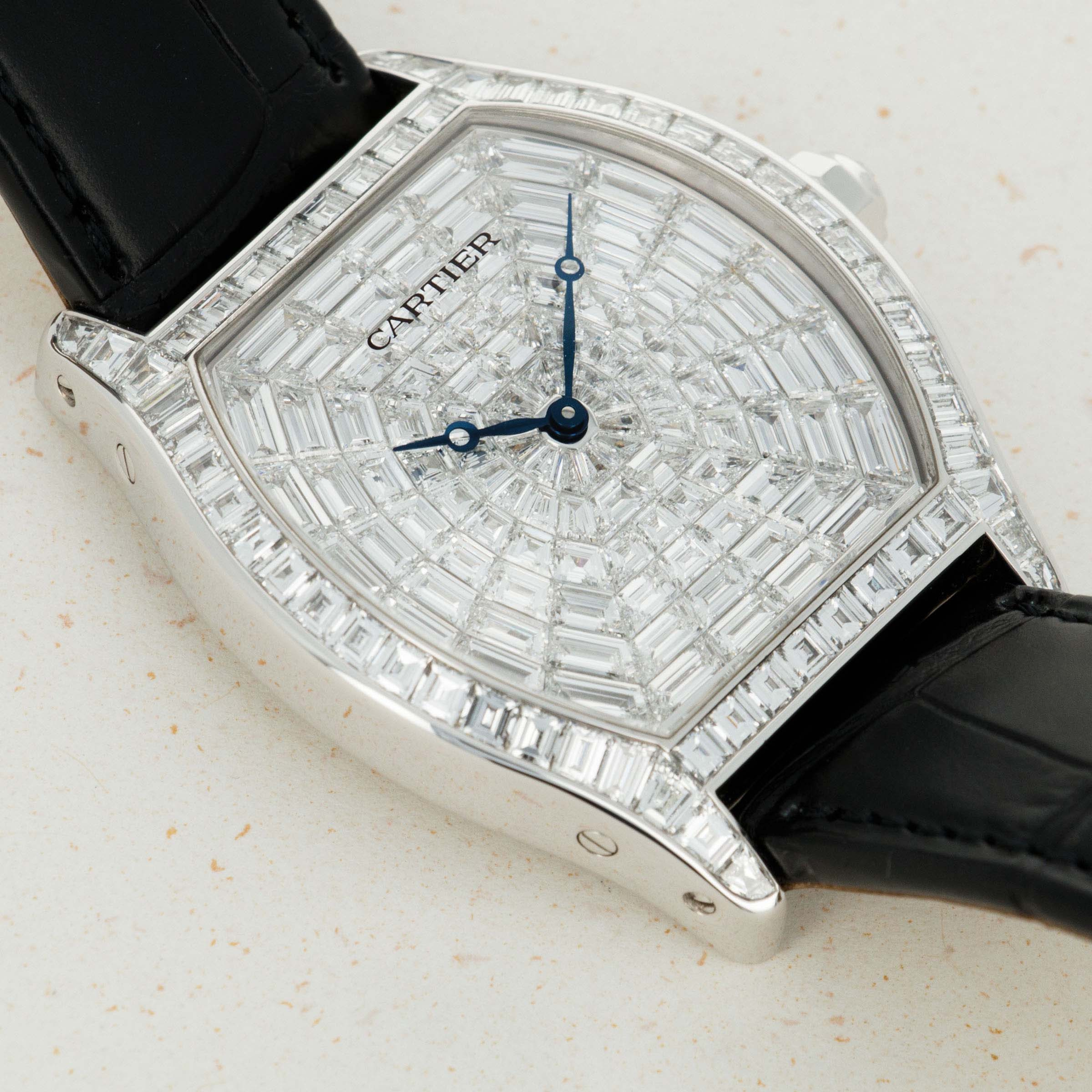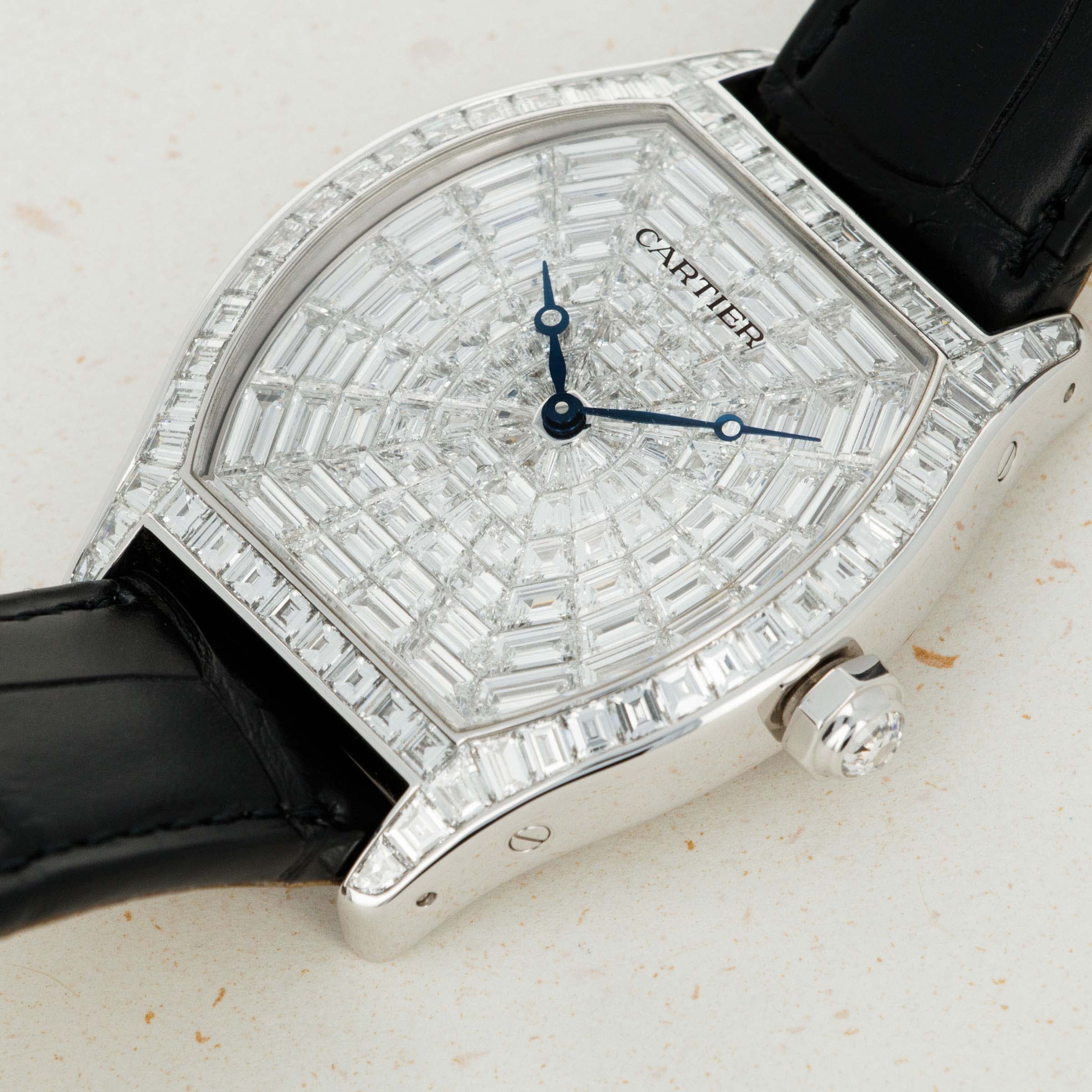 Perhaps the most luxurious Tortue ever made, this watch features a case of 18k white gold set with 56 baguette-cut diamonds totaling 4.79 carats, and a faceted crown set with a brilliant-cut diamond. The dial is 18k white gold set with 108 baguette-cut diamonds totaling 8.1 carats. A true heavyweight in every sense of the word! The last retail price of this watch was $324,600.