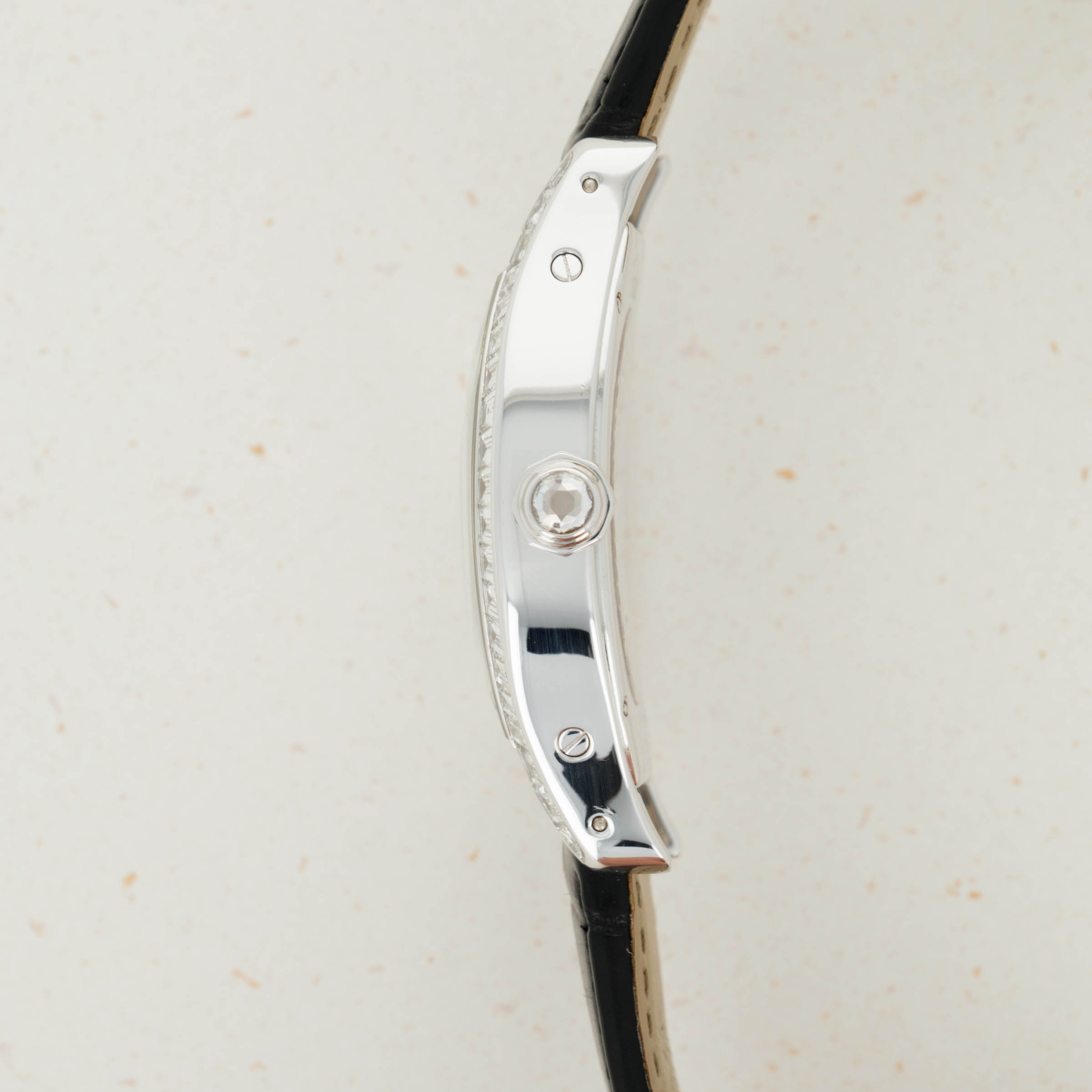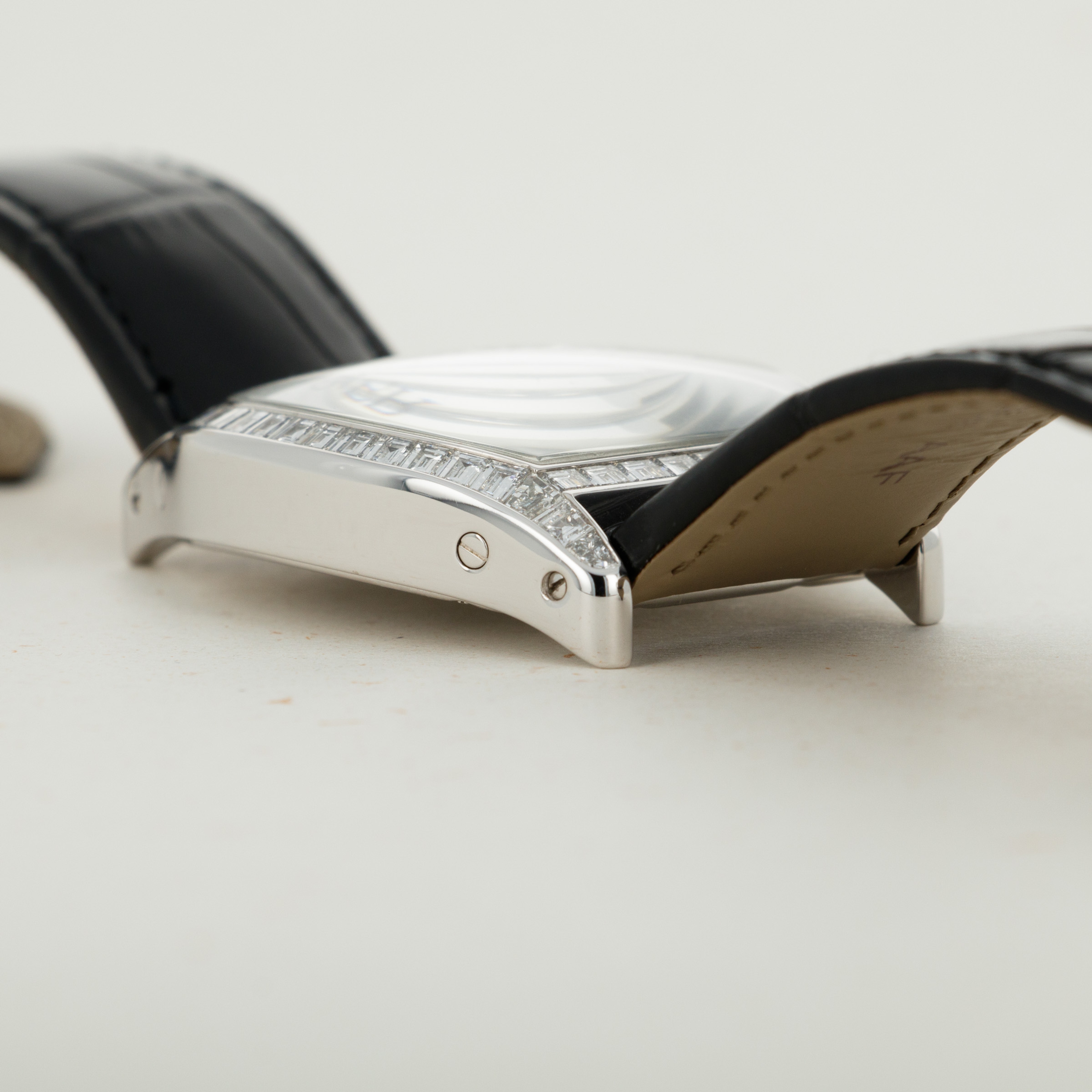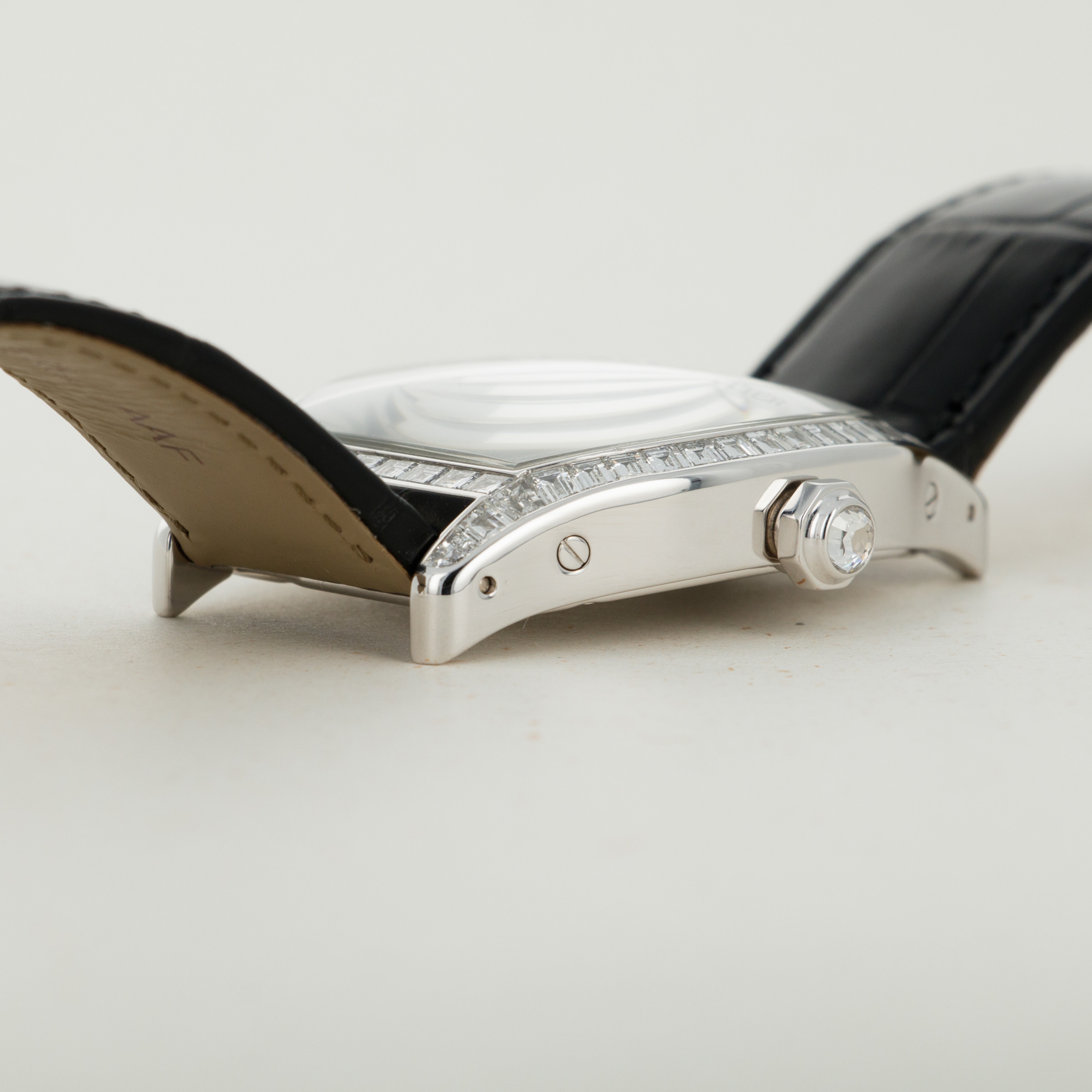 Perhaps the most luxurious Tortue ever made, this watch features a case of 18k white gold set with 56 baguette-cut diamonds totaling 4.79 carats, and a faceted crown set with a brilliant-cut diamond. The dial is 18k white gold set with 108 baguette-cut diamonds totaling 8.1 carats. A true heavyweight in every sense of the word! The last retail price of this watch was $324,600.