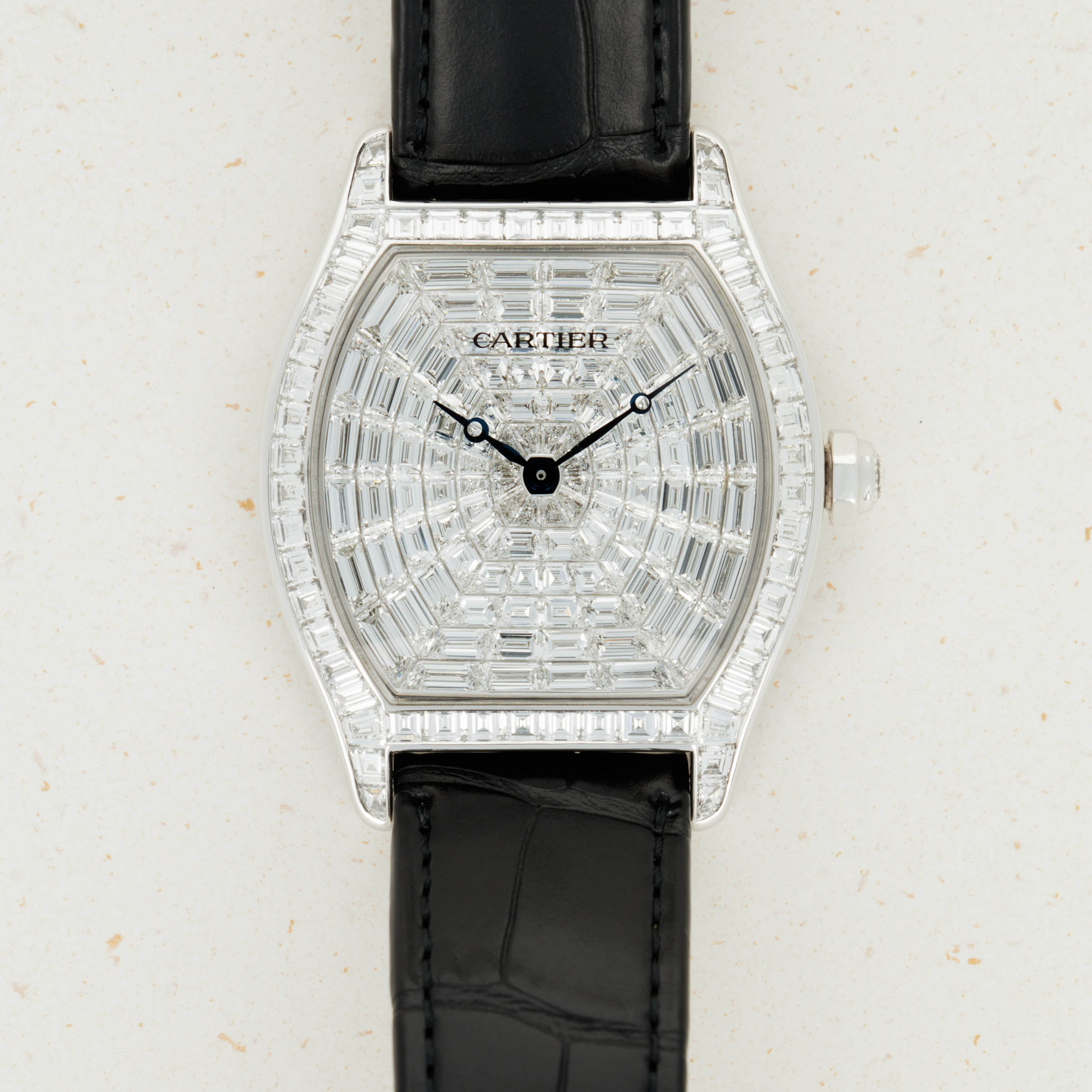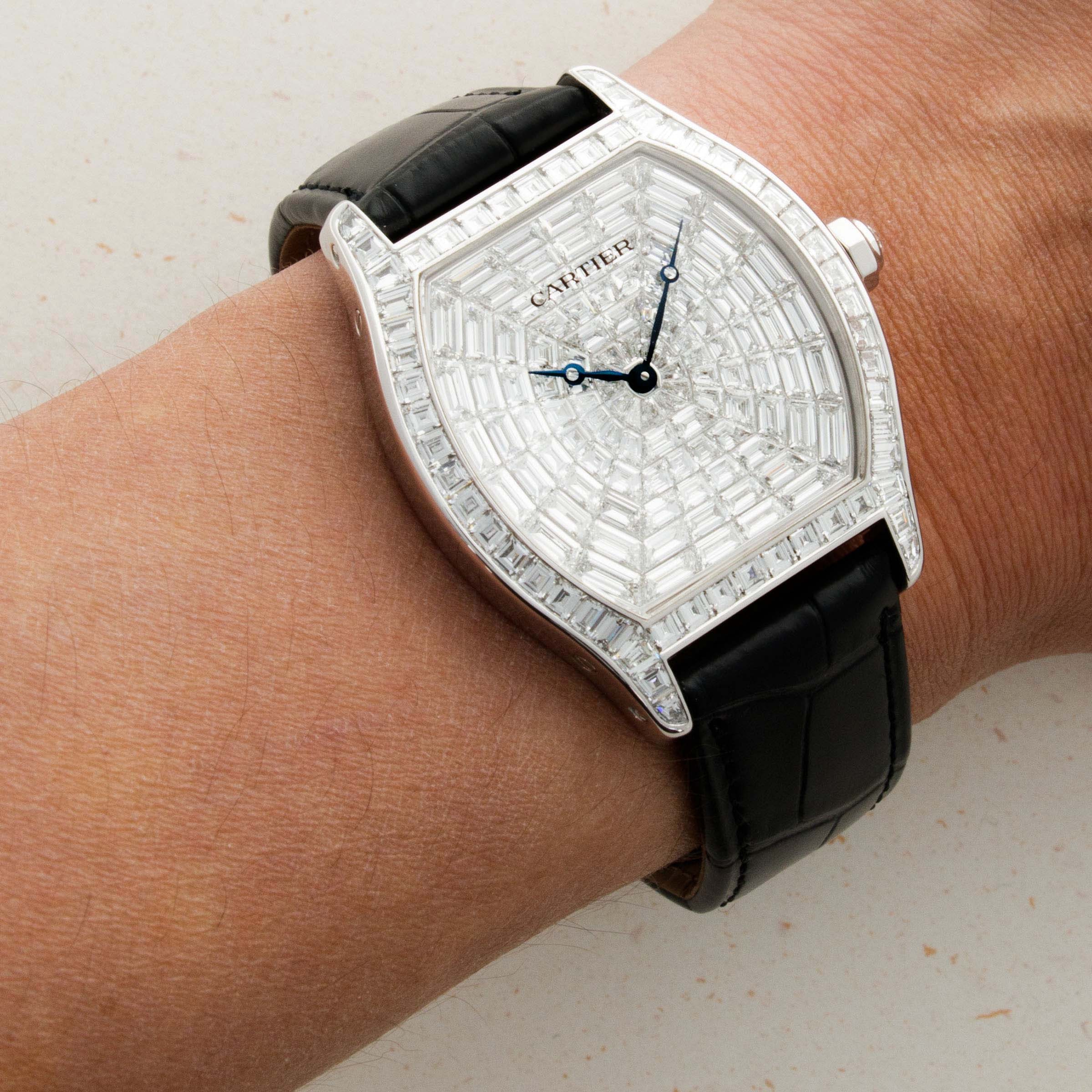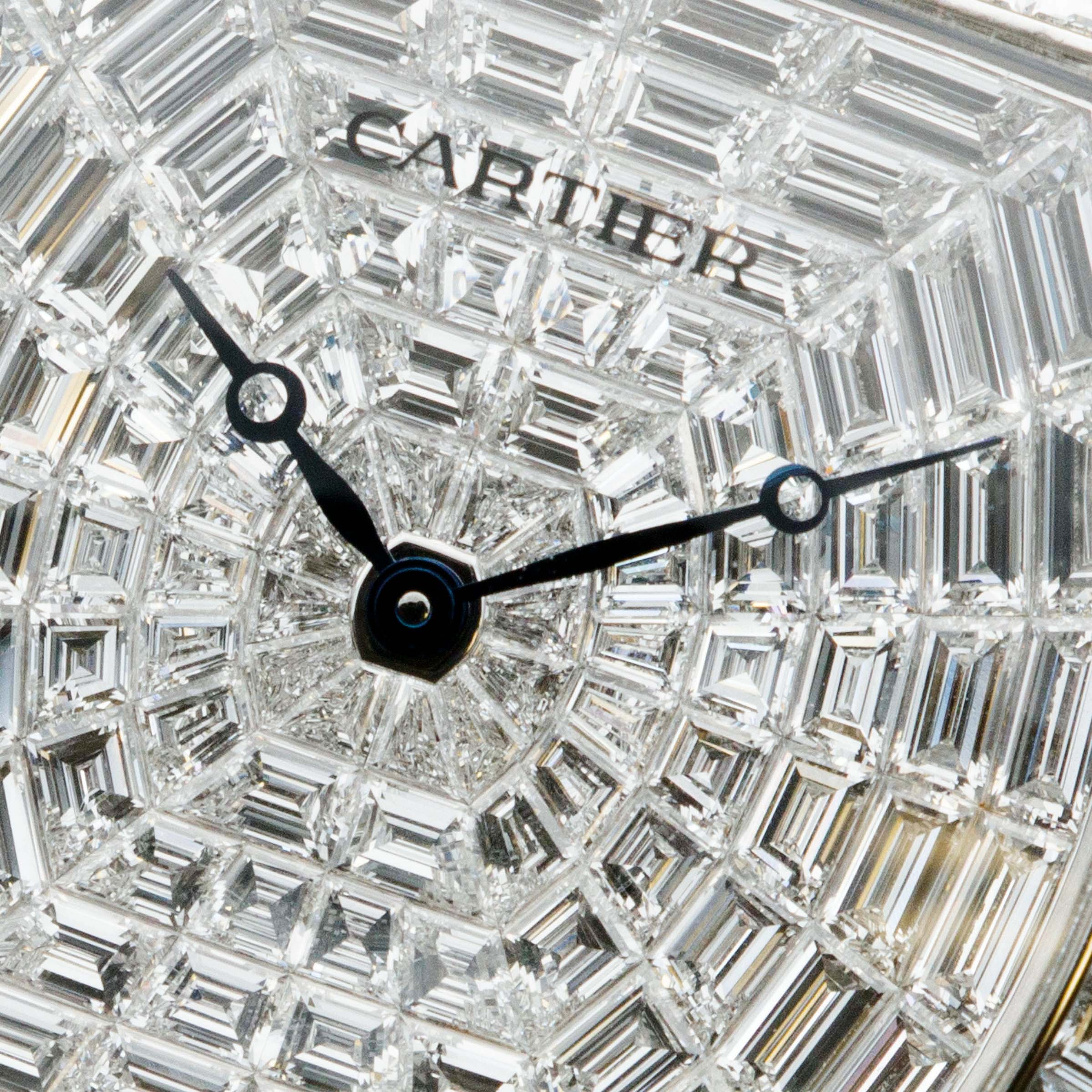 Invisibly set with 108 baguette-cut diamonds weighing in at a total of 8.1 carats, this Tortue XL's dial sits at the juncture between Cartier famed artisanal craftsmanship as a jeweler and their skills as watchmakers.