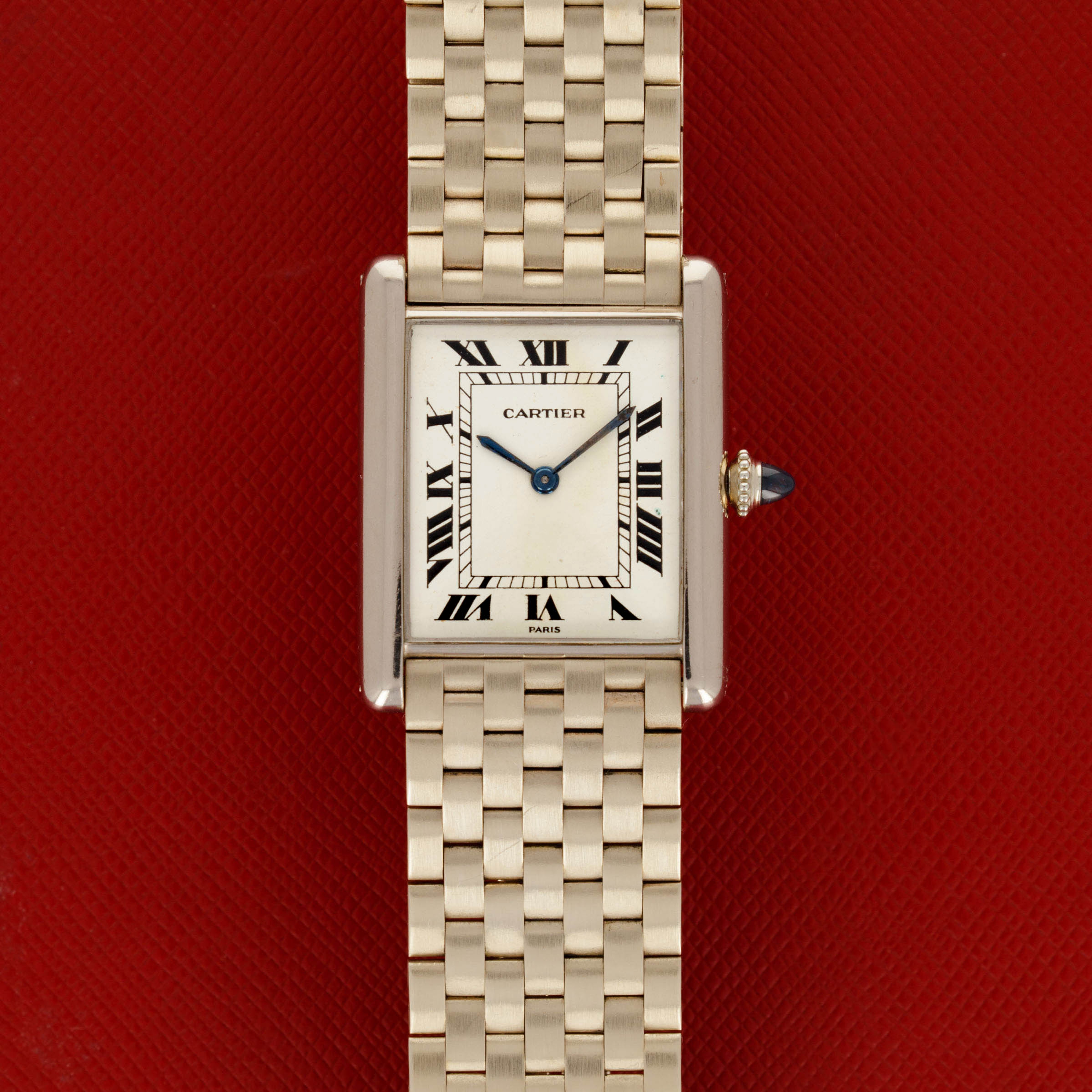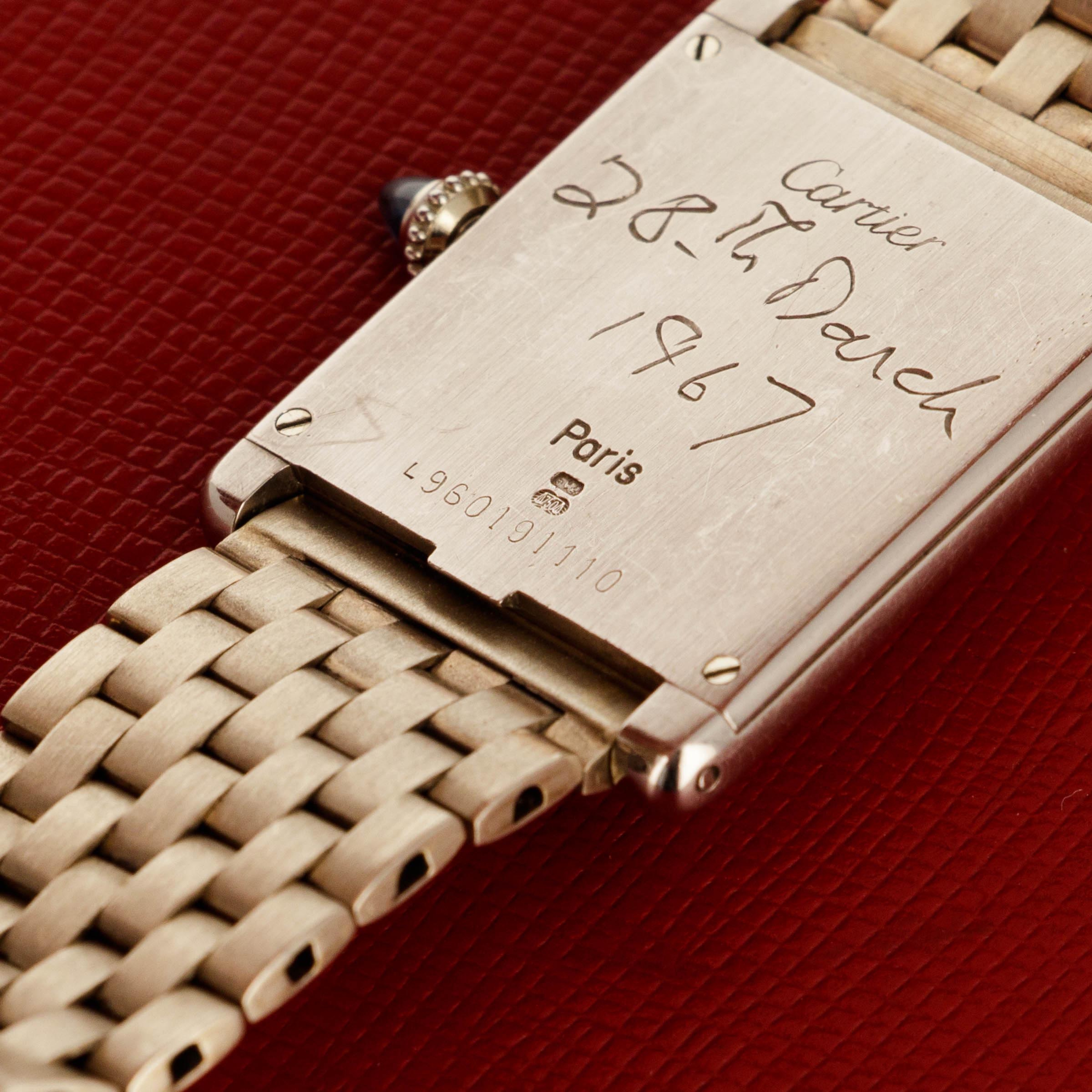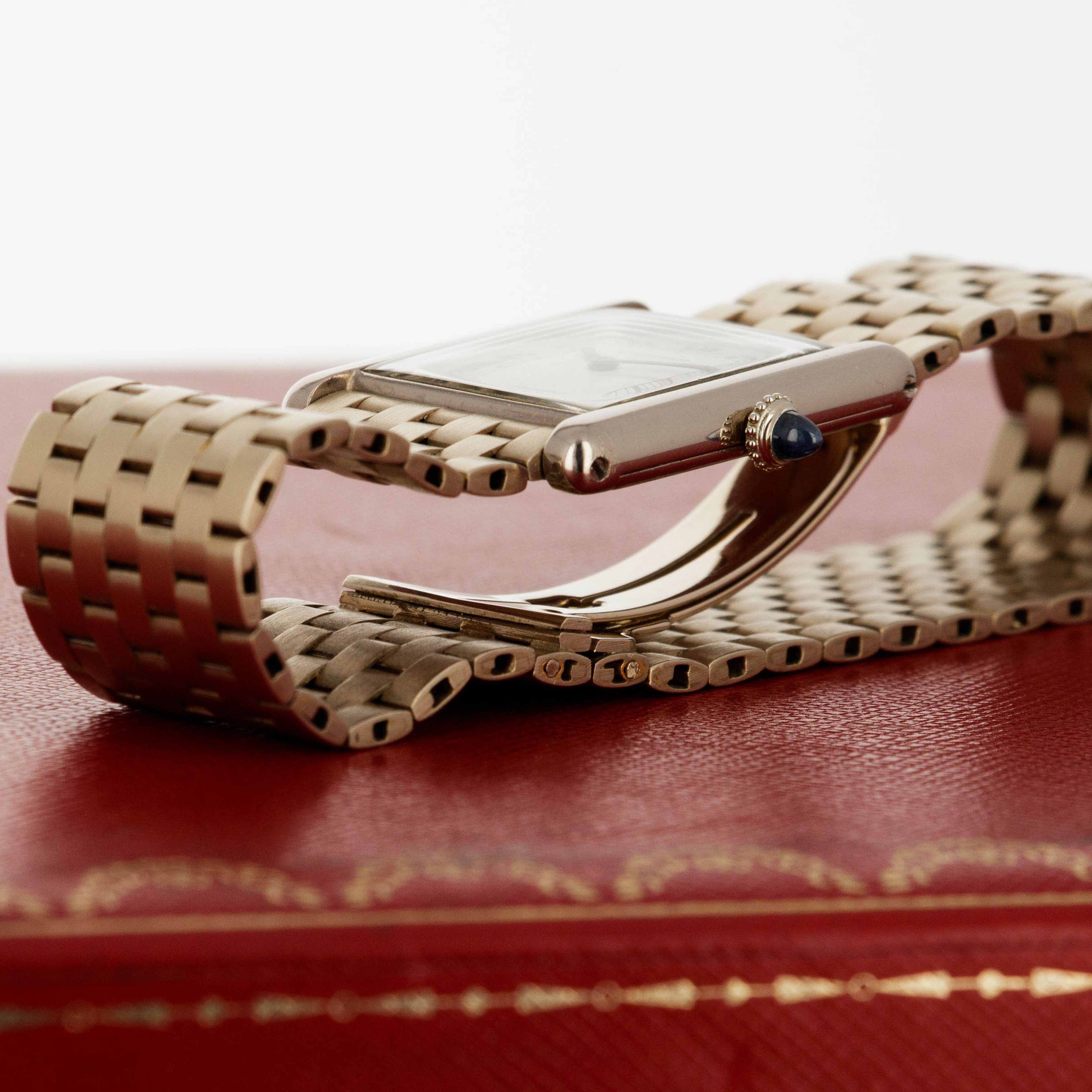 A wonderfully luxurious timepiece thanks to its entirely white gold construction, this Tank Louis combines a rare bracelet with a unique caseback inscription to create a piece of true historical treasure.