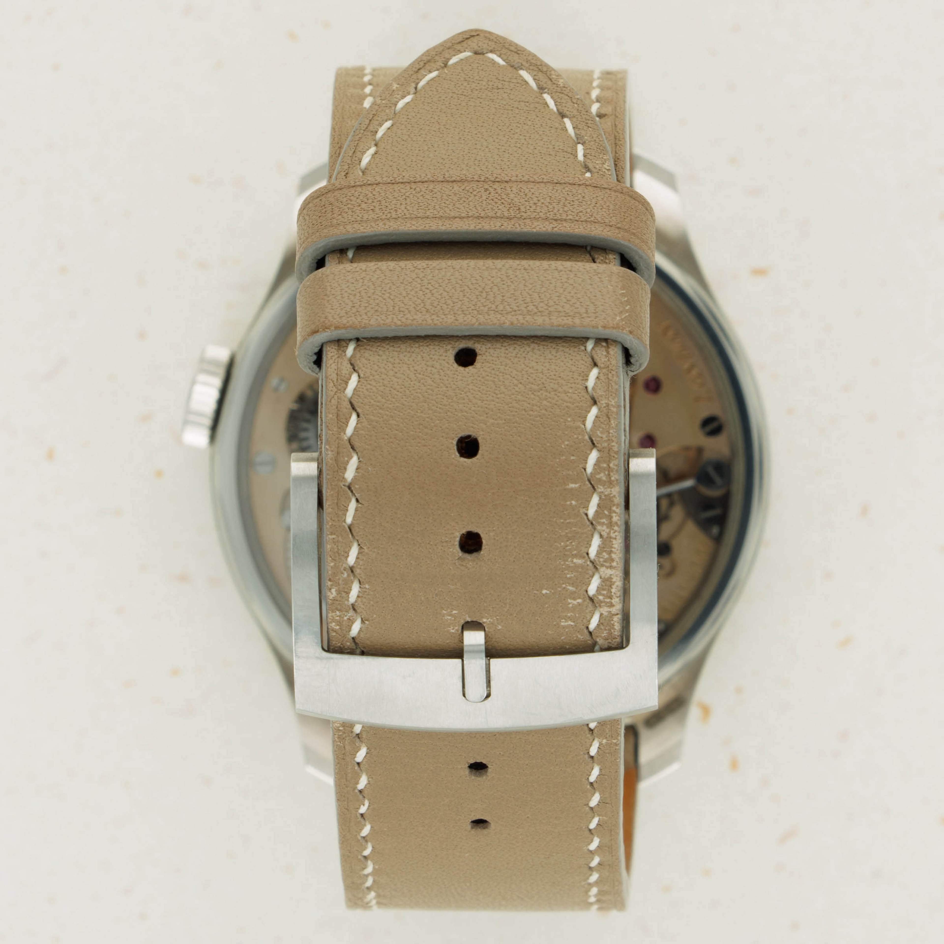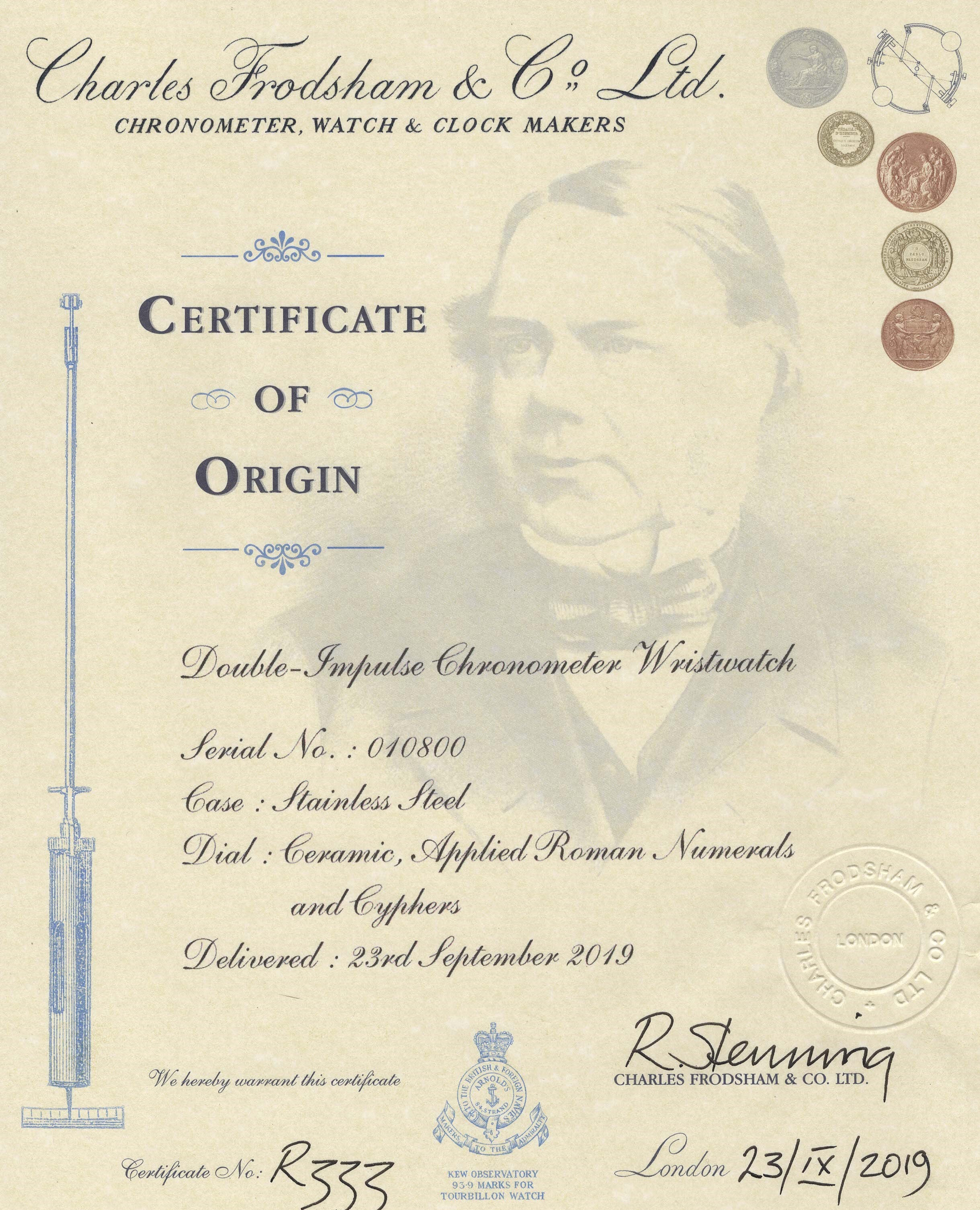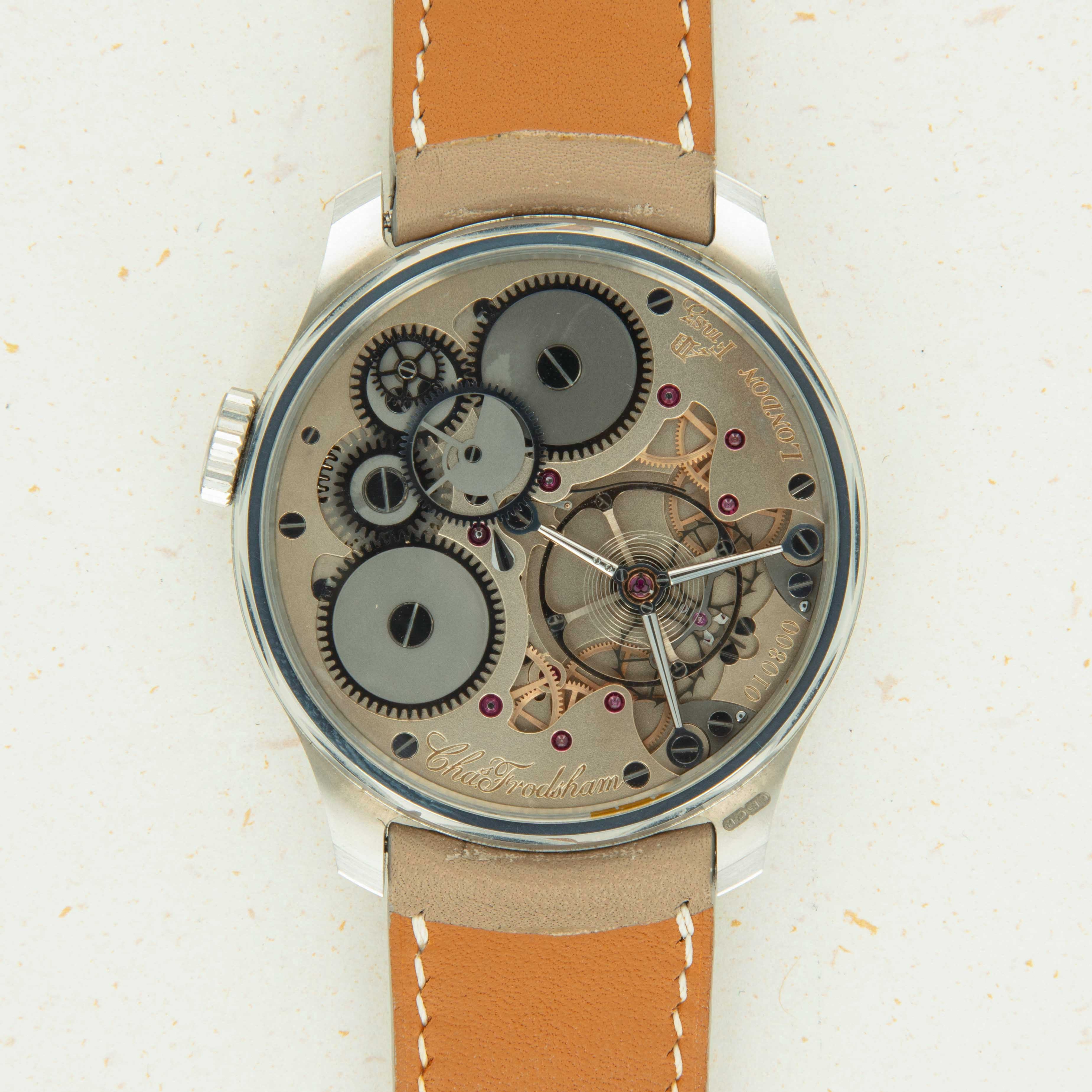 Watch is in like-new cosmetic condition, showing minimal signs of wear. The watch is accompanied by a Certificate of Origin only, as the watches are delivered without boxes by Charles Frodsham. There is light oil creep visible on the winding wheel coming from the mainspring arbor- this occurred occasionally on some of the very first examples that left the workshop. **Please Note: The Charles Frodsham workshop has graciously offered to the new owner, a complimentary check-up to clean the movement and insure that it is operating optimally. (Buyer would be responsible for transportation fees and any possible associated duties)**