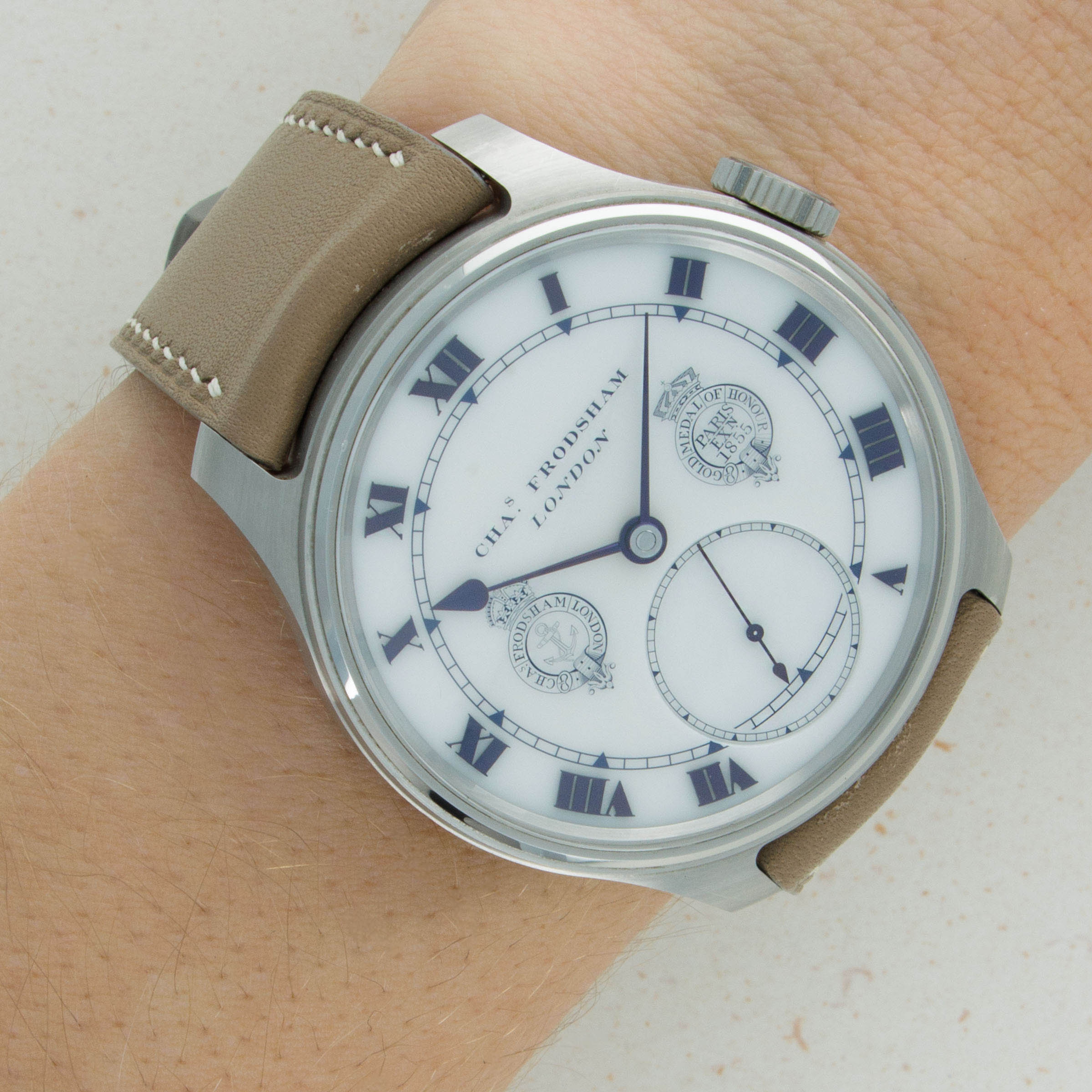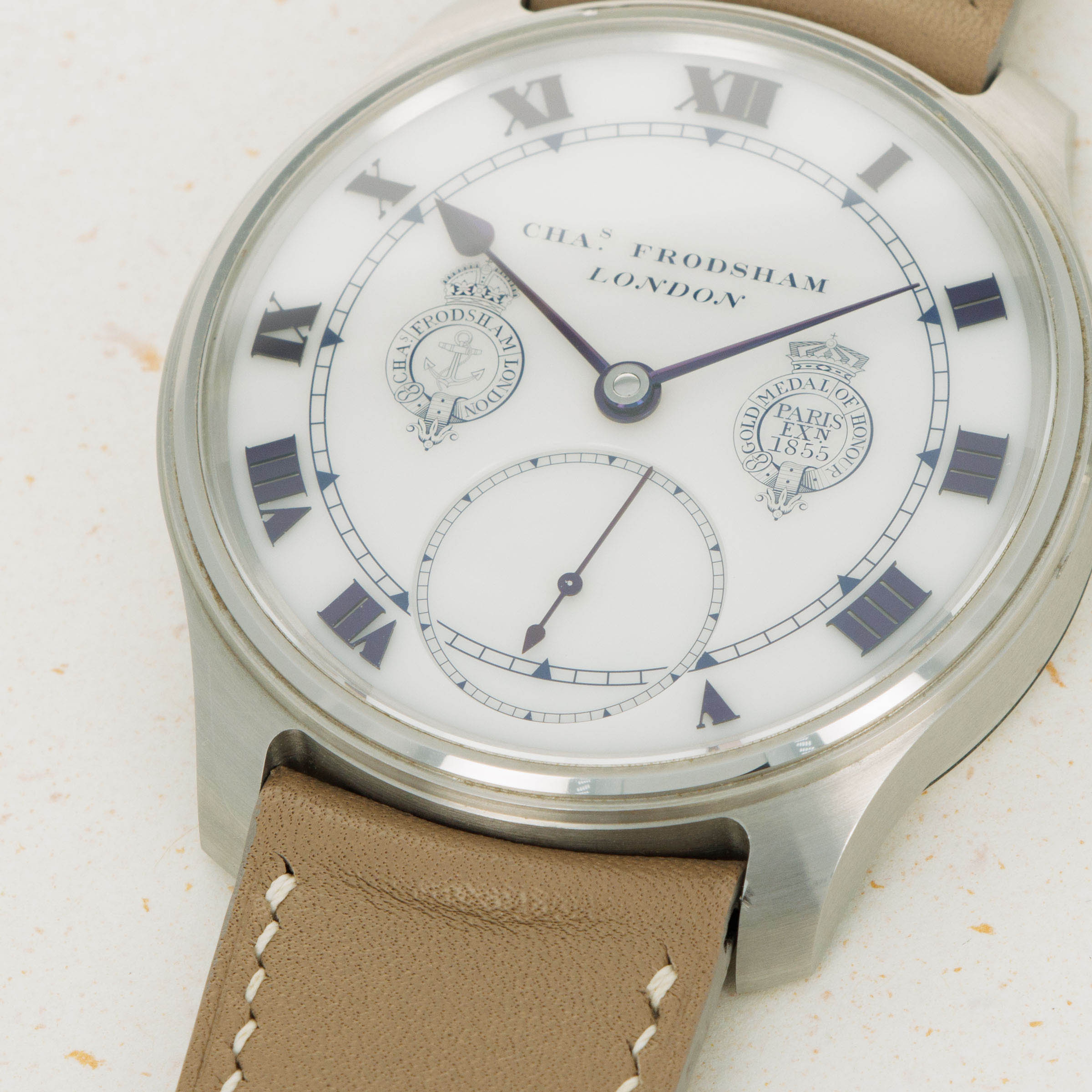 The matted-white ceramic dial features two equal-length hands, a quirk inspired by a Frodsham tourbillon pocket watch from the early 1900s, and the heritage cyphers are taken from 19th century Frodsham pocket pieces.