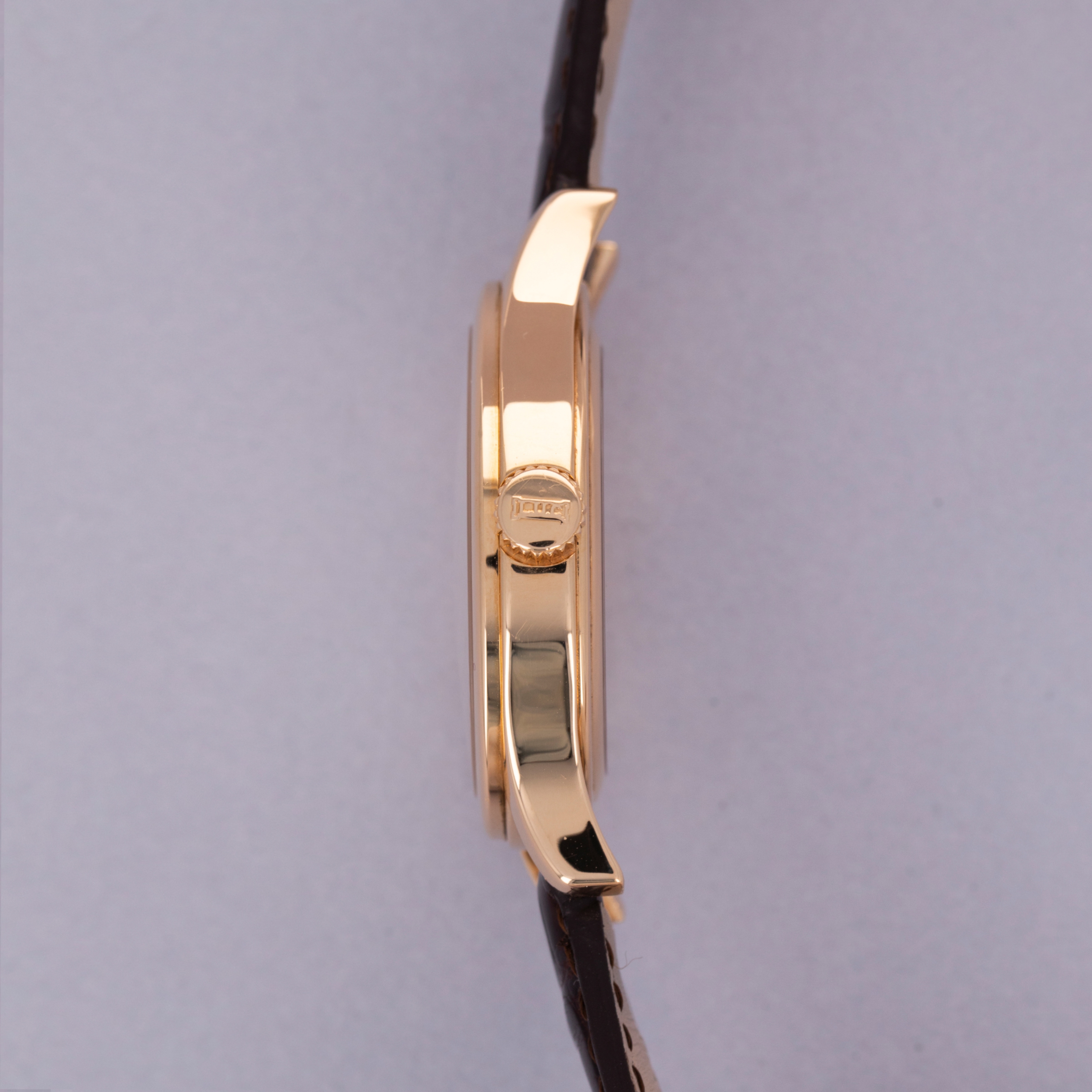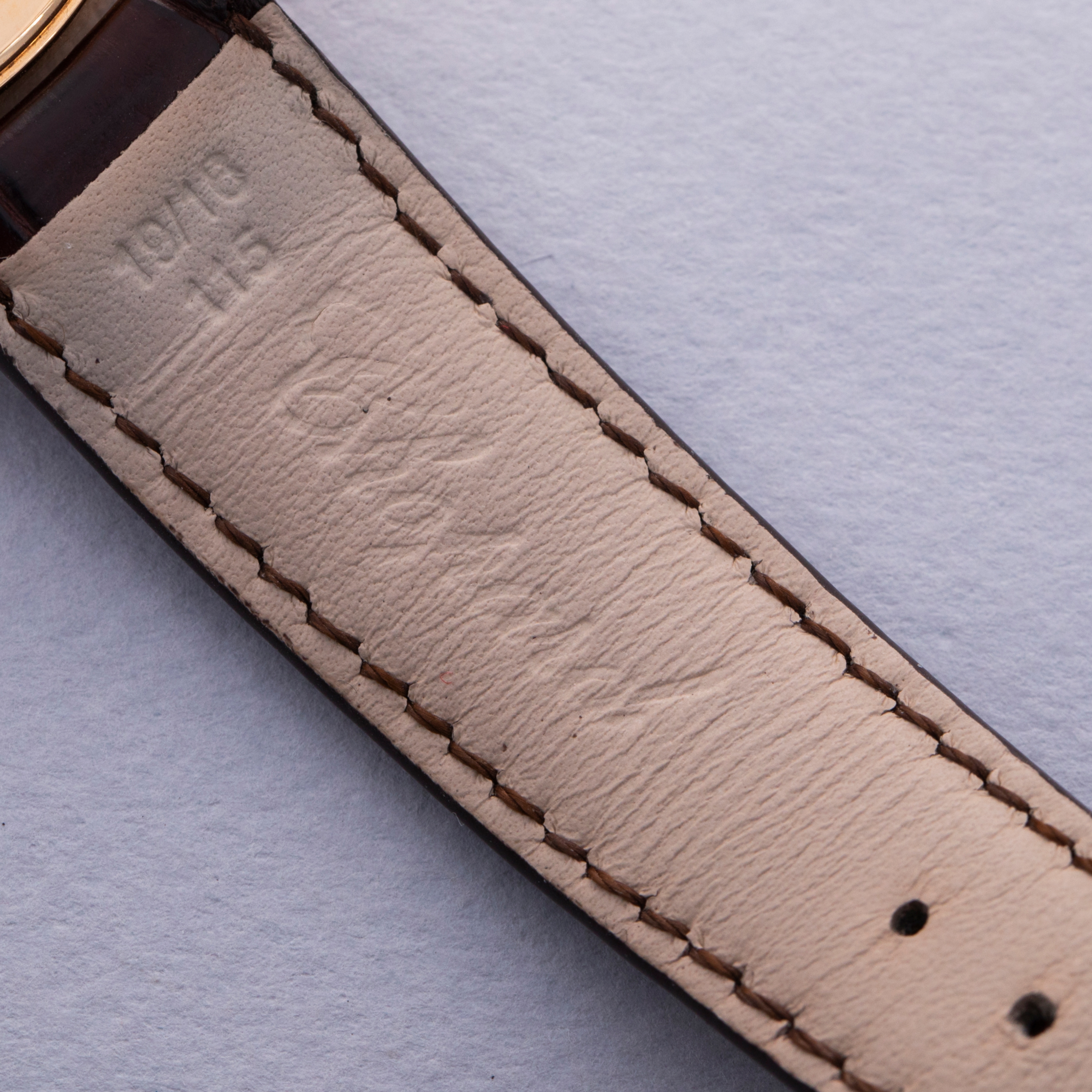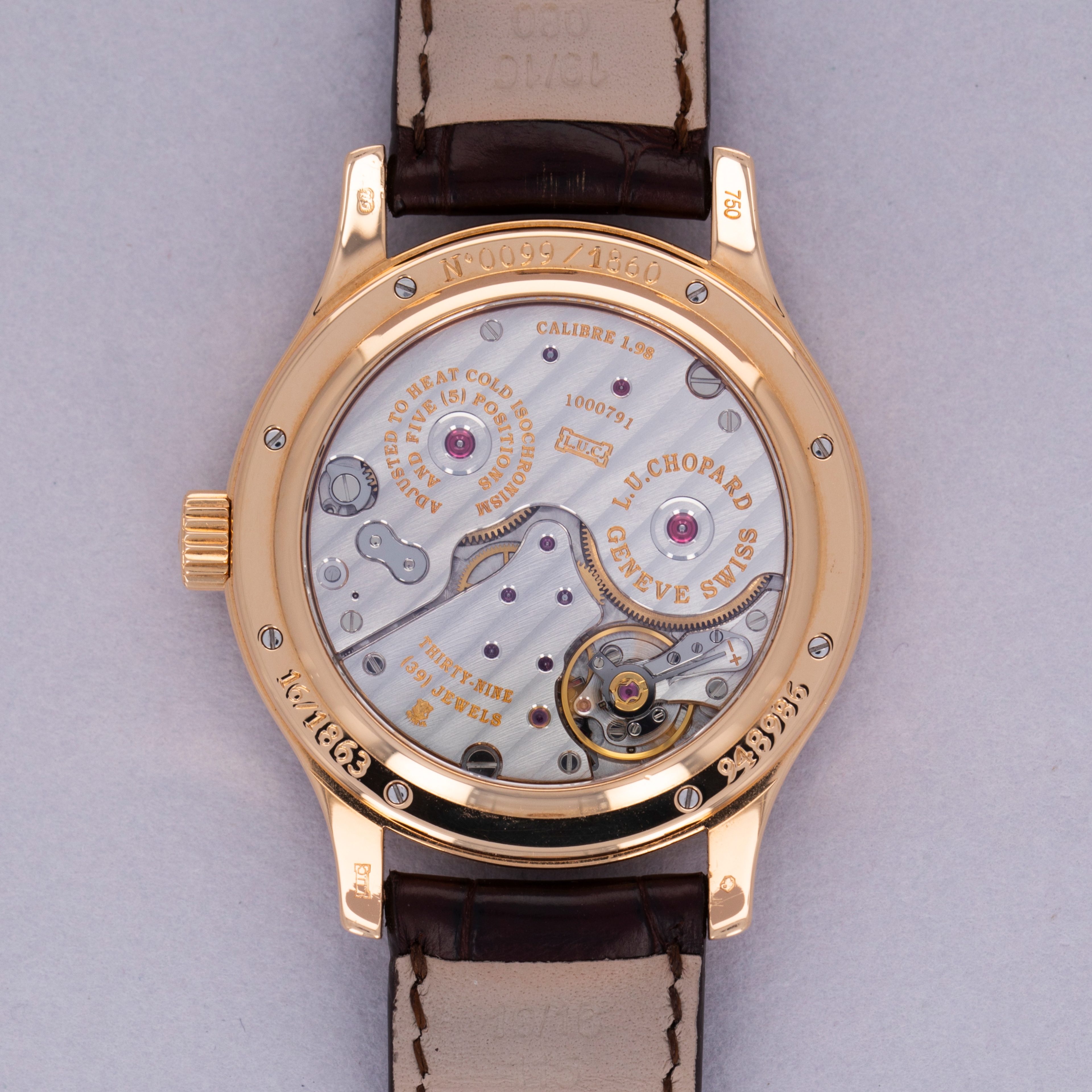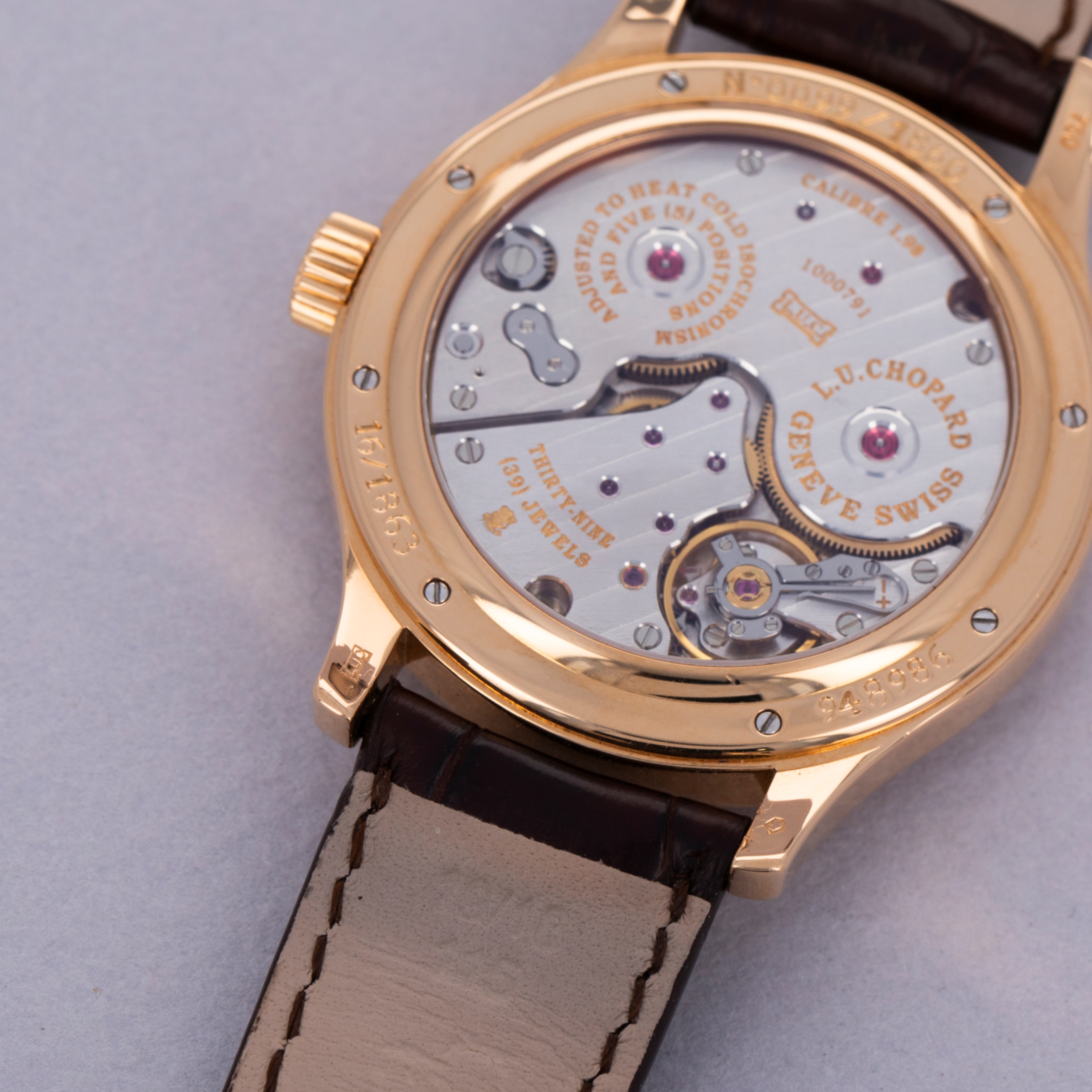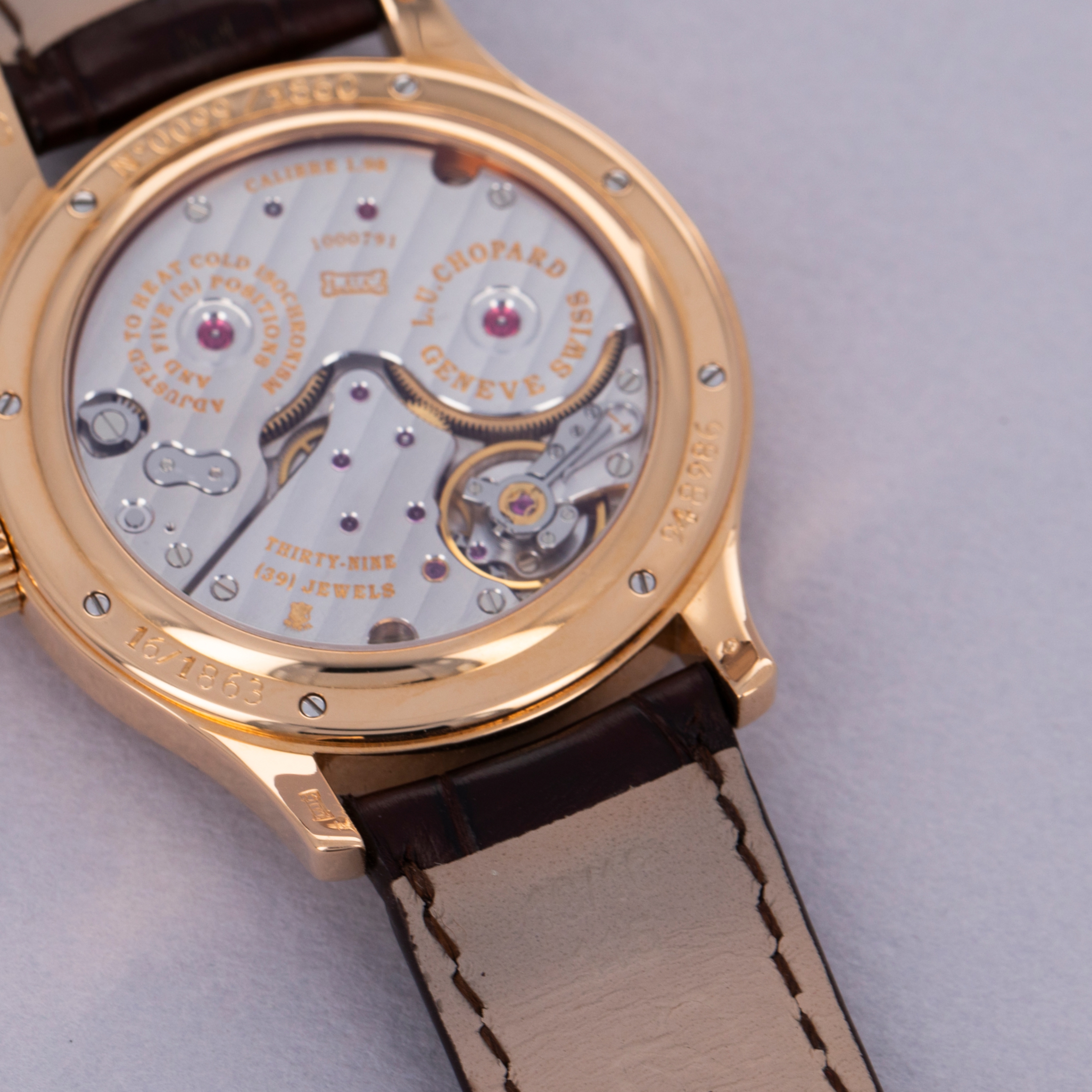 Measuring 38mm in diameter, the L.U.C. 16/1863 is a wonderfully wearable timepiece with classical details in its stepped domed bezel, swooping lugs and hefty 18kt rose gold construction.