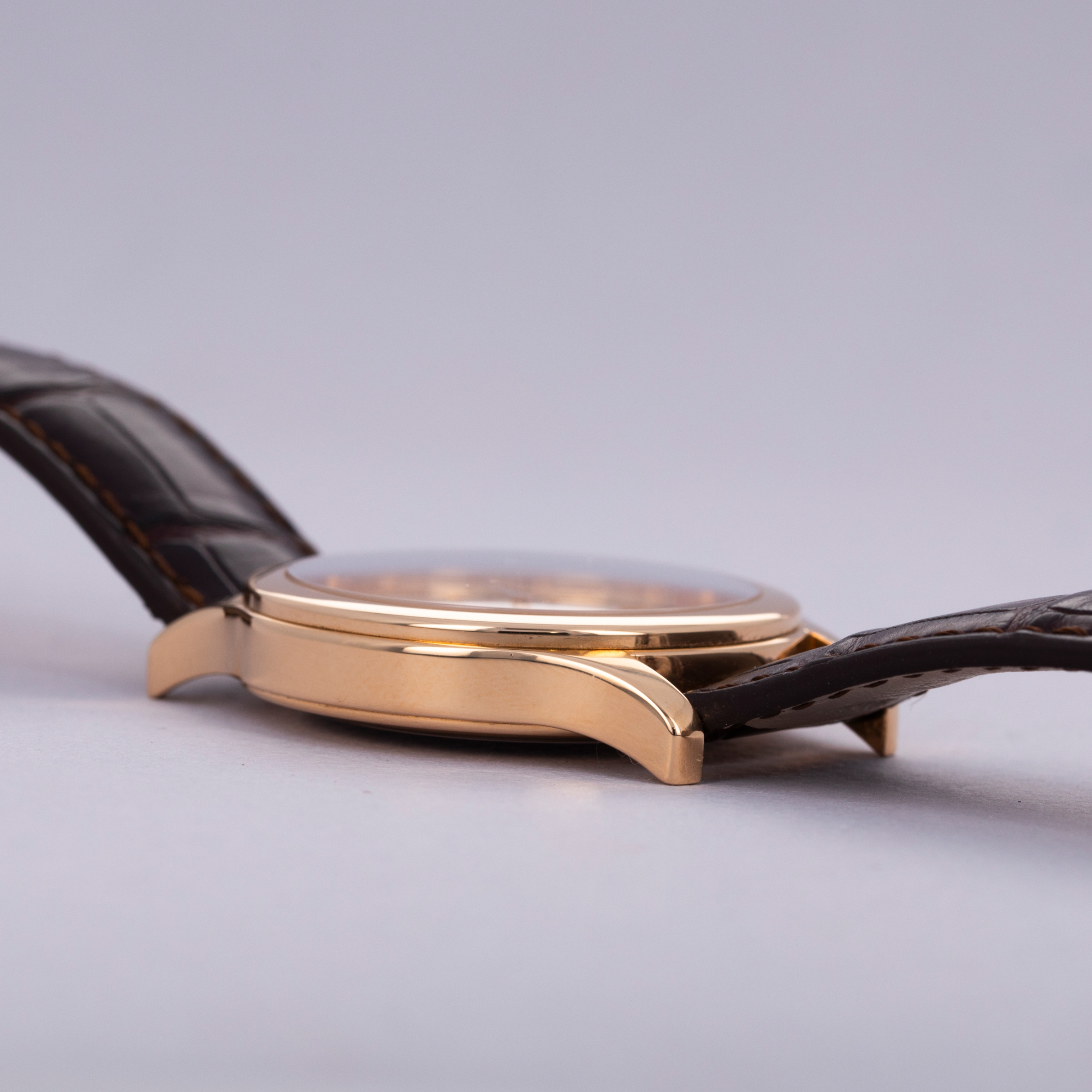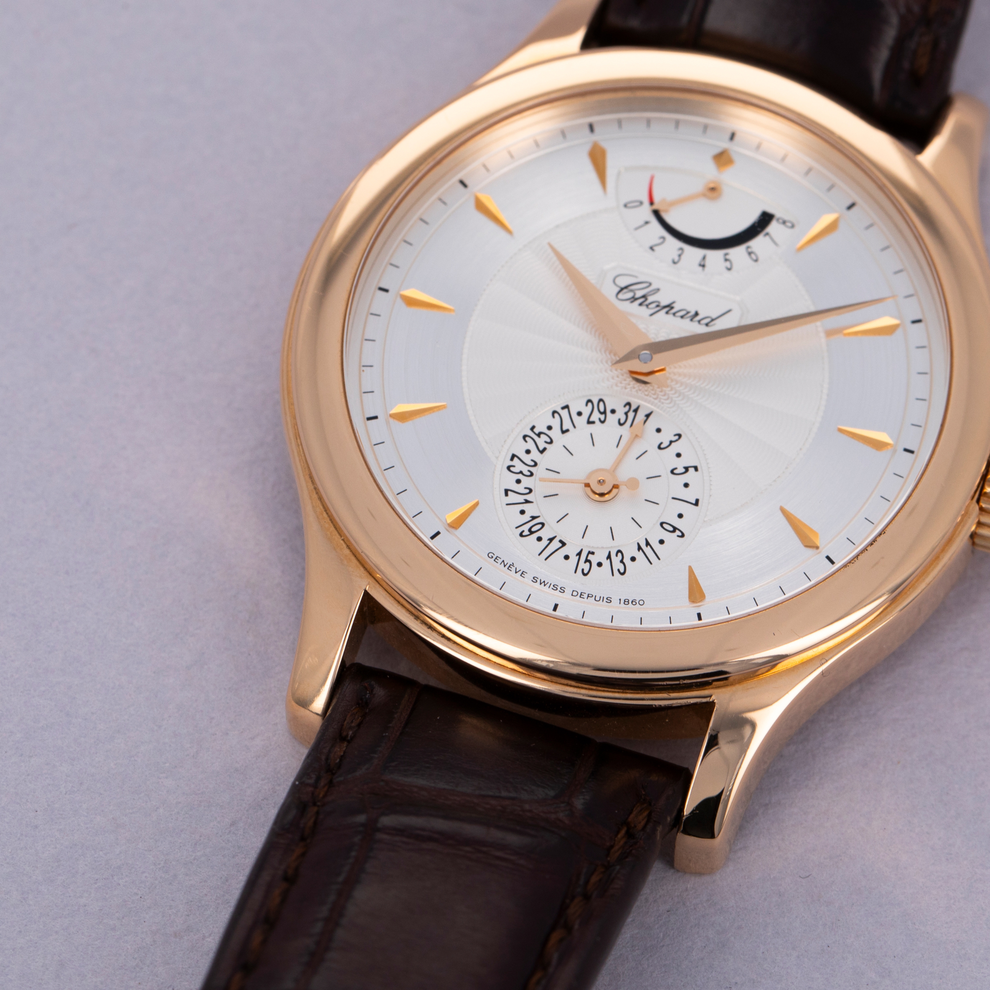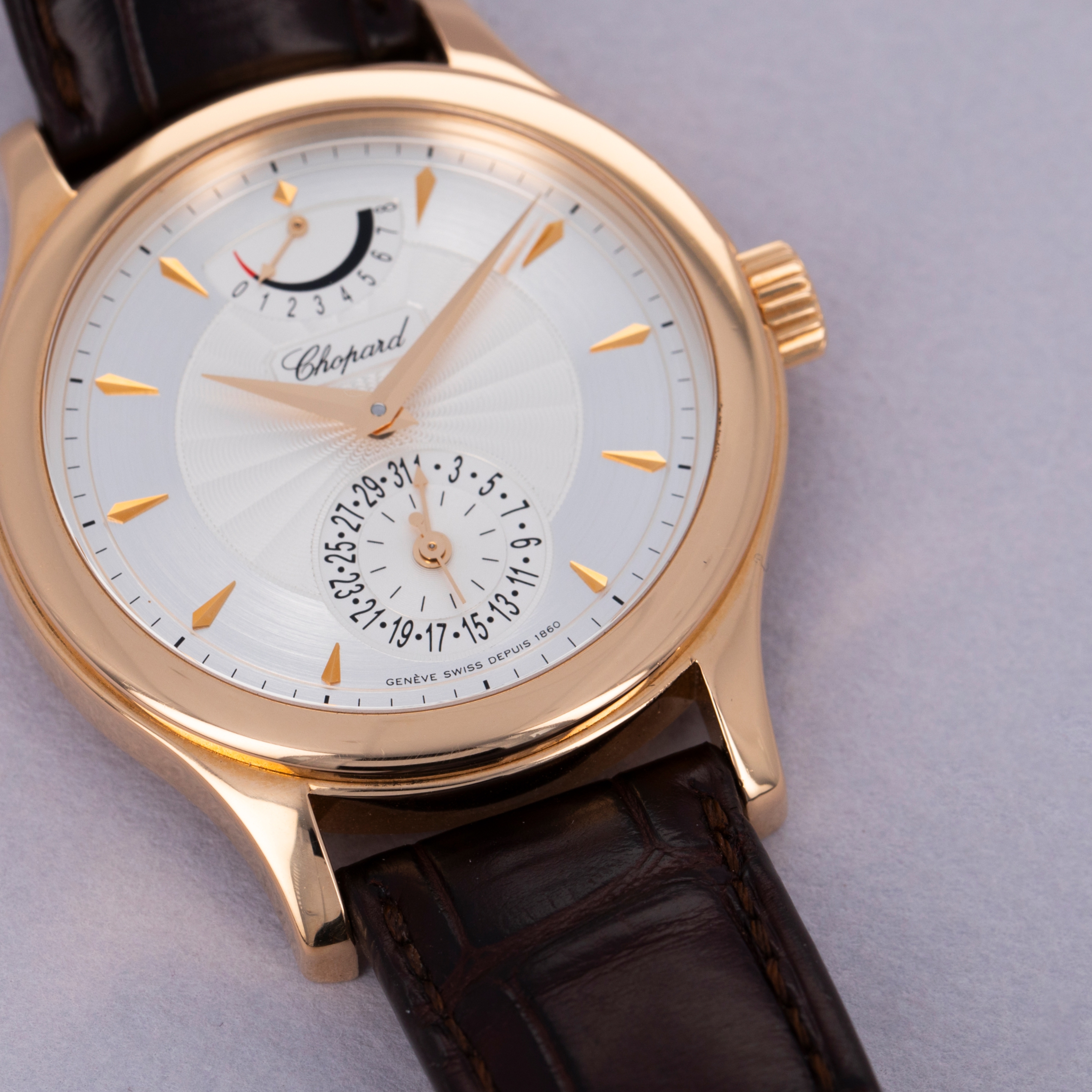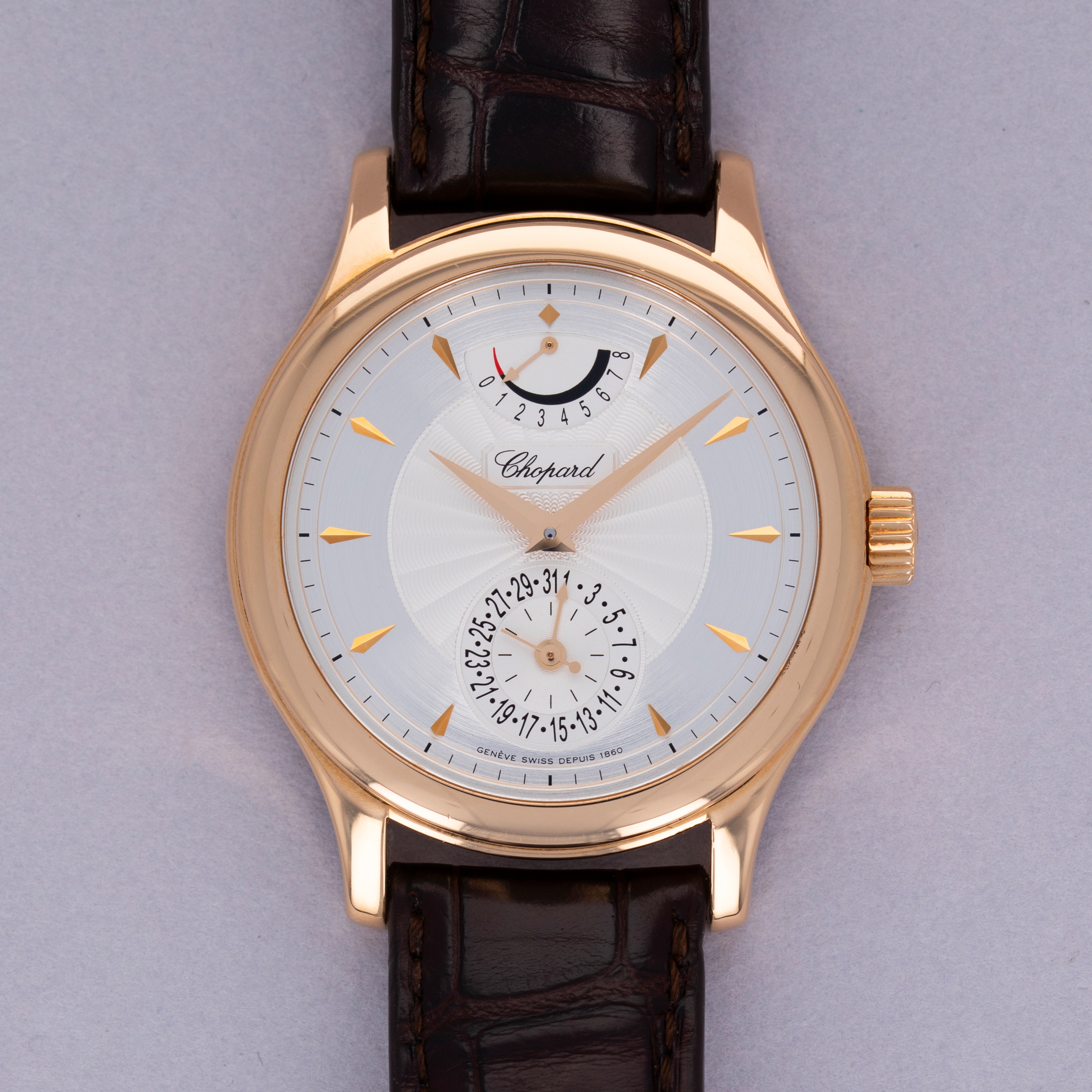 Launched in 1996, Chopard’s L.U.C. segment (named after Chopard's founder) was set up to commemorate Chopard's heritage as a high-precision movement manufacturer. Perhaps the ultimate expression of Chopard's watchmaking prowess, watches produced by L.U.C. include some of the most laboriously produced movements to come from Switzerland. The processes used to produce these movements include delicate hand finishing, accurate assembly, tedious testing, and careful casing. In 2004, Chopard and Parmigiani Fleurier even came together to create a certification to attest that 100% of a watch head was made in Switzerland, an attempt to combat the Swiss Government's lackluster definition of "Swiss Made” whereby only 60% of the value of a watch has to come from Switzerland. Ever since its inception, Chopard’s L.U.C. timepieces have become celebrated pieces of horology, and this limited edition 16/1863 of only 1860 pieces (yet it is theorized that Chopard only ended up producing less than half of that) is no different with its beautiful silver dial, stunning movement, and wonderfully classical 38mm x 10mm 18kt rose gold case. A dress watch in style, but far more than that, this timepiece boasts a pointer date display set around its seconds subdial at 6 o’clock that is balanced by a retrograde power reserve indicator at 12 o’clock for its lengthy 8-day power reserve which derives from its twin-barrels that also inspire this timepiece's name 'Quattro".