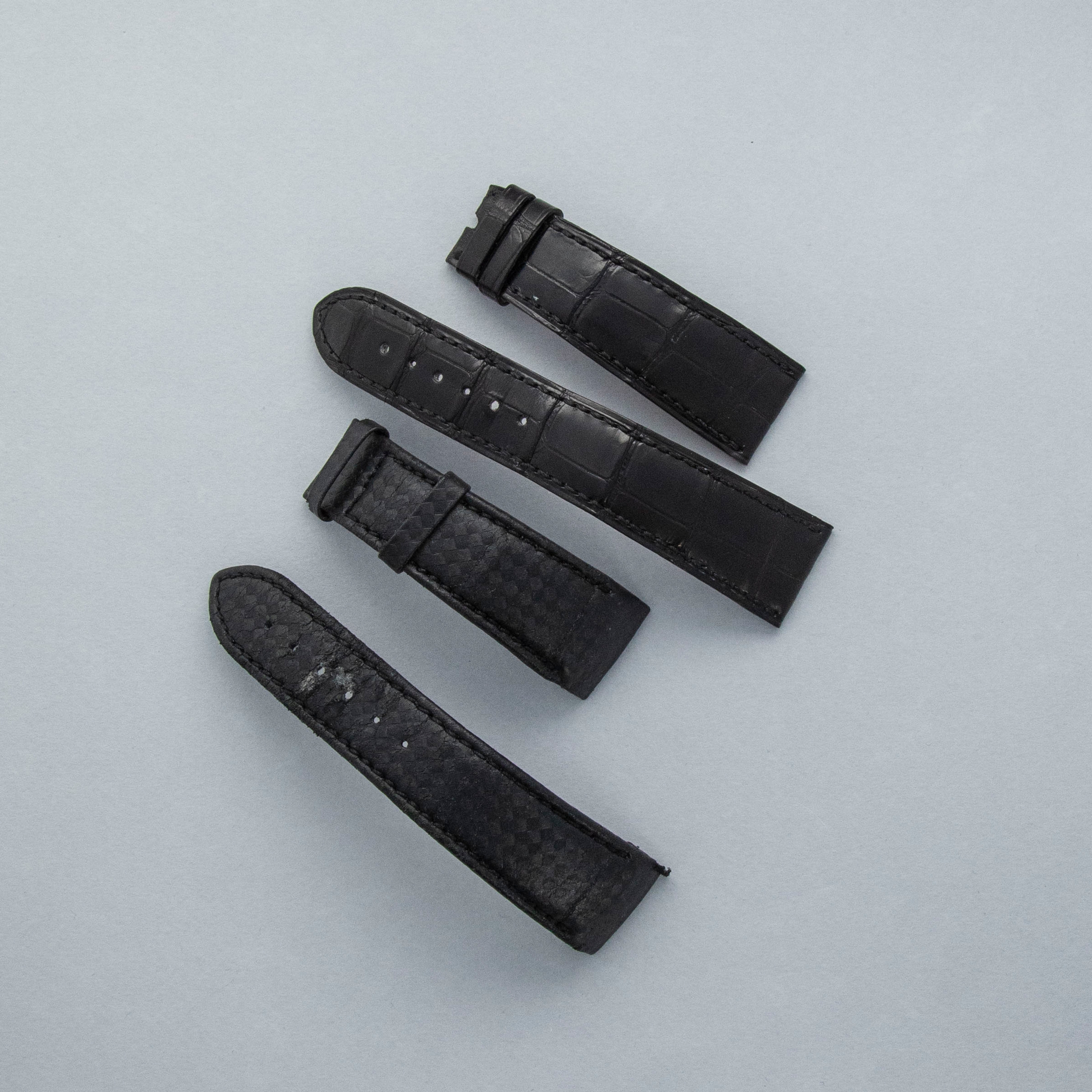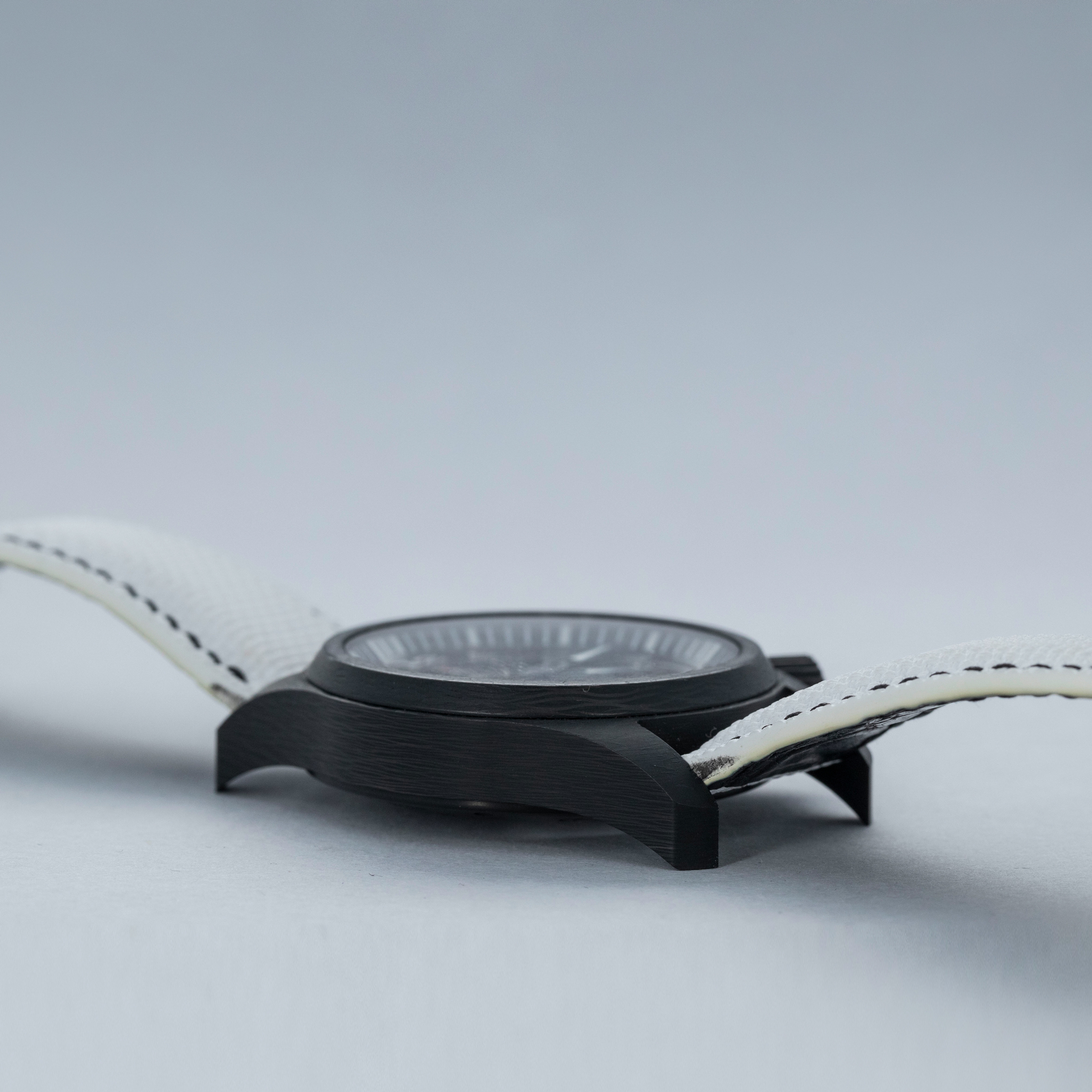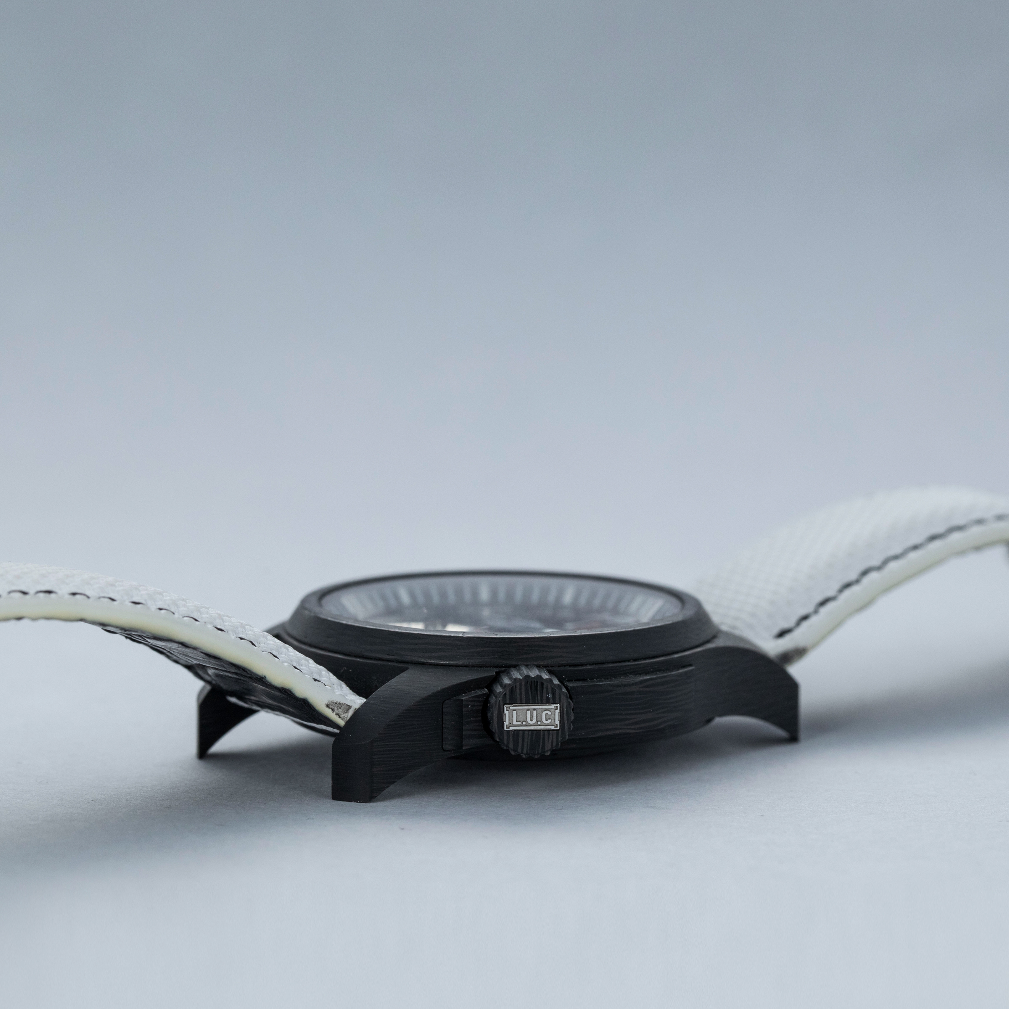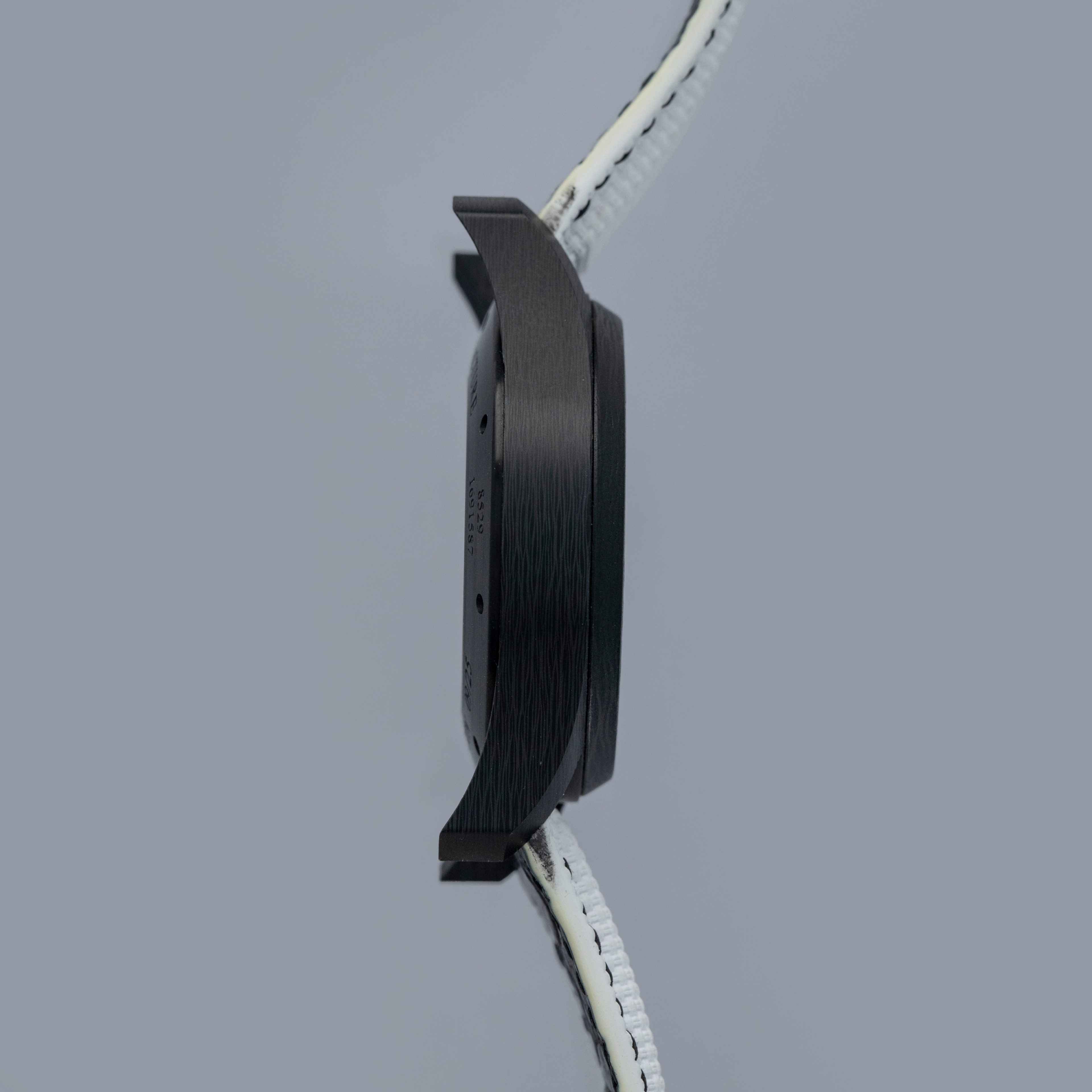 The watch is in near-mint condition. The case shows some superficial signs of wear, with a few marks on the sapphire display case back and minor wear to the screw heads. The dial and hands are near-mint. It is currently fitted with a white strap and black pin buckle, both in near-mint condition. The watch is also accompanied by a used black carbon-fibre effect strap and a black alligator strap.