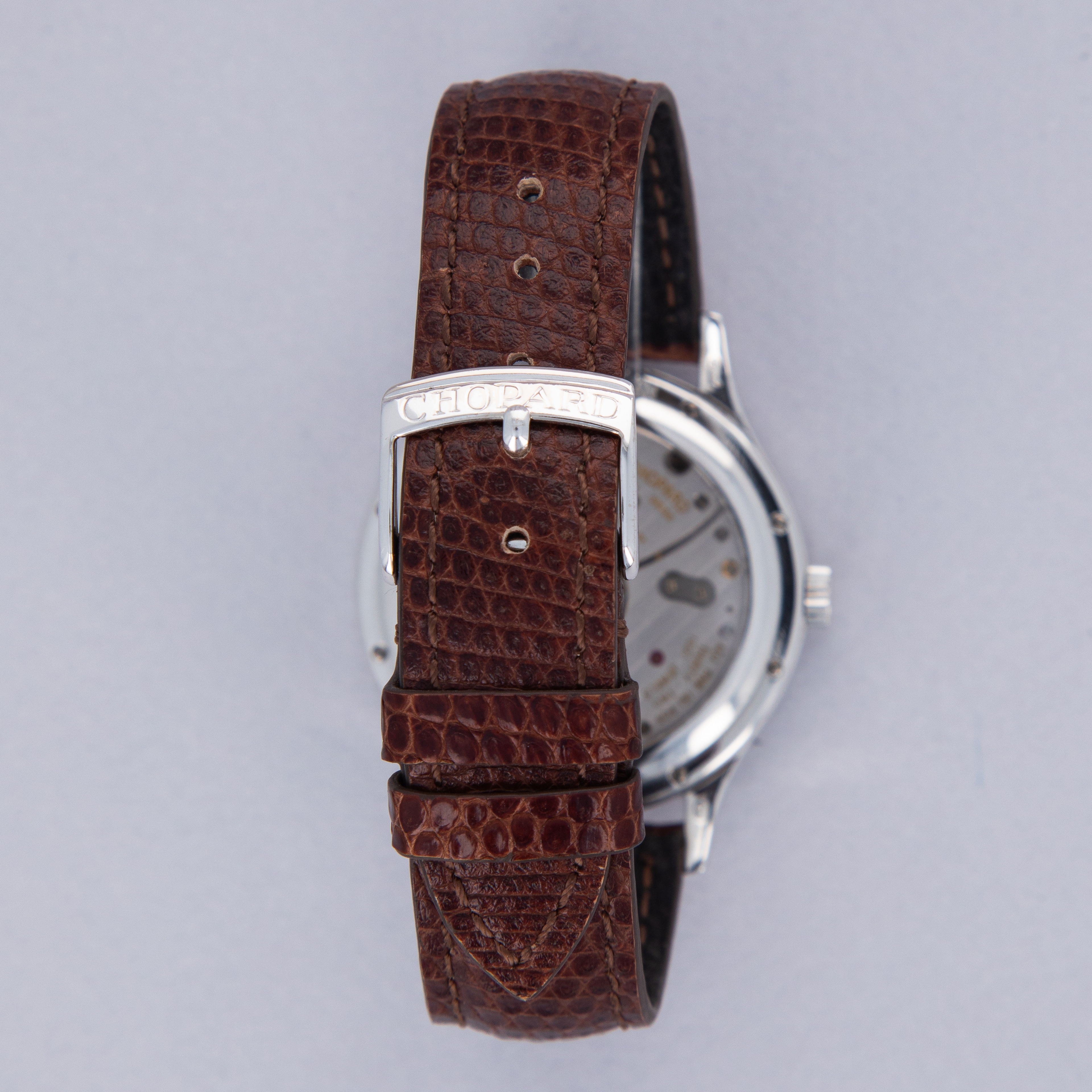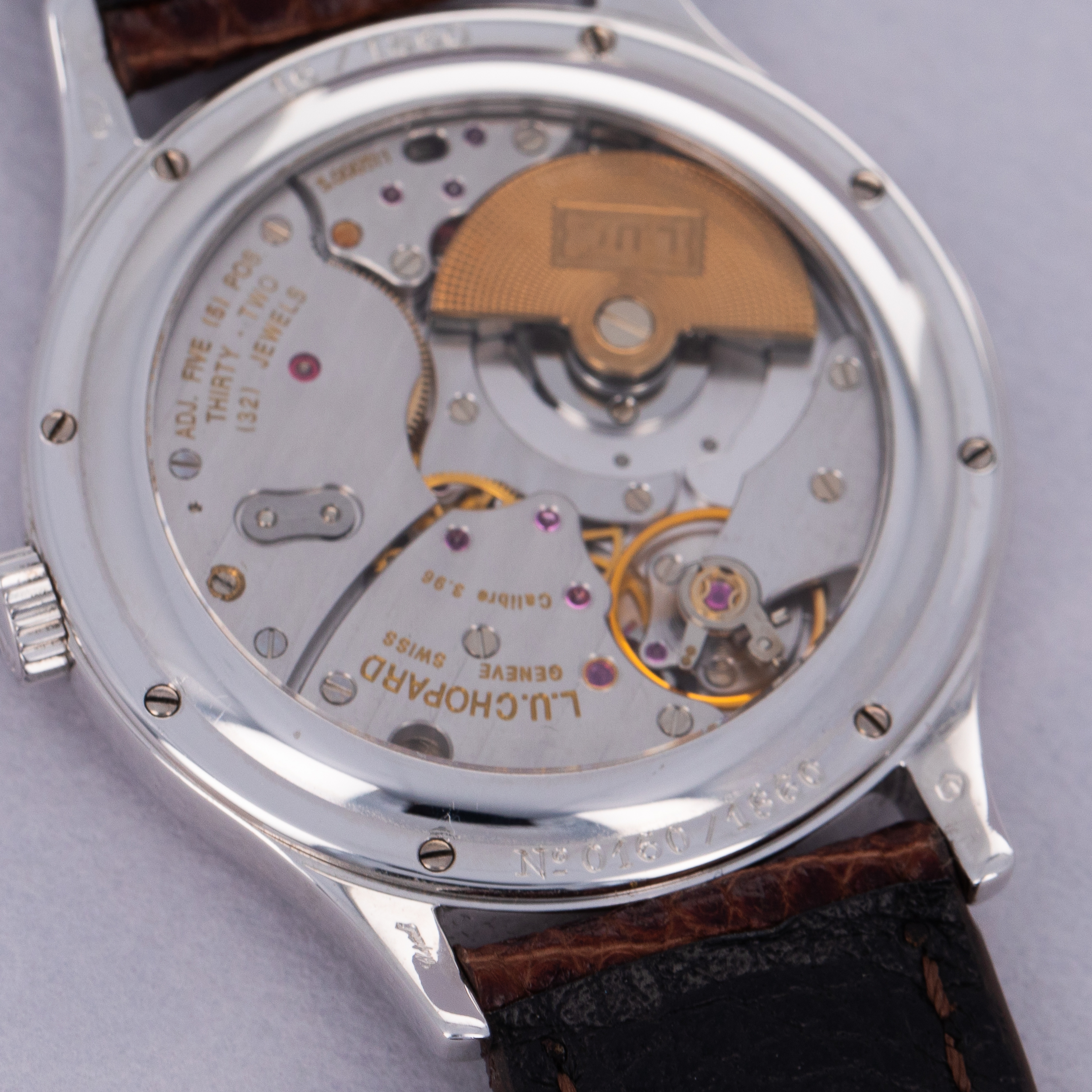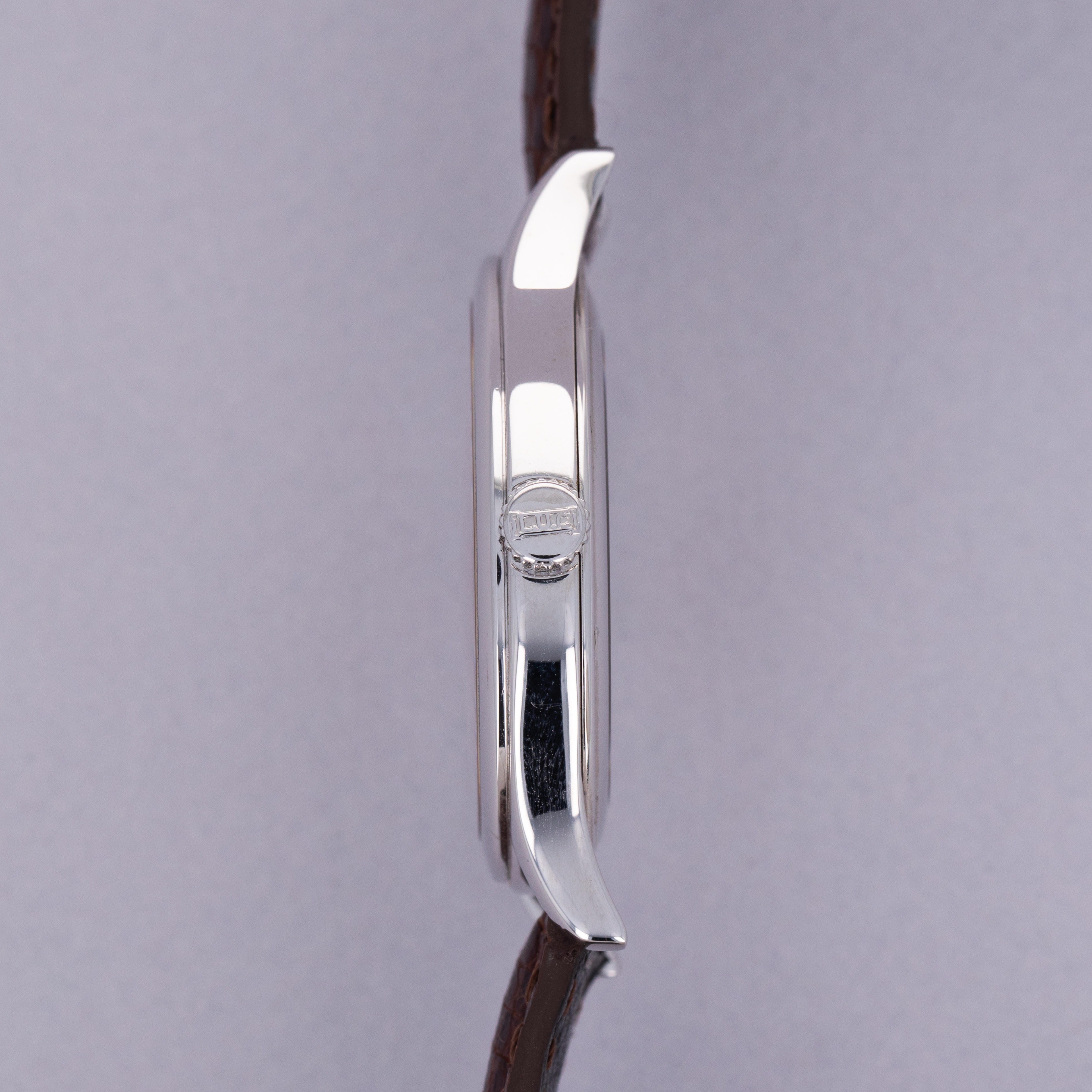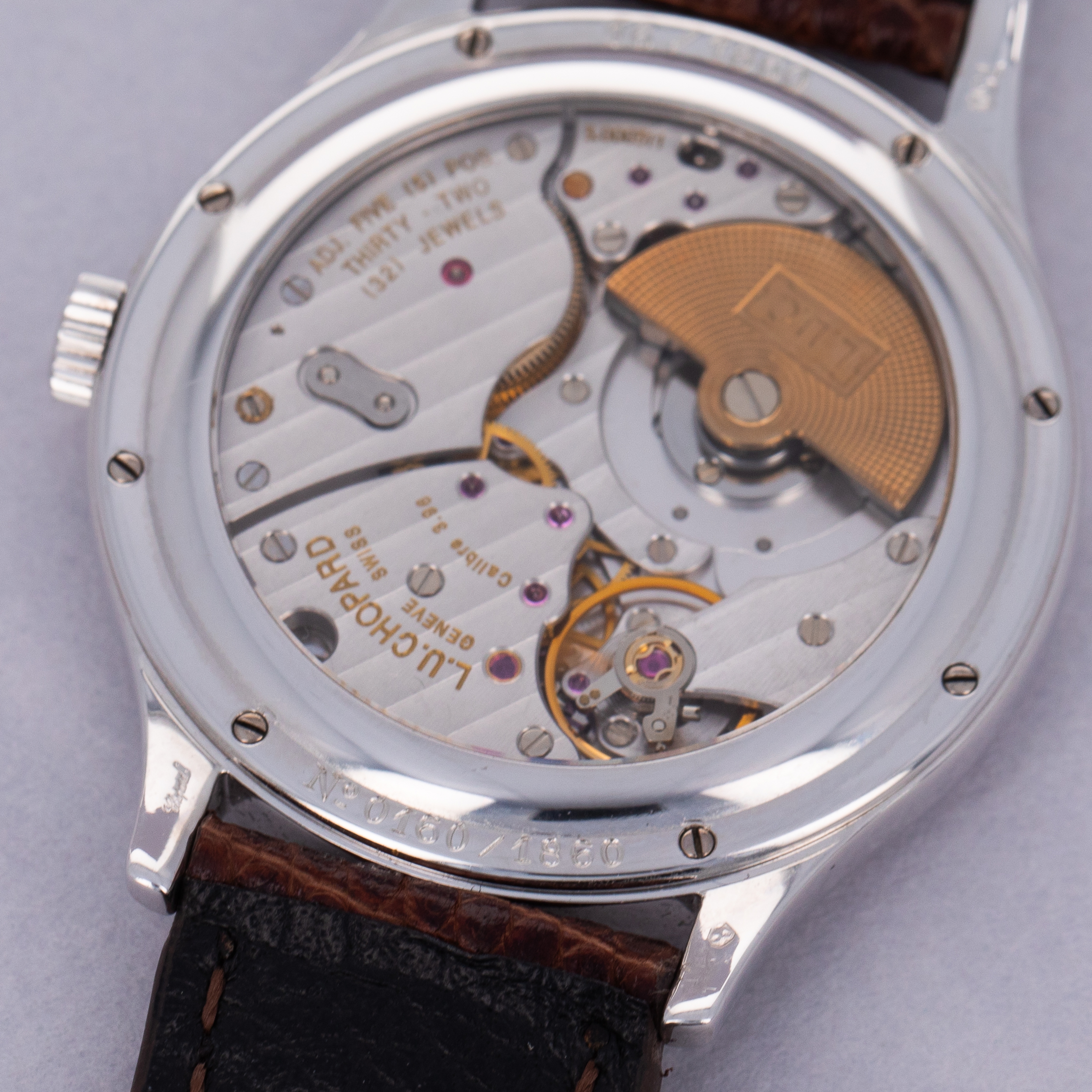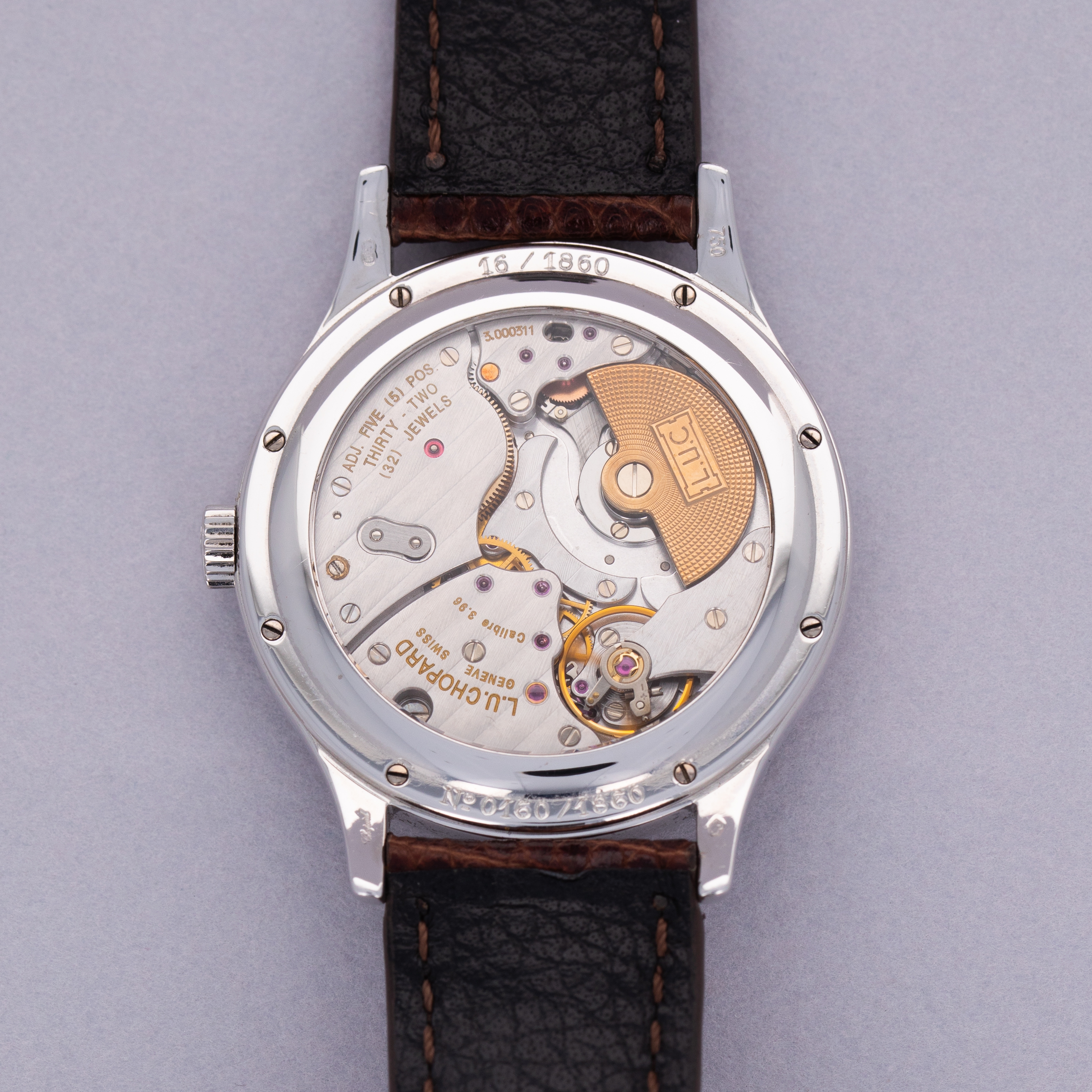 Measuring 38mm in diameter, the L.U.C. 16/1860 is a wonderfully wearable timepiece with classical details in its stepped domed bezel, swooping lugs and hefty 18kt gold construction.