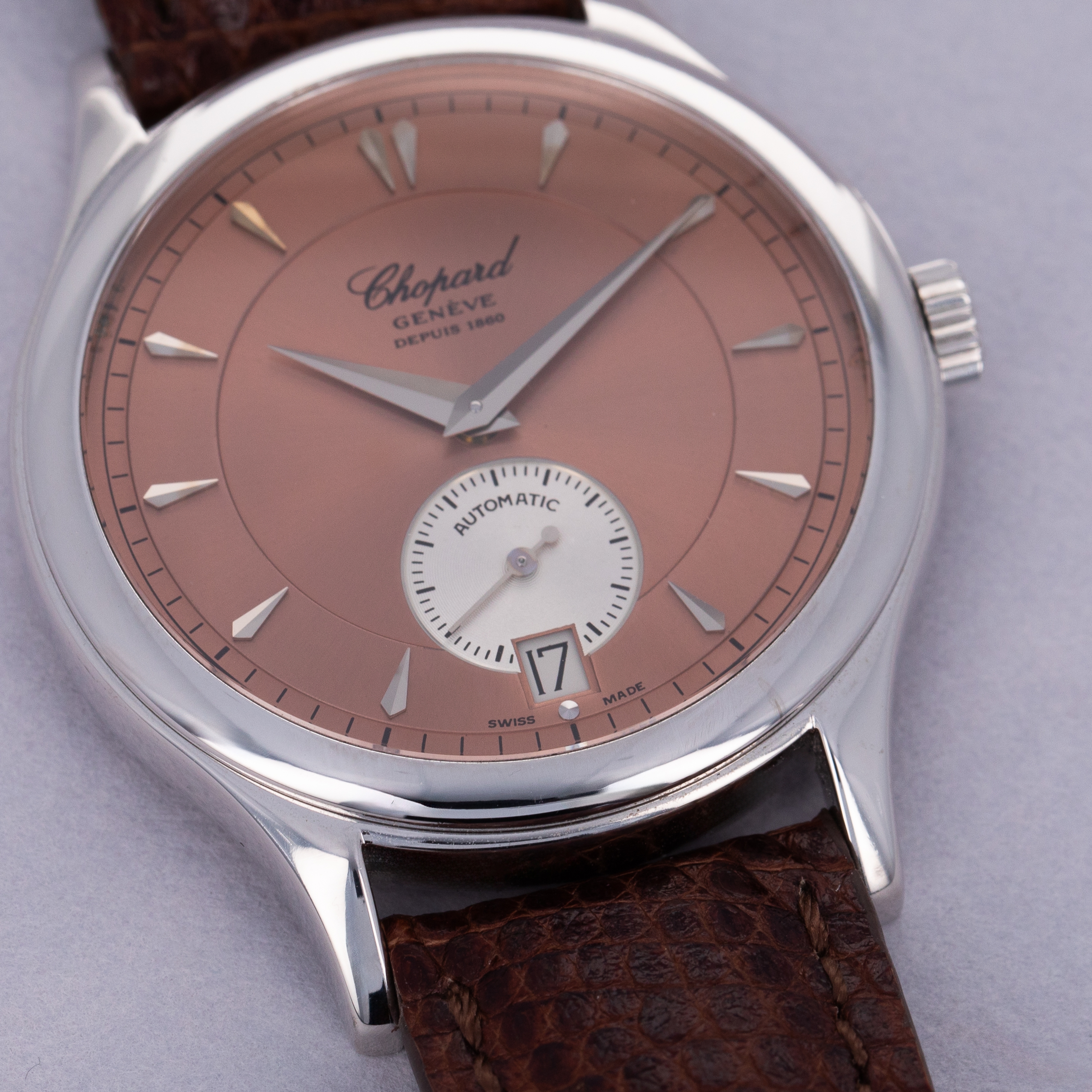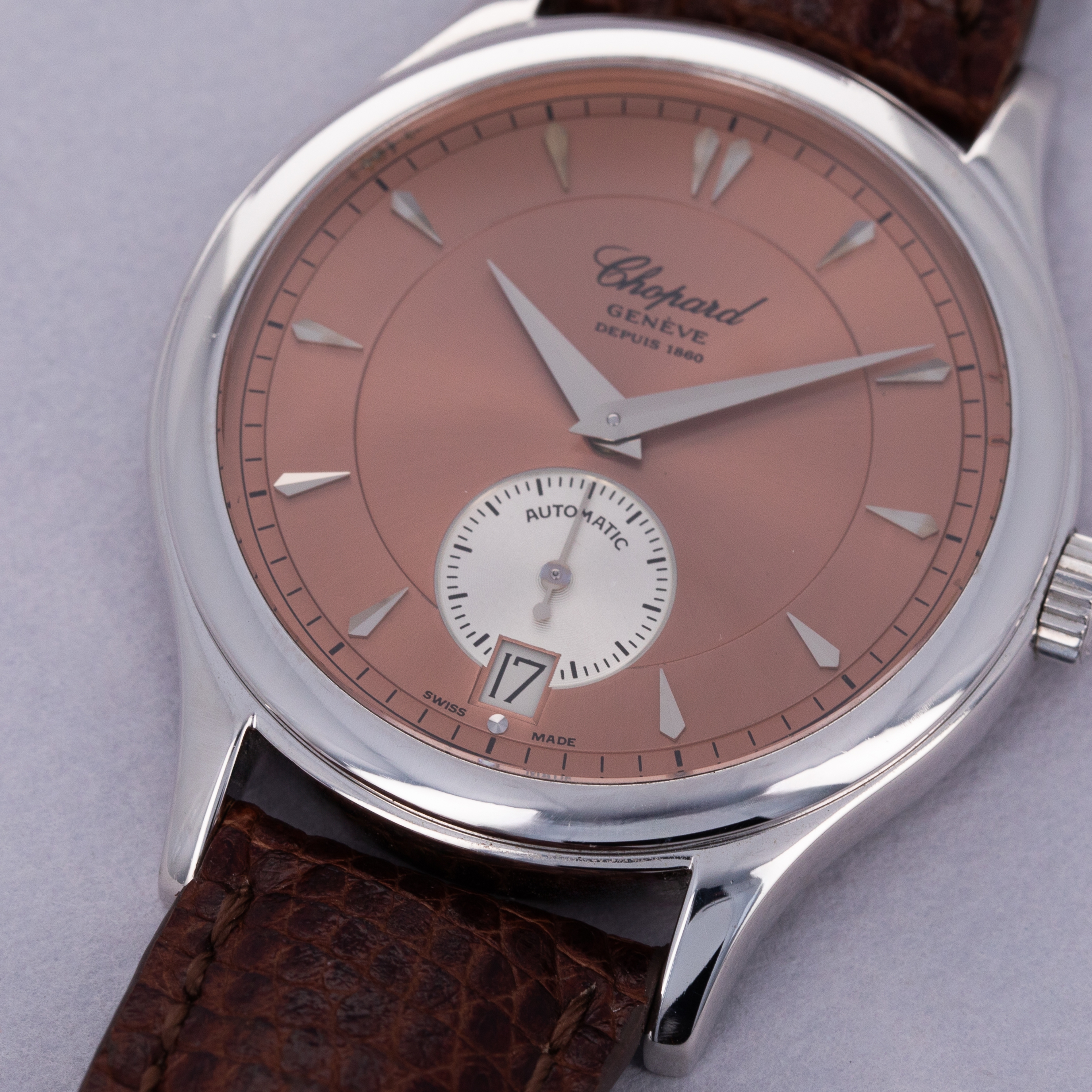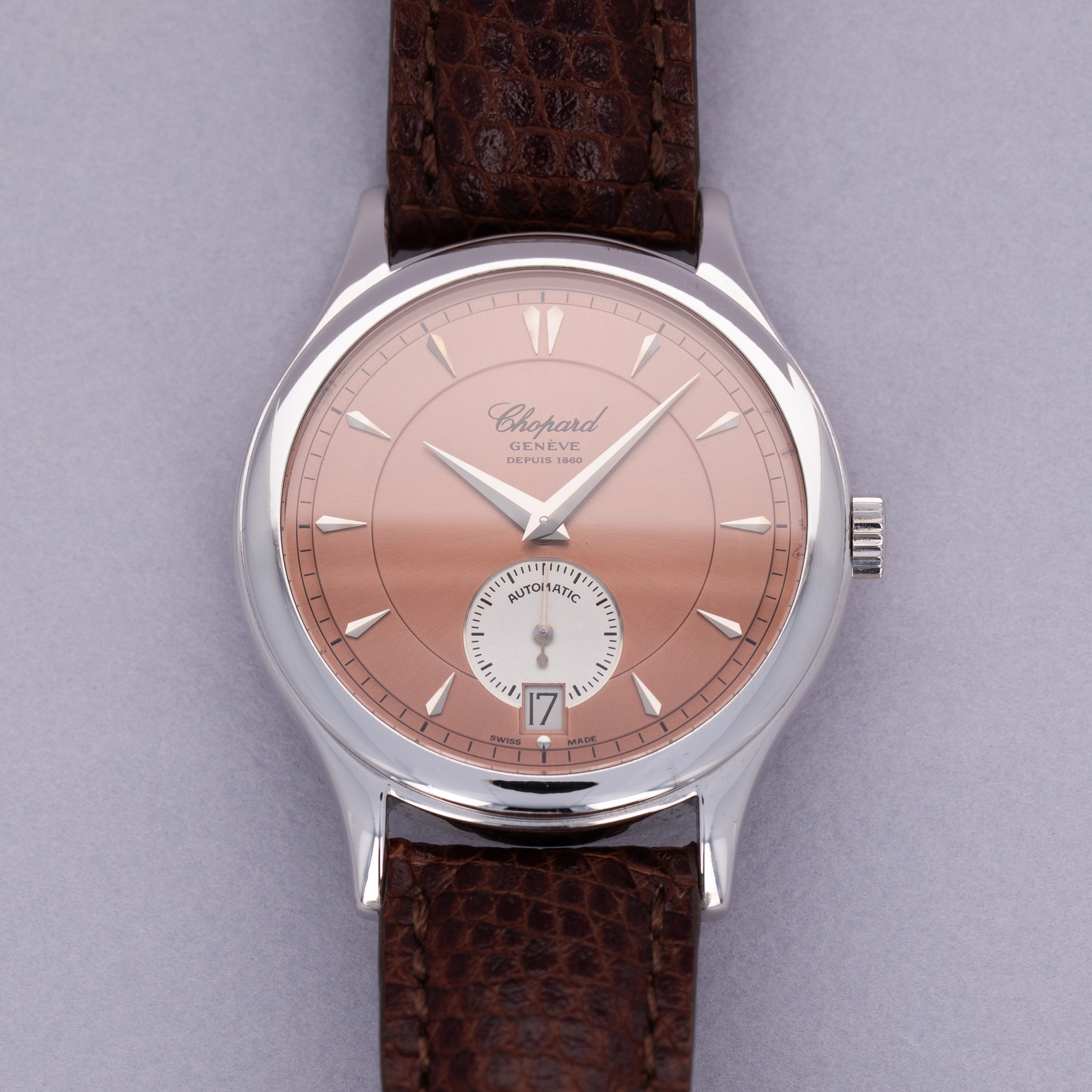 Boasting a beautiful salmon dial with its stepped design and silver subdial, the 16/1860 showcases some of Chopards restraint through its elegance and understated appearance.