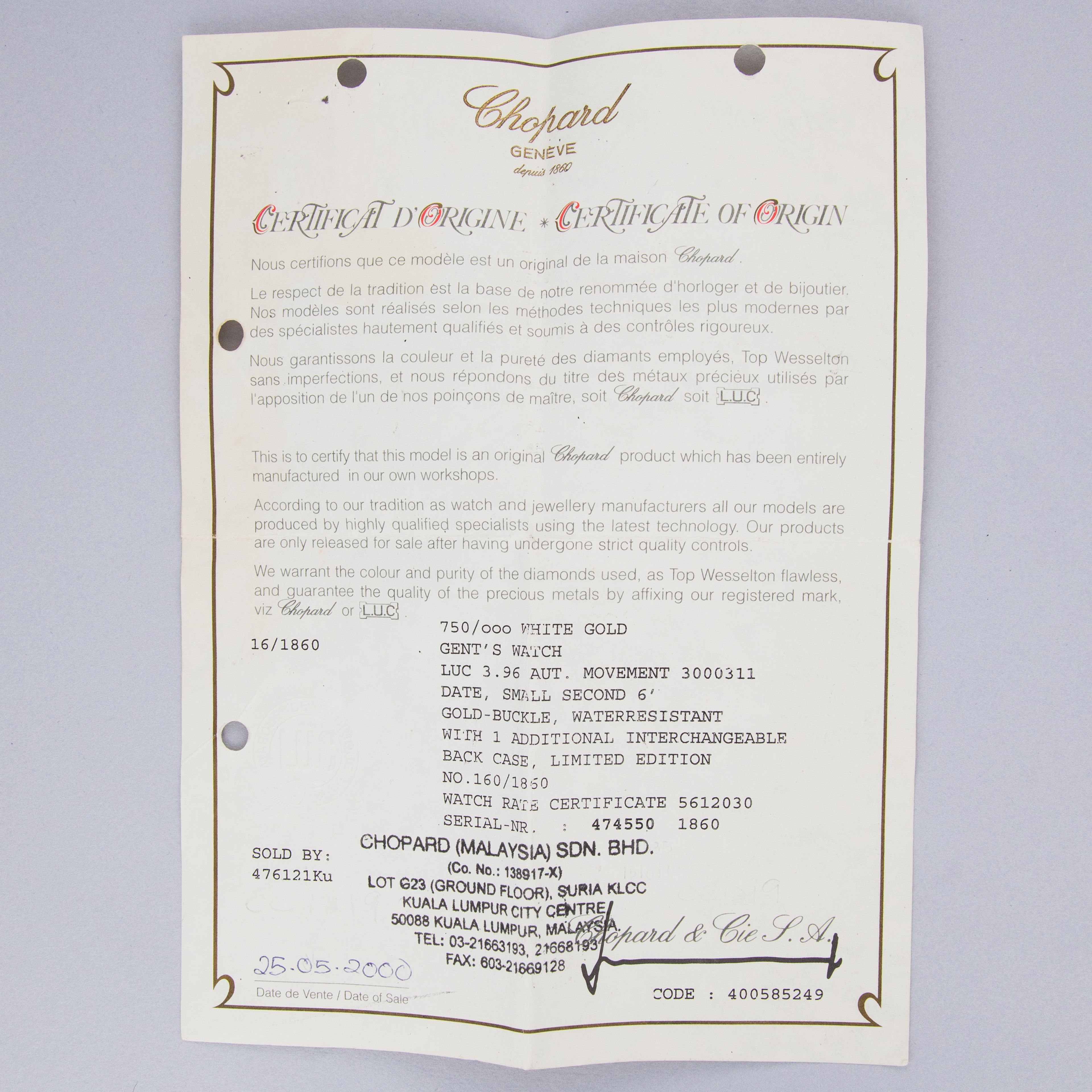 Watch is in excellent condition. Case shows minor signs of wear along the case surfaces. The watch comes with its original guarantee certificate as well as secondary purchase invoice. Watch comes with its original 18k WG buckle. AMENDED: Upon closer inspection there are small areas of oxidation visible on the edge of the dial.