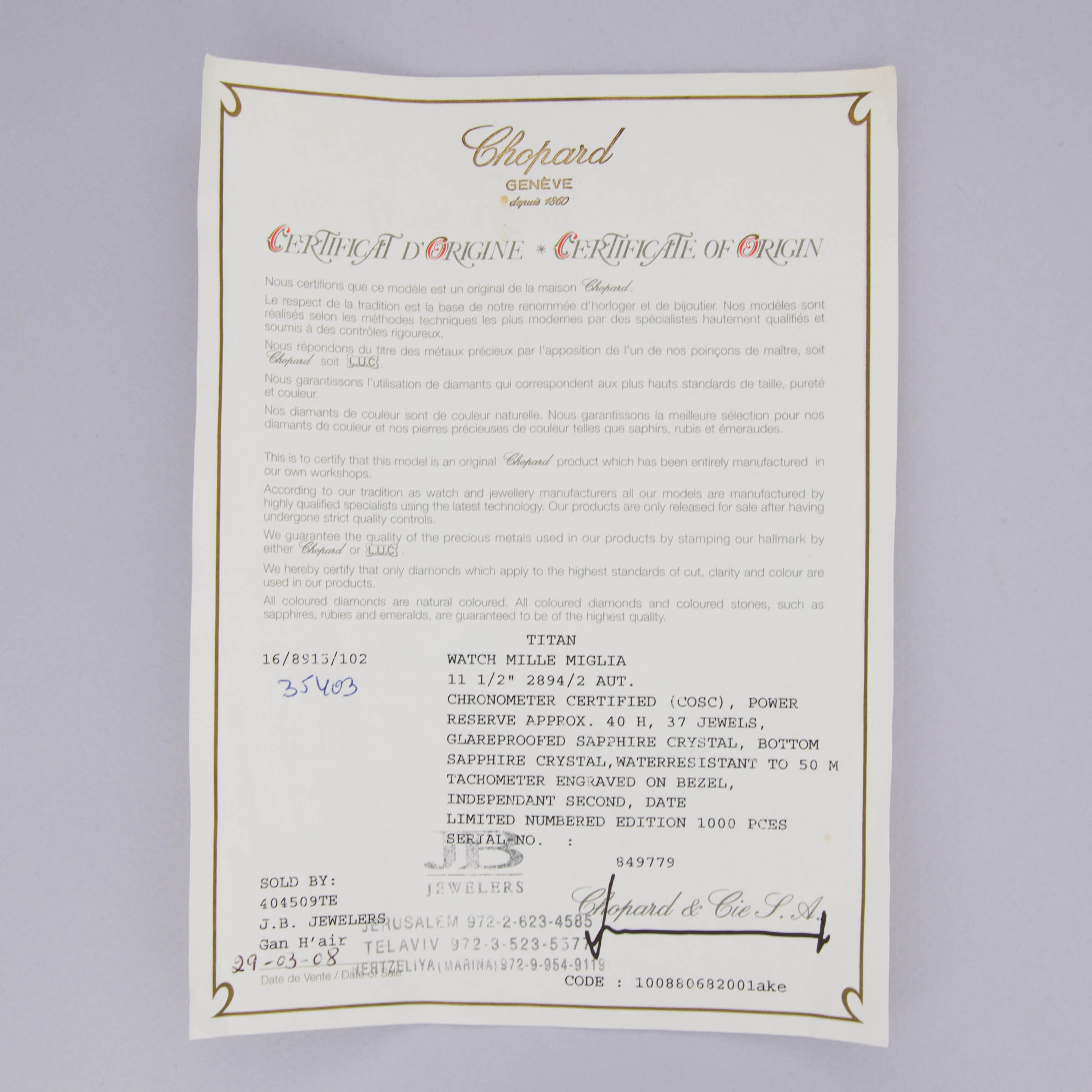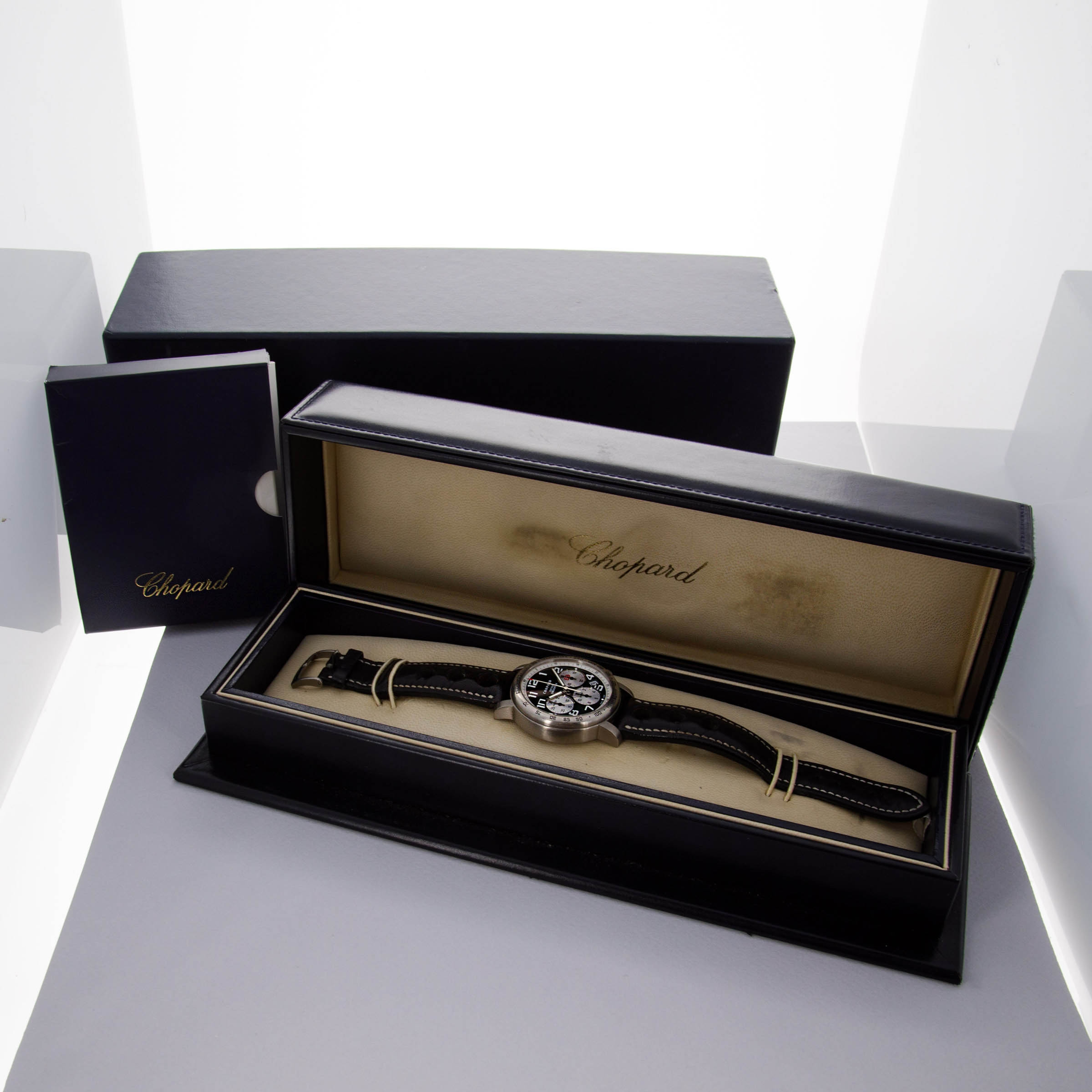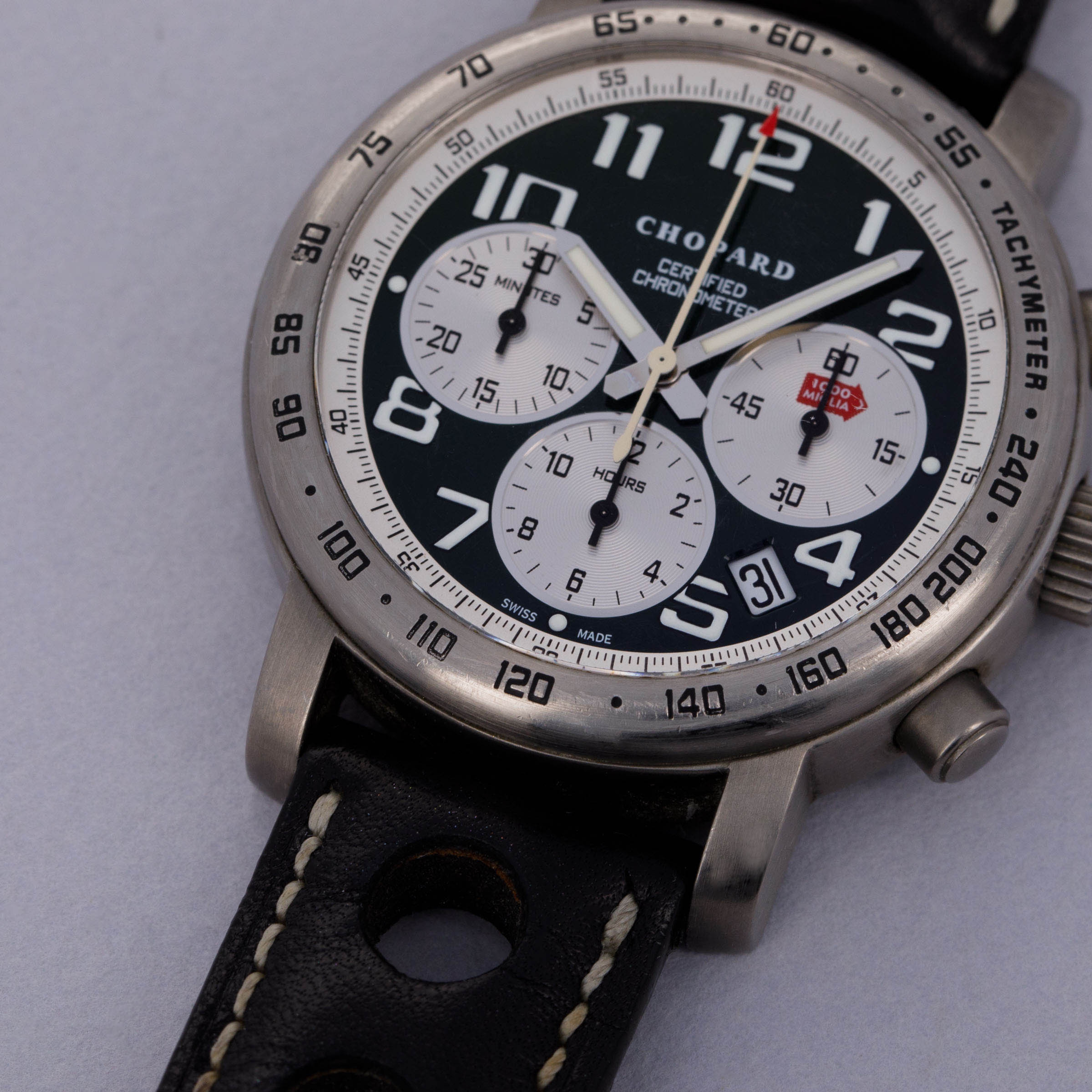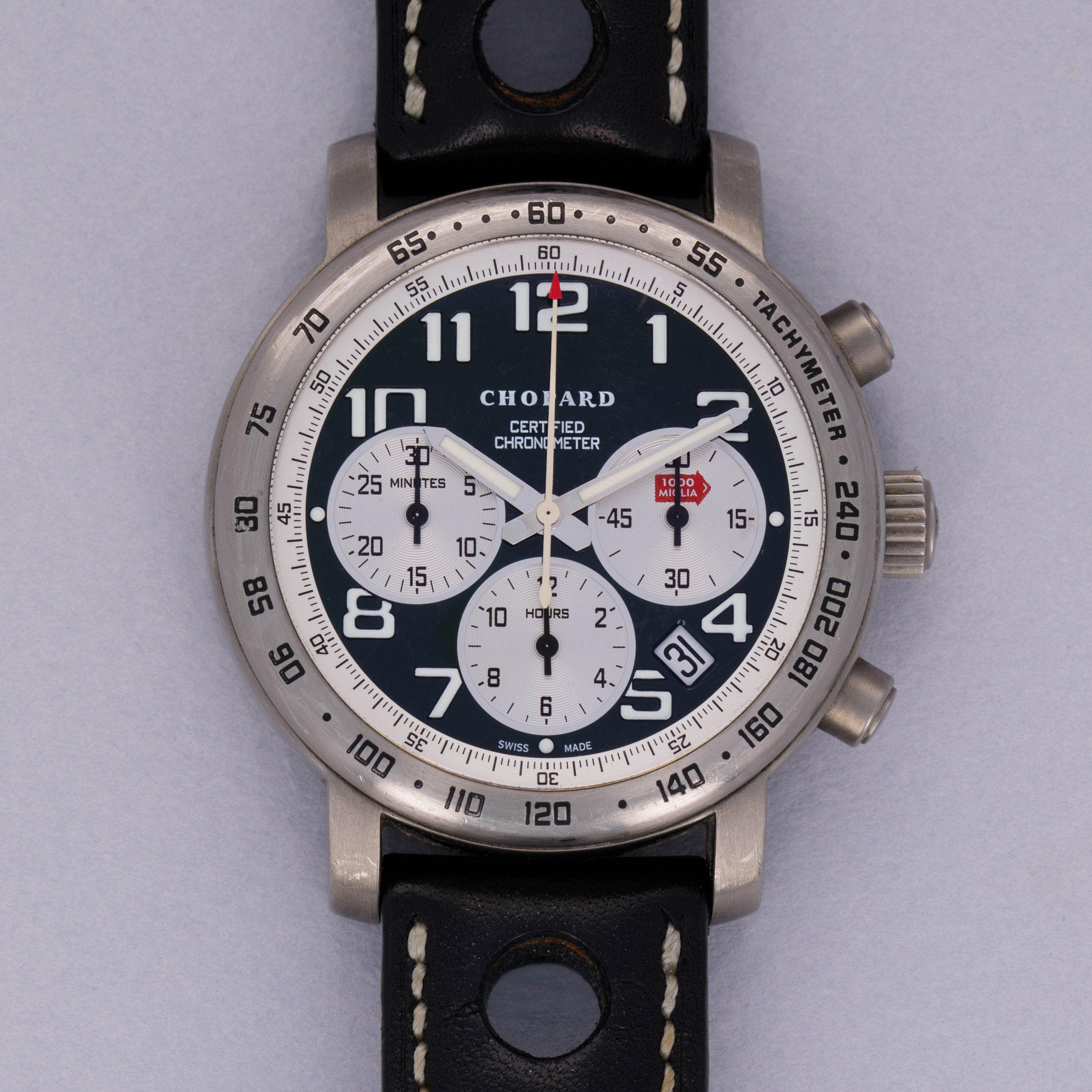 Released in 1988, the Chopard Mille Miglia was inspired by the eponymous legendary car race. Beginning as far back as the 1920s when professional car racing was in its infancy, the Mille Miglia itself is an Italian 1000-mile endurance car race from Brescia to Rome and back that began in 1927 and abruptly ended in 1957 due to a tragic accident in which nine spectators, a driver, and his navigator all lost their lives. Following a 25-year hiatus, the race came back in 1982 as a time trial rally whereby only the same cars that were eligible during the original series of races could take part in it. Six years later, in 1988, Chopard successfully became the Mille Miglia's official timekeeper and released their eponymous collection of chronograph timepieces. Offered here we have a ref. 8915 from the Mille Miglia collection – a limited edition reference of just 1000 pieces. Boasting a 40mm titanium case, the ref. 8915 blends the Mille Miglia’s automotive use-case with Chopard’s famed sense for elaborate design, resulting in a timepiece that blurs the lines between jewelery and watchmaking. Indeed, it features a tachymeter bezel, a contrasting white minute track within its dark green dial, a date aperture at 4:30 and a trio of subdials for its chronograph that all combine to allow this timepiece to function as one might need it to if they were to take part in the Mille Miglia itself and time themselves or make calculations.