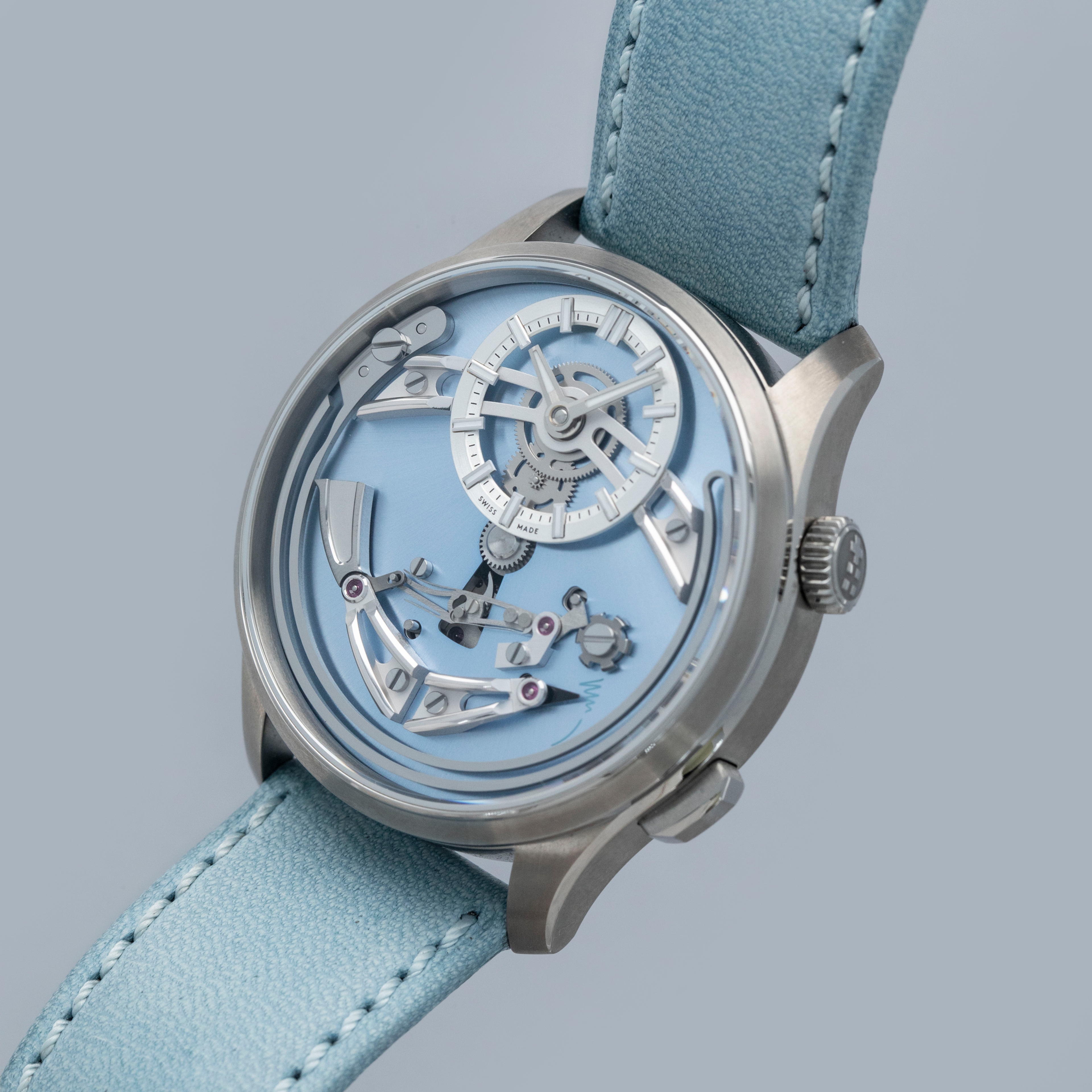 Boasting a "Cielo" blue baseplate inspired by Italian summer skies, the Bel Canto's mesmerizing display is made up of its hour-and-minute assembly in the northern half of its dial, and the chiming assembly in the south.