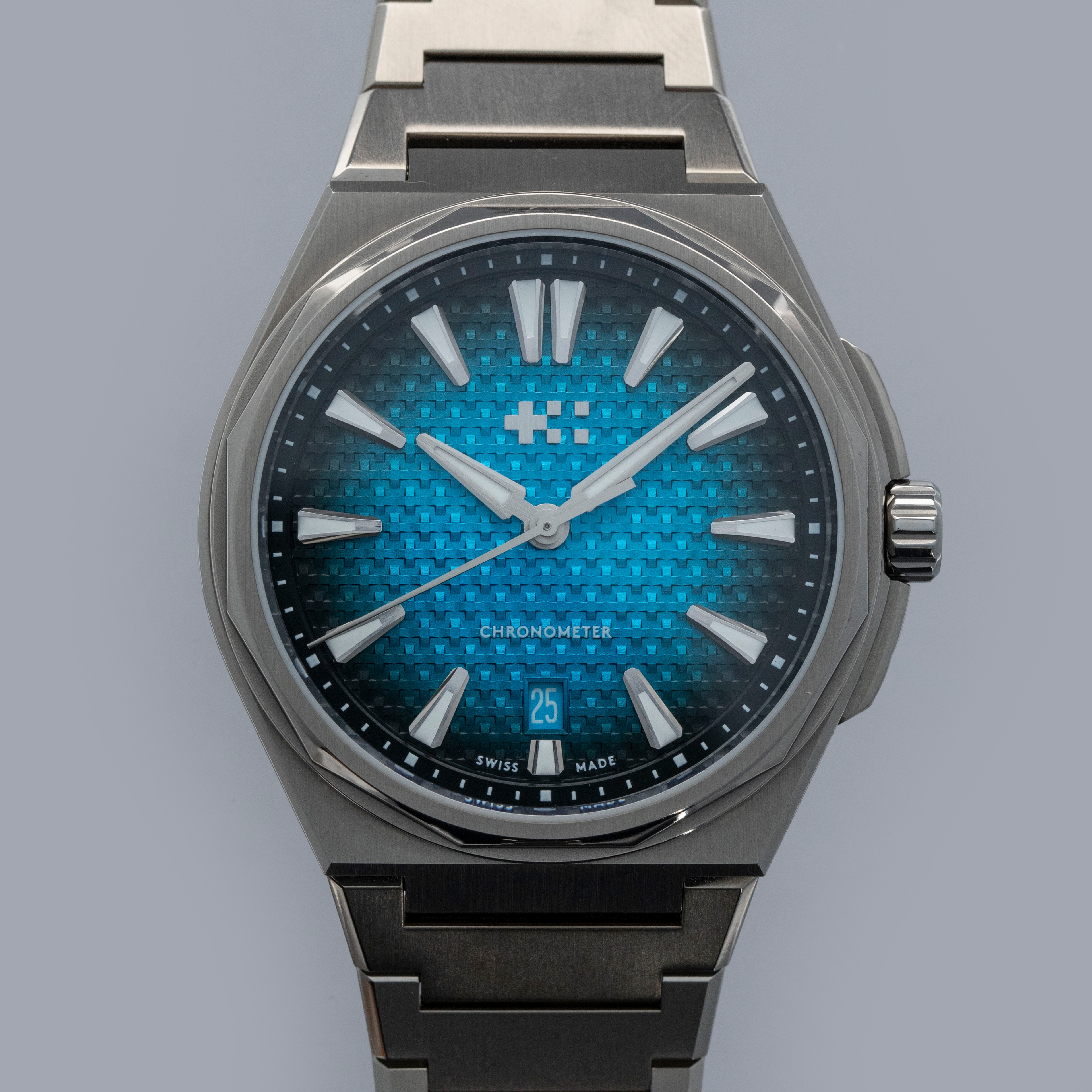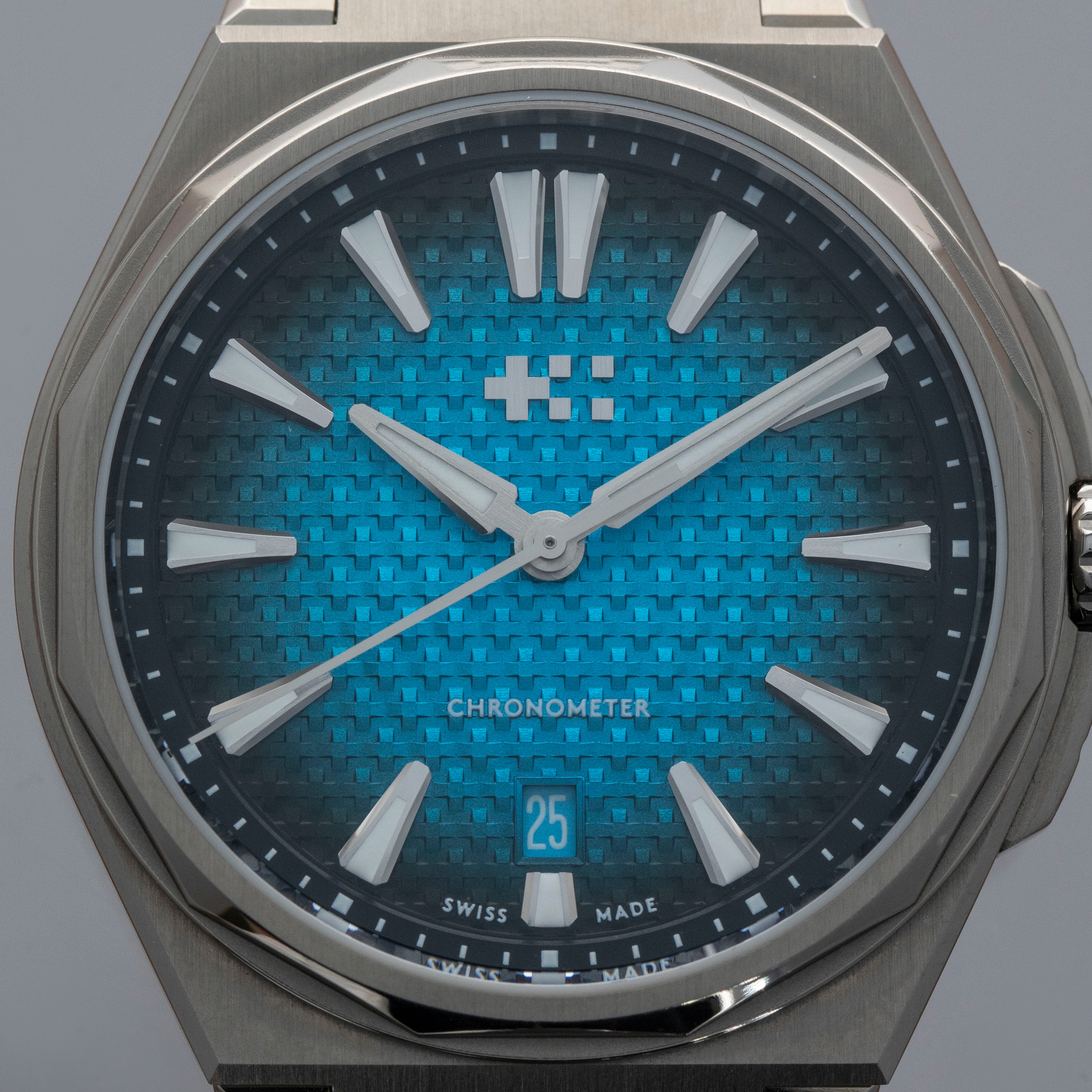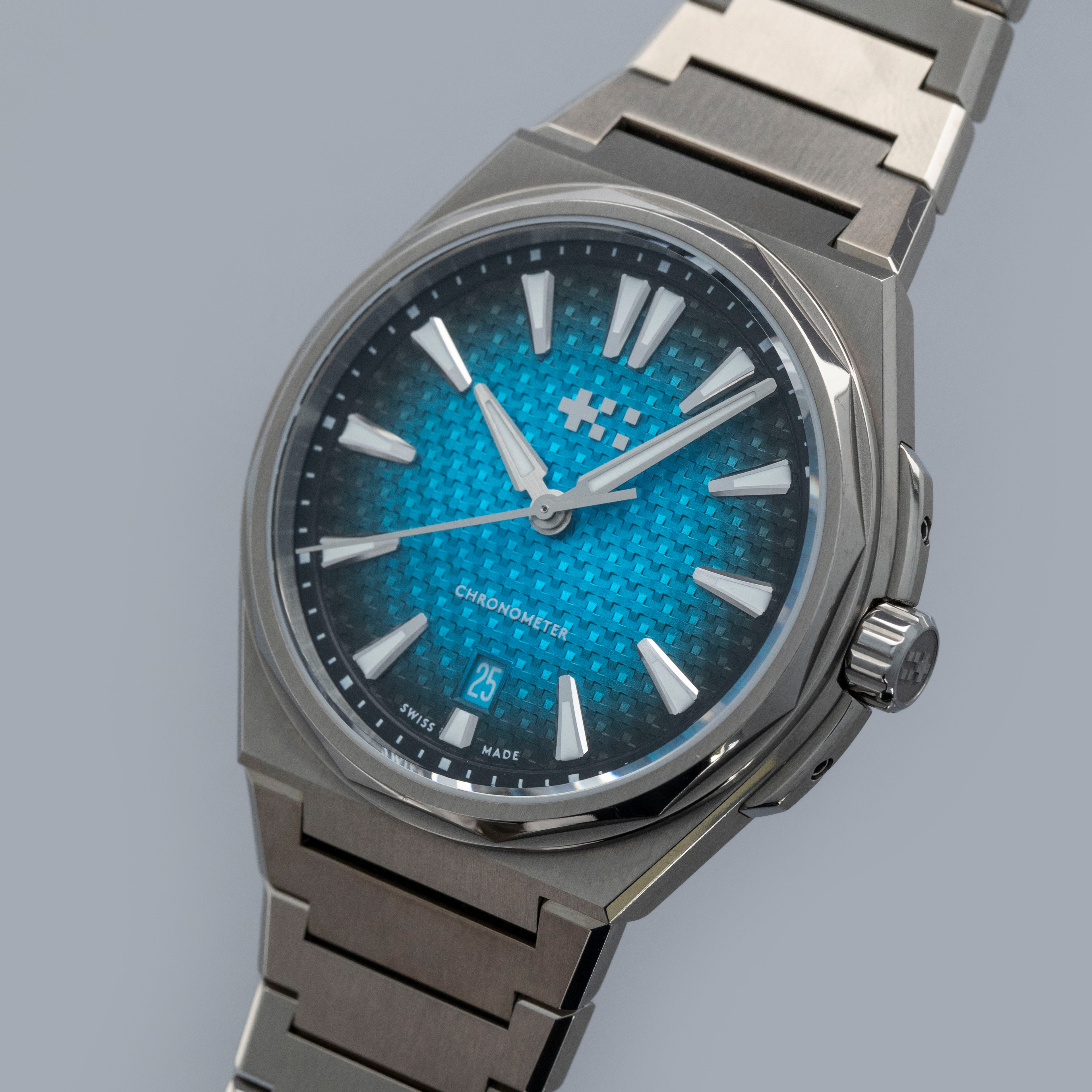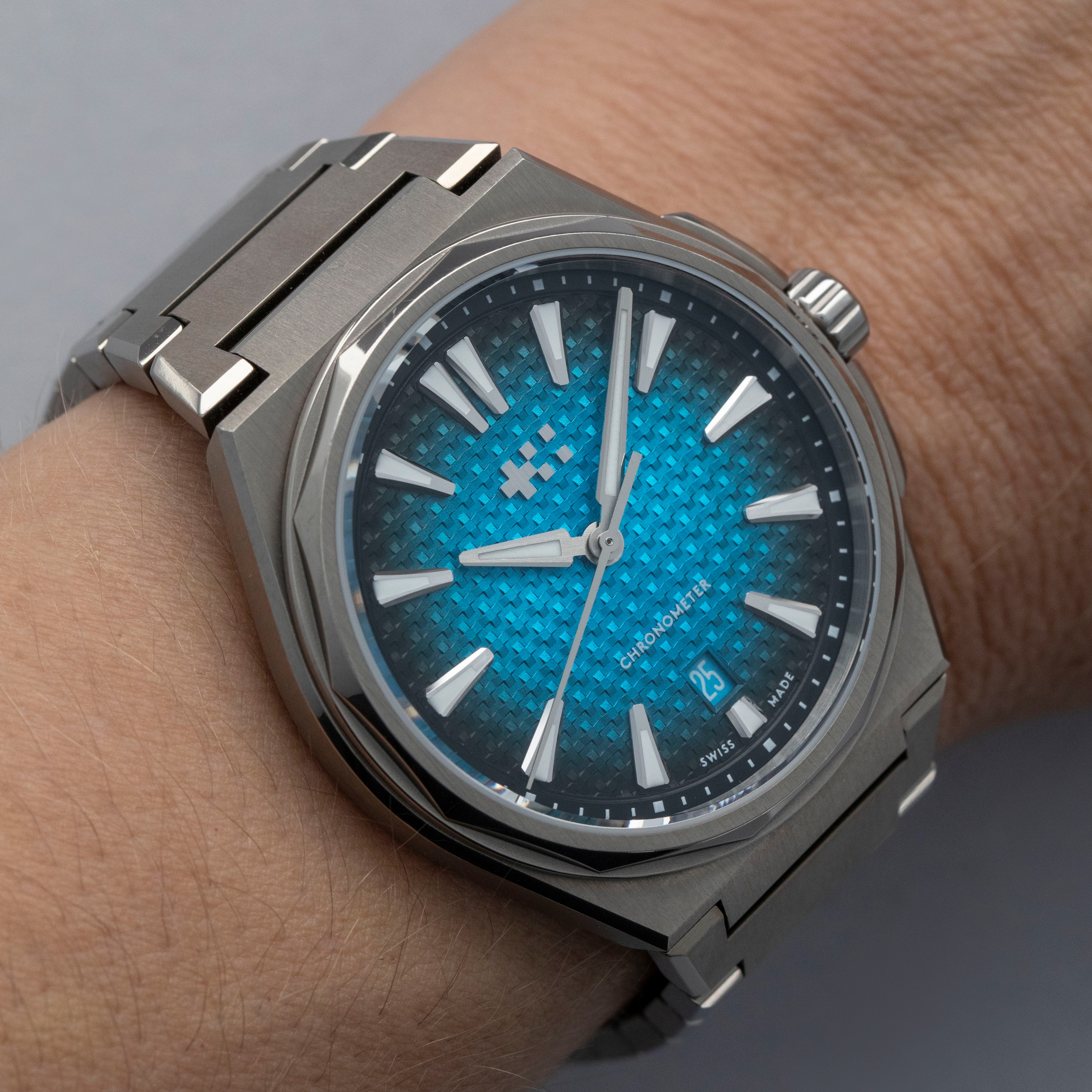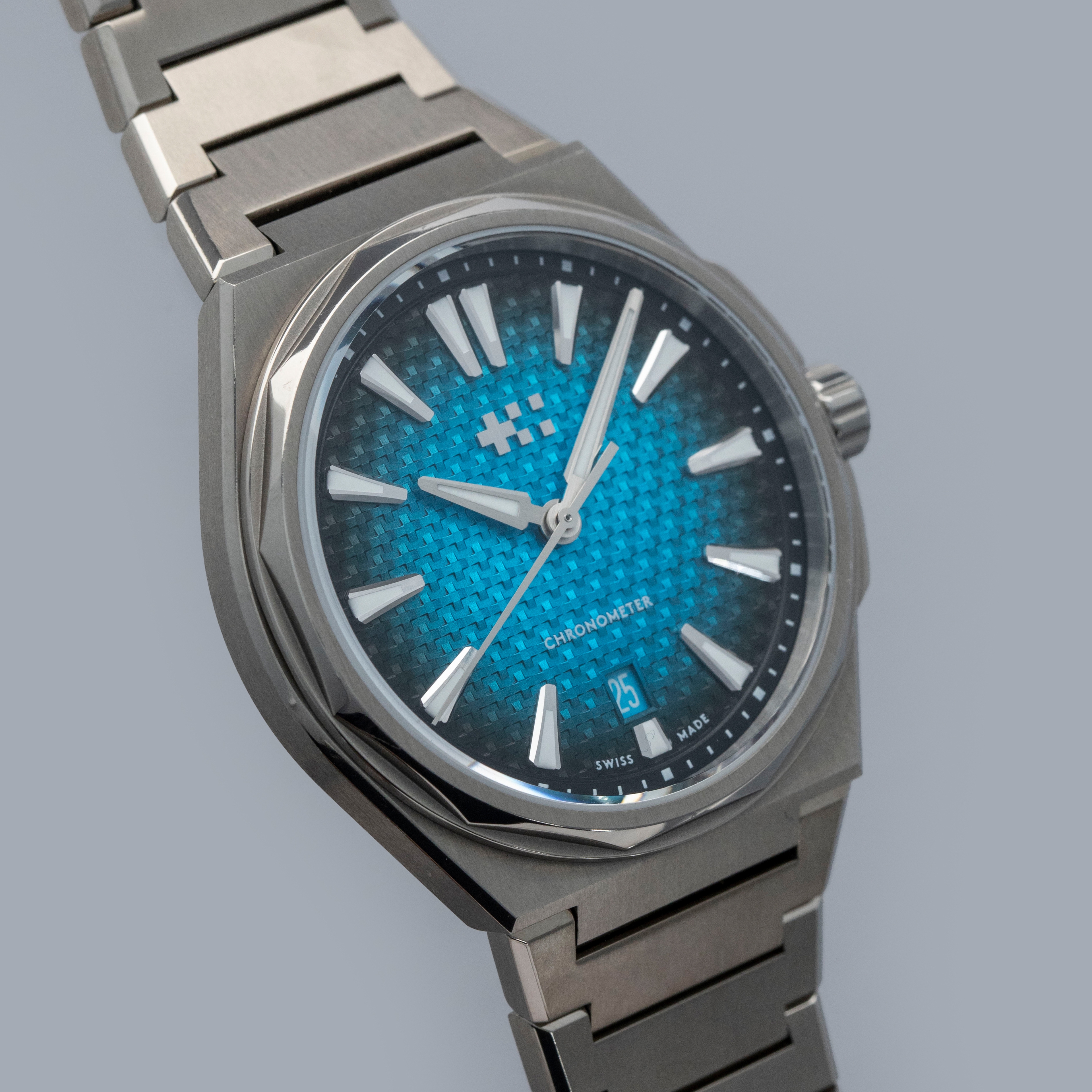 Fitted with a unique basket-weave texture pattern on its dial with a rich Astral blue color that fades to a near-black along its periphery and a "Chronometer" inscription at 6 o'clock, this timepiece's display makes it immediately obvious that these titanium COSC-certified variants of The Twelve are a step above their steel siblings.