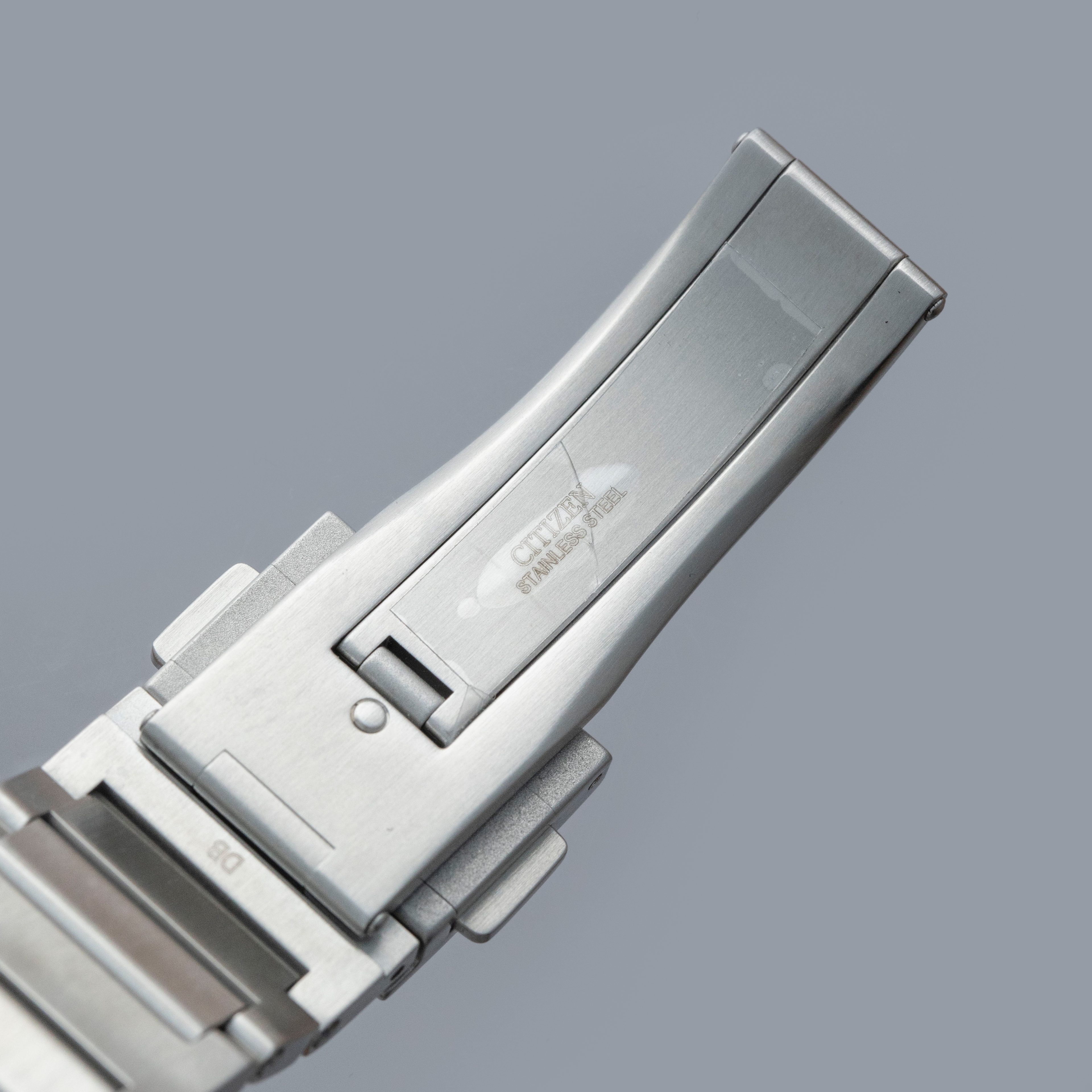 Made of stainless steel and boasting universally appealing dimensions of 40mm x 10.9mm, The Citizen's angular tonneau-shaped case has a wonderful presence on the wrist.