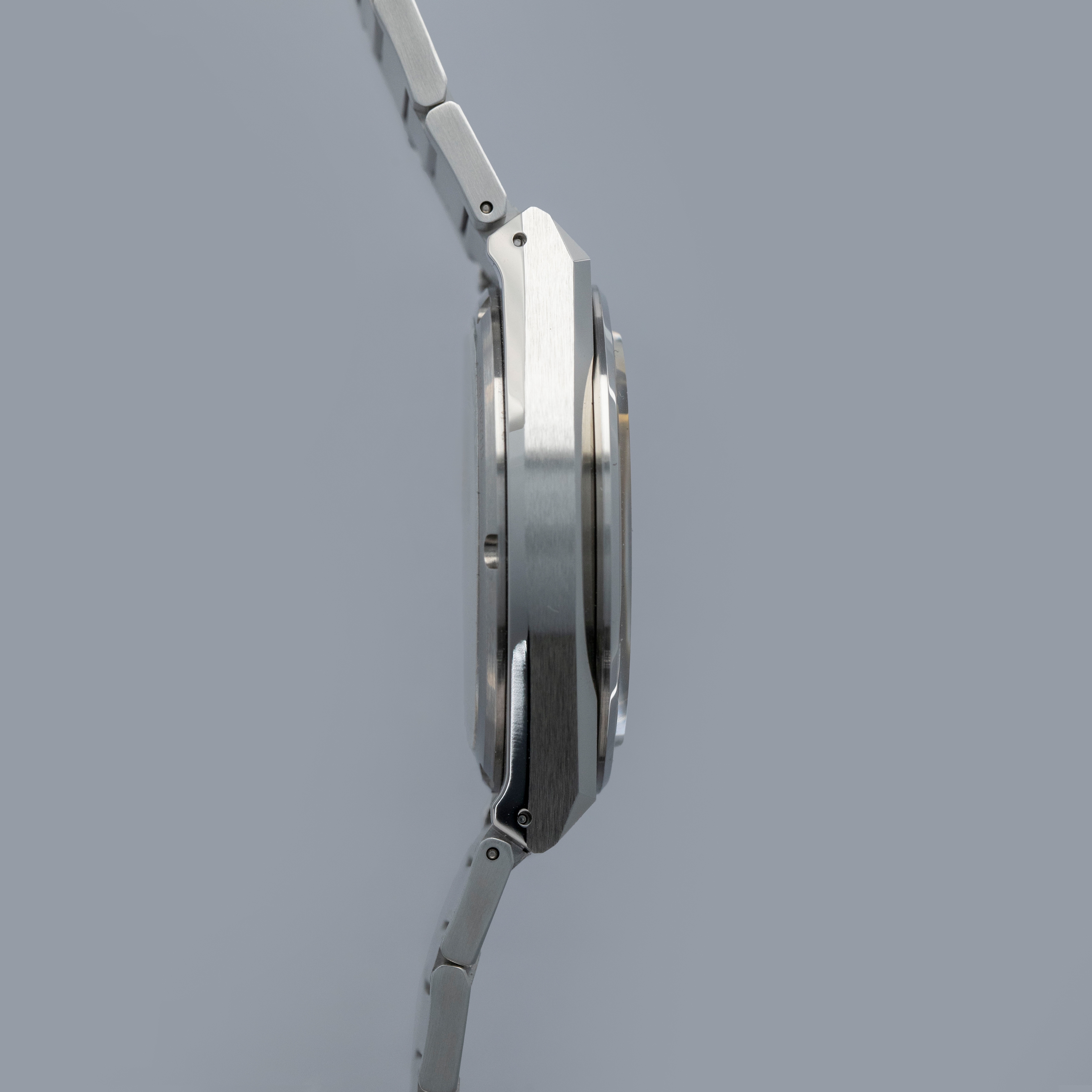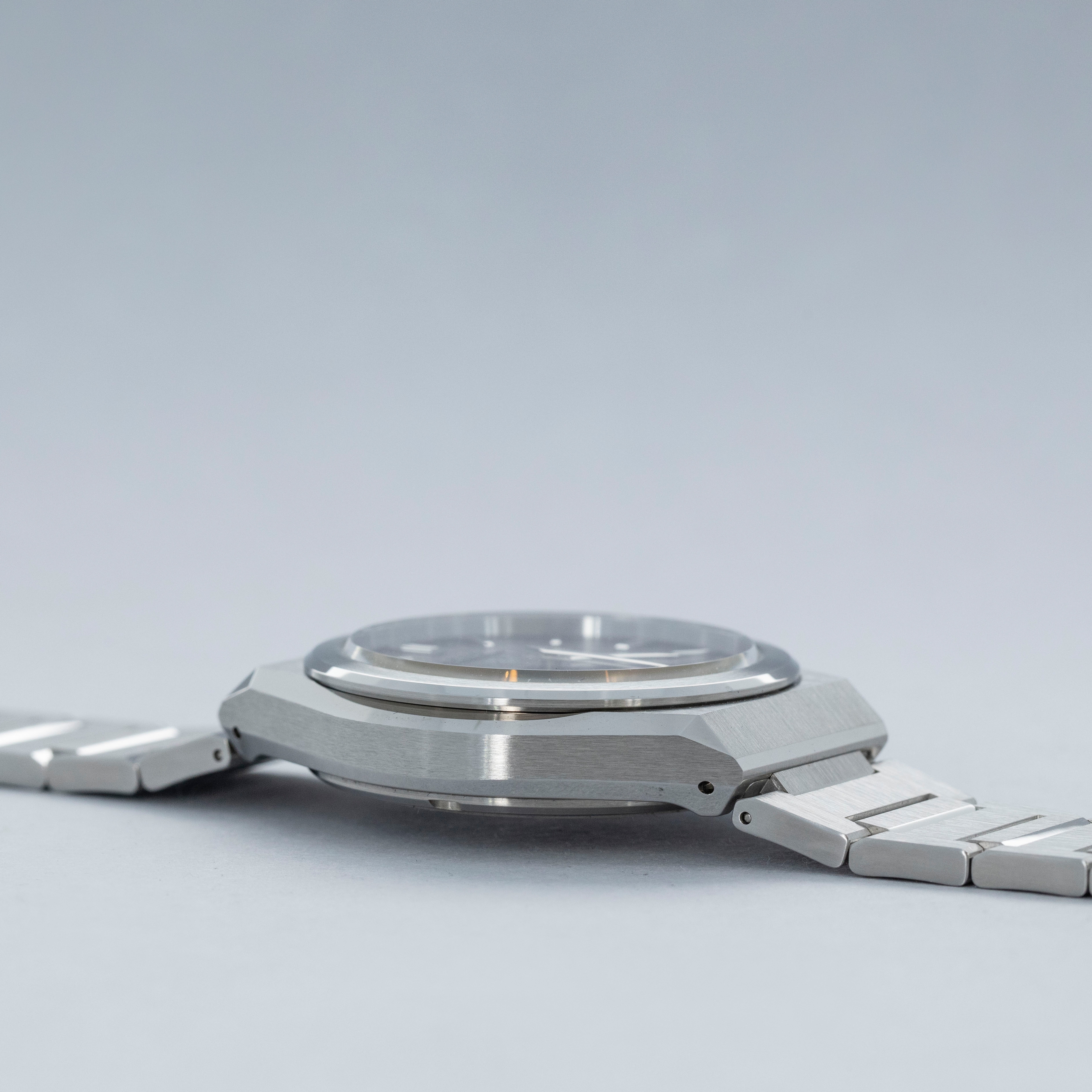 The watch is in like-new condition, showing only light signs of handling. It is fitted with a stainless steel bracelet comprising 11 full links and 3 half links, with 3 full links and 2 half links removable. Three additional full links are included, and it fits approximately a 7” wrist. Comes complete with full set: inner and outer boxes, papers, and accessories.