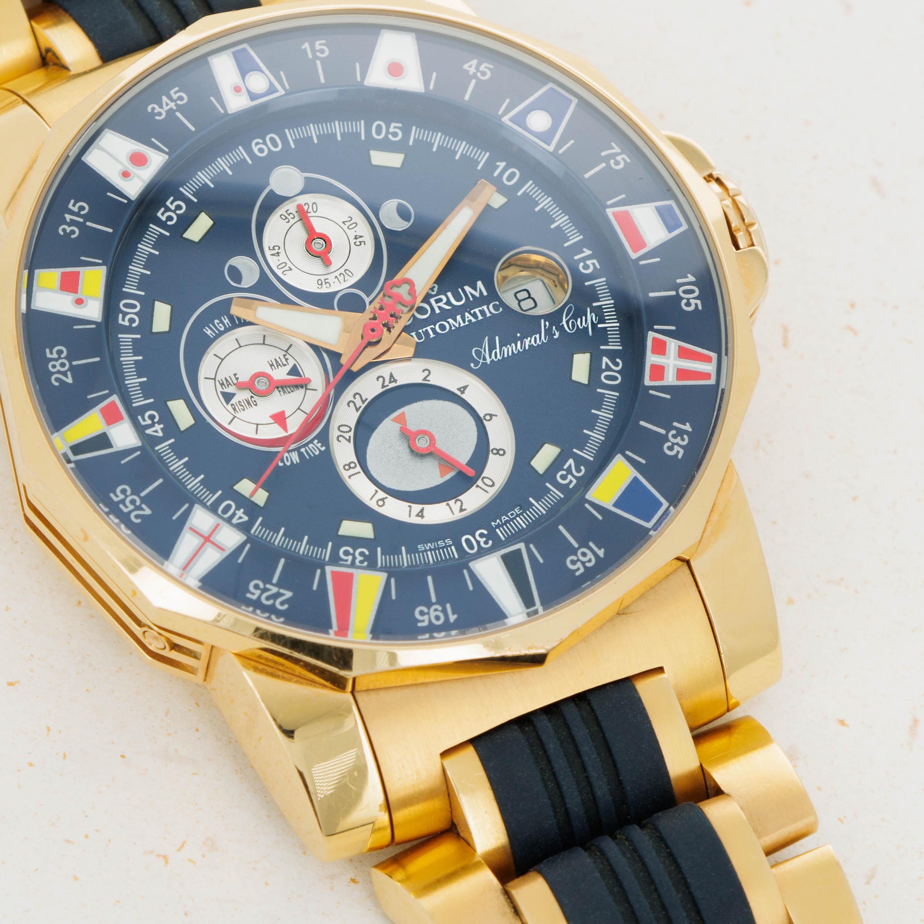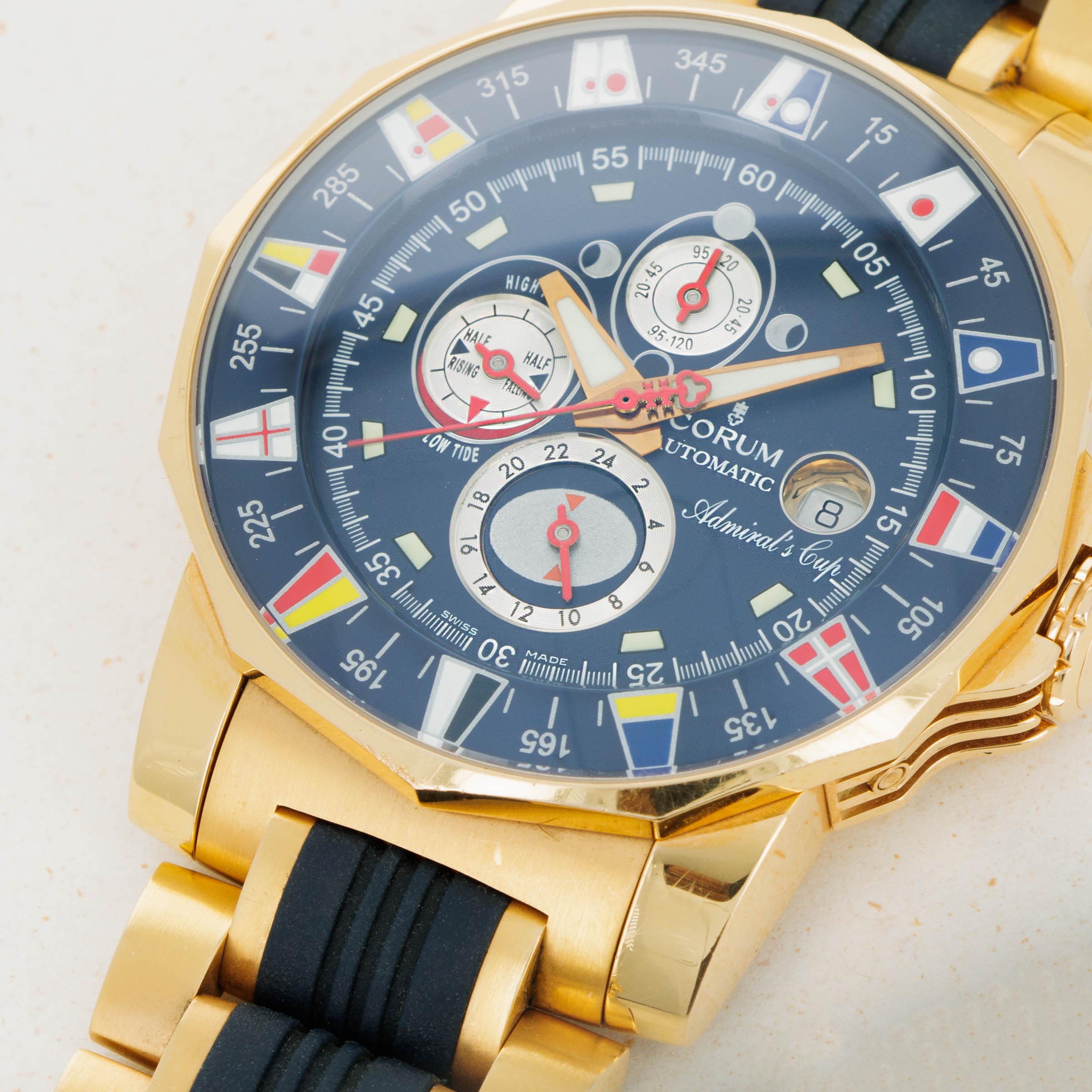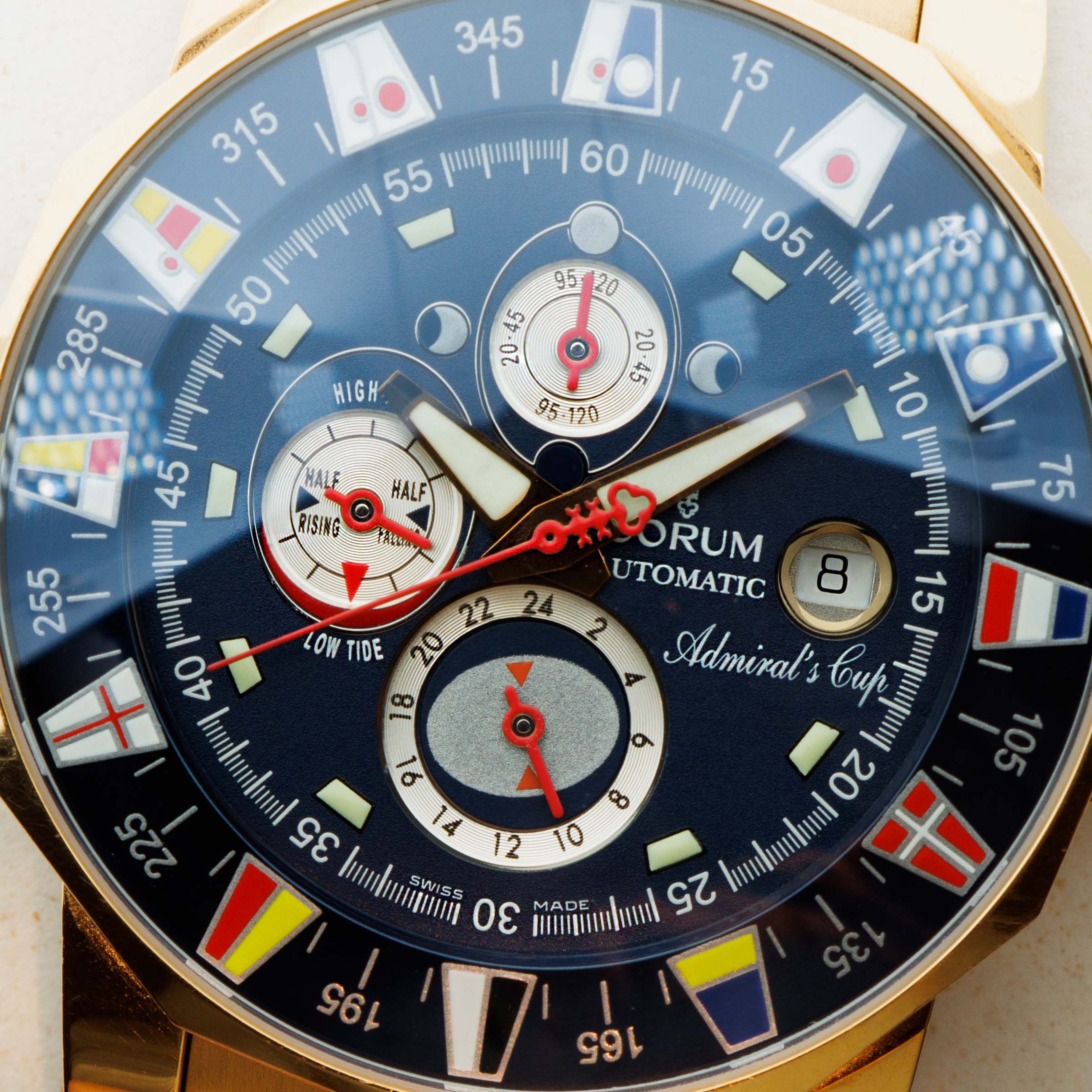 Founded in 1955, Corum are a watchmaker famed for their unique outlook on horological design, with collections such as the Coin and Bubble both standing as aesthetically unique and interesting. In keeping with this overtly unique sense of style and aesthetic that Corum use to create their timepieces is the Admirals Cup collection, which was born in the 1960s to celebrate the eponymous Admirals Cup international yachting regatta. Featuring a 12-sided case and nautical pennants on the dial, the Corum Admirals Cup is easily one of the most distinctive timepieces on the market. Offered here we have the Corum Admirals Cup 44 Tides Regatta that was launched in 2003 to celebrate Corum’s return as the official timekeeper and Co-sponsor of the Admiral’s Cup yachting regatta in that same year. Launched as a limited edition of 250 pieces, the Admirals Cup 44 Tides Regatta features a litany of yachting complications such as a moon phases with strength of tides subdial, height of tide with strength of current dial, and a time of tides with a 24-hour indicator in addition to a date and marine pendants to indicate the time.