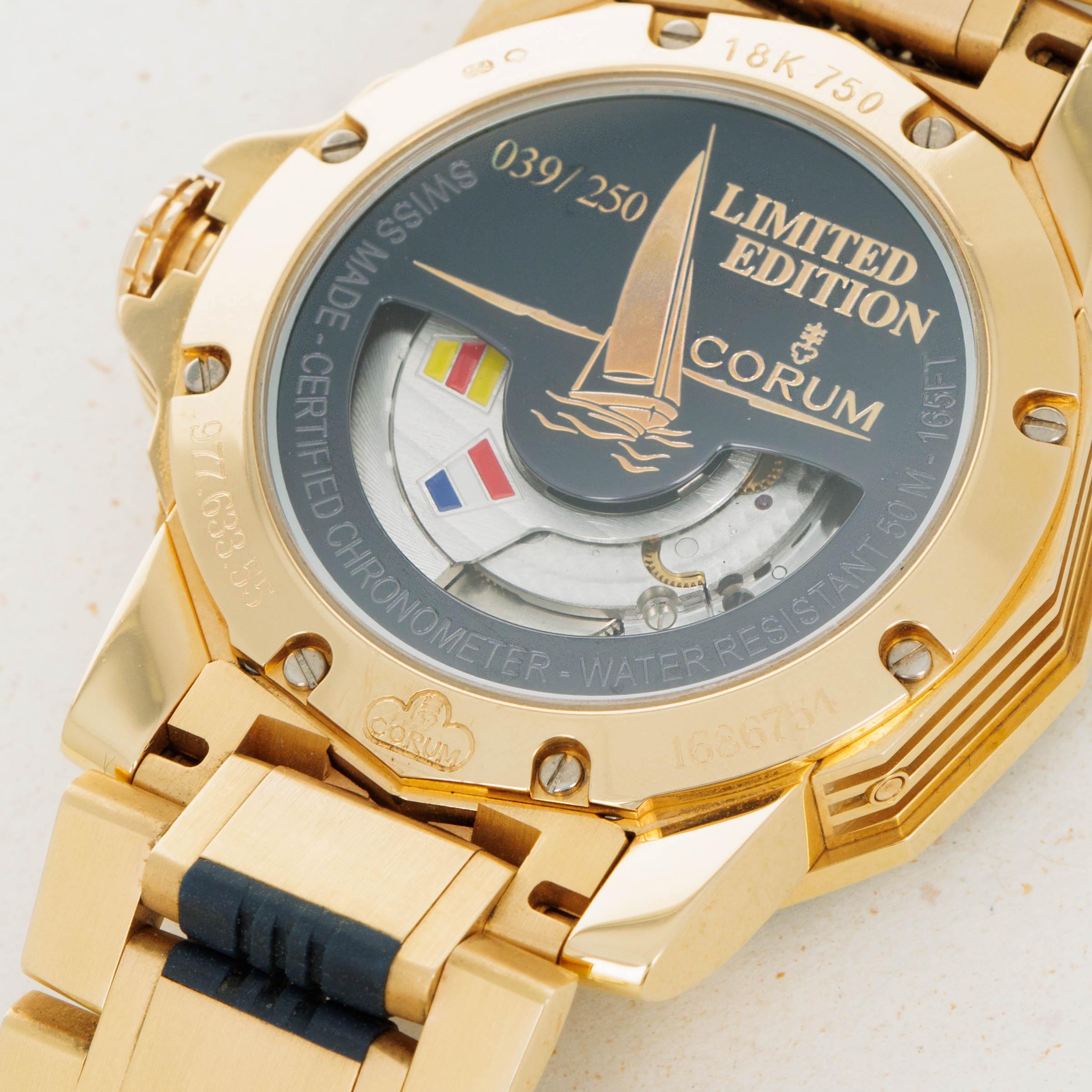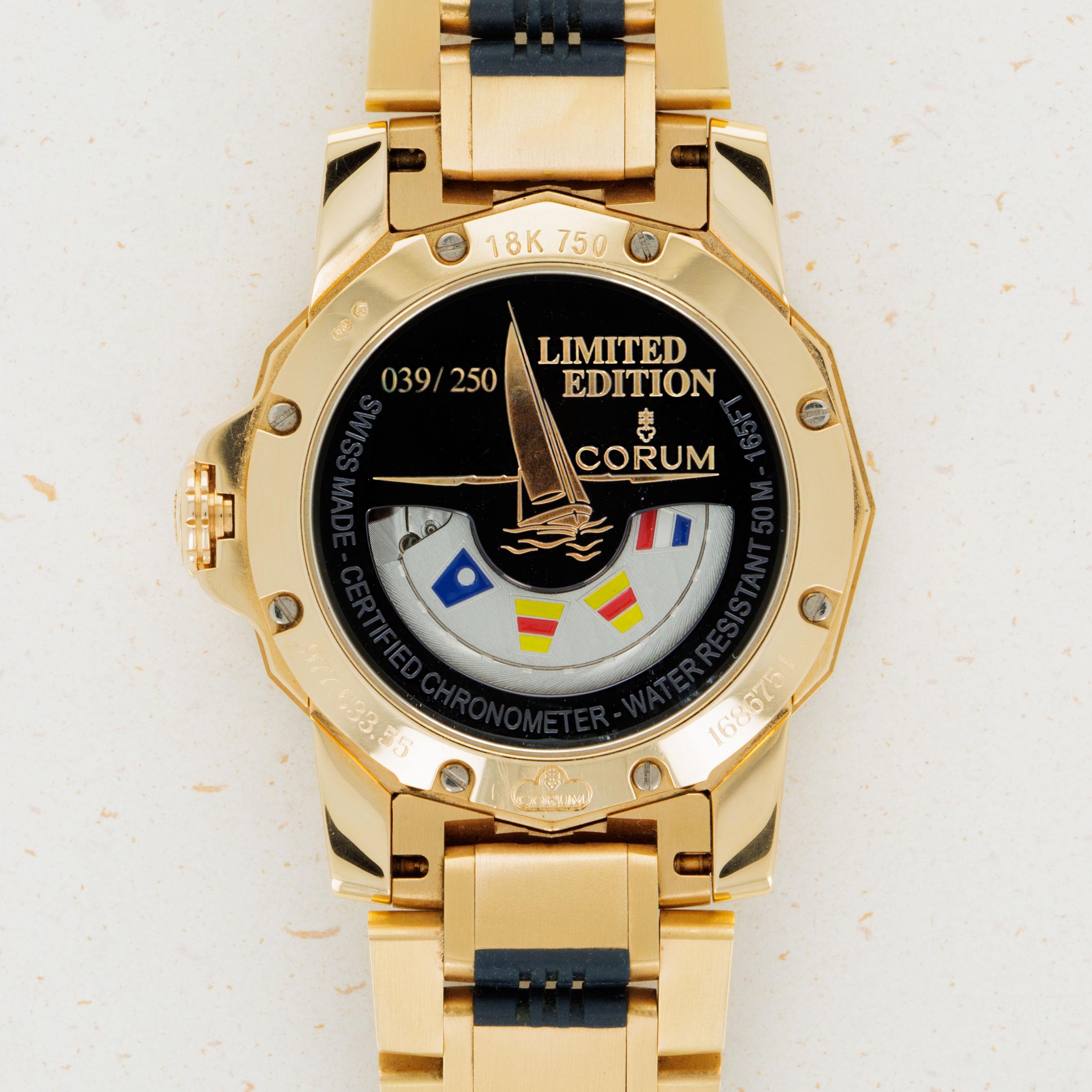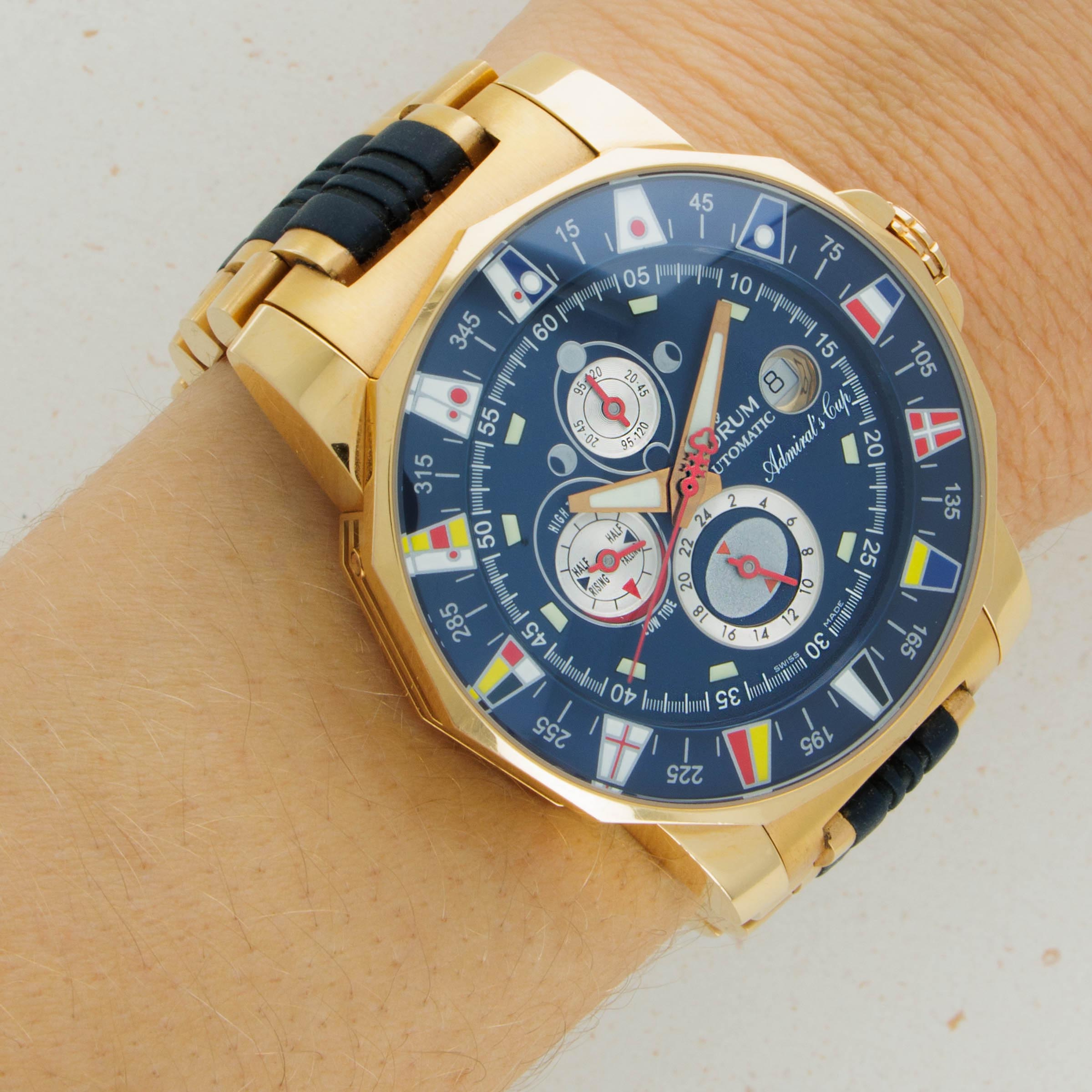 Founded in 1955, Corum are a watchmaker famed for their unique outlook on horological design, with collections such as the Coin and Bubble both standing as aesthetically unique and interesting. In keeping with this overtly unique sense of style and aesthetic that Corum use to create their timepieces is the Admirals Cup collection, which was born in the 1960s to celebrate the eponymous Admirals Cup international yachting regatta. Featuring a 12-sided case and nautical pennants on the dial, the Corum Admirals Cup is easily one of the most distinctive timepieces on the market. Offered here we have the Corum Admirals Cup 44 Tides Regatta that was launched in 2003 to celebrate Corum’s return as the official timekeeper and Co-sponsor of the Admiral’s Cup yachting regatta in that same year. Launched as a limited edition of 250 pieces, the Admirals Cup 44 Tides Regatta features a litany of yachting complications such as a moon phases with strength of tides subdial, height of tide with strength of current dial, and a time of tides with a 24-hour indicator in addition to a date and marine pendants to indicate the time.