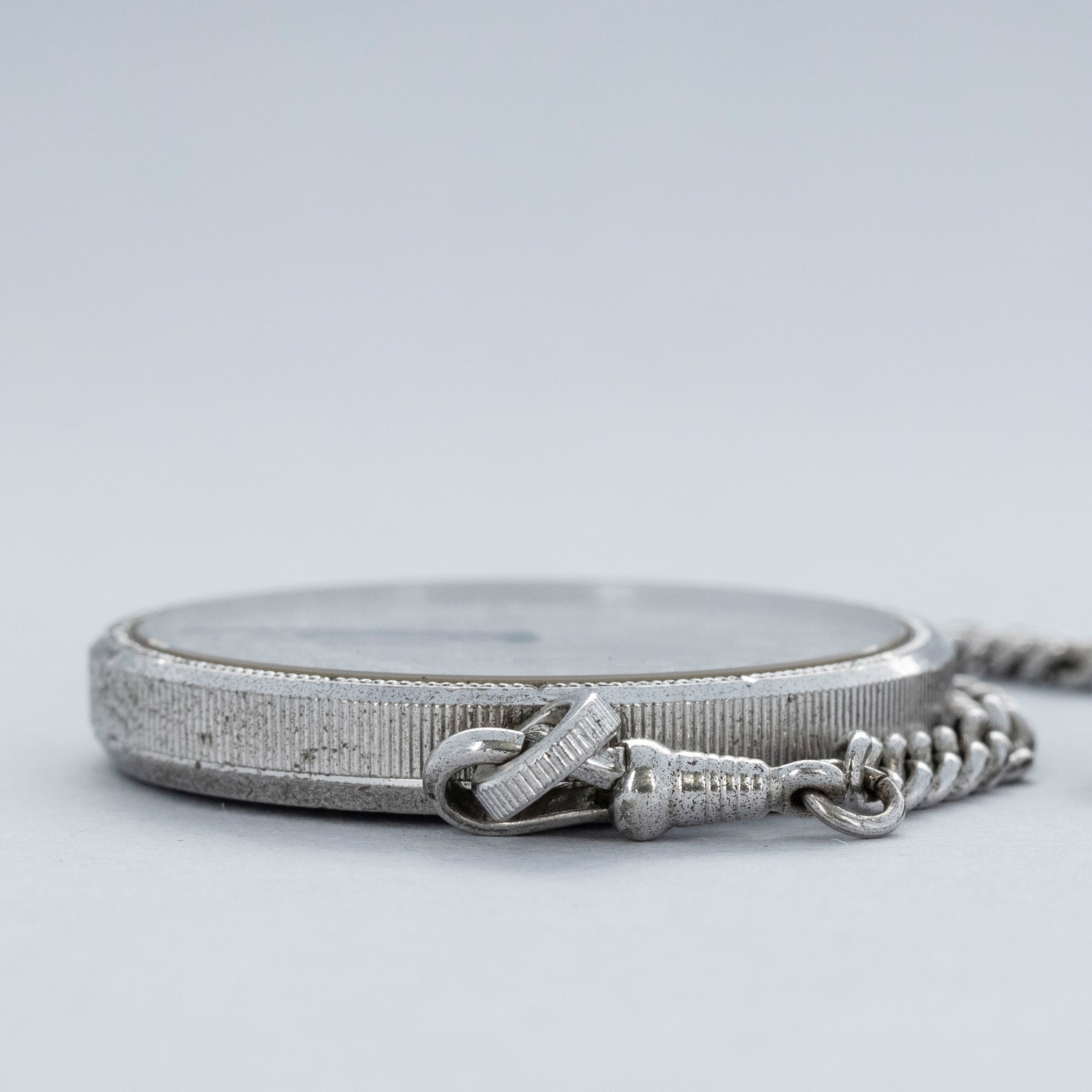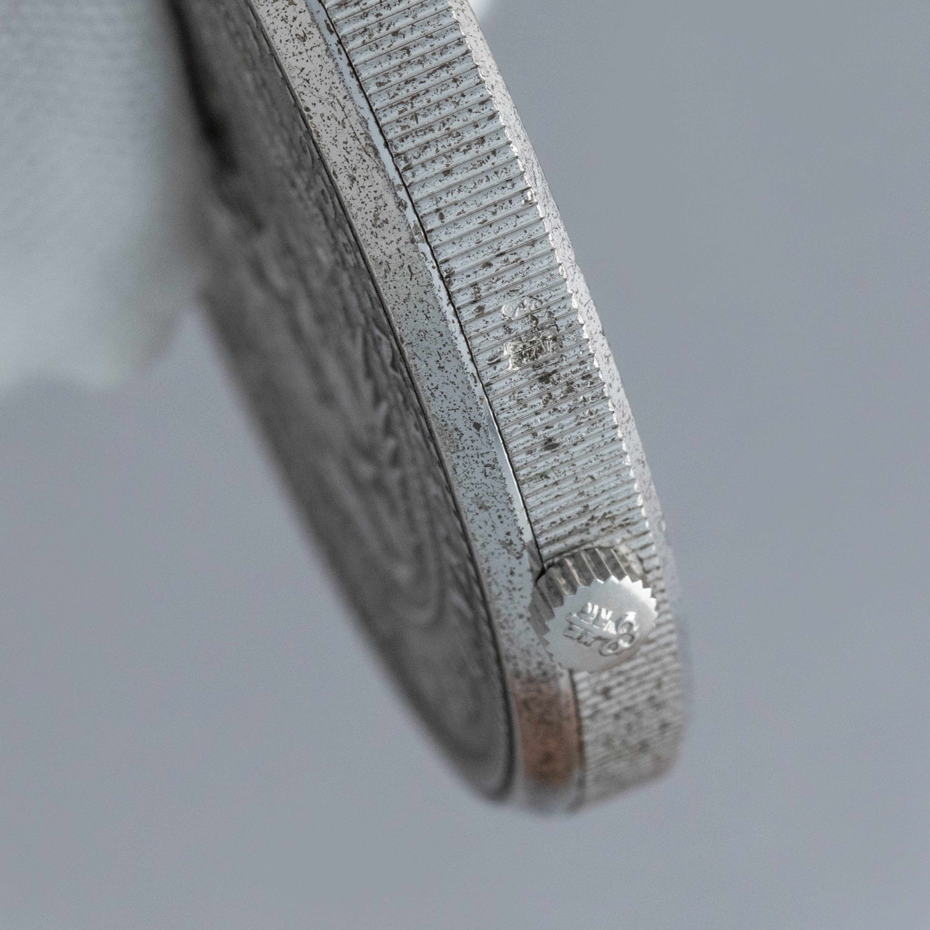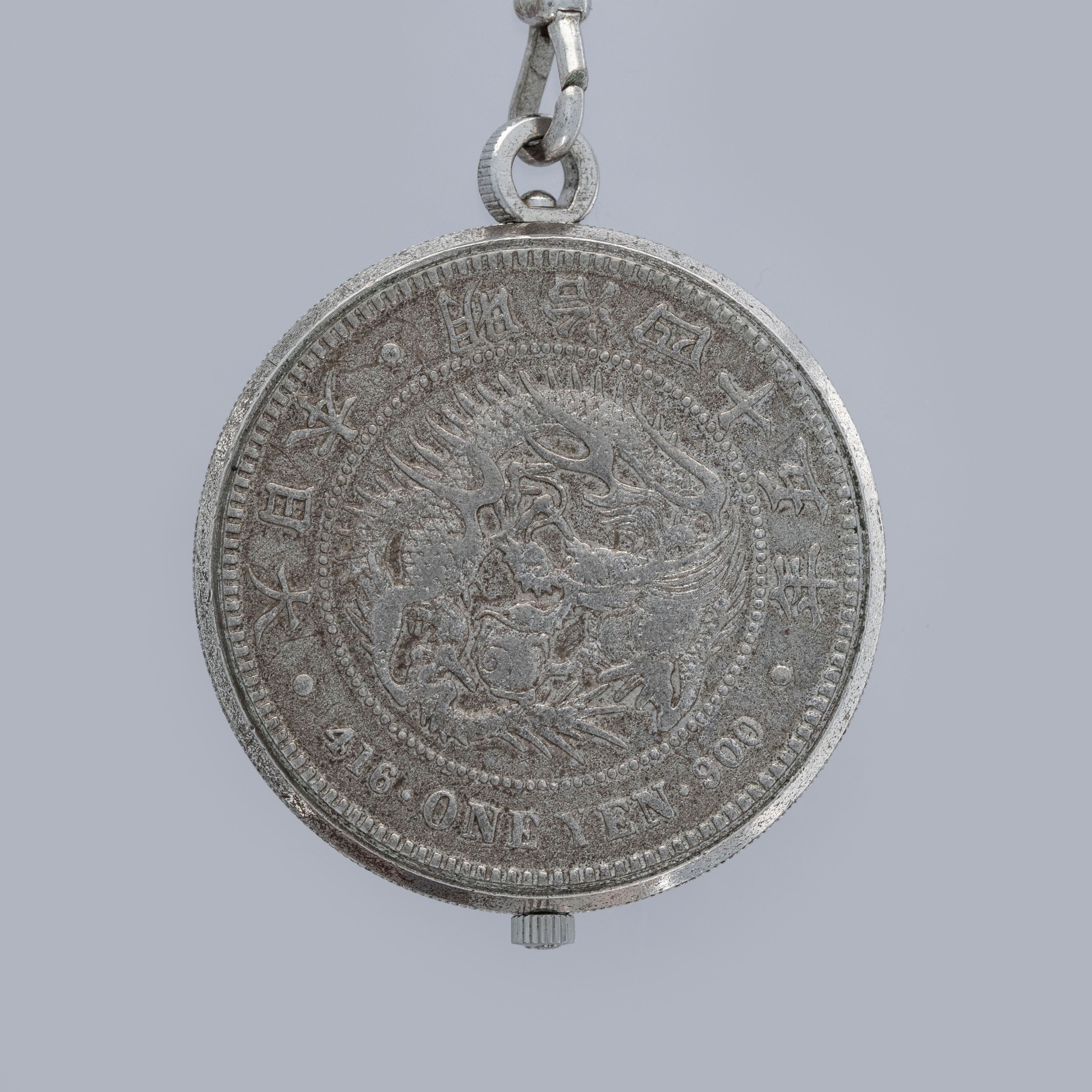 Completely untouched, the pocket watch's caseback reveals the coin's age through its wear and patina.