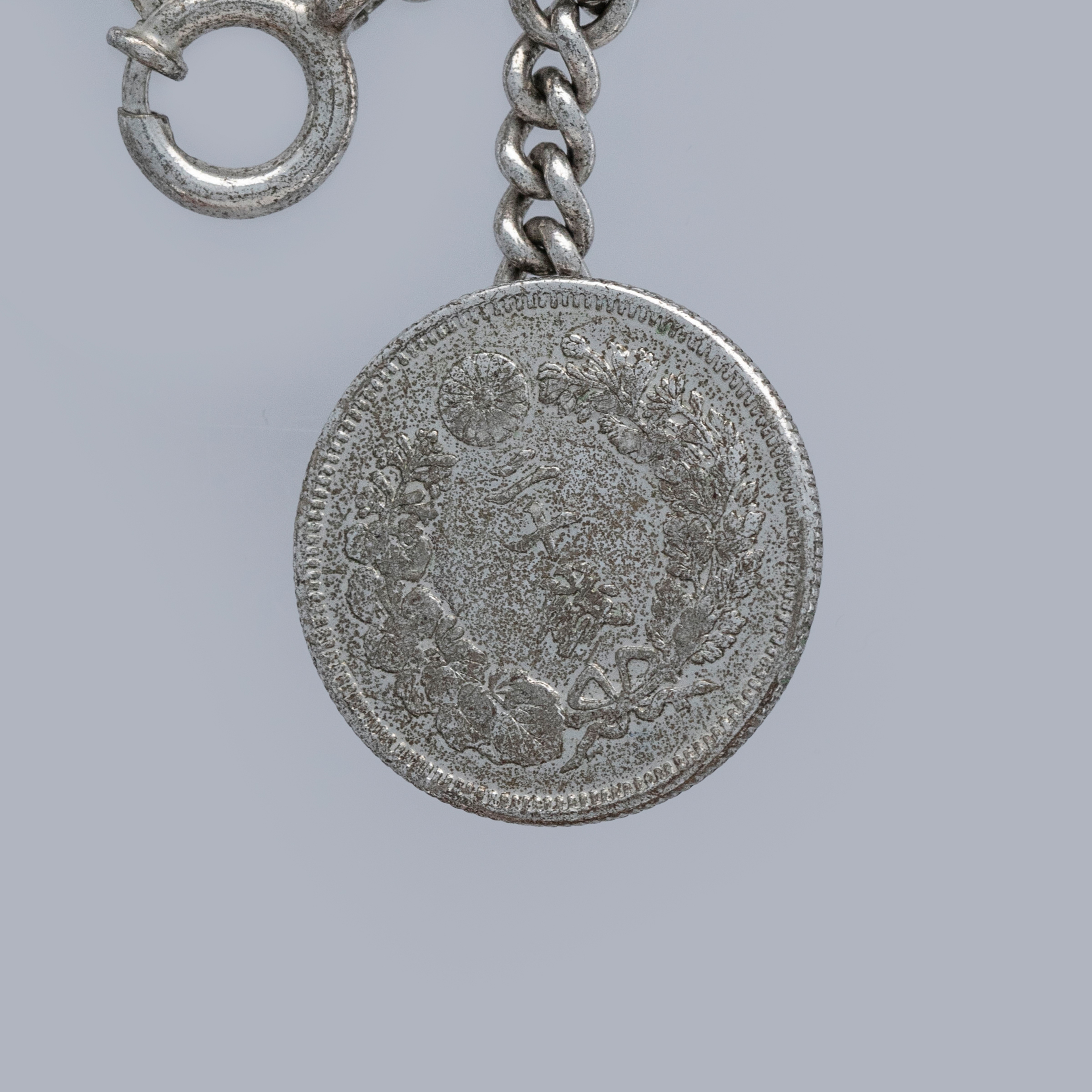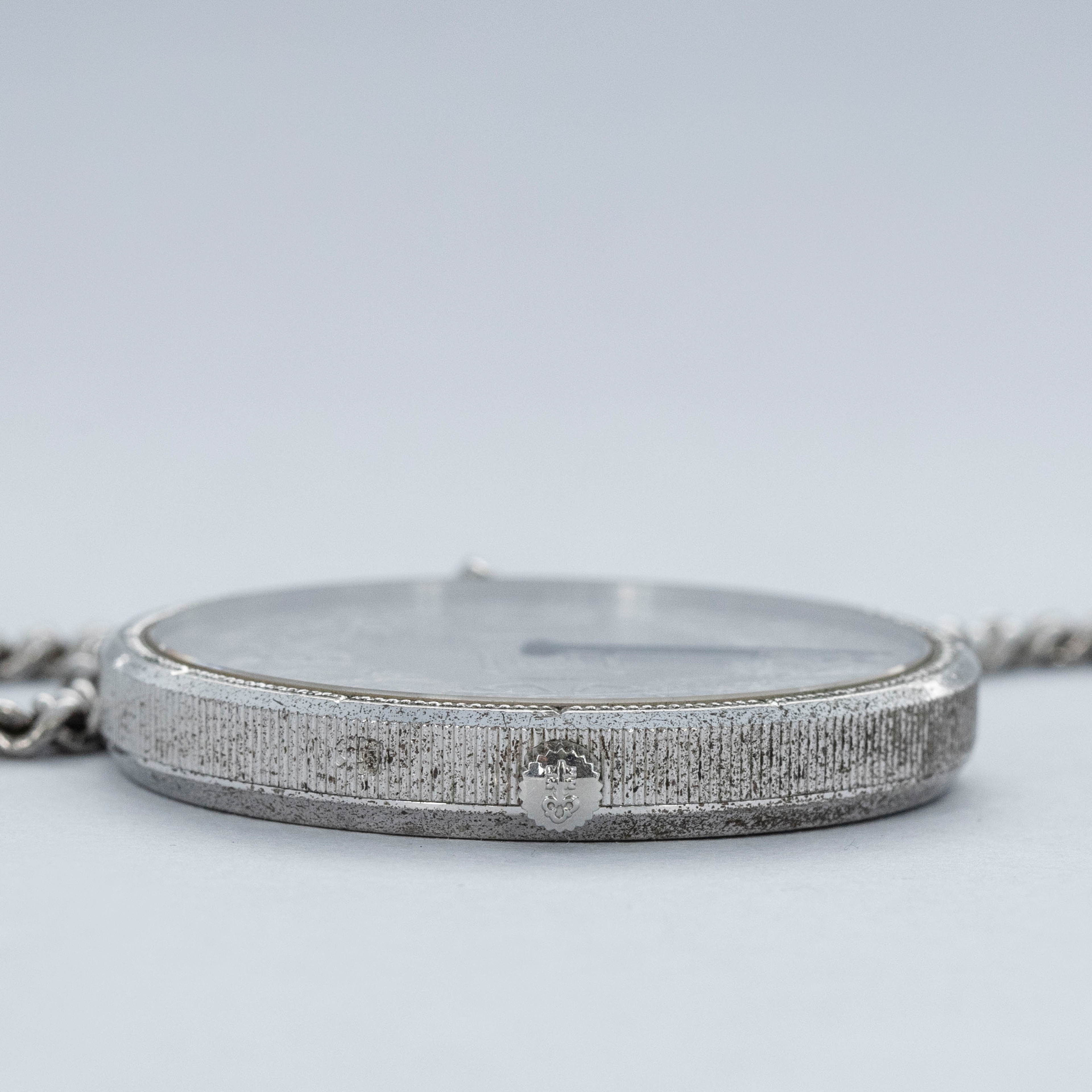 The watch is in overall very good condition. The silver case shows numerous scratches, nicks, and areas of tarnishing across the surface. The dial, formed from a coin face, has some light marks and nicks, while the hands are very clean. The watch is fitted with a silver chain and coin terminal, both in very good condition.