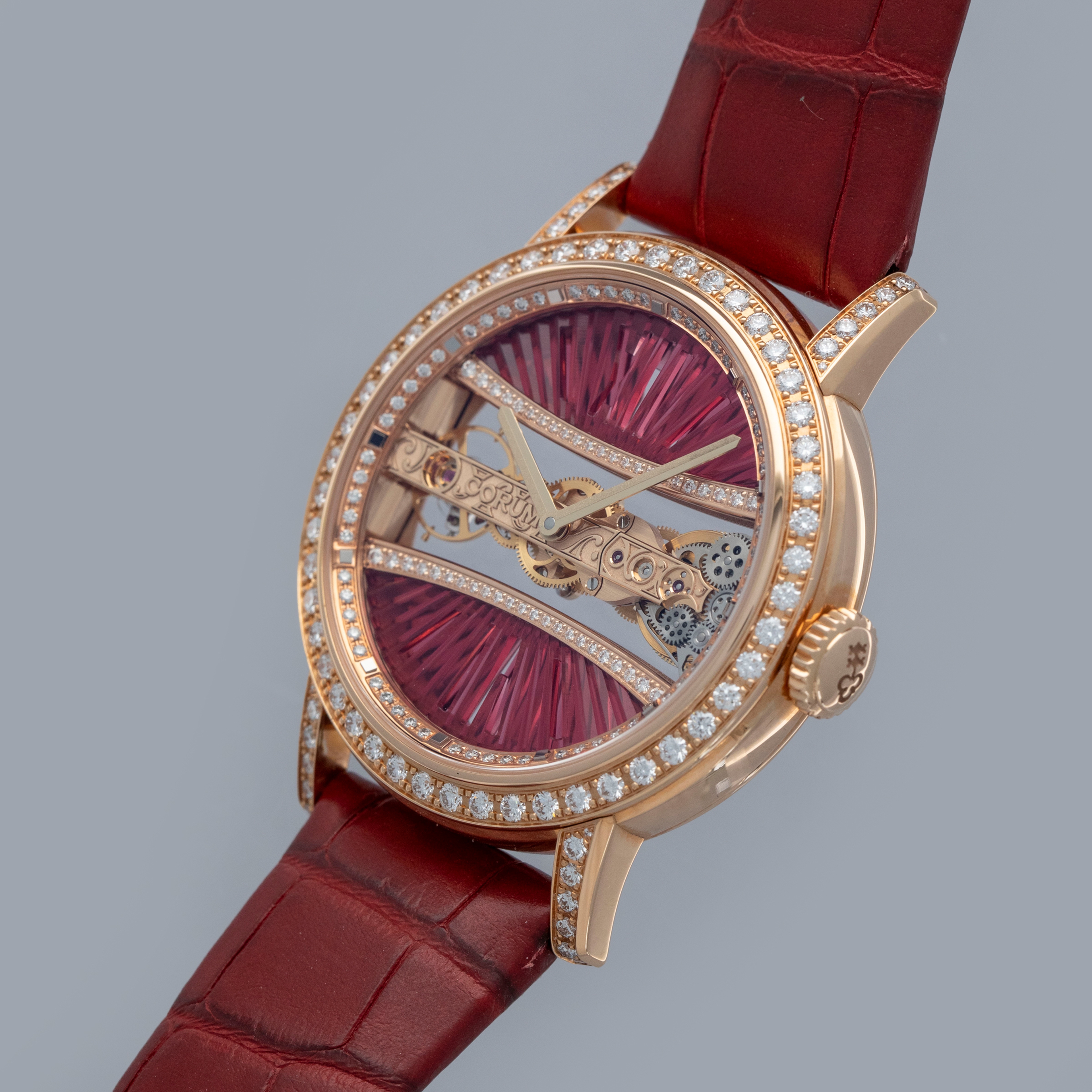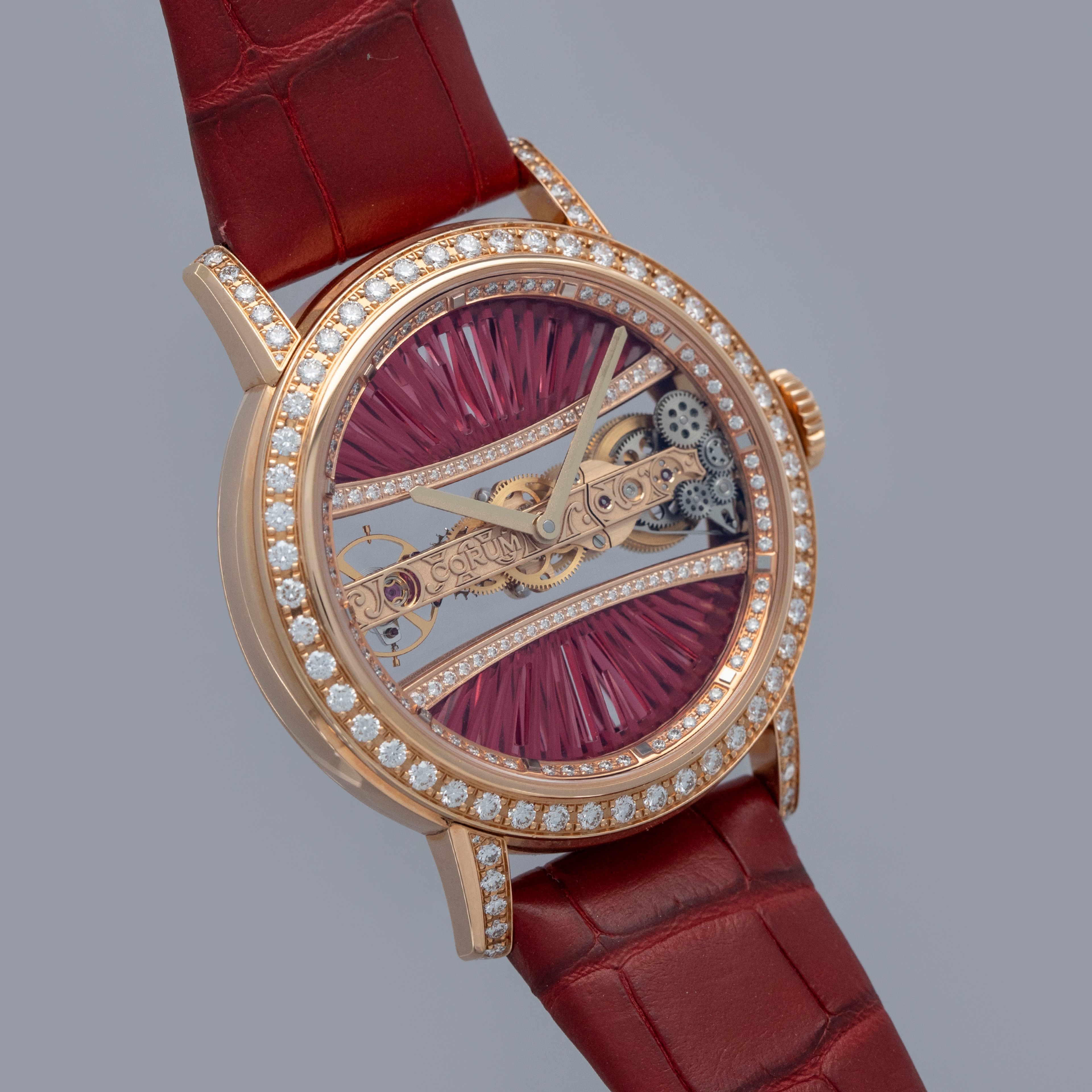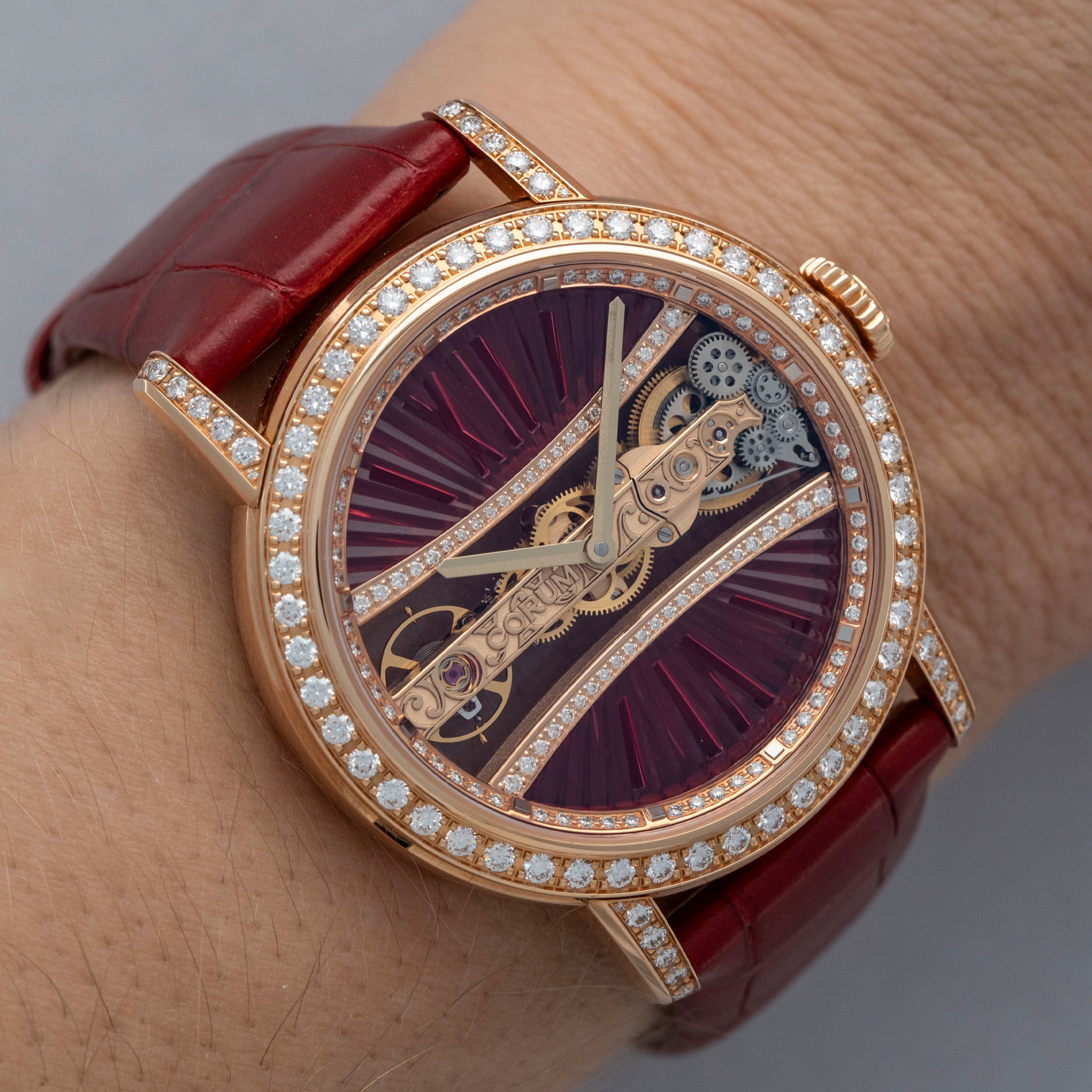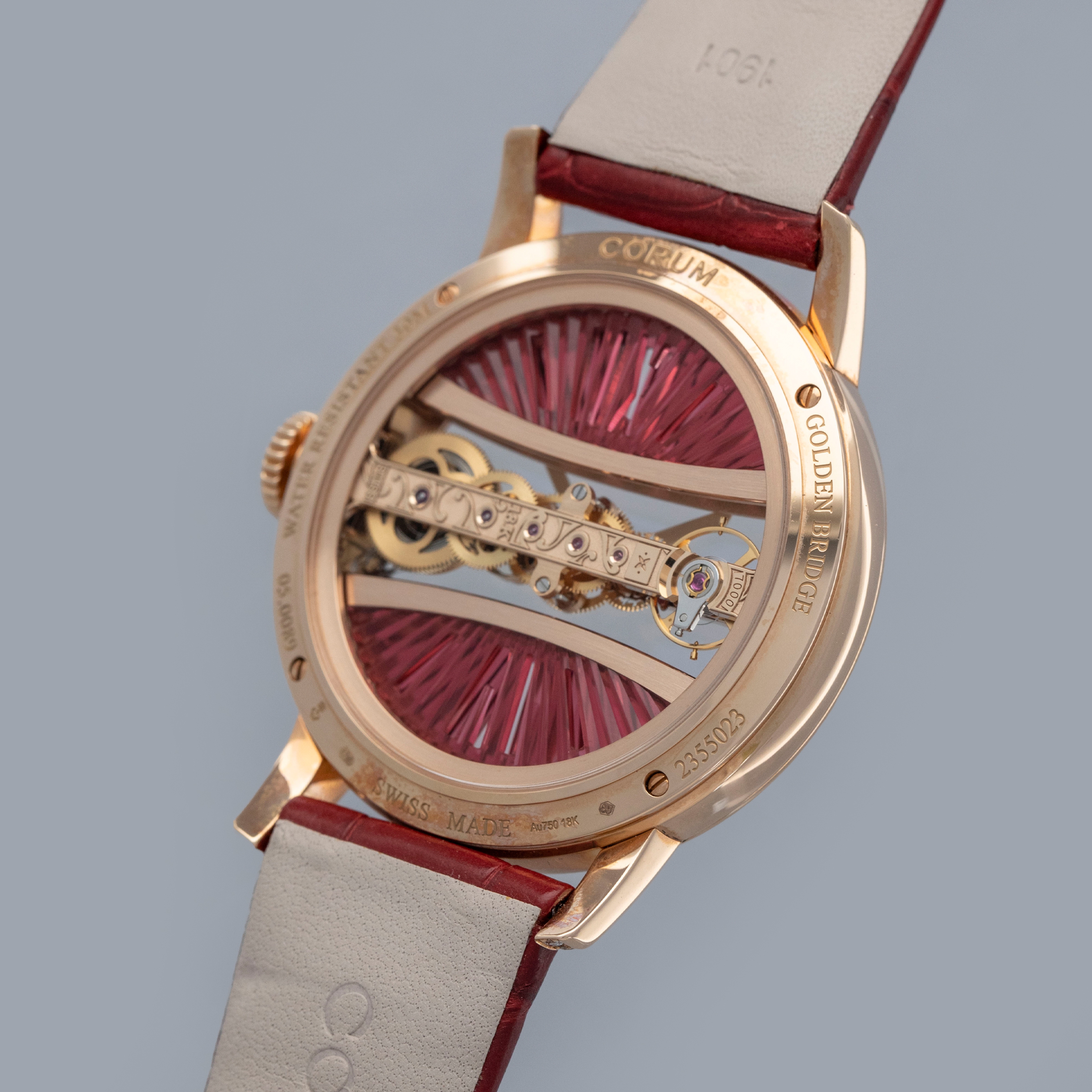 Showcasing its eponymous golden bridge movement design and lavishly paired with a ruby red sunburst pattern that is bordered with diamonds, this timepiece's display is a wonder marriage of luxury and craftsmanship.