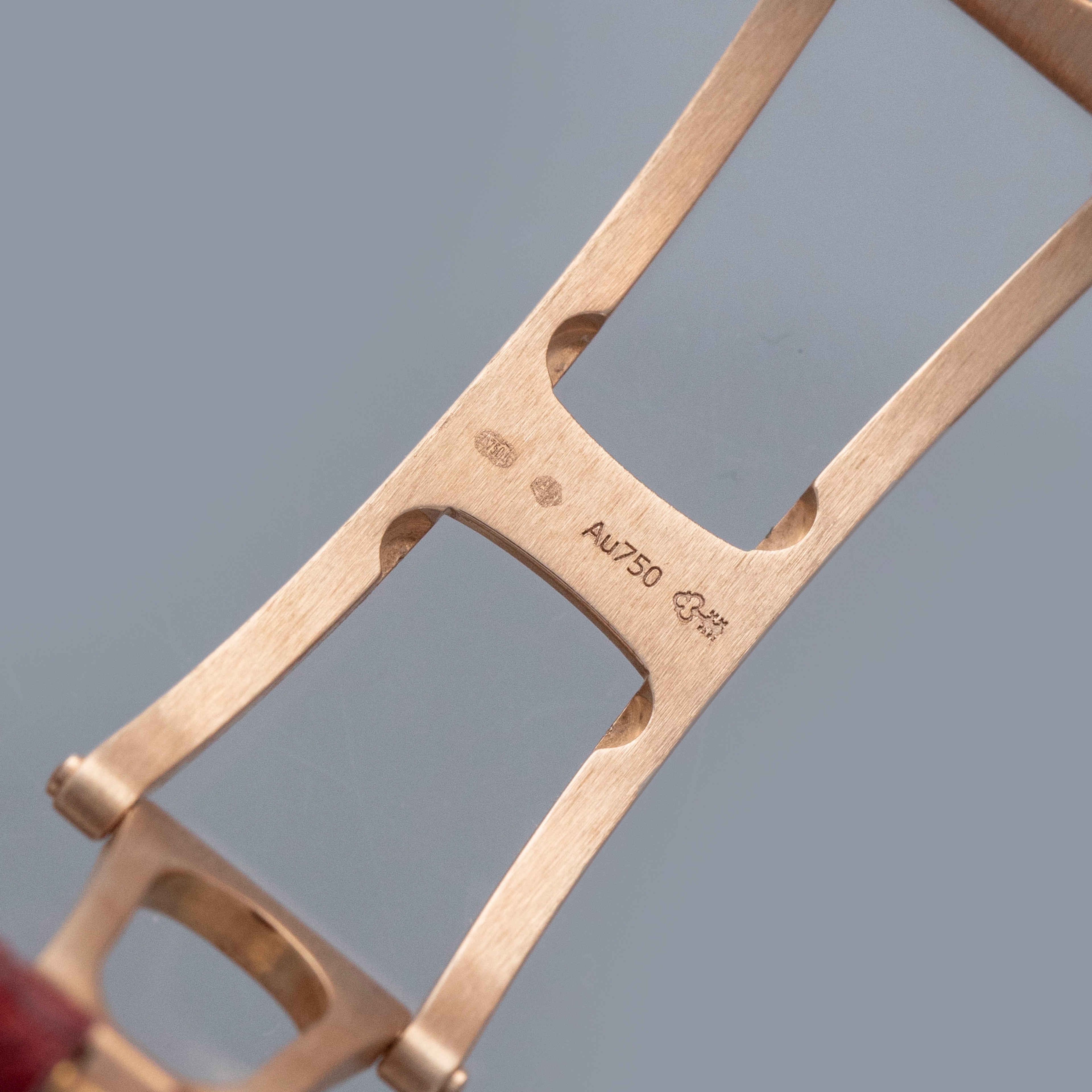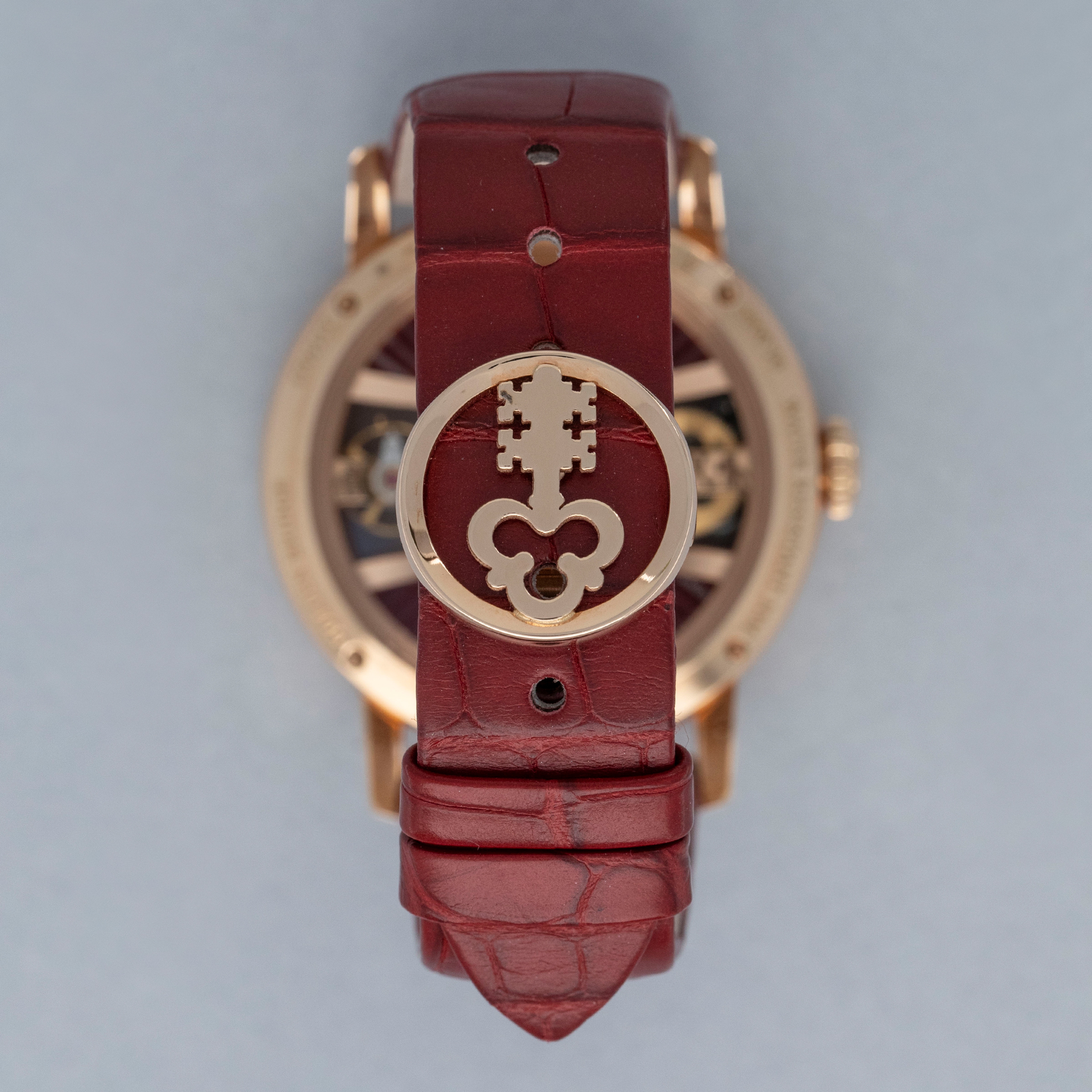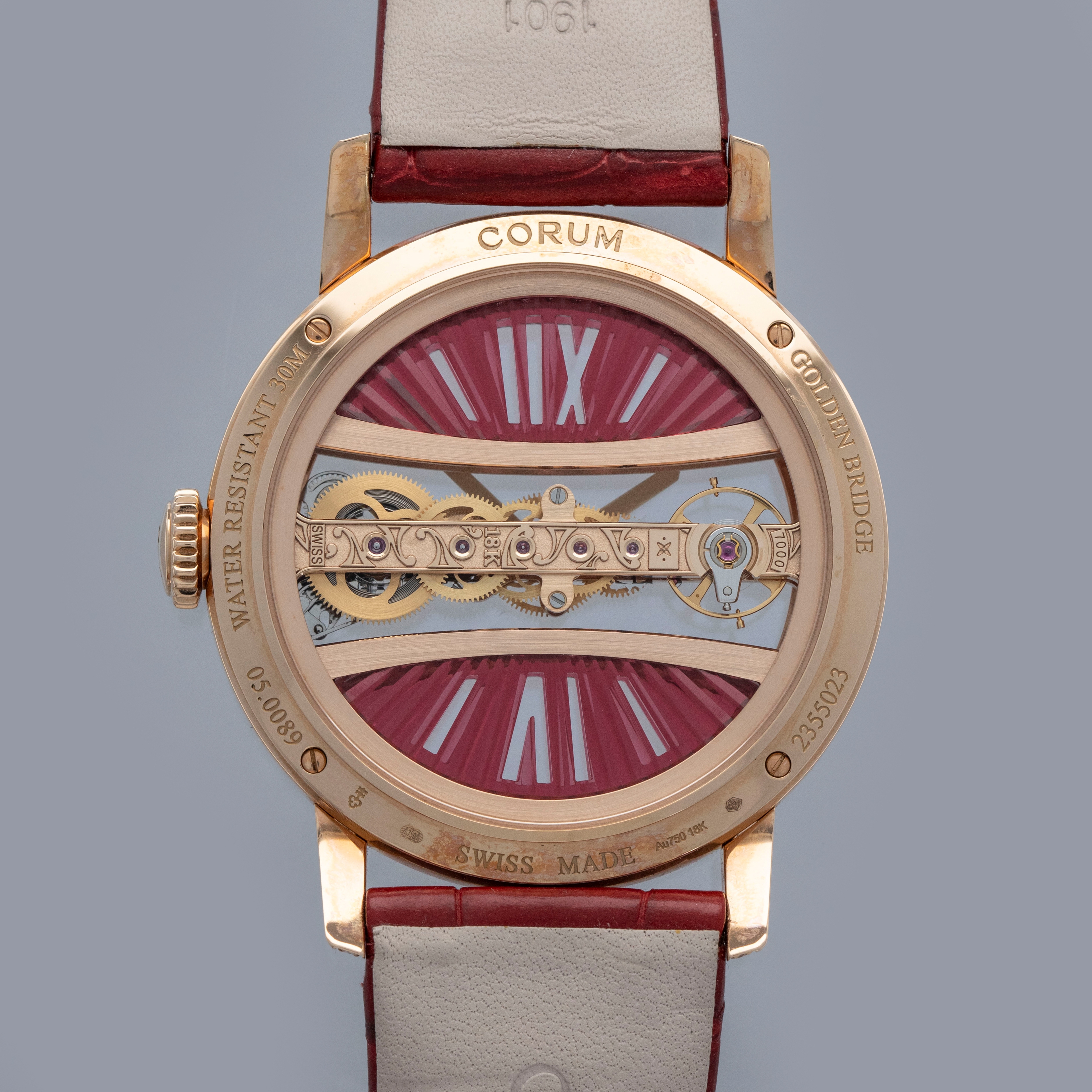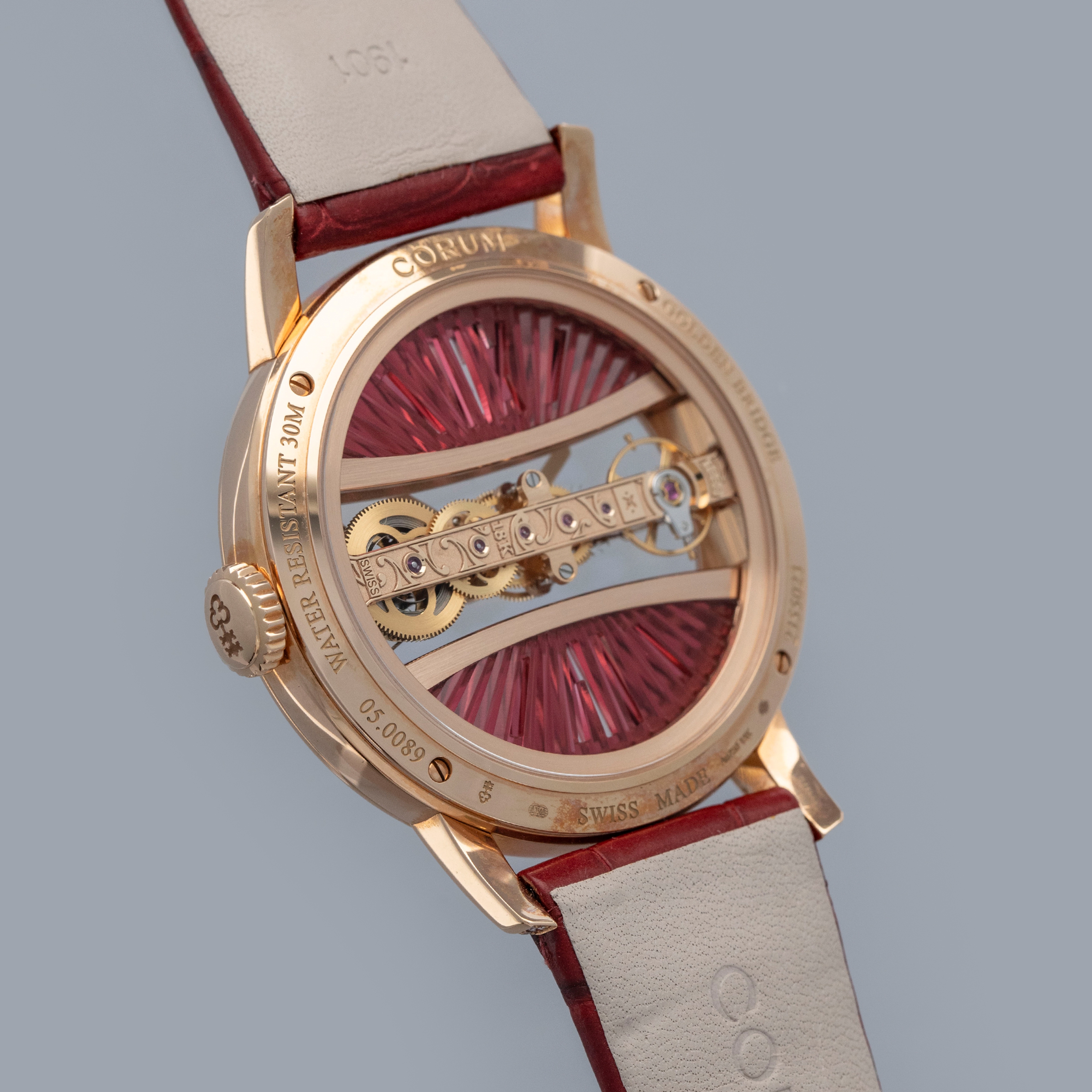 Showcasing its eponymous golden bridge movement design and lavishly paired with a ruby red sunburst pattern that is bordered with diamonds, this timepiece's display is a wonder marriage of luxury and craftsmanship.