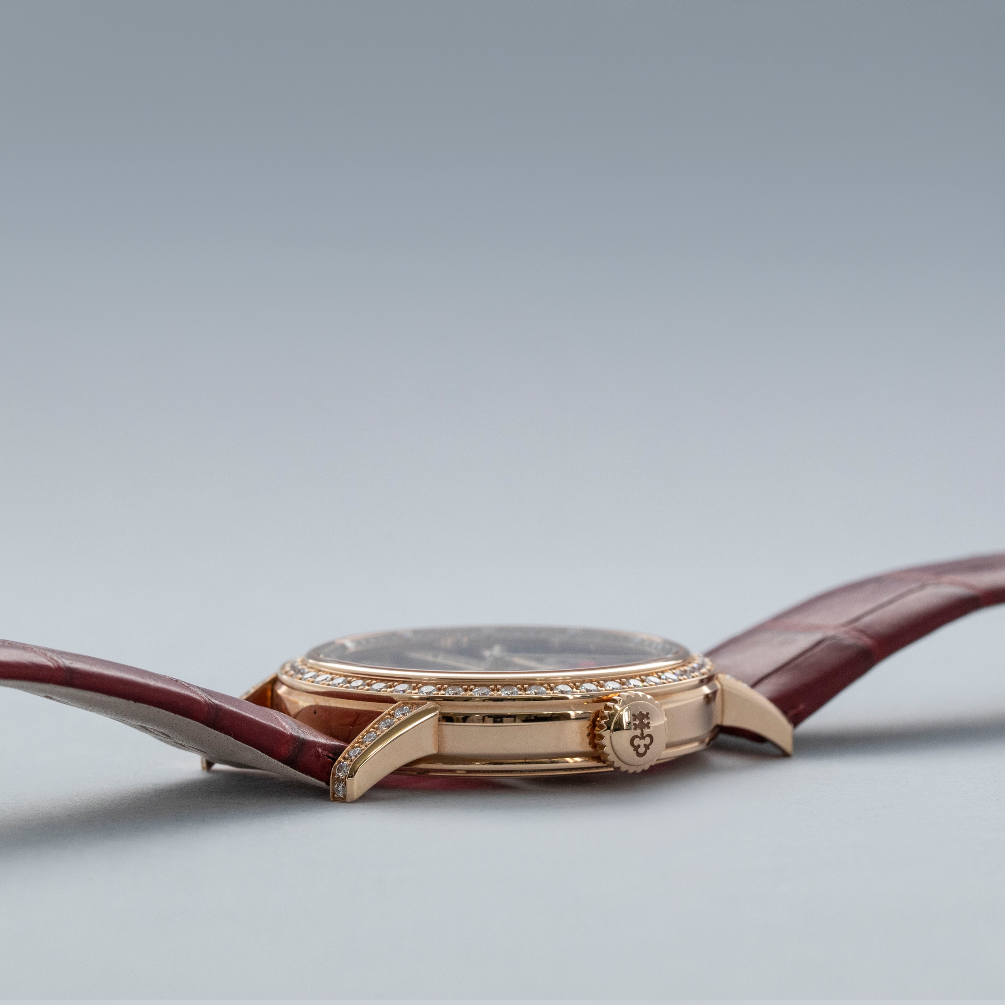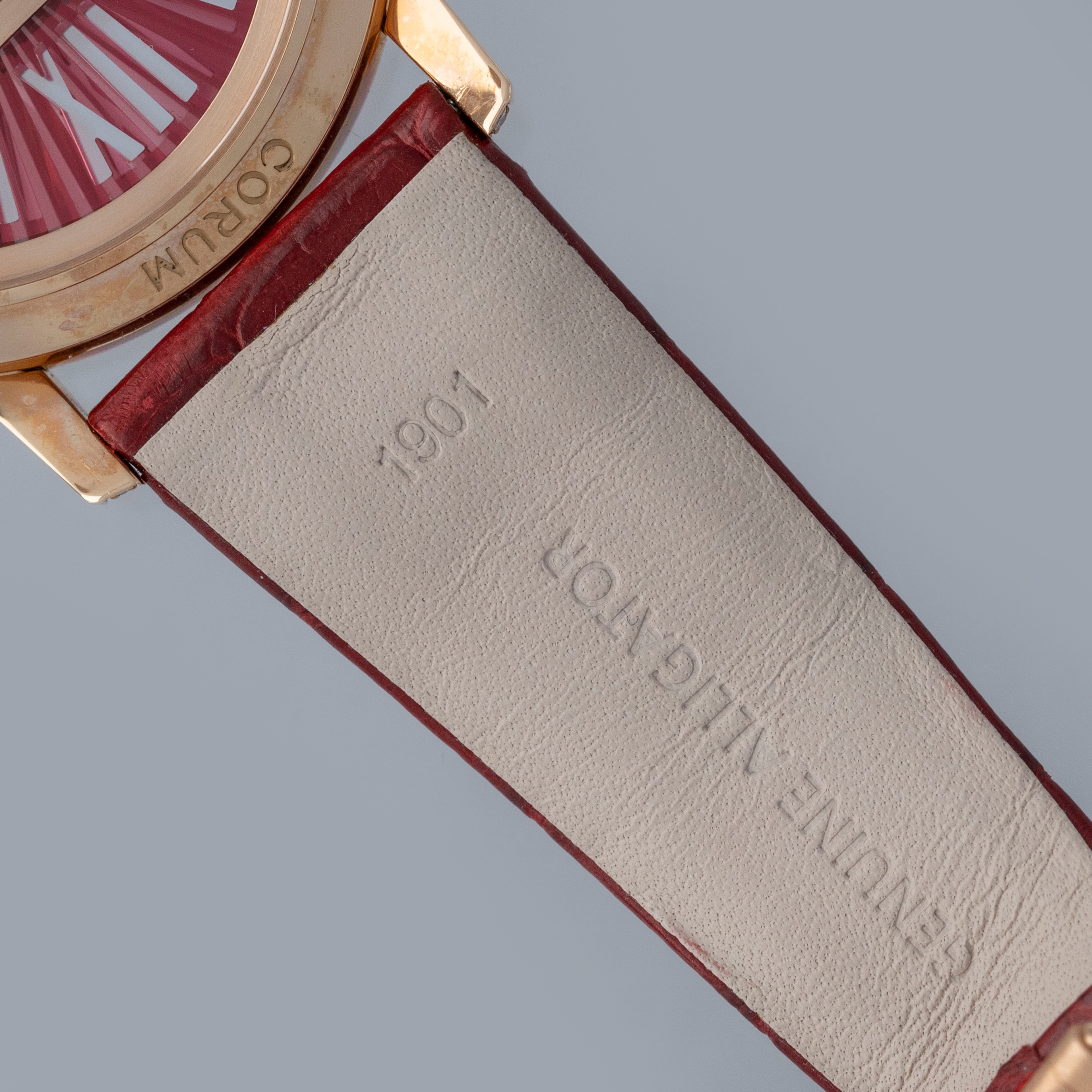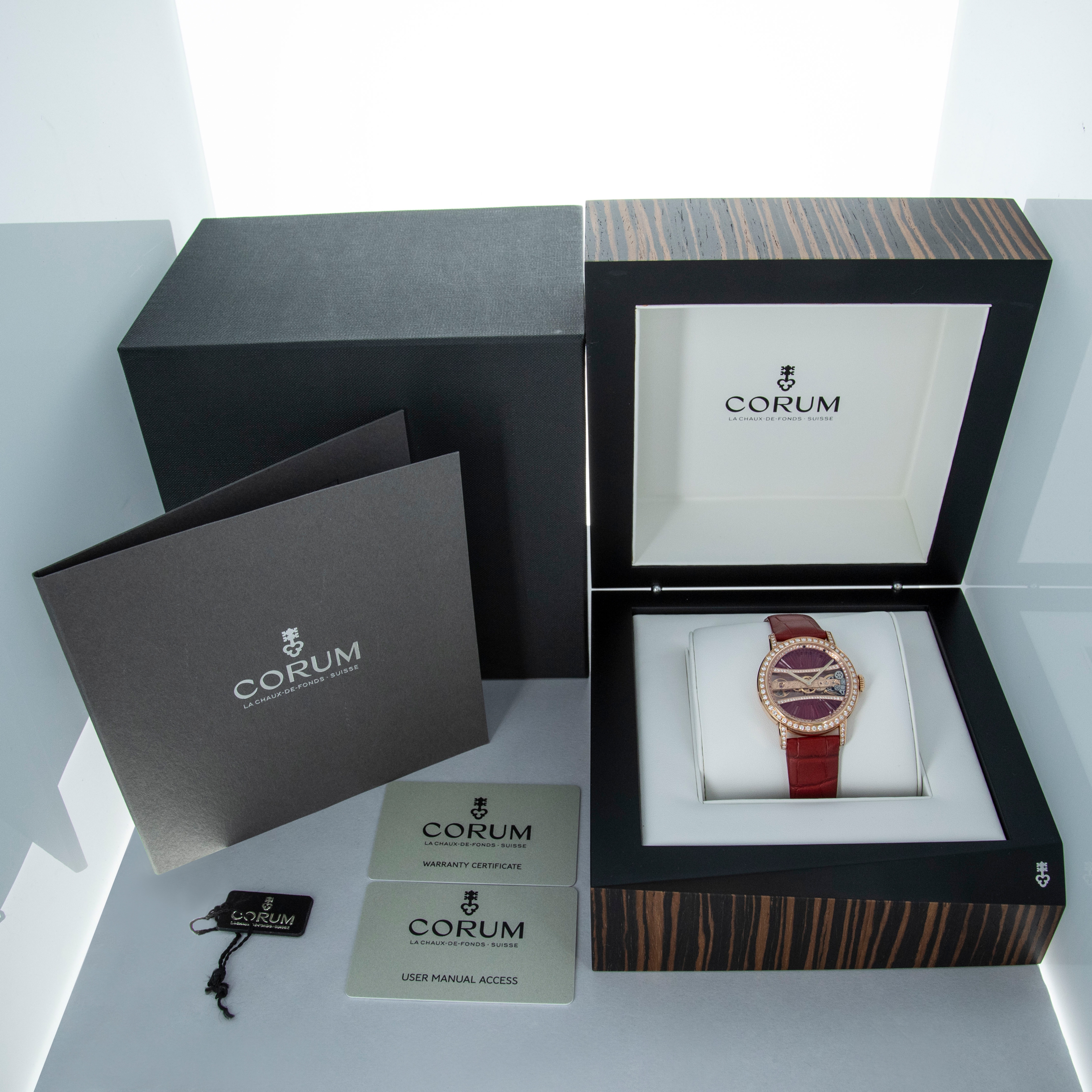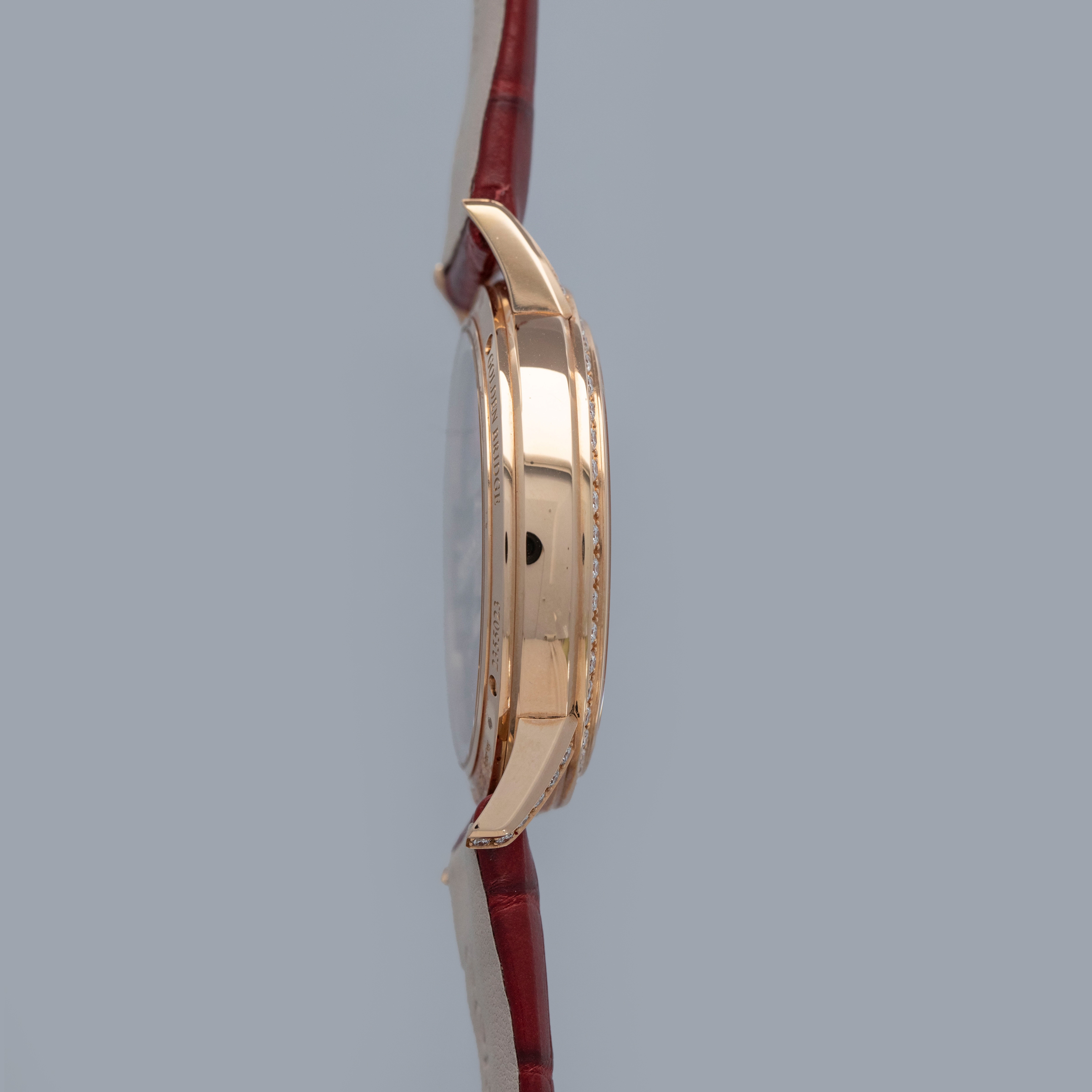 Showcasing its eponymous golden bridge movement design and lavishly paired with a ruby red sunburst pattern that is bordered with diamonds, this timepiece's display is a wonder marriage of luxury and craftsmanship.