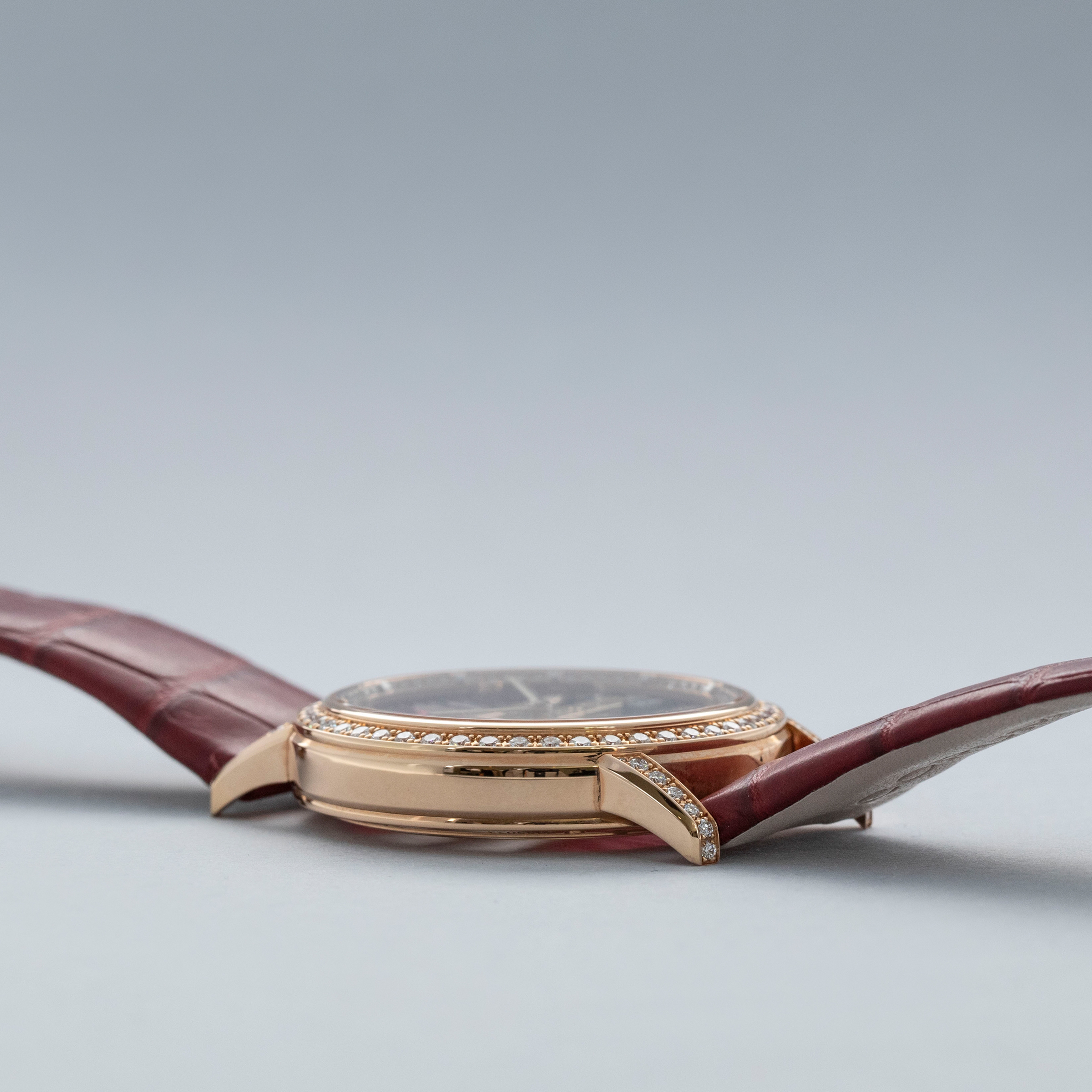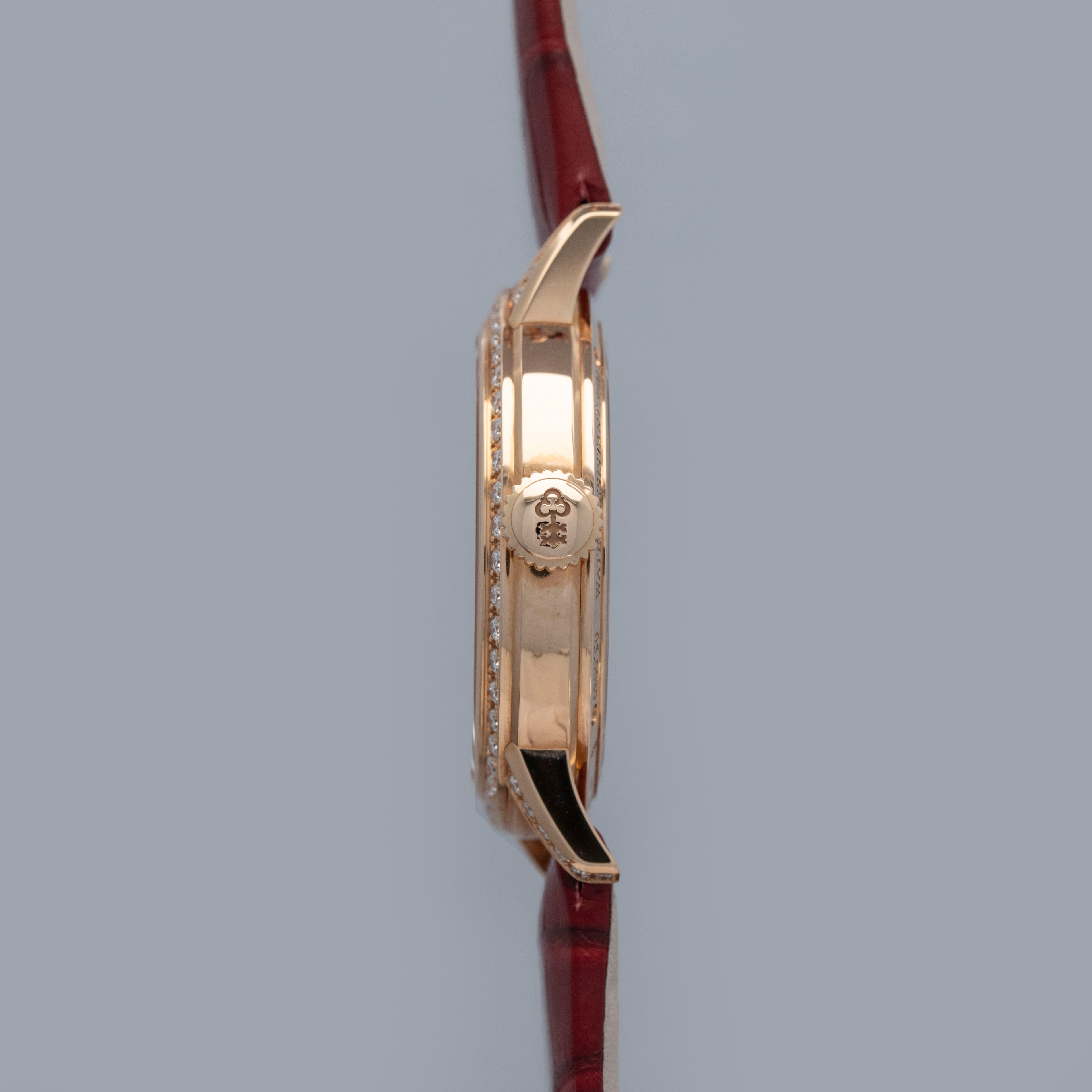 Differing from the Golden Bridge collection's typically rectangular design, the ref. B113/03277 boasts a 39mm circular case that is then lavishly set with diamonds along its bezel and lugs.