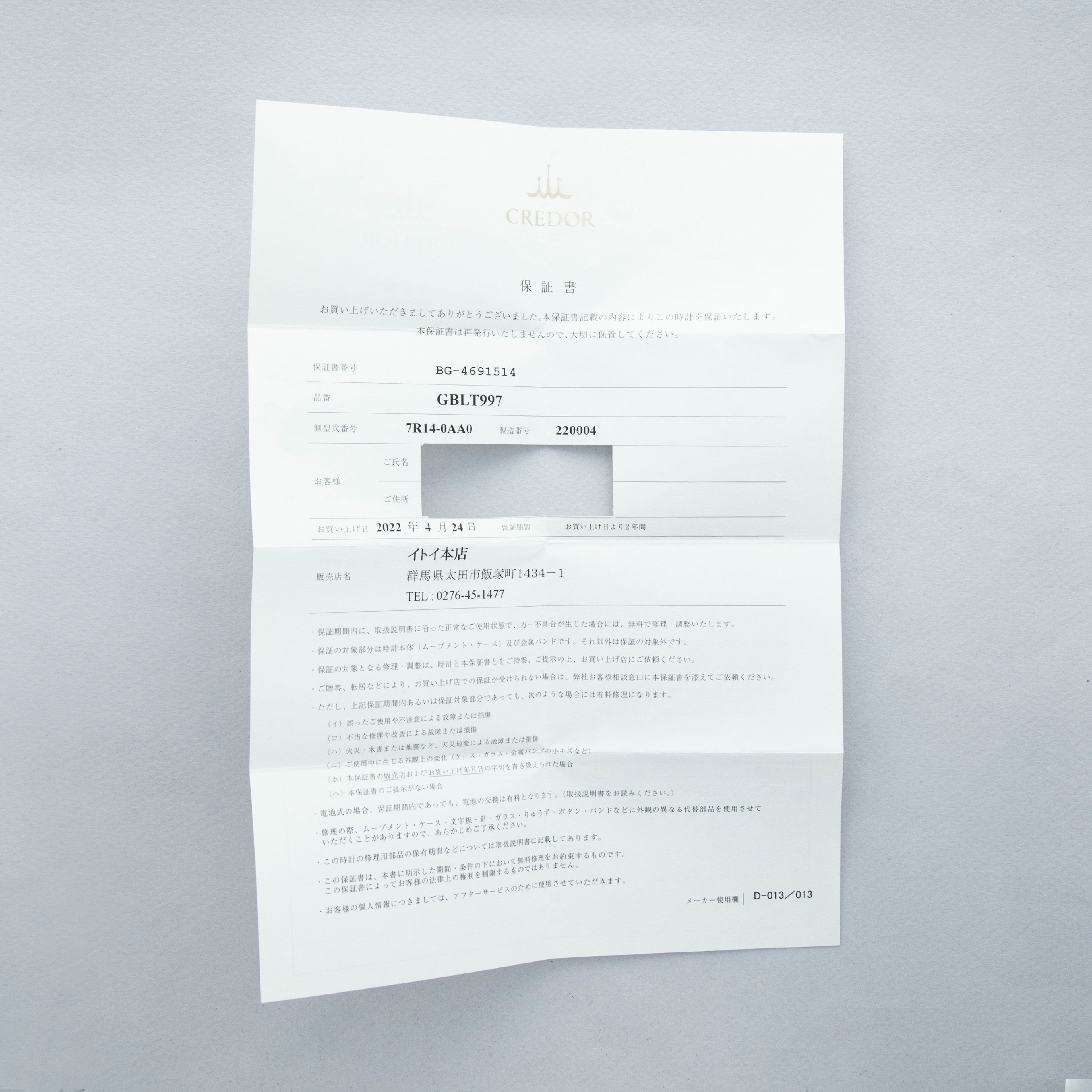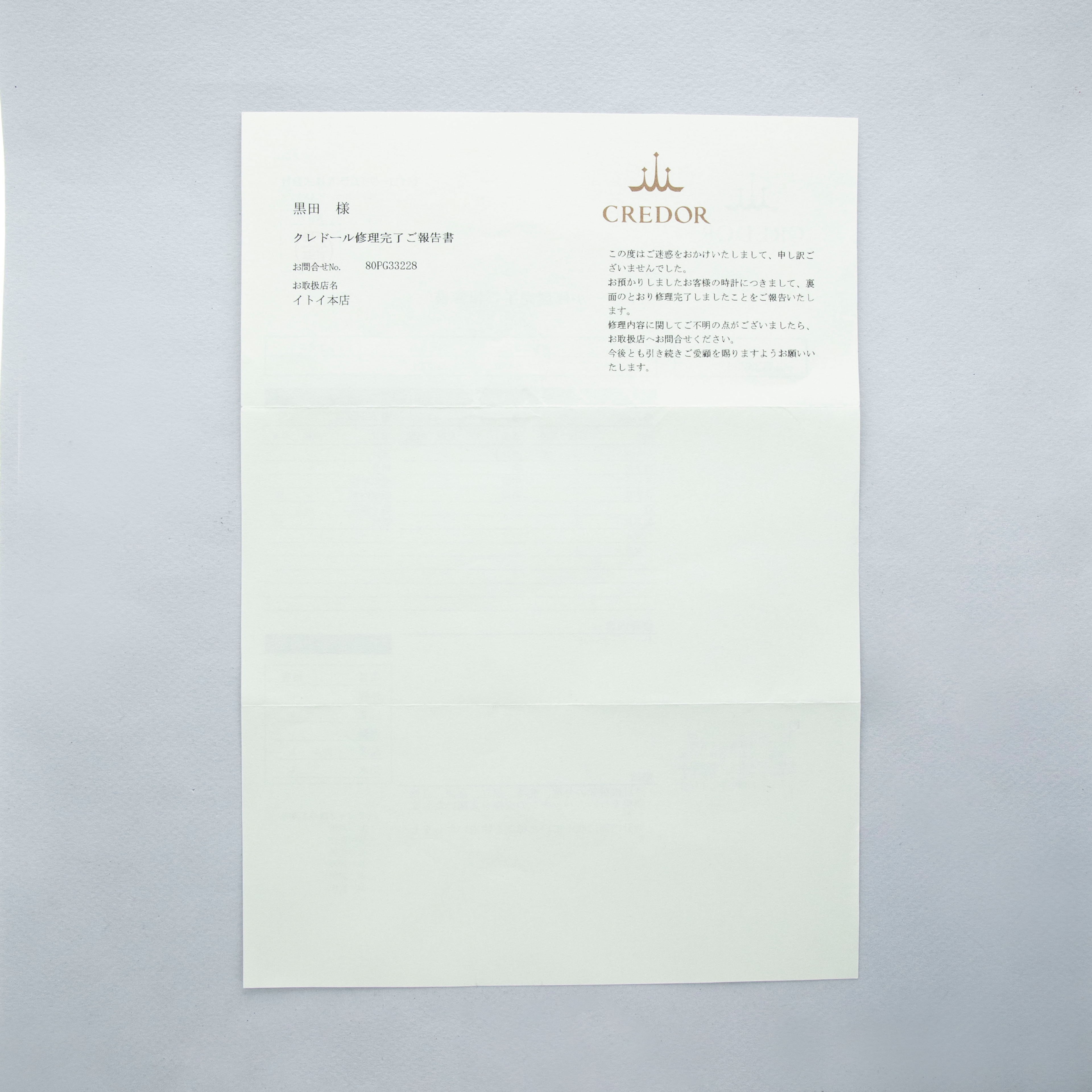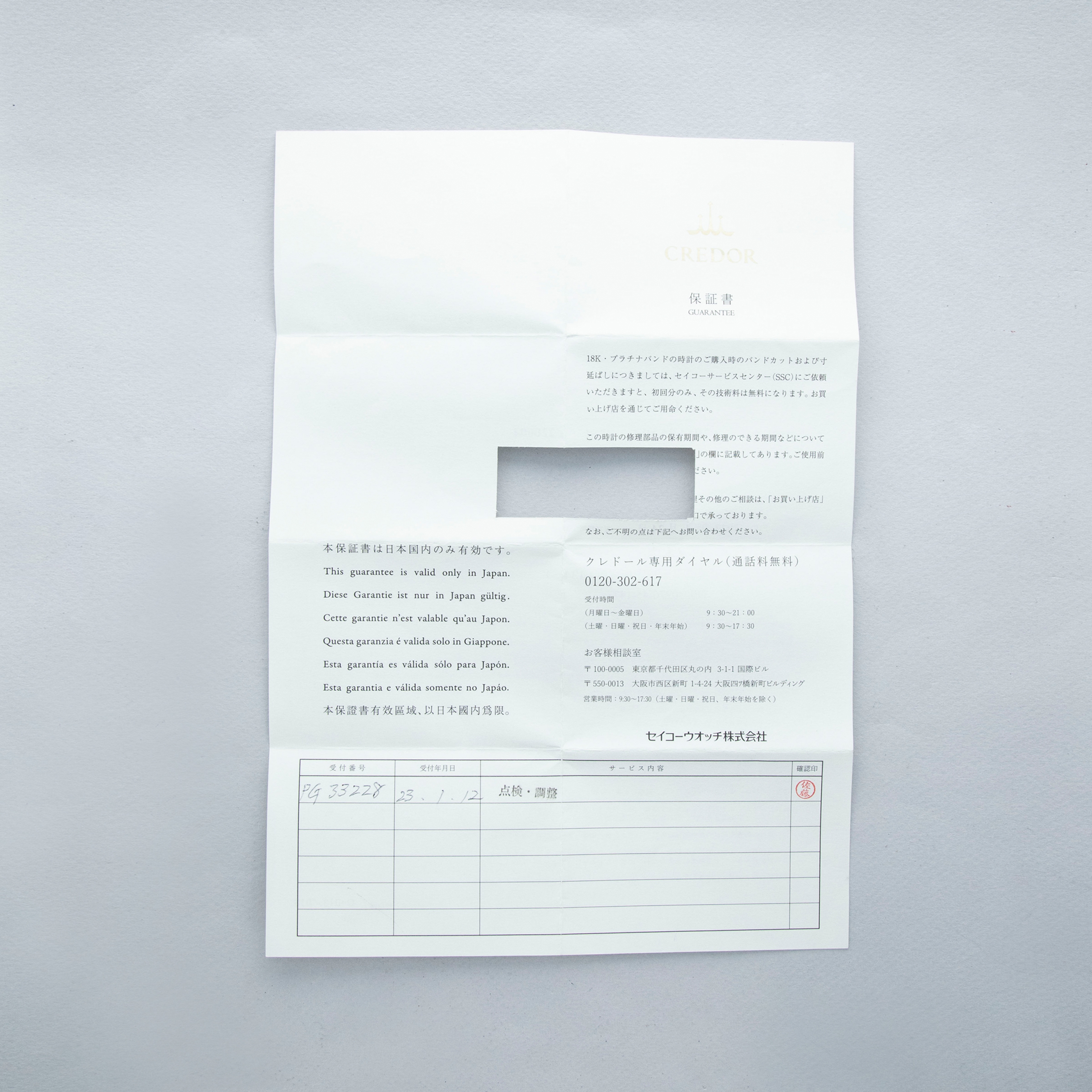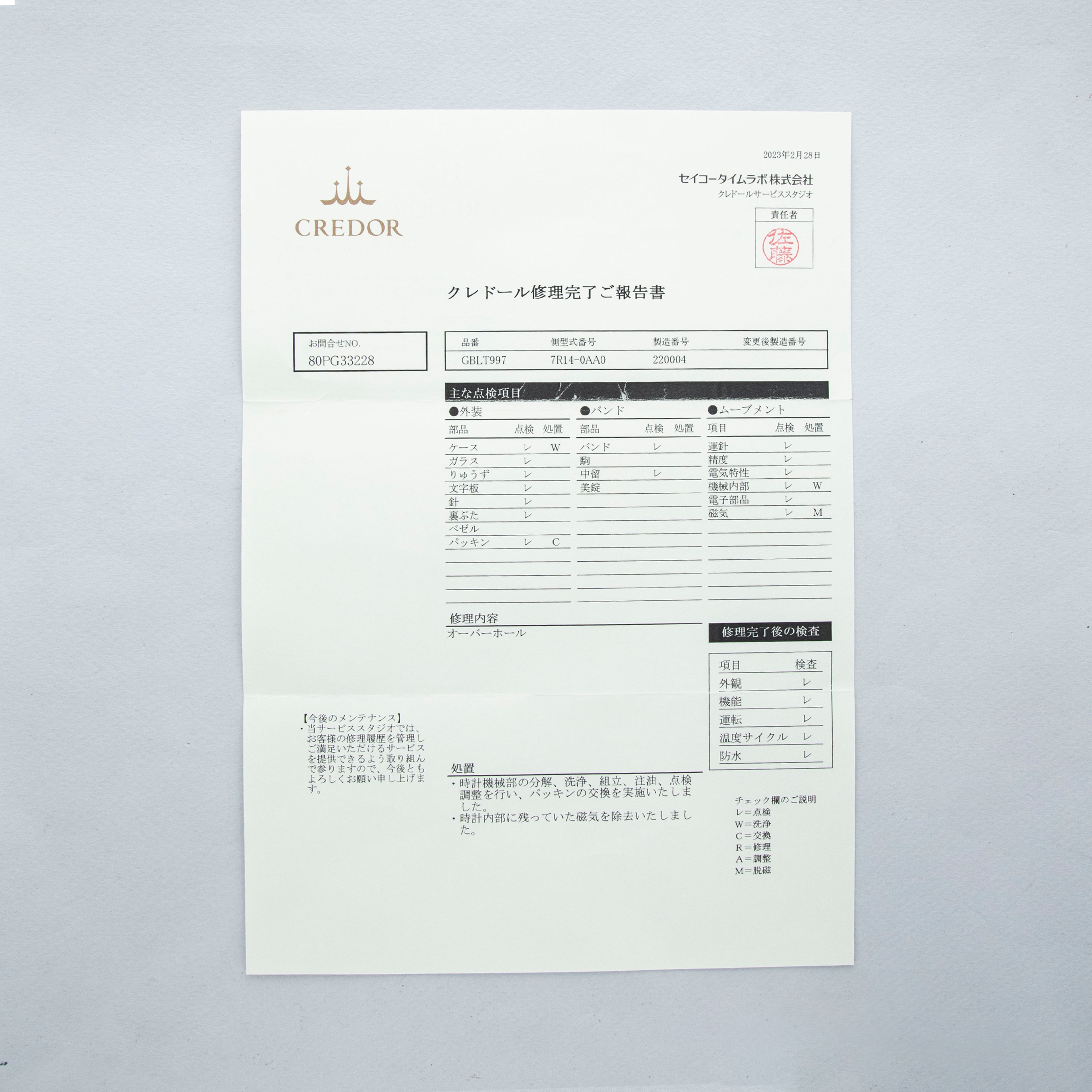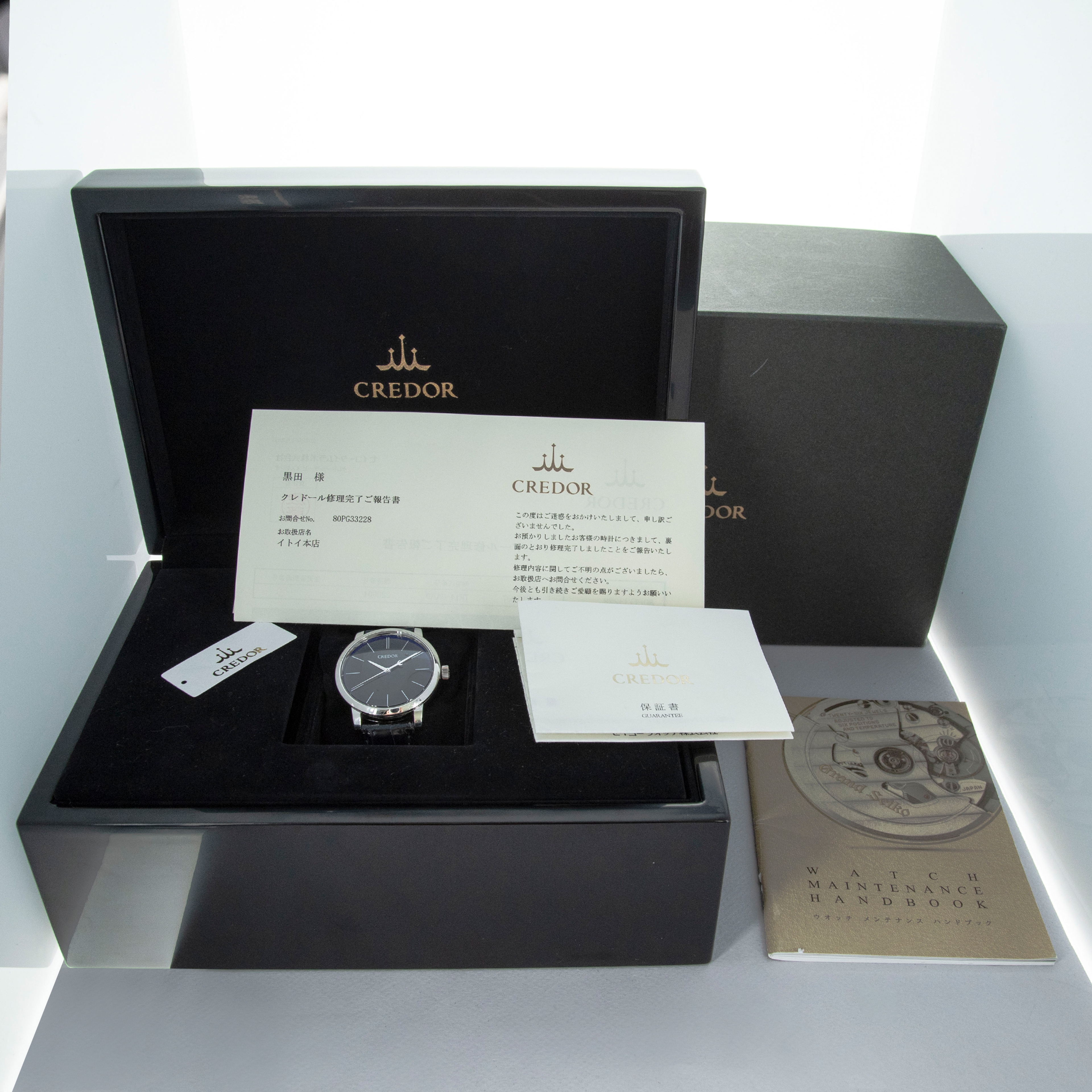 Watch, box, papers, and 2023-dated Credor service completion report