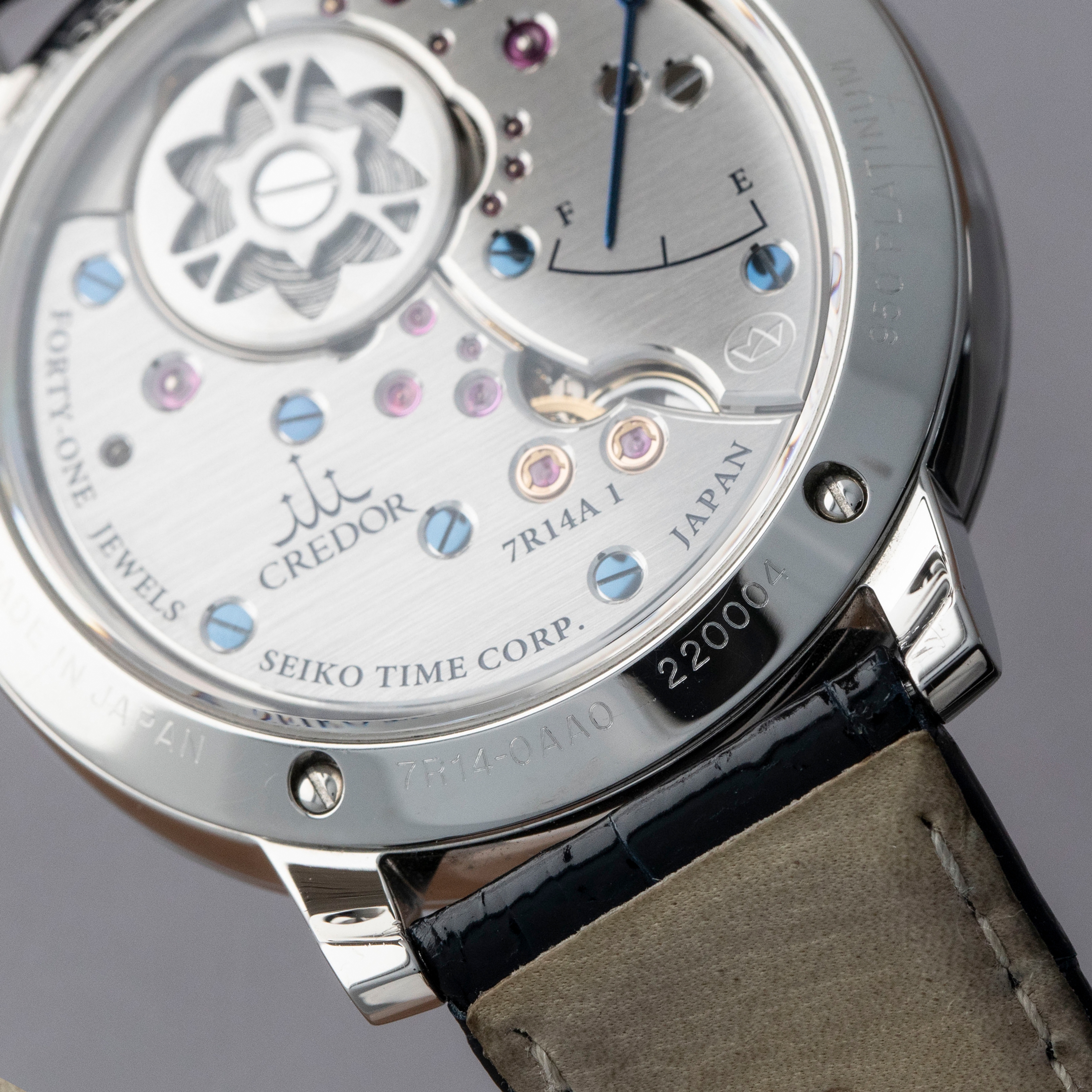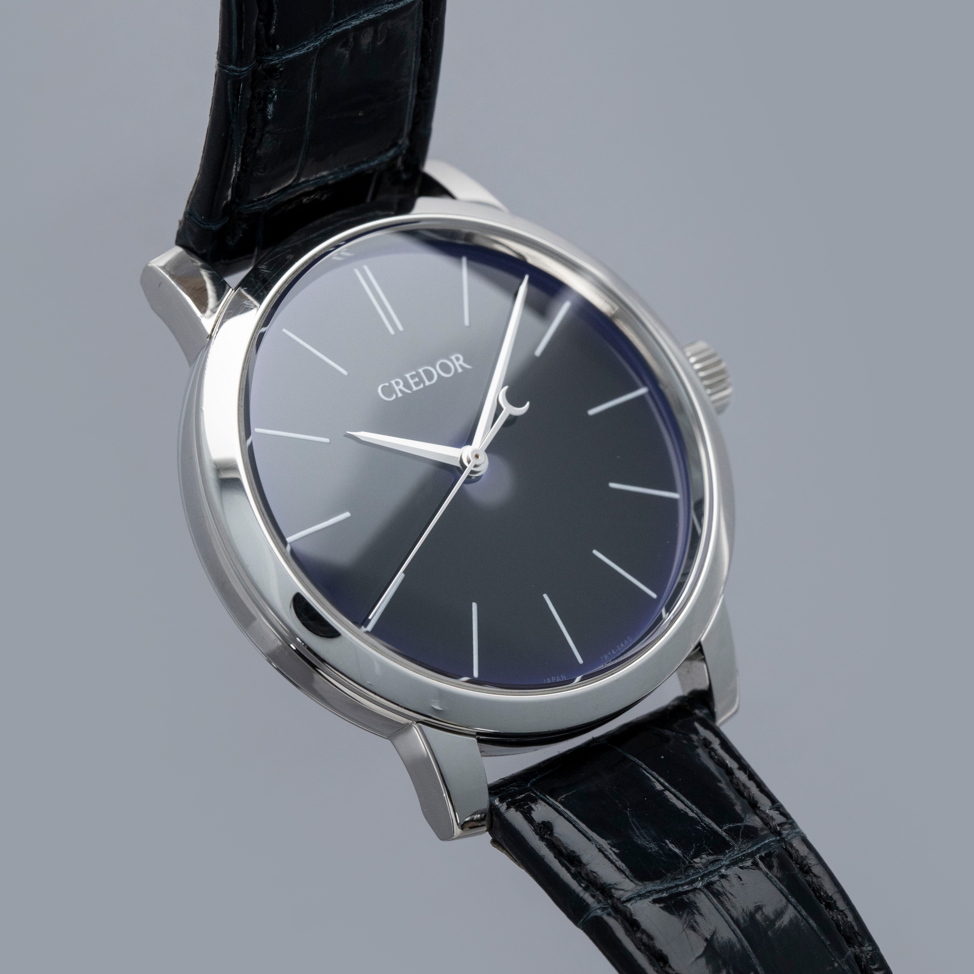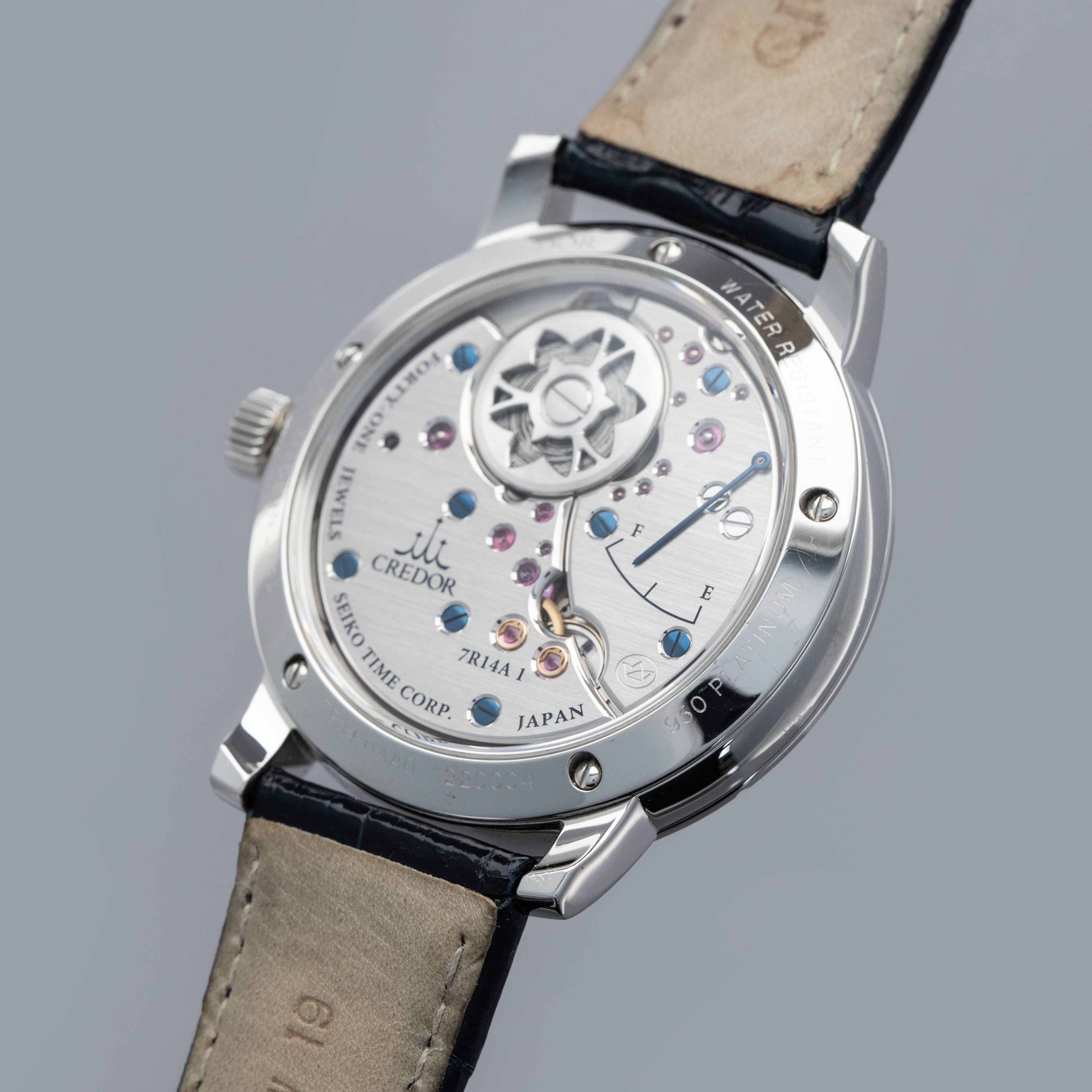 The watch is in overall excellent condition. The platinum case is well-defined but has a number of light scratches and scuffs on the polished bezel and case sides. The display case back has very well-defined engravings on the outer edge. The dial and hands are near-mint. It is fitted with a Credor alligator strap with a platinum deployant clasp showing light surface scuffs. The watch comes complete with boxes, warranty, booklets and paperwork. The name on the guarantee certificate has been cut out as seen in the images.
