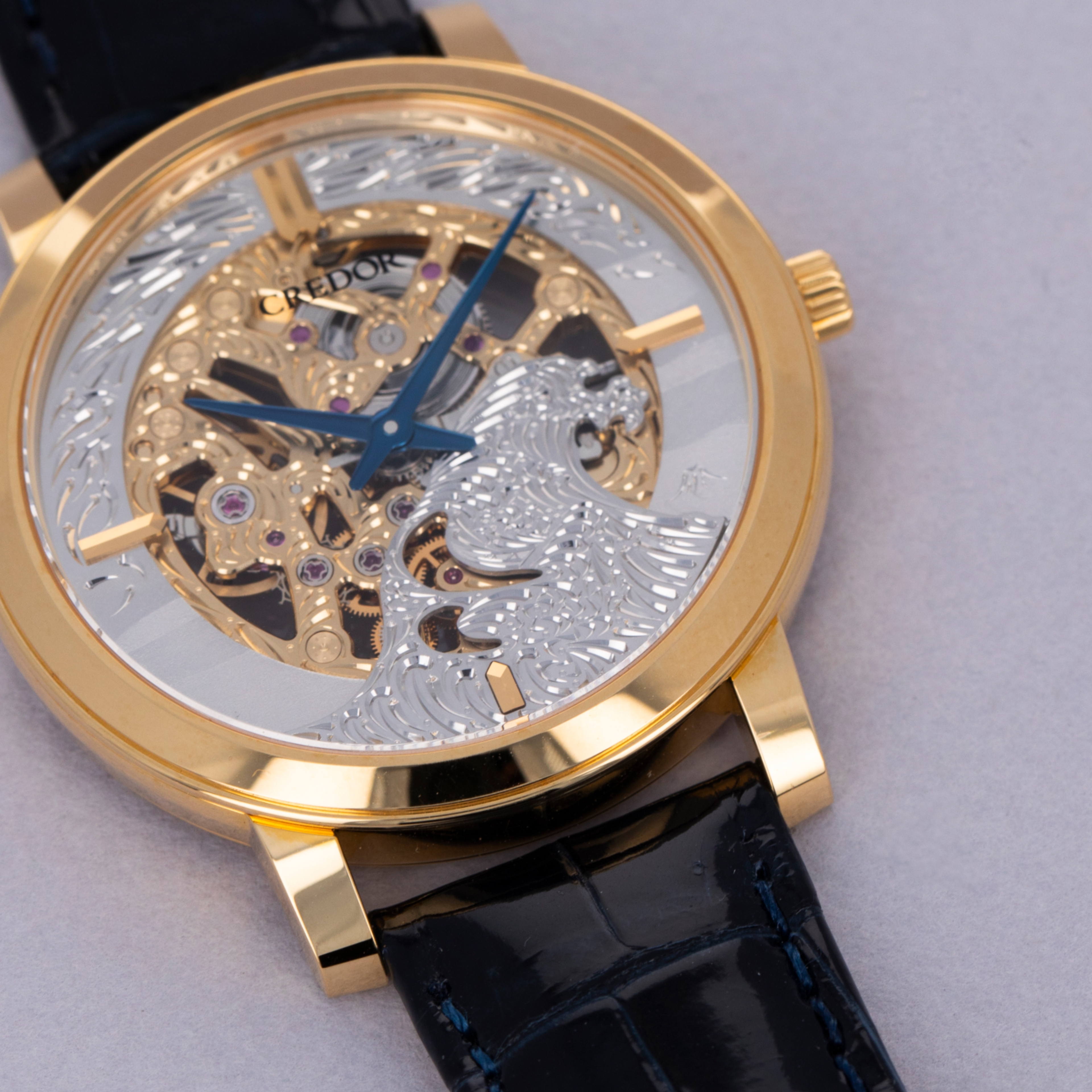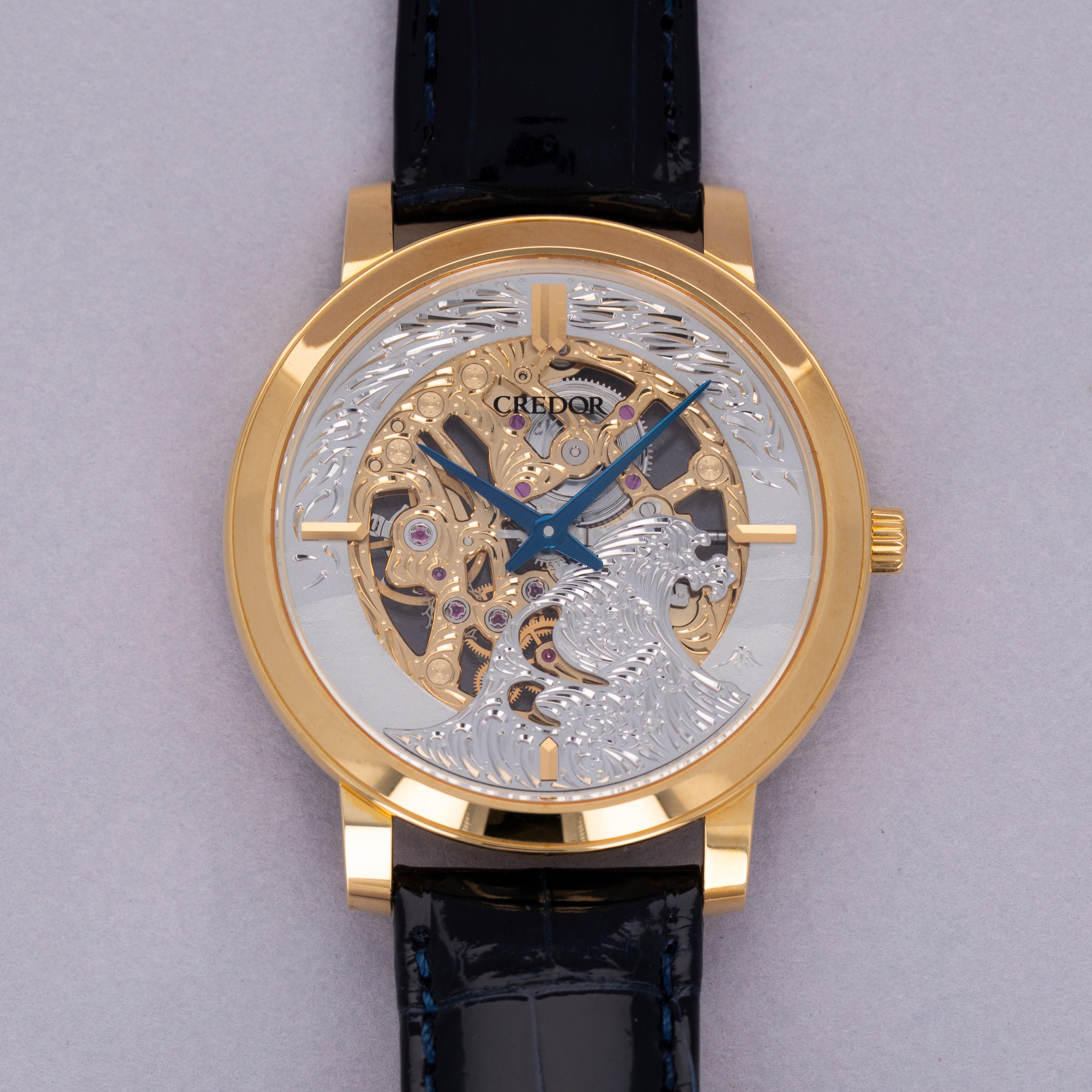 While they might be most notable for creating sturdy budget-friendly watches, Seiko have two sibling brands that exist only to punch up. The better-known Grand Seiko and the lesser-known Credor, whose tiny output allows them to create some of the finest watches on the market today in competition with brands like Patek Philippe, Vacheron Constantin and so forth. Introduced in 1974 as a collection of precious metal models, Credor began its life rather differently to how we know it today. Branded as "Crêt D'Or", meaning "Golden Crest" in French, it wasn't until 1978 that the brand was spun off into its own collection of watches and renamed "Credor" - as we know it today. Since then, Credor has created some truly spectacular timepieces, with the ref. GBBD950 that we have here a testament to that fact. Made from 18kt yellow gold and featuring a 38mm classically-inspired design, the ref. GBBD950 is a typical dress watch while on the wrist, but its display serves to highlight the artisanal craftsmanship that Credor is capable of and one of Japan’s most famous artworks, the Great Wave off Kanagawa, a woodblock print by Japanese ukiyo-e artist Hokusai. Engraved into its stunning dial, the GBBD950 celebrates Japanese art while also existing as a piece of art itself, and so this limited edition of just 8 pieces stands as a living tribute to one of Japan’s best-known artworks.