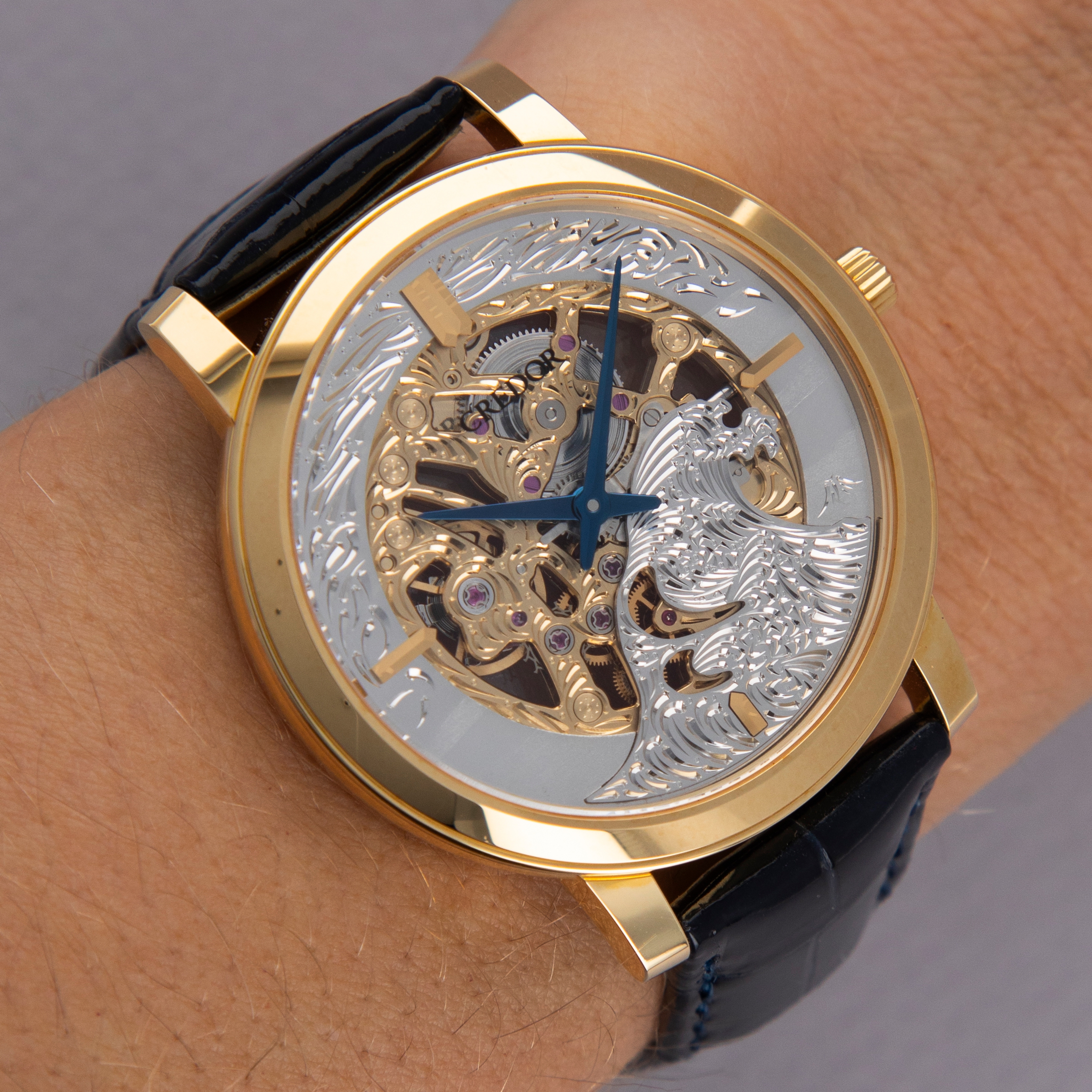 Skeletonized and taking very obvious inspiration from Hokusai's Great Wave off Kanagawa artwork, the ref. GBBD950's silver and golden display stunningly showcases Credor's craftsmanship and Japanese artisanal capabilities.