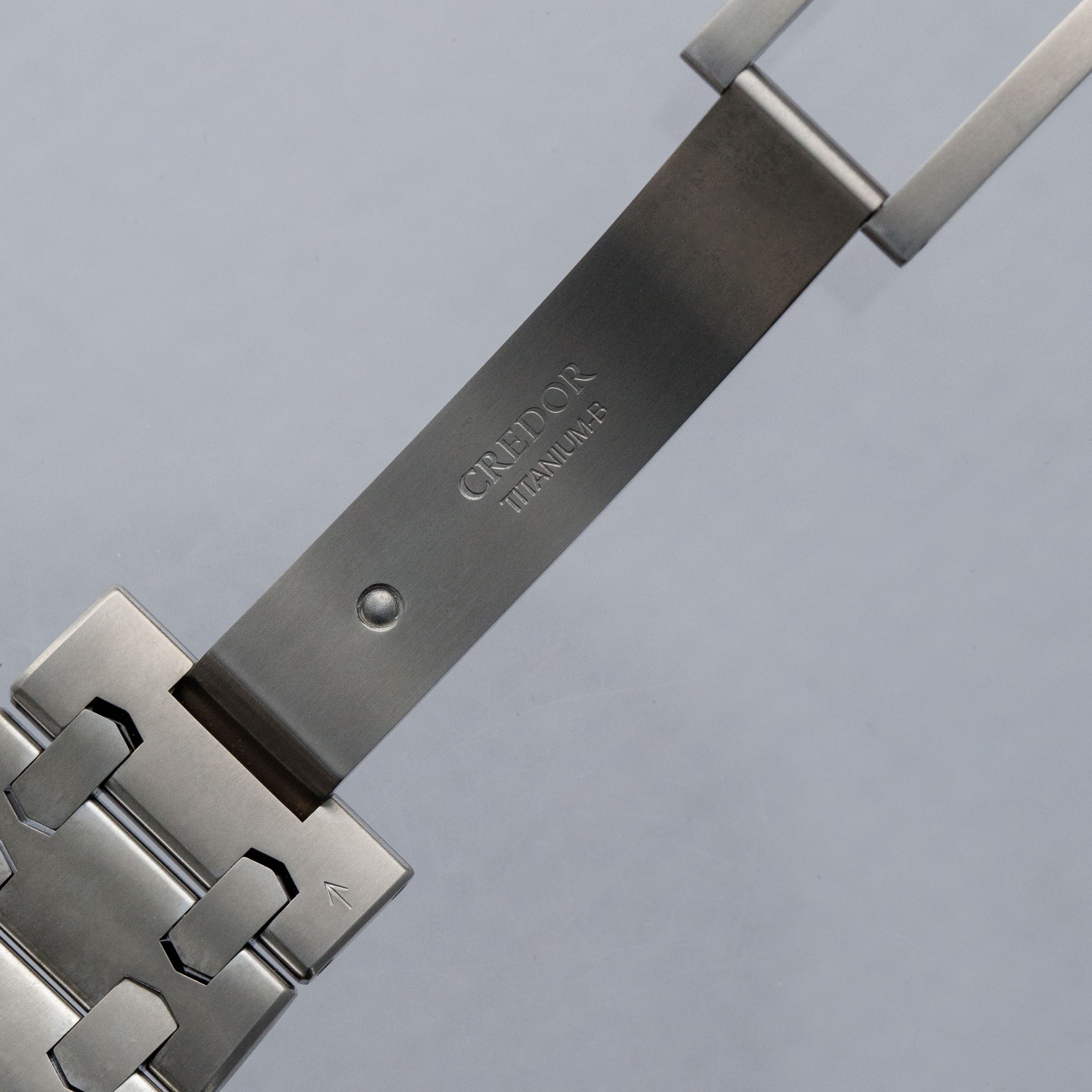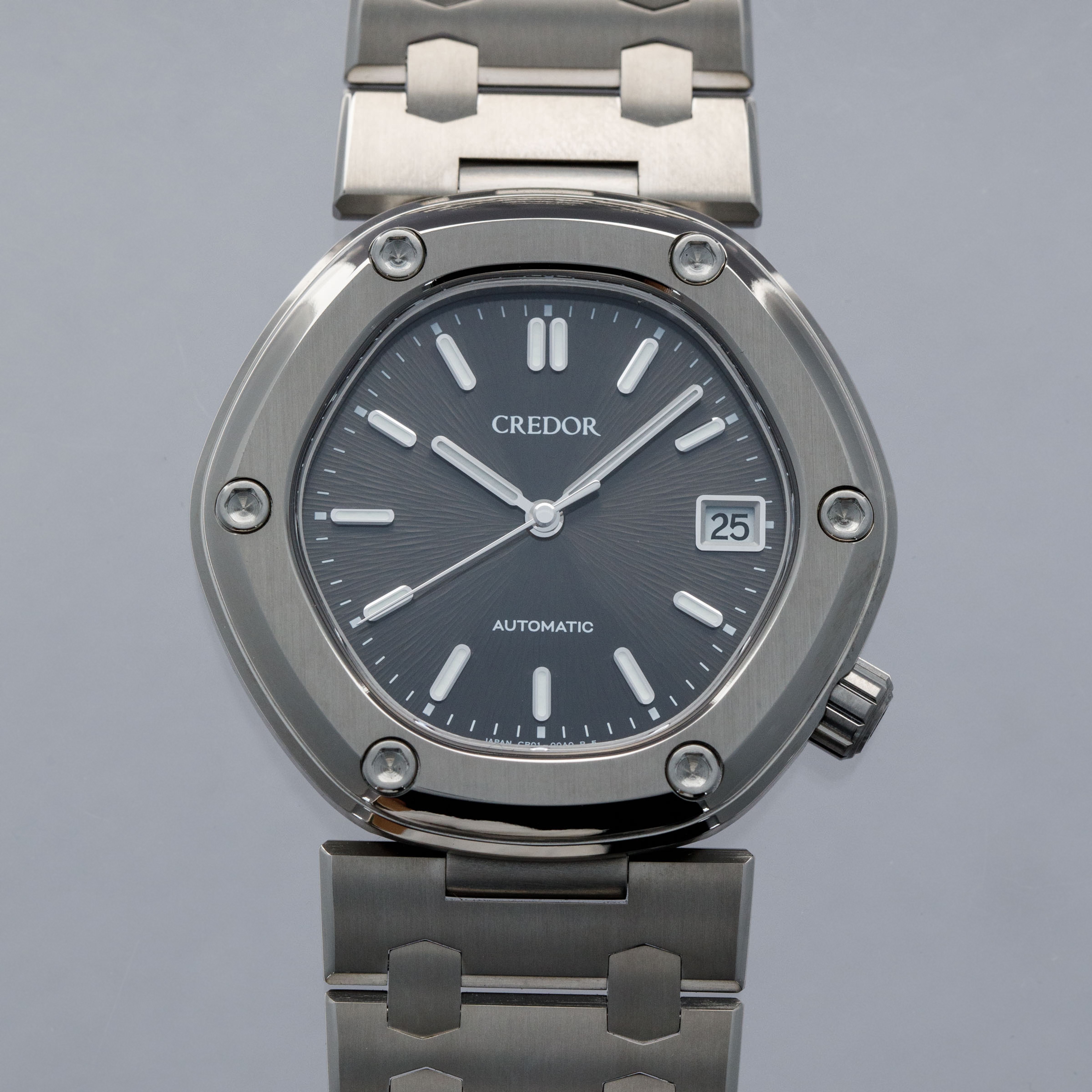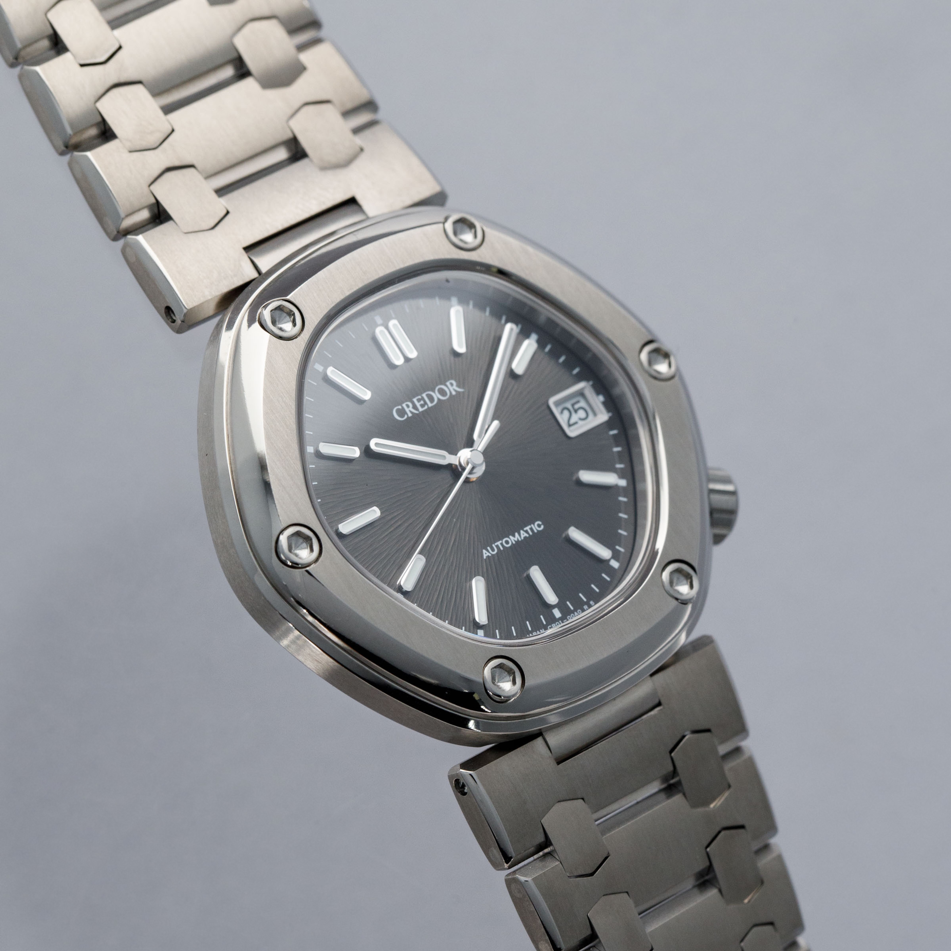 While they might be most notable for creating sturdy budget-friendly watches, Seiko have two sibling brands that exist only to punch up. The better-known Grand Seiko and the lesser-known Credor, whose tiny output allows them to create some of the finest watches on the market today in competition with brands like Patek Philippe, Vacheron Constantin and so forth. Introduced in 1974 as a collection of precious metal models, Credor began its life rather differently to how we know it today. Branded as "Crêt D'Or", meaning "Golden Crest" in French, it wasn't until 1978 that the brand was spun off into its own collection of watches and renamed "Credor" - as we know it today. Launched in 2024 as one of Credor’s collections, the Locomotive debuted with a casual aesthetic that moved away from Credor’s overtly classical design language and embraced everyday functionality – inspired by a 1978 design created for Credor by none other than Gerald Genta. Launched as a limited edition variant of just 300 pieces, the 38.8mm ref. GCCR999 that we have here features a complete titanium construction with a striking black dial with 1600 engravings that radiate out from the dial’s central pinion. Surrounded by an hexagonal bezel with six exposed screws and a Vendome lug system for its train track-inspired bracelet that gives the watch a classical edge to what is otherwise a rather sporty design.
