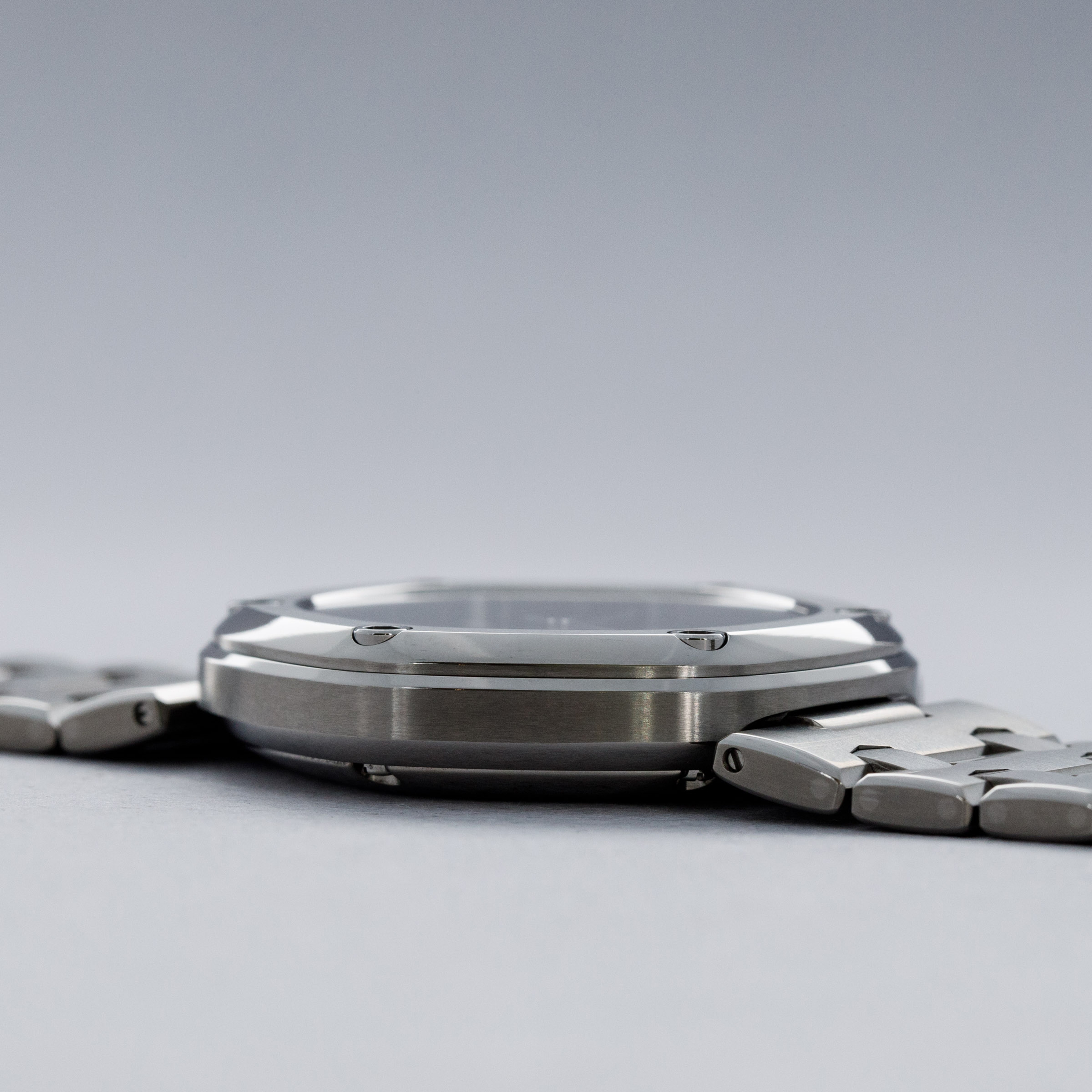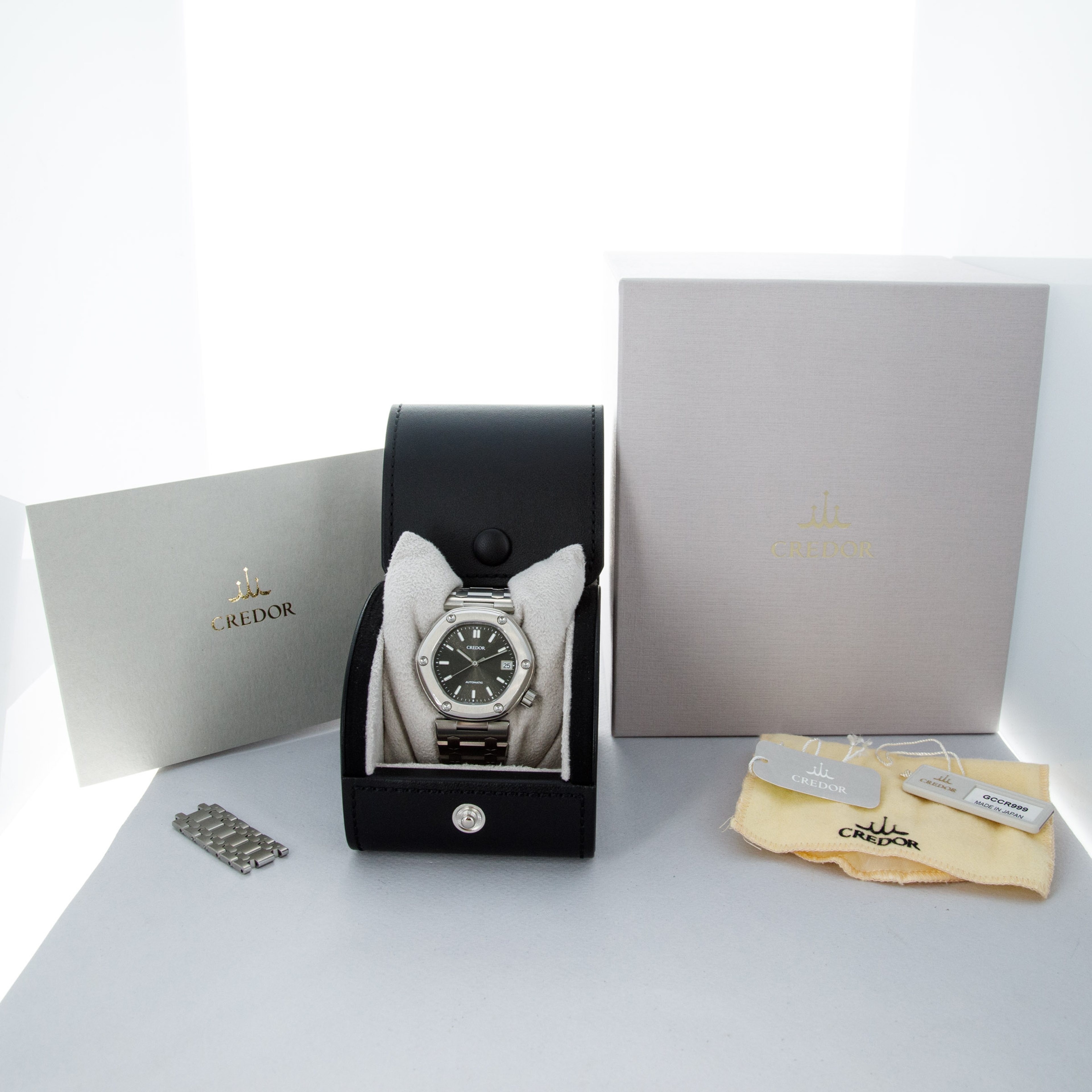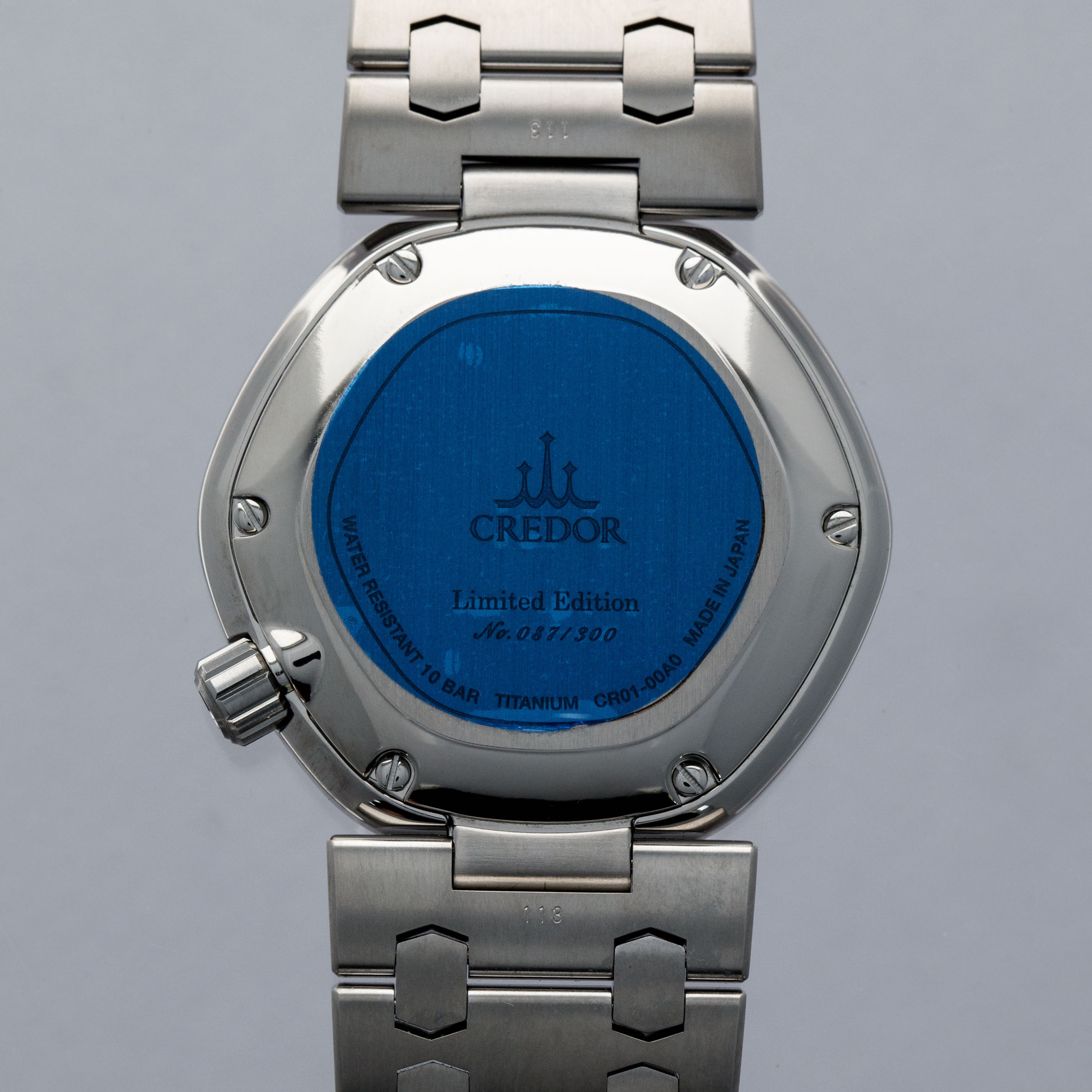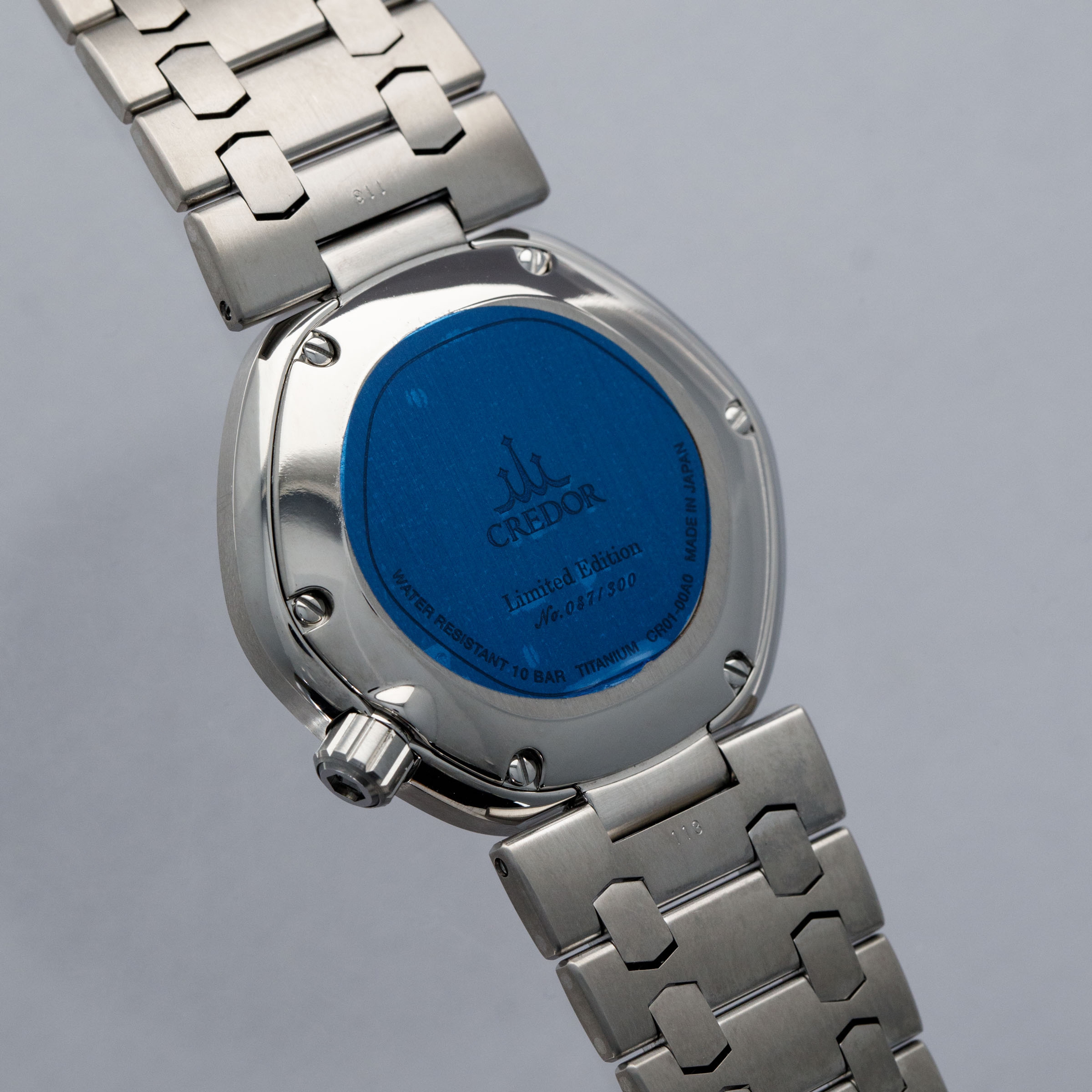 While they might be most notable for creating sturdy budget-friendly watches, Seiko have two sibling brands that exist only to punch up. The better-known Grand Seiko and the lesser-known Credor, whose tiny output allows them to create some of the finest watches on the market today in competition with brands like Patek Philippe, Vacheron Constantin and so forth. Introduced in 1974 as a collection of precious metal models, Credor began its life rather differently to how we know it today. Branded as "Crêt D'Or", meaning "Golden Crest" in French, it wasn't until 1978 that the brand was spun off into its own collection of watches and renamed "Credor" - as we know it today. Launched in 2024 as one of Credor’s collections, the Locomotive debuted with a casual aesthetic that moved away from Credor’s overtly classical design language and embraced everyday functionality – inspired by a 1978 design created for Credor by none other than Gerald Genta. Launched as a limited edition variant of just 300 pieces, the 38.8mm ref. GCCR999 that we have here features a complete titanium construction with a striking black dial with 1600 engravings that radiate out from the dial’s central pinion. Surrounded by an hexagonal bezel with six exposed screws and a Vendome lug system for its train track-inspired bracelet that gives the watch a classical edge to what is otherwise a rather sporty design.