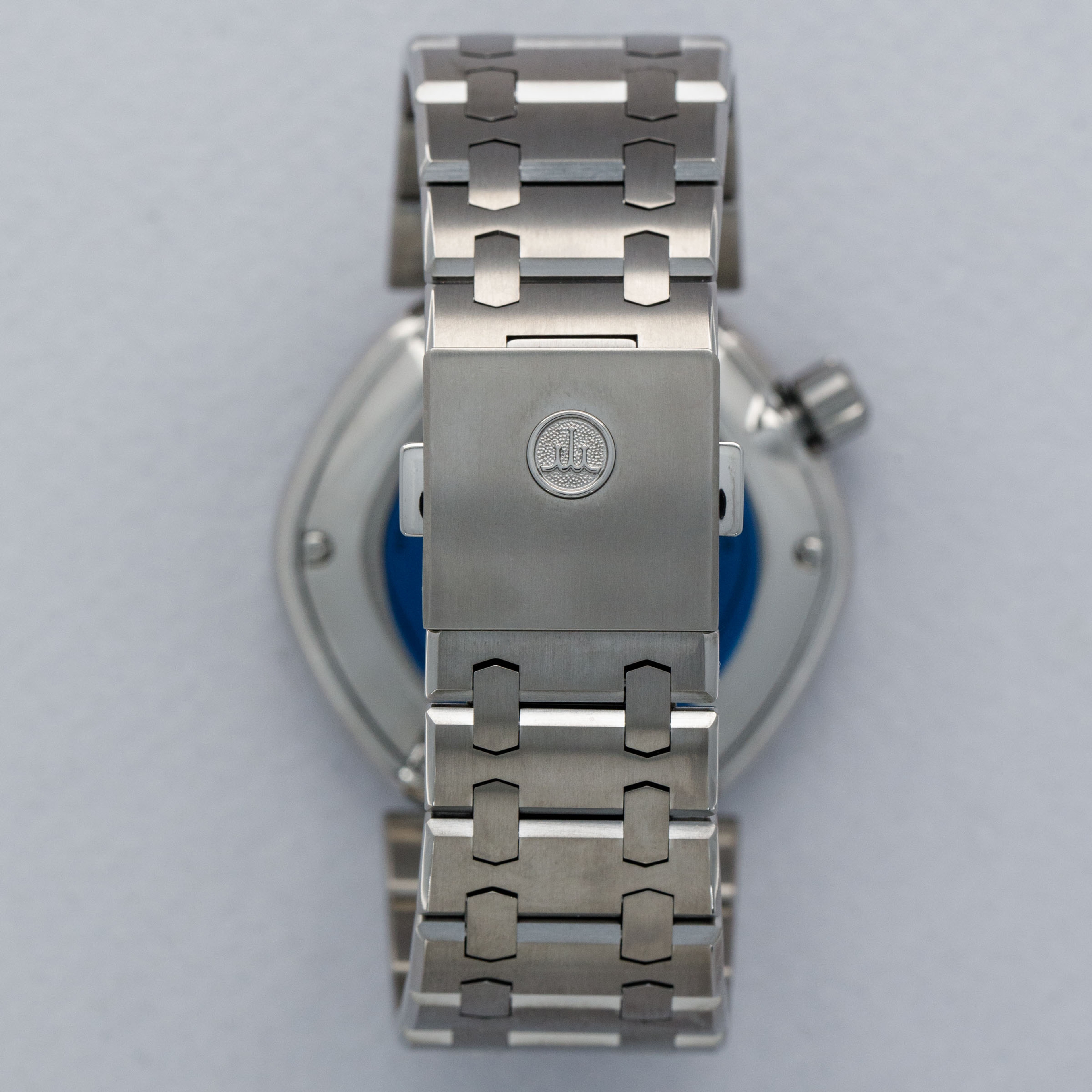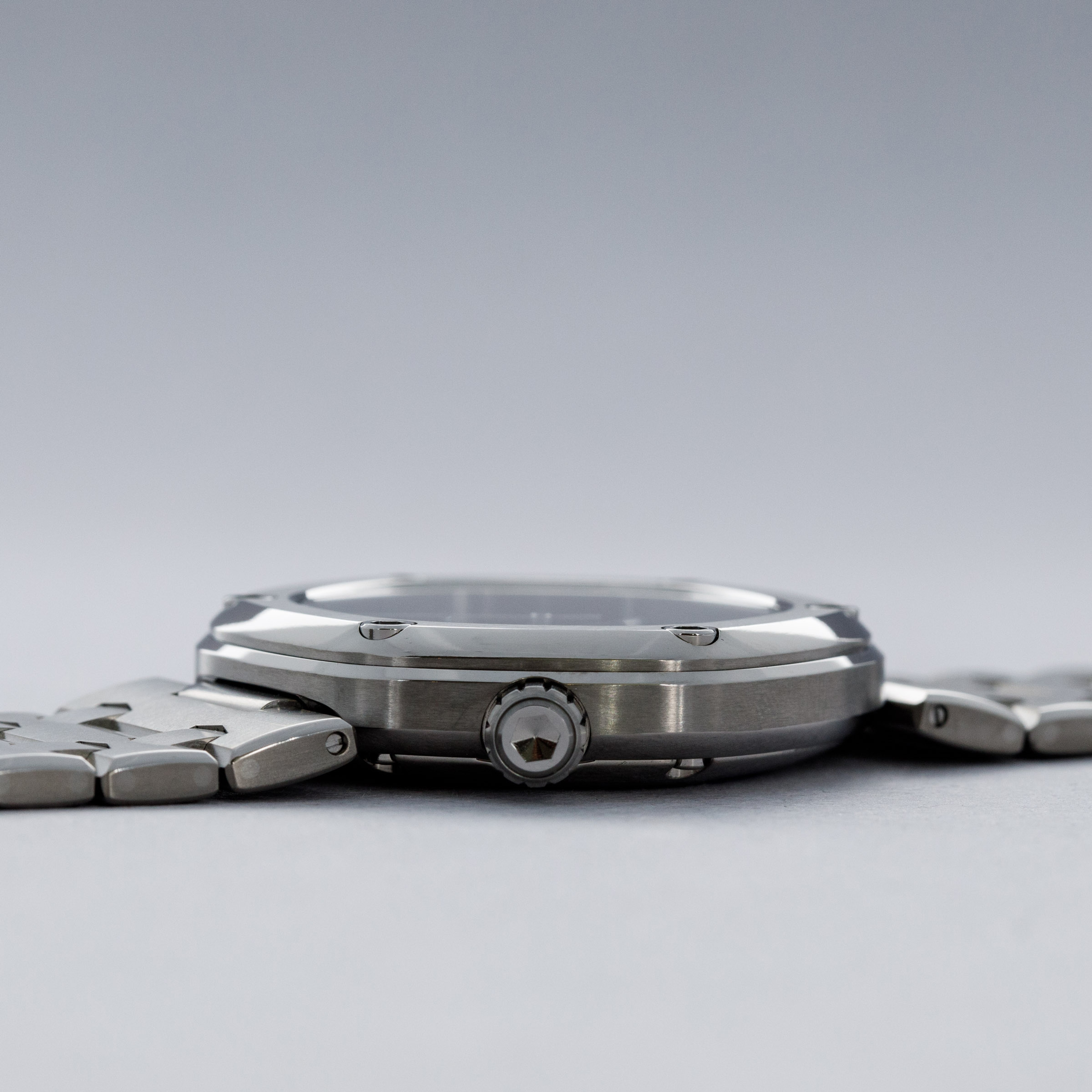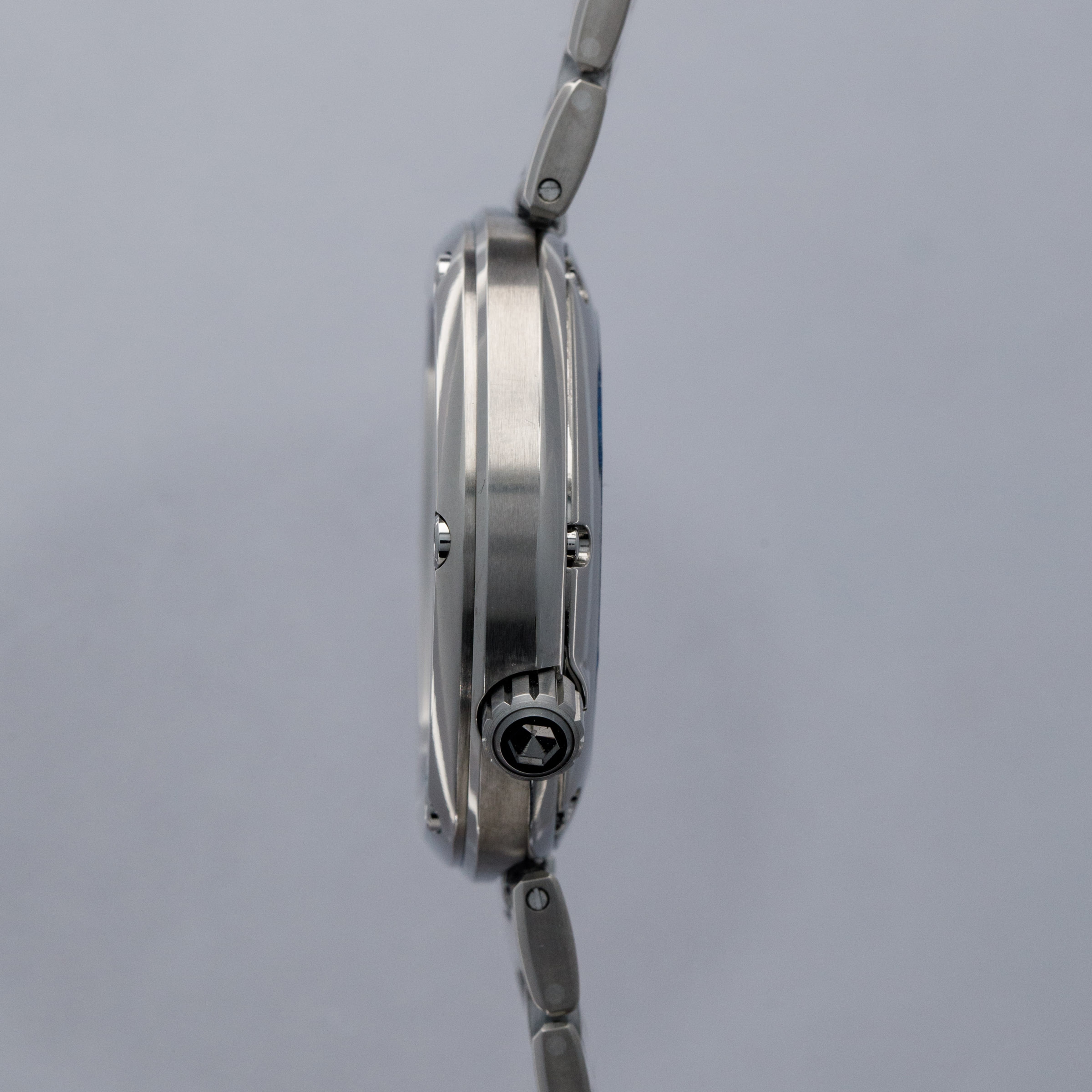 Imbued with Genta's signature touches like its angular case, exposed screws, and engraved dials, the Locomotive's winding crown at 4 o'clock and vendome lugs combine to make this design visually distinctive and unique on the wrist compared to his other famed designs.