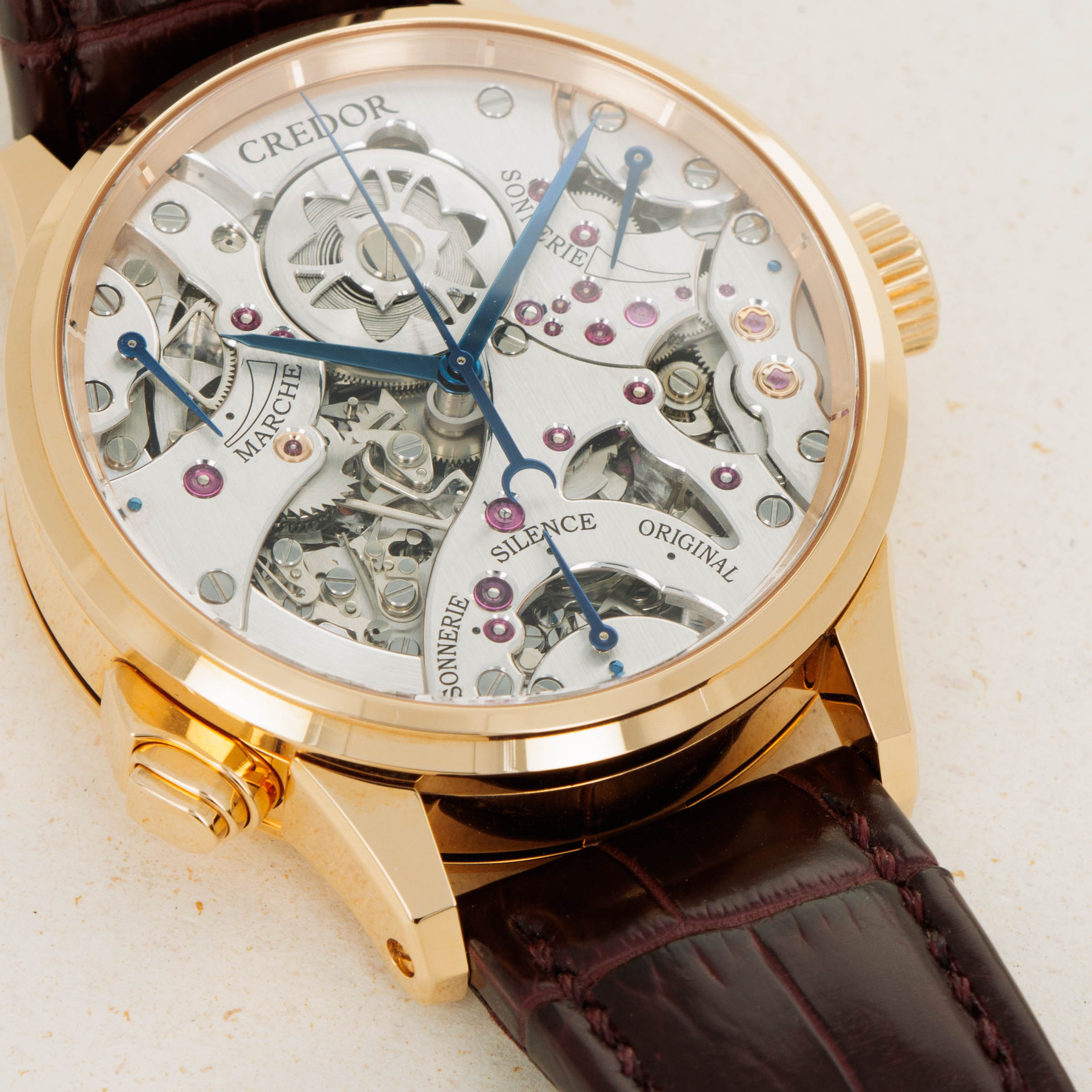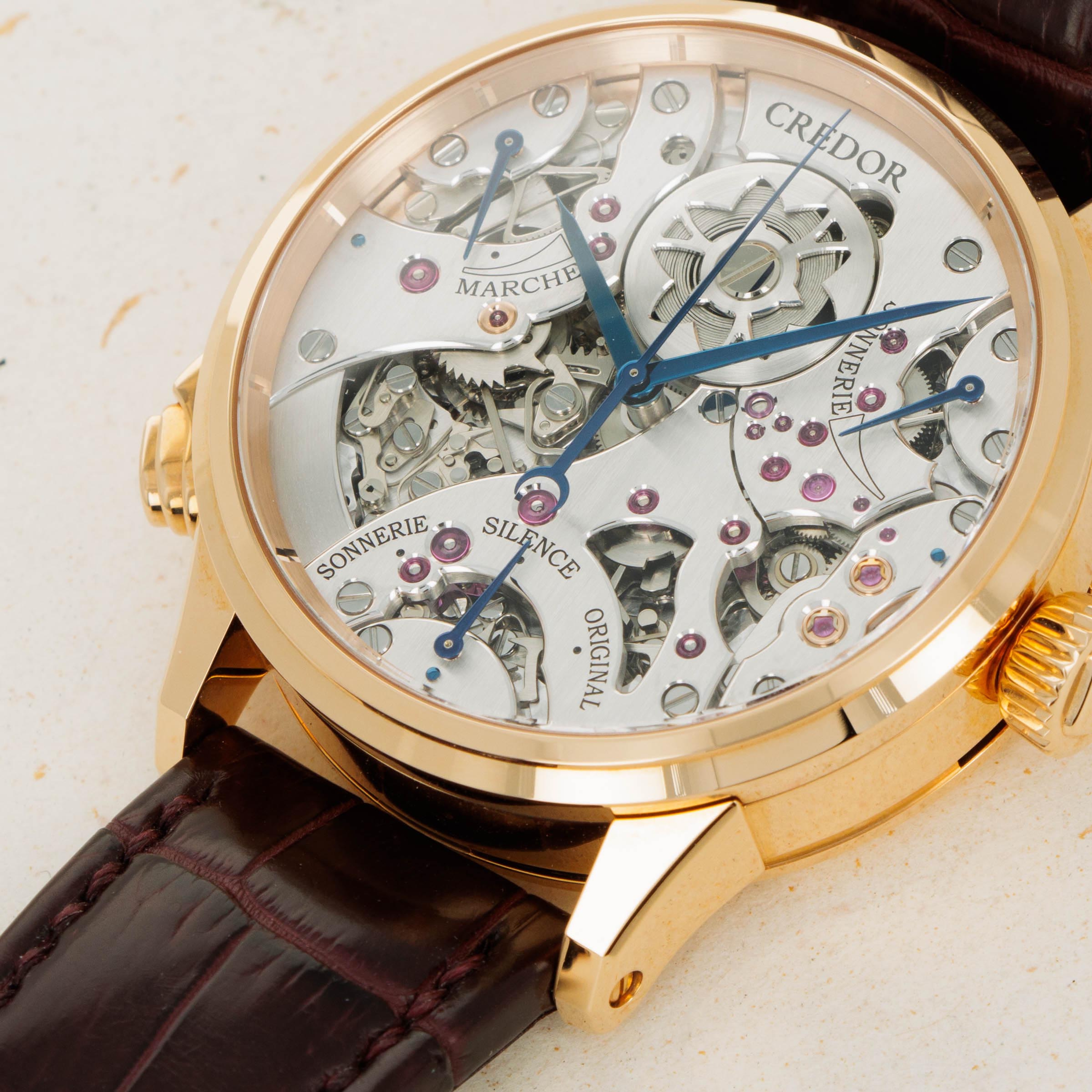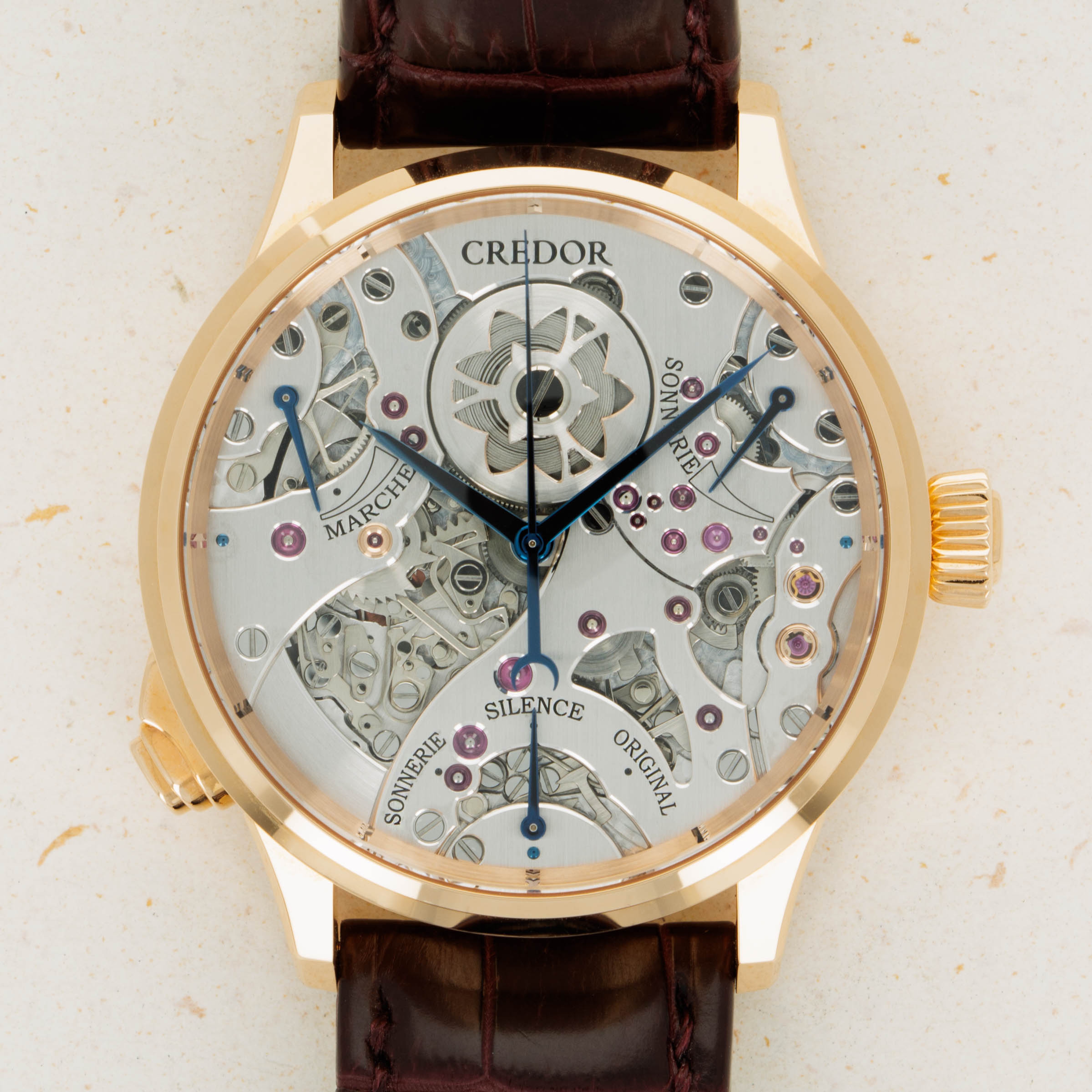 While they might be most notable for creating sturdy budget-friendly watches, Seiko have two sibling brands that exist only to punch up. The better-known Grand Seiko and the lesser-known Credor, whose tiny output allows them to create some of the finest watches on the market today in competition with brands like Patek Philippe, Vacheron Constantin and so forth. Introduced in 1974 as a collection of precious metal models, Credor began its life rather differently to how we know it today. Branded as "Crêt D'Or", meaning "Golden Crest" in French, it wasn't until 1978 that the brand was spun off into its own collection of watches and renamed "Credor" - as we know it today. Amongst the incredible watches this little-known subbrand produces, one is perhaps their most technically impressive, the Spring Drive Sonnerie ref. GBLQ998 that we have here. Launched in 2006, following the success of Grand Seiko’s Spring Drive movement, the GBLQ998 takes the Spring Drive movement cal. 7R series with its glide-motion hands and 48 hour power reserve and adds a sonnerie mechanism to it with its own separate barrel, resulting in two power reserves, as indicated by the dials at 10 and 2 o’clock on the GBLQ998’s fully skeletonized display that showcases all of the v GBLQ998’s 600 individual movement parts. A marvel of horological engineering, this is as much watchmaking as one could expect to see from any brand. With three modes, a “sonnerie” mode that chimes on the hour every hour, an “original” mode that chimes a three-strike chime at 3, 6, 9 and 12 o’clock and a disengaged mode, you are even spoiled for choice with how you get to enjoy this beauty.