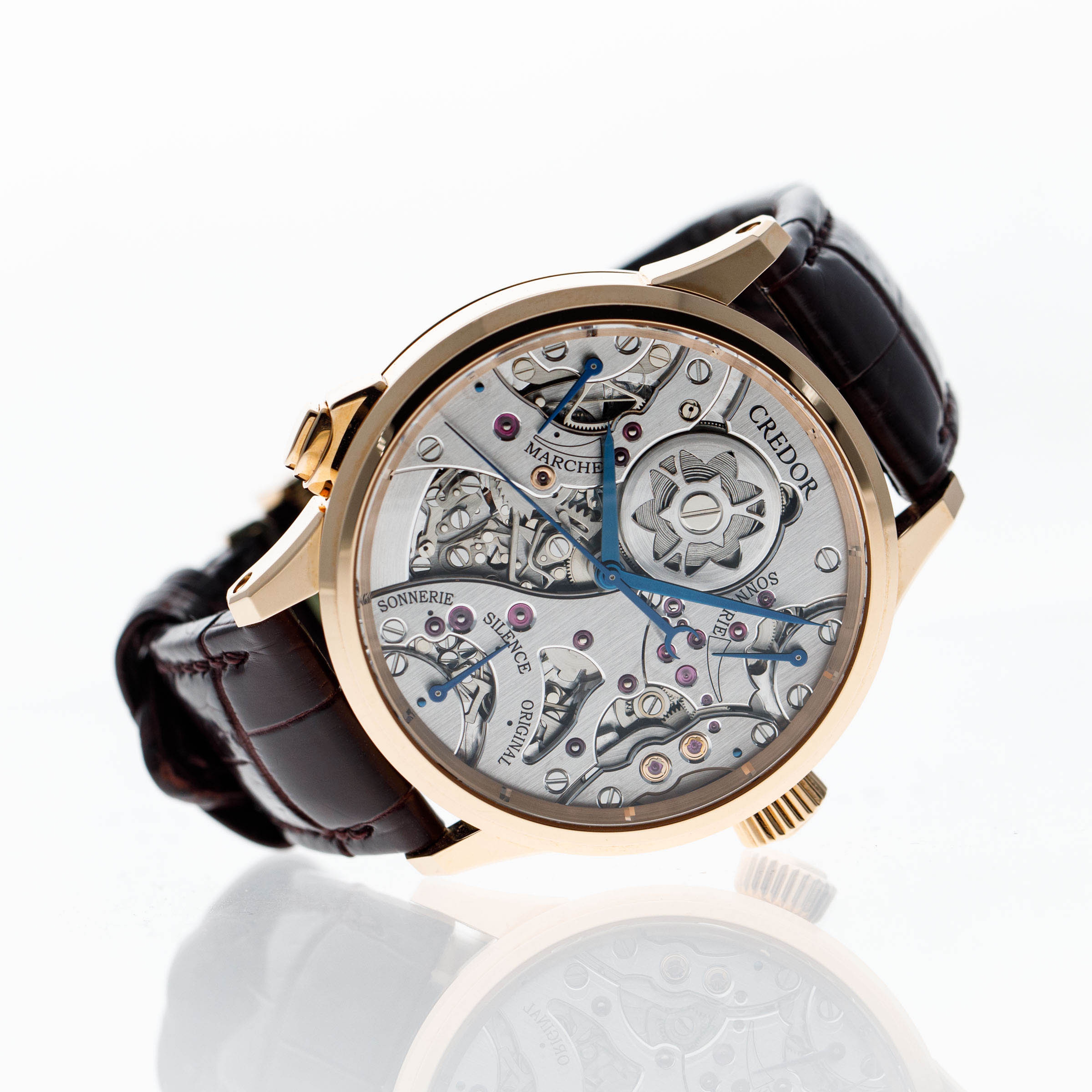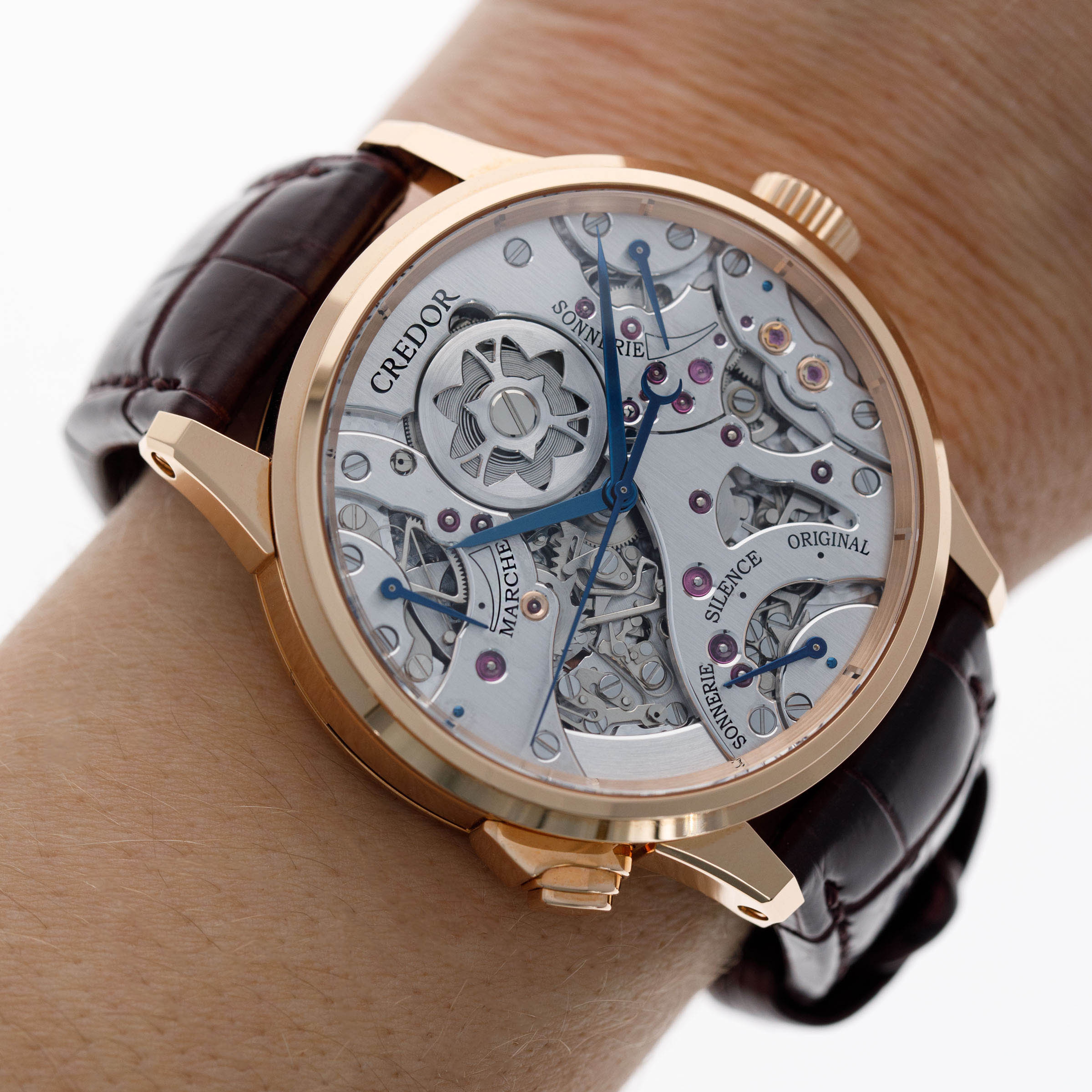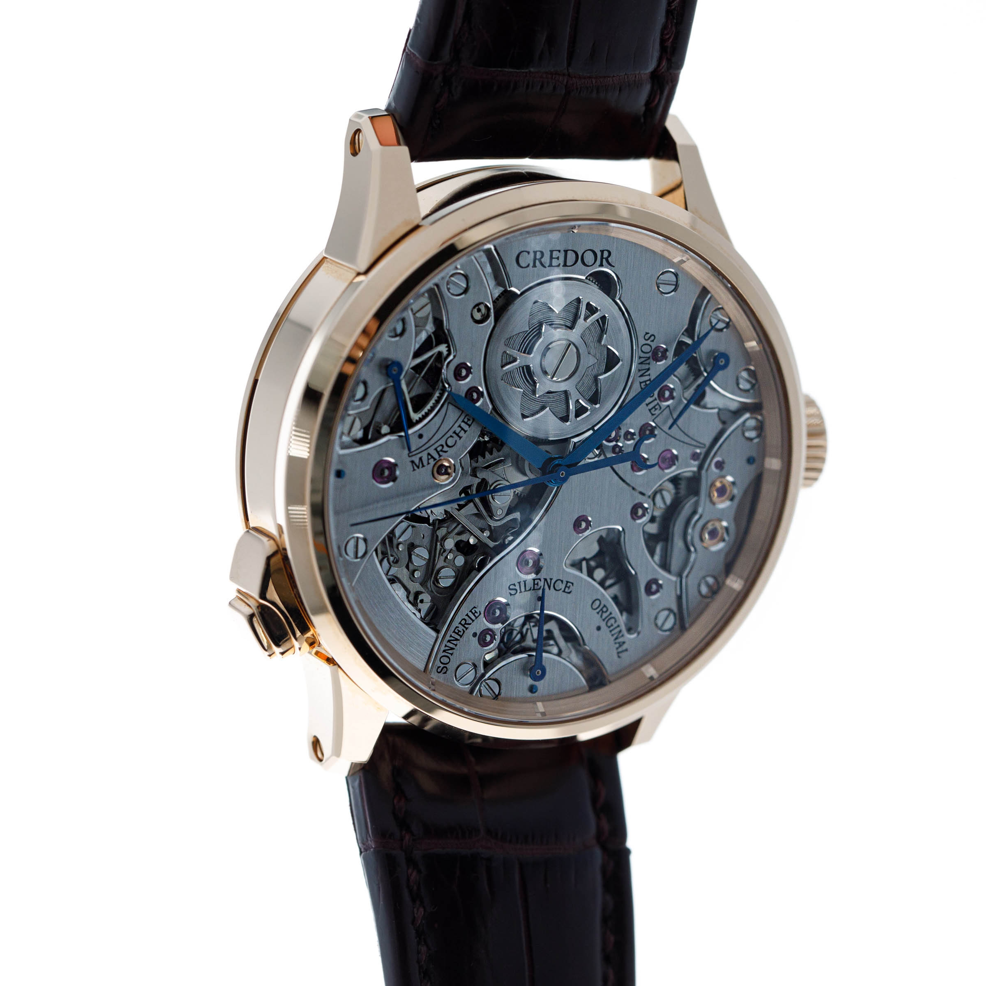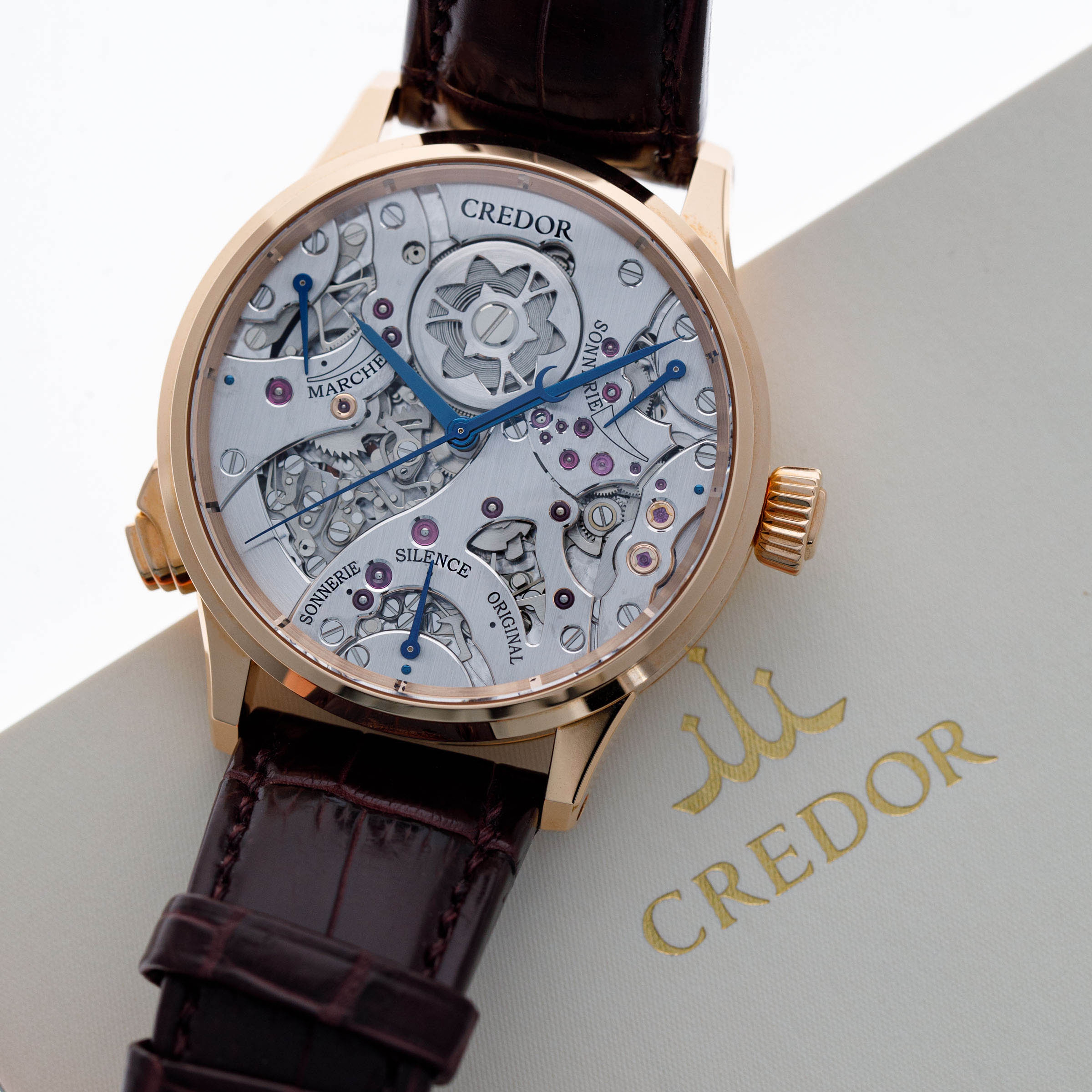 While they might be most notable for creating sturdy budget-friendly watches, Seiko have two sibling brands that exist only to punch up. The better-known Grand Seiko and the lesser-known Credor, whose tiny output allows them to create some of the finest watches on the market today in competition with brands like Patek Philippe, Vacheron Constantin and so forth. Introduced in 1974 as a collection of precious metal models, Credor began its life rather differently to how we know it today. Branded as "Crêt D'Or", meaning "Golden Crest" in French, it wasn't until 1978 that the brand was spun off into its own collection of watches and renamed "Credor" - as we know it today. Amongst the incredible watches this little-known subbrand produces, one is perhaps their most technically impressive, the Spring Drive Sonnerie ref. GBLQ998 that we have here. Launched in 2006, following the success of Grand Seiko’s Spring Drive movement, the GBLQ998 takes the Spring Drive movement cal. 7R series with its glide-motion hands and 48 hour power reserve and adds a sonnerie mechanism to it with its own separate barrel, resulting in two power reserves, as indicated by the dials at 10 and 2 o’clock on the GBLQ998’s fully skeletonized display that showcases all of the v GBLQ998’s 600 individual movement parts. A marvel of horological engineering, this is as much watchmaking as one could expect to see from any brand. With three modes, a “sonnerie” mode that chimes on the hour every hour, an “original” mode that chimes a three-strike chime at 3, 6, 9 and 12 o’clock and a disengaged mode, you are even spoiled for choice with how you get to enjoy this beauty.