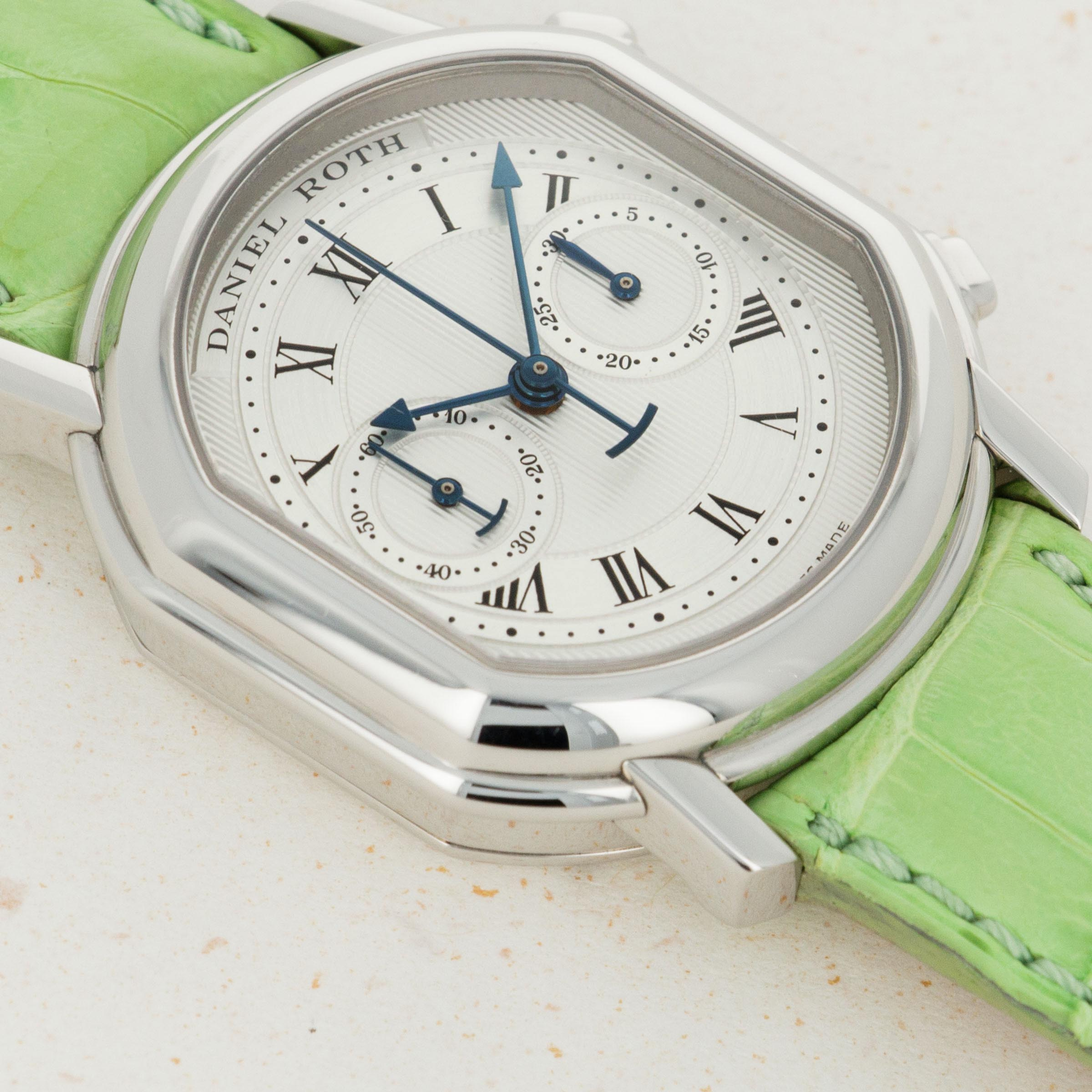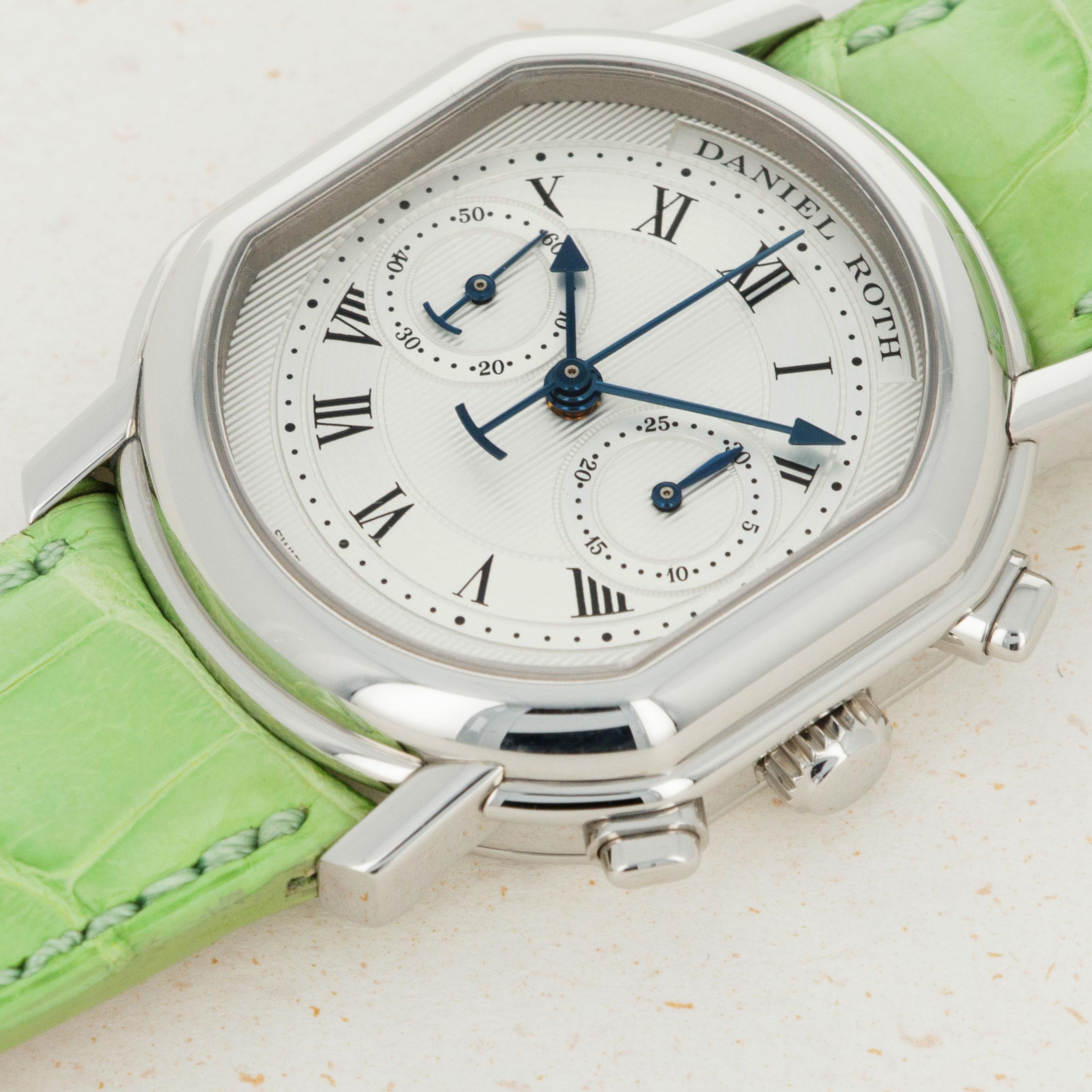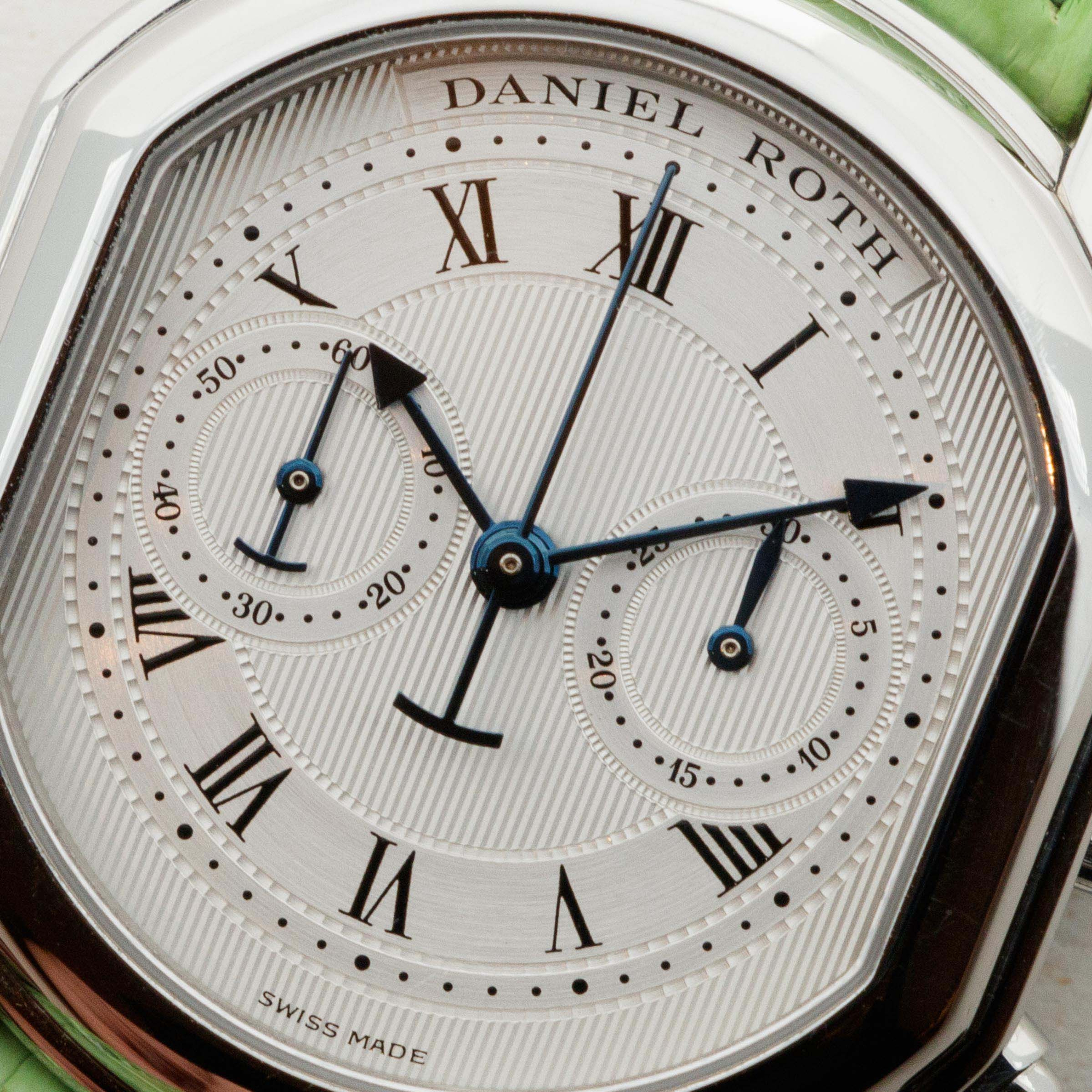 Founded in 1989, Daniel Roth is long-established as one of the early entrants in the independent watchmaking space that has since ballooned with brands like Urkwerk, MB&F, and Richard Mille launching from the foundations that Daniel Roth laid. With their distinctive styling, fresh take on design, and technical prowess, the watchmaker quickly rose to fame. An emblematic example of their watchmaking style, this stainless steel Chronograph model features a stunning silver dial with vertical guilloche and concentric satin-finished chronograph counters and chapter rings. Pairing distinctive blued steel hands with heritage-inspired black Roman numerals, this Chronograph’s styling is unique in that it blends design cues rooted in watchmaking tradition with Daniel Roth's own innovative take on the industry’s processes, namely through their signature ellipsocurvex case - much like Richard Mille and Franck Muller's use of the tonneau case.