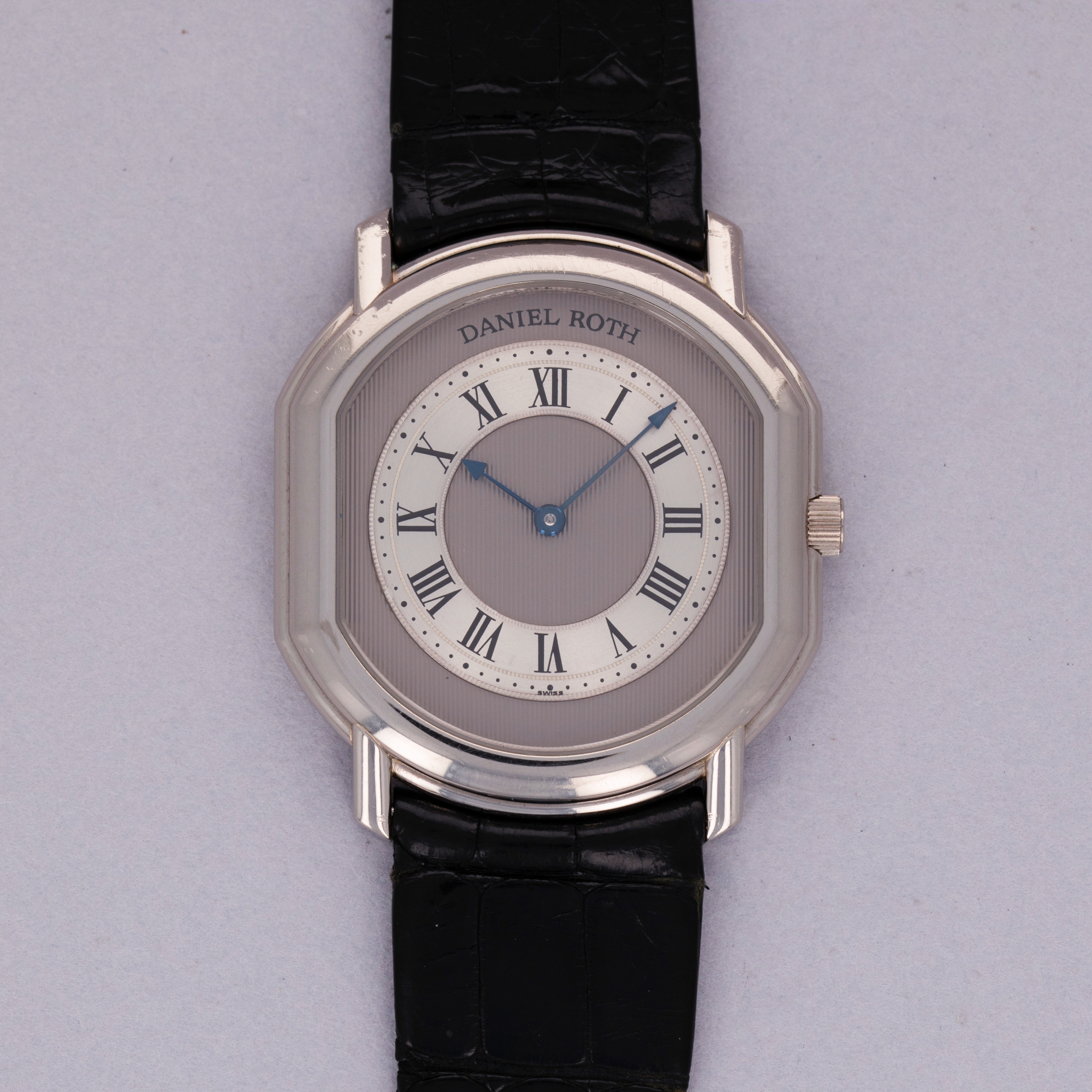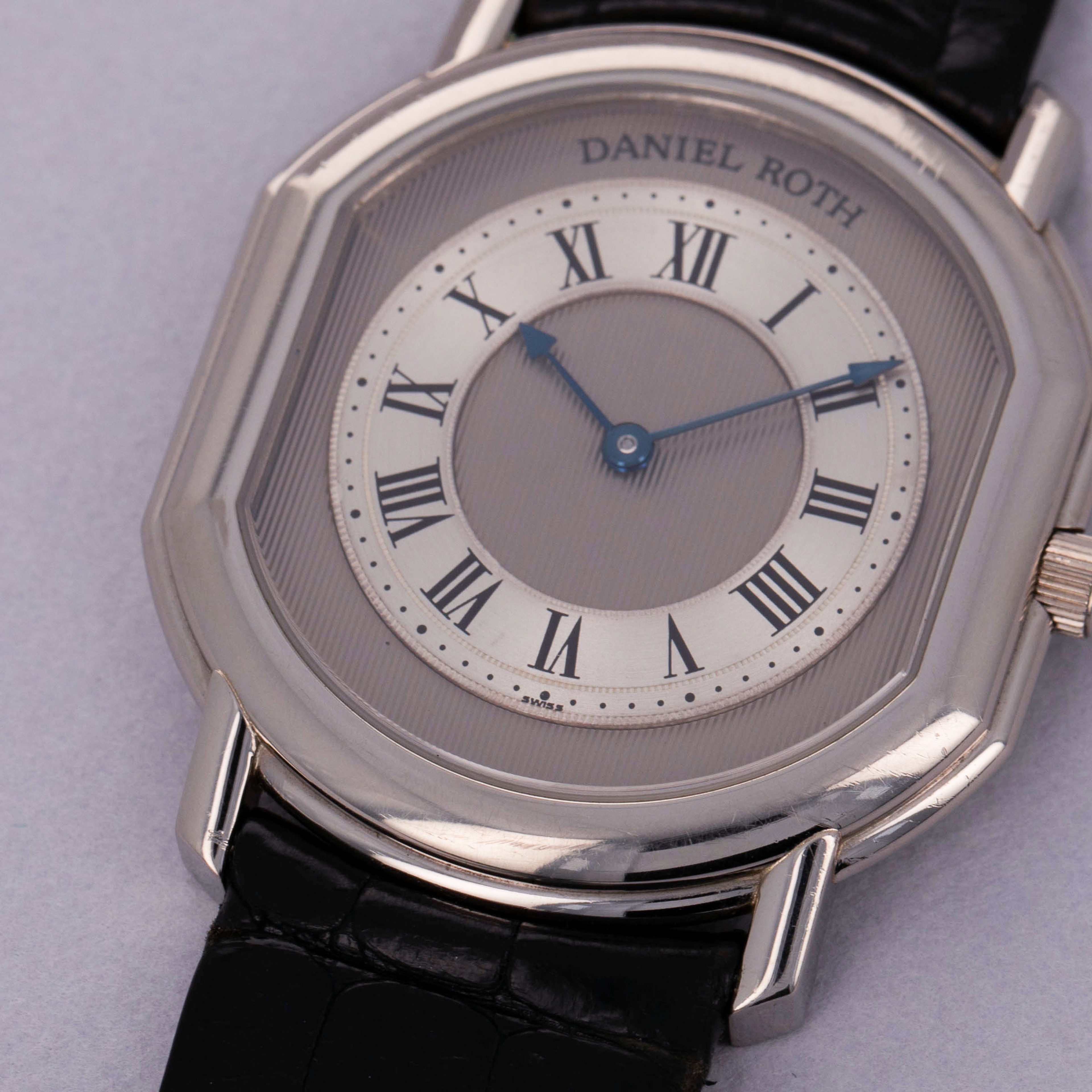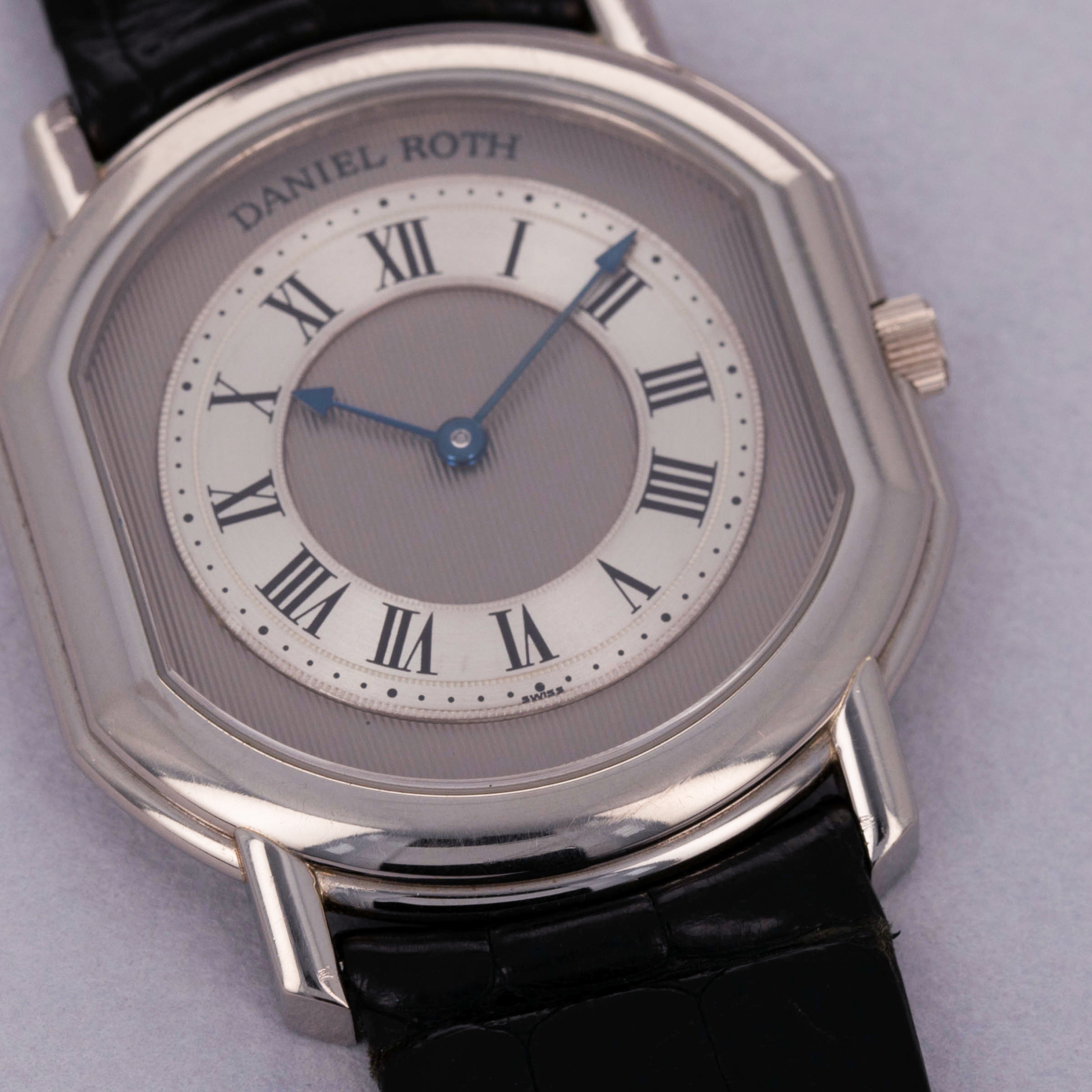 Founded in 1989 as one of the early entrants within the modern field of independent watchmaking, Daniel Roth is a watchmaker that quickly gained the plaudits of industry insiders and collectors alike thanks to their stunning creations, fine watchmaking, and dedication to artisanal crafts. With an impressive array of high complication timepieces under their belt, the brand was acquired by BVLGARI in 2000 as the famed Italian jeweler made their way into the watchmaking industry, a move that has since paid off. A cult icon still to this day, Daniel Roth symbolizes the majesty within a unique and distinctive aesthetic - an aesthetic that continues to make their timepieces beloved by collectors around the globe. Here we have a stunning Daniel Roth C107 from the early 1990s, the brand’s first foray into automatic movements. Powered by the Frederic Piguet cal. 71 movement, one of the thinnest automatic movements ever produced, the C107’s 18kt white gold case is known as the ‘extra plat’ which means extra flat in French. Boasting a stunning two-tone silver and grey dial with vertical pinstripe guilloche, concentric engraving along the chapter rings and Roman numeral hour markers, this dial is filled with Daniel Roth’s signature aesthetic while still breaking from convention as a wonderful piece of early independent watchmaking.