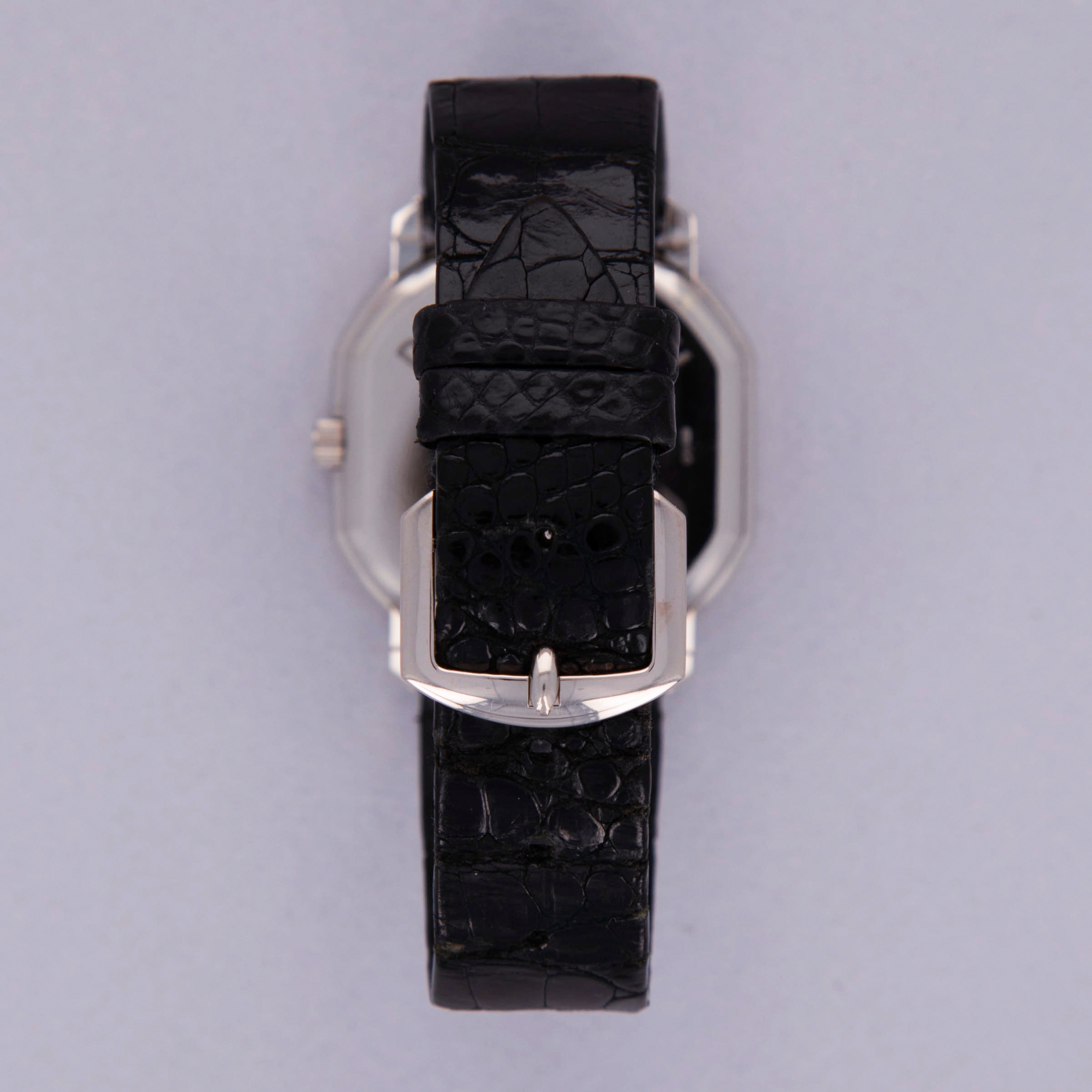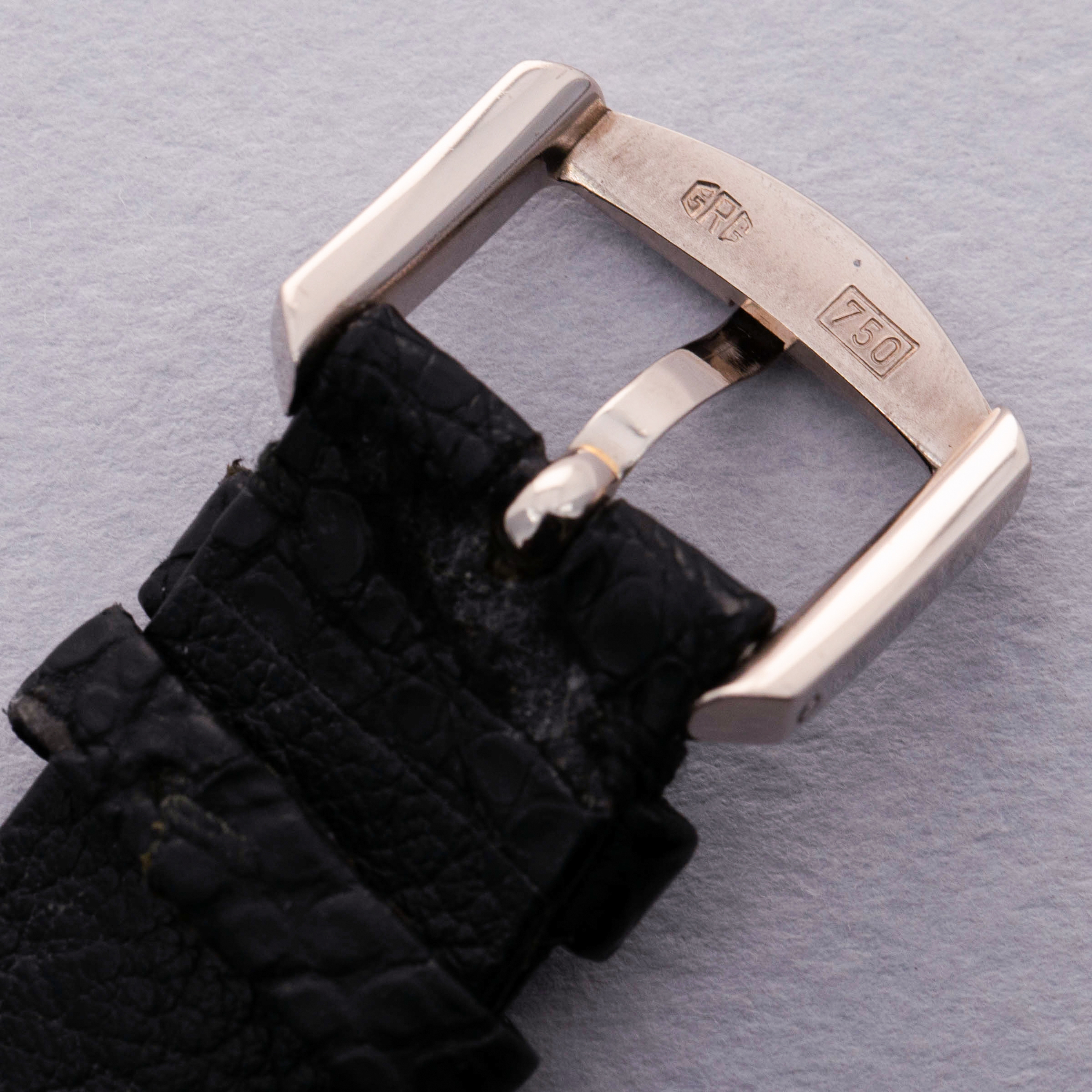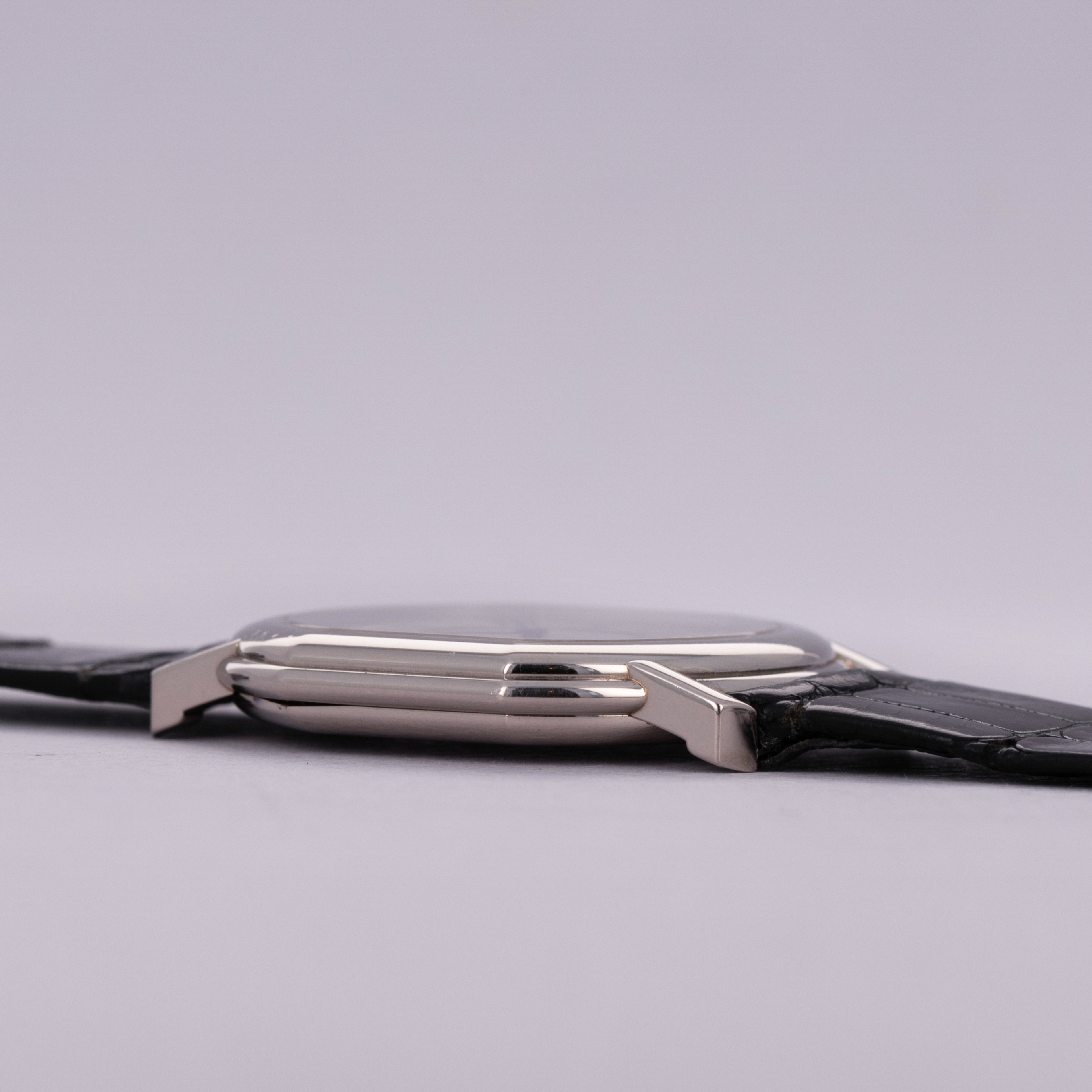 Watch is in very good overall condition. Case has some visible surface wear, with some small scratches and marks visible along the case and lugs, primarily around the upper left lug and bezel. Caseback engravings are strong, and the gold hallmarks are crisp and fully visible. The original pinstripe dial with guilloche center is in excellent condition with some minor signs of aging. Watch comes with its original 18k WG buckle.