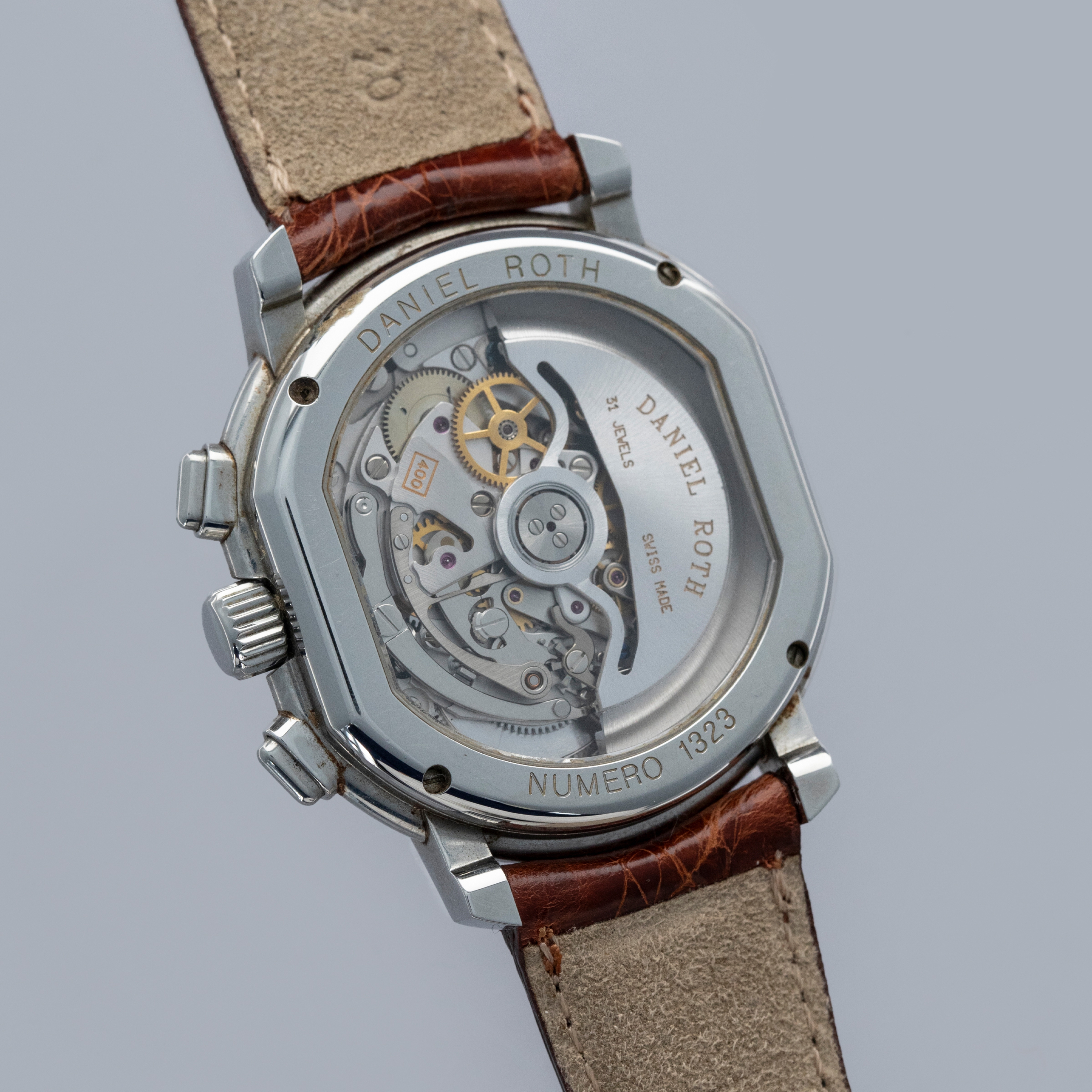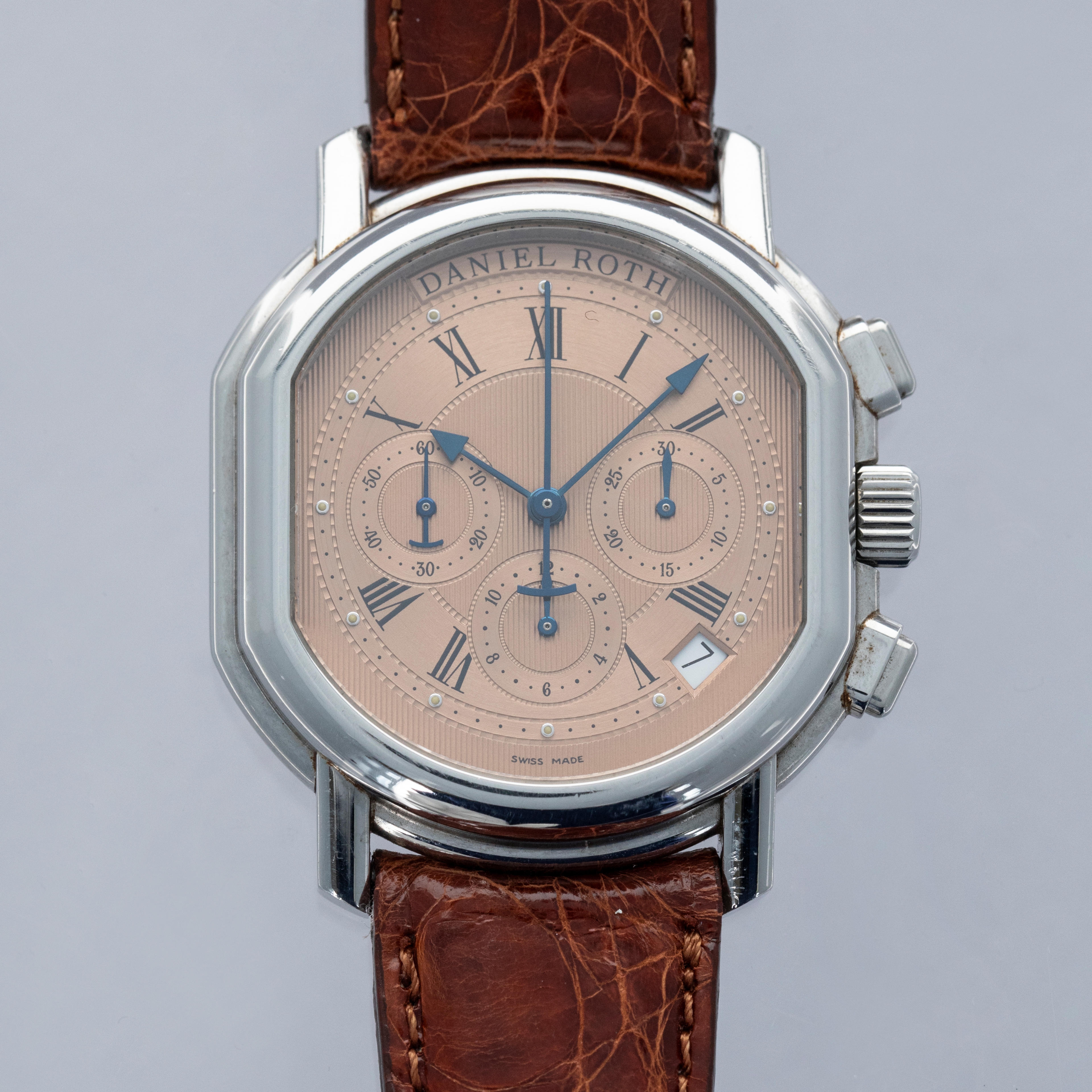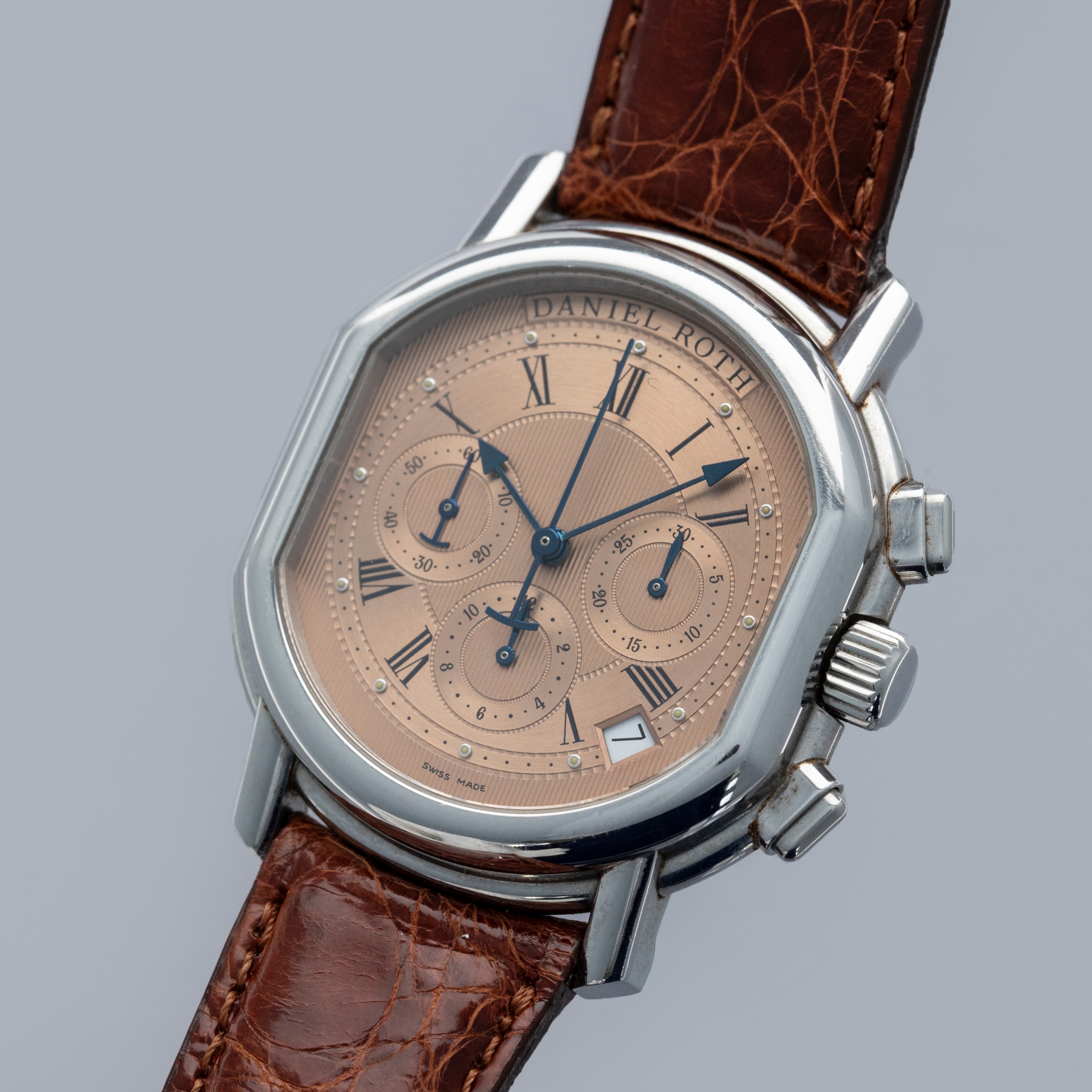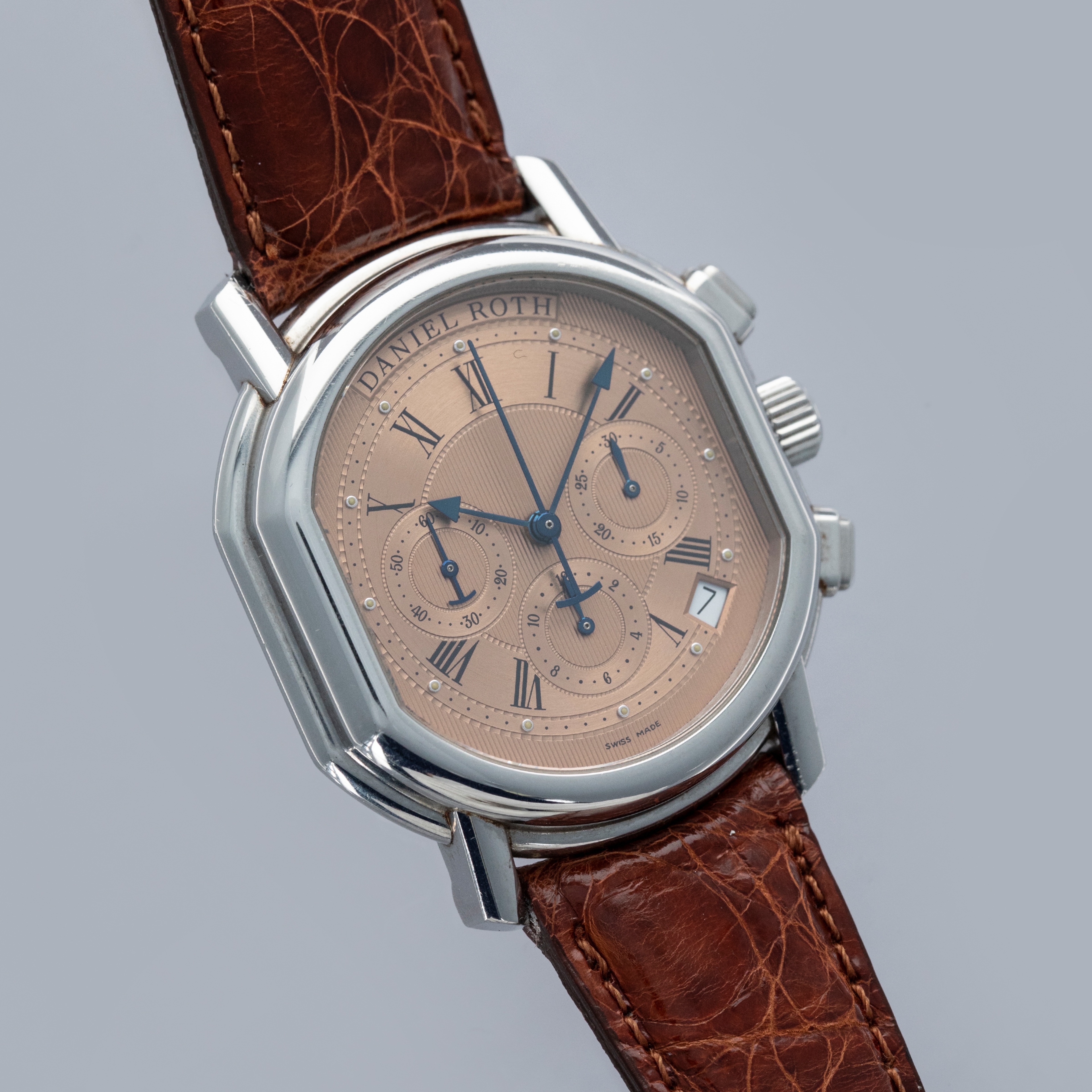 Founded in 1989, Daniel Roth is long-established as one of the early entrants in the independent watchmaking space that has since ballooned with brands like Urkwerk, MB&F, and Richard Mille launching from the foundations that Daniel Roth laid. With their distinctive styling, unique take on design, and technical prowess, the watchmaker quickly rose to fame. An emblematic example of their watchmaking aesthetic, this stainless steel Masters Chronograph model features an intriguingly complex salmon dial with a vertical guilloche pinstripe finish alongside concentric satin-finished chronograph counters and chapter rings and a subtle wavy texture that separates the various subdials and finishes. Furthermore, the Masters Chronograph also includes a date aperture at 4:30, which adds to the dial’s information-dense layout. Pairing distinctive blued steel hands with heritage-inspired black Roman numerals and inscriptions, this Masters Chronograph’s styling is unique in that it blends design cues rooted in watchmaking tradition with Daniel Roth's own innovative take on the industry’s processes, namely through their signature ellipsocurvex case - much like Richard Mille and Franck Muller's use of the tonneau case. With its stepped bezel, a mix of angles and rounded surfaces, and pronounced pushers, it is a perfectly styled case that complements this example’s salmon dial perfectly.