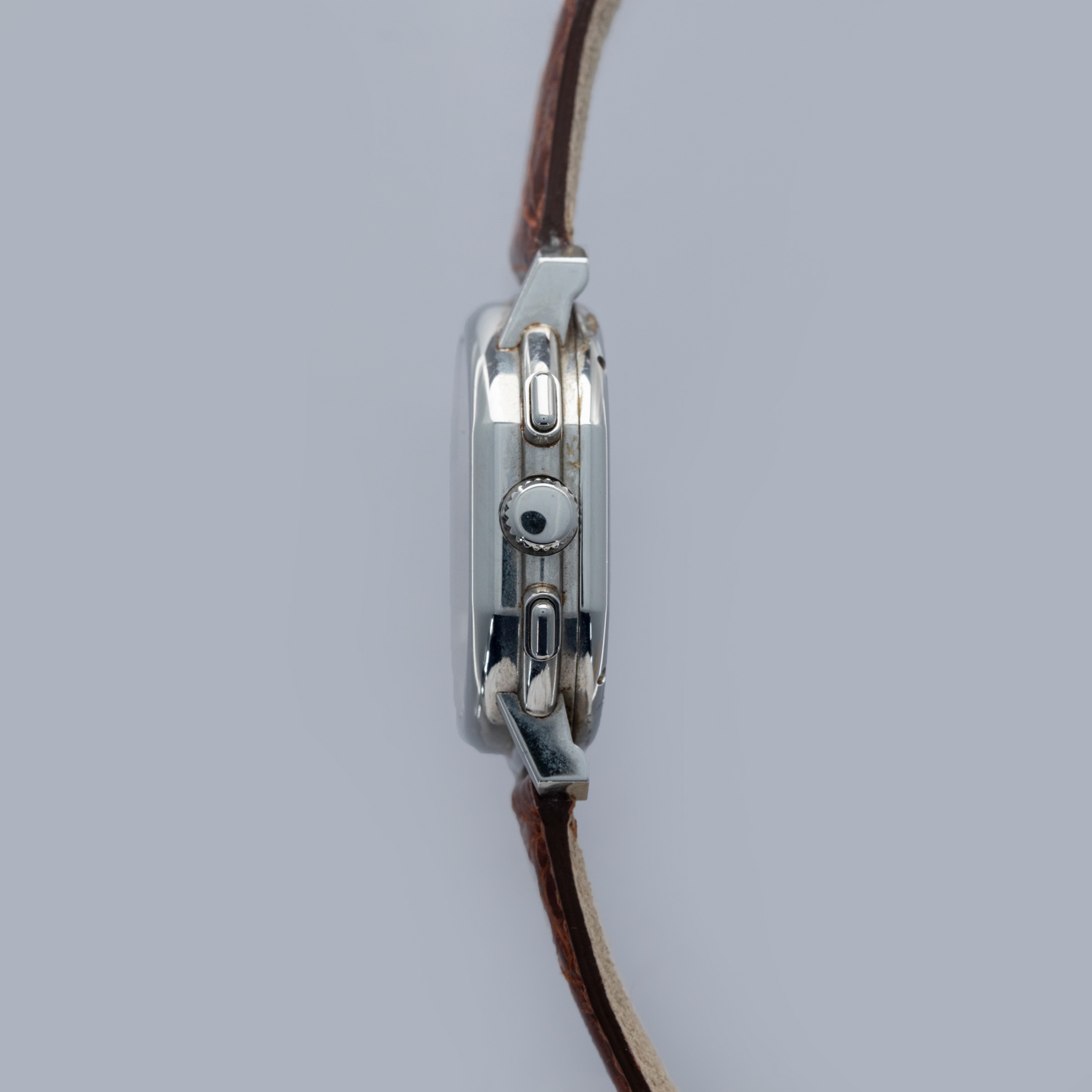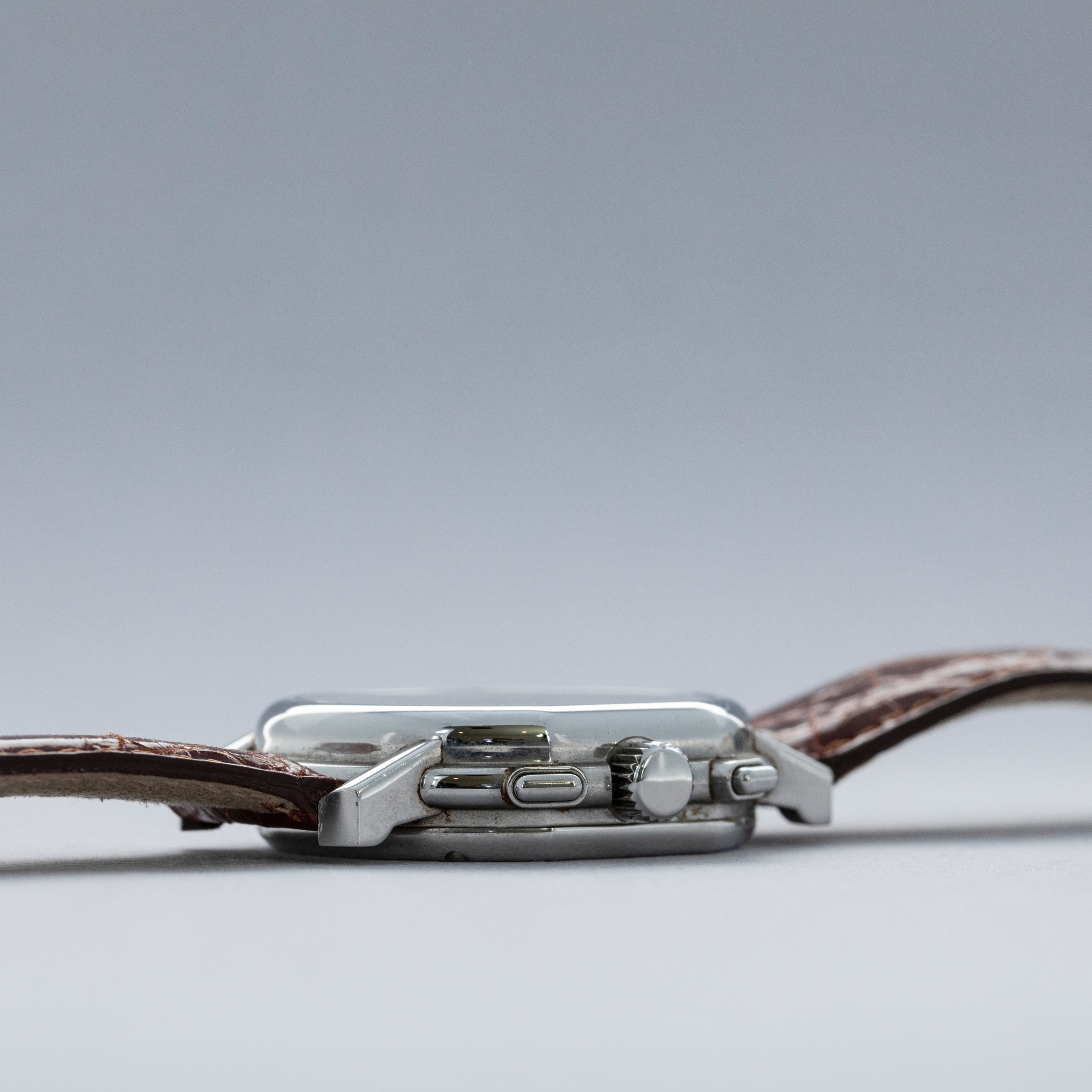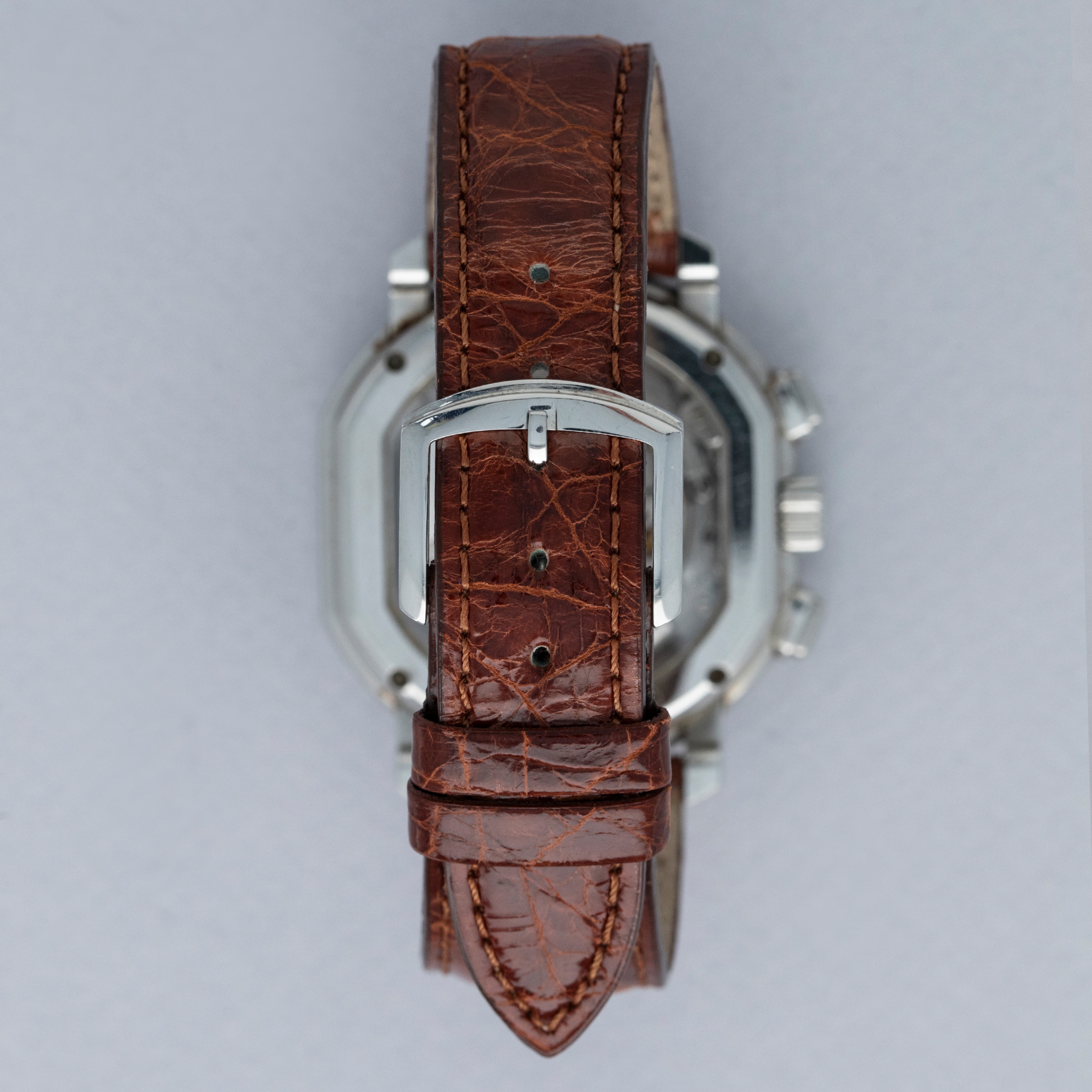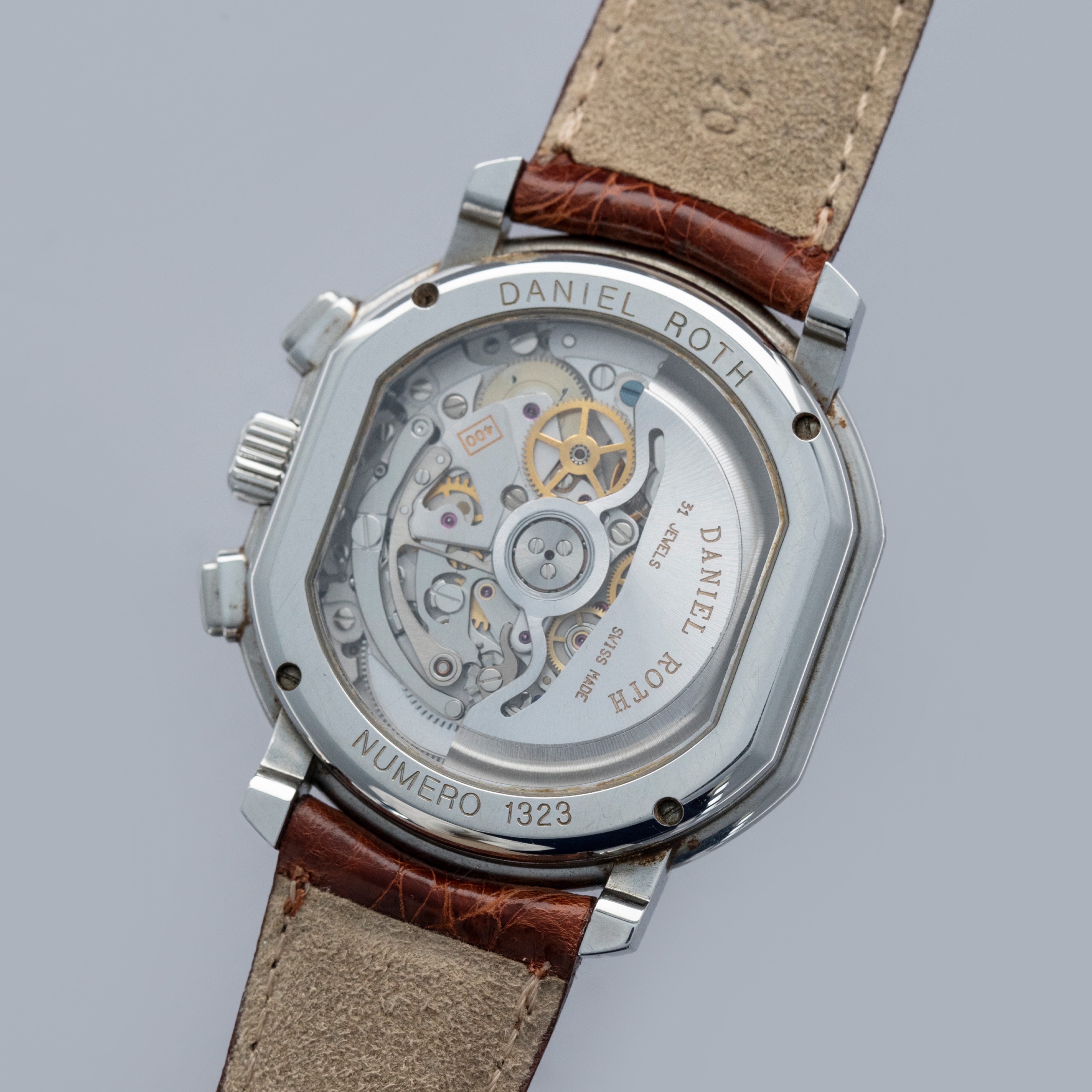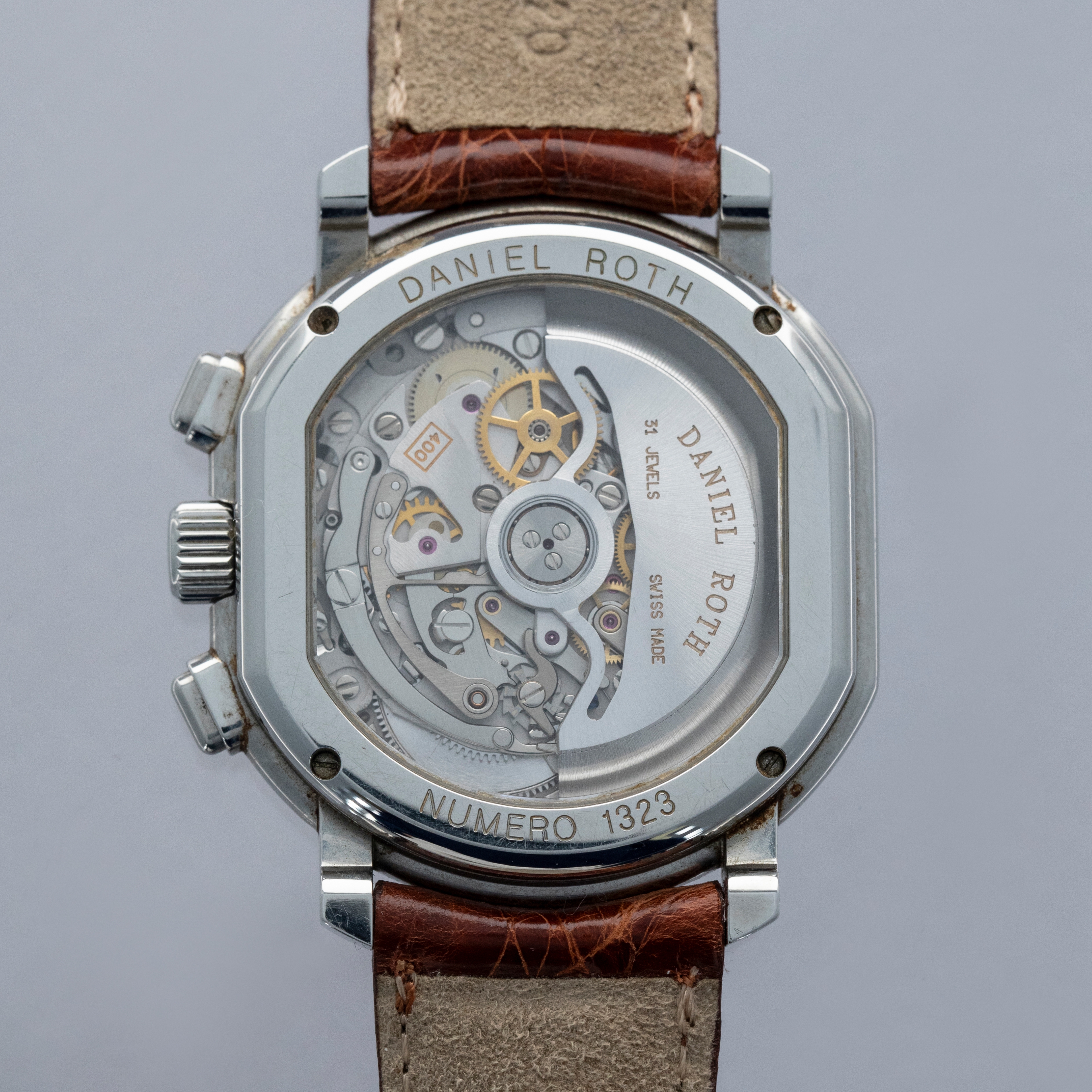 Founded in 1989, Daniel Roth is long-established as one of the early entrants in the independent watchmaking space that has since ballooned with brands like Urkwerk, MB&F, and Richard Mille launching from the foundations that Daniel Roth laid. With their distinctive styling, unique take on design, and technical prowess, the watchmaker quickly rose to fame. An emblematic example of their watchmaking aesthetic, this stainless steel Masters Chronograph model features an intriguingly complex salmon dial with a vertical guilloche pinstripe finish alongside concentric satin-finished chronograph counters and chapter rings and a subtle wavy texture that separates the various subdials and finishes. Furthermore, the Masters Chronograph also includes a date aperture at 4:30, which adds to the dial’s information-dense layout. Pairing distinctive blued steel hands with heritage-inspired black Roman numerals and inscriptions, this Masters Chronograph’s styling is unique in that it blends design cues rooted in watchmaking tradition with Daniel Roth's own innovative take on the industry’s processes, namely through their signature ellipsocurvex case - much like Richard Mille and Franck Muller's use of the tonneau case. With its stepped bezel, a mix of angles and rounded surfaces, and pronounced pushers, it is a perfectly styled case that complements this example’s salmon dial perfectly.