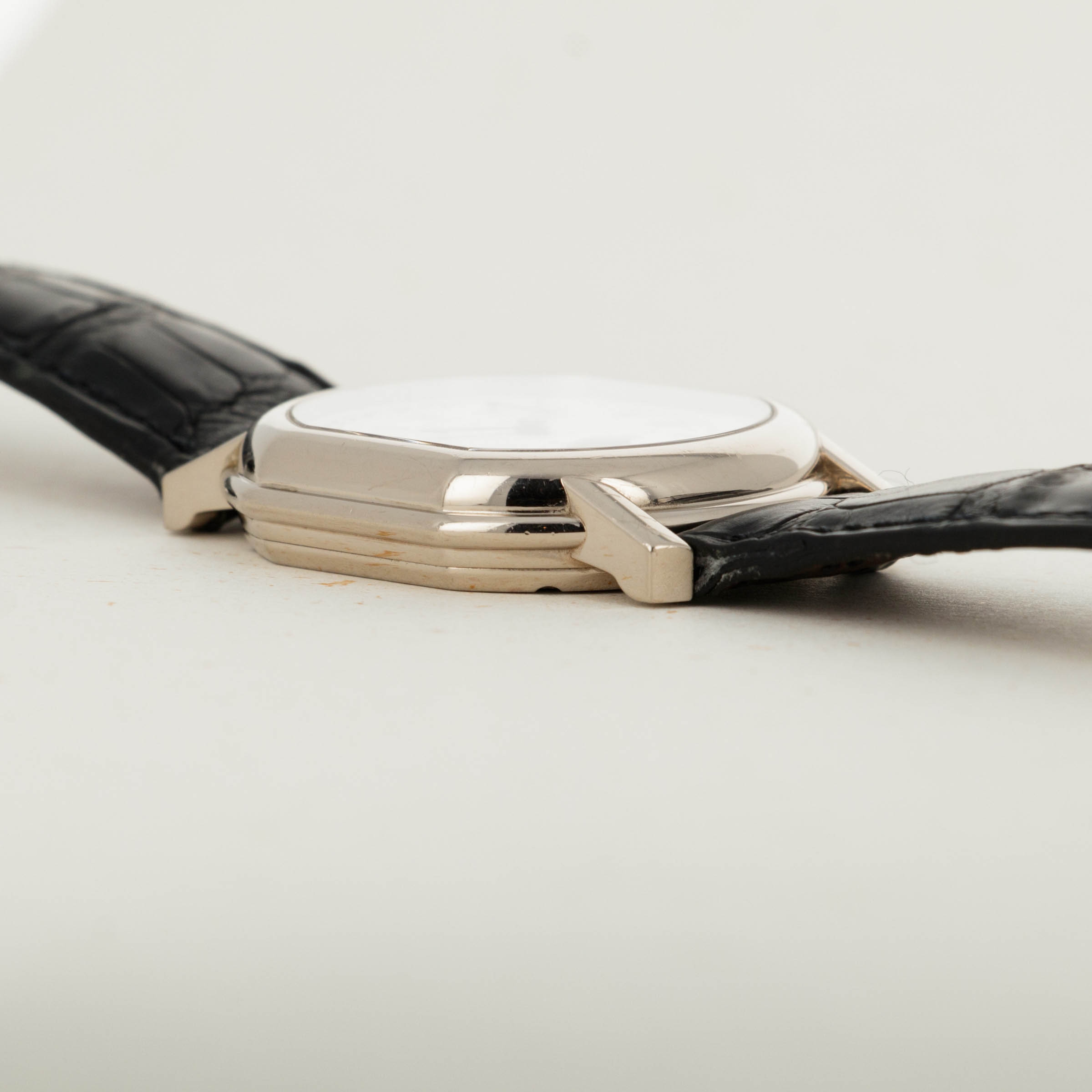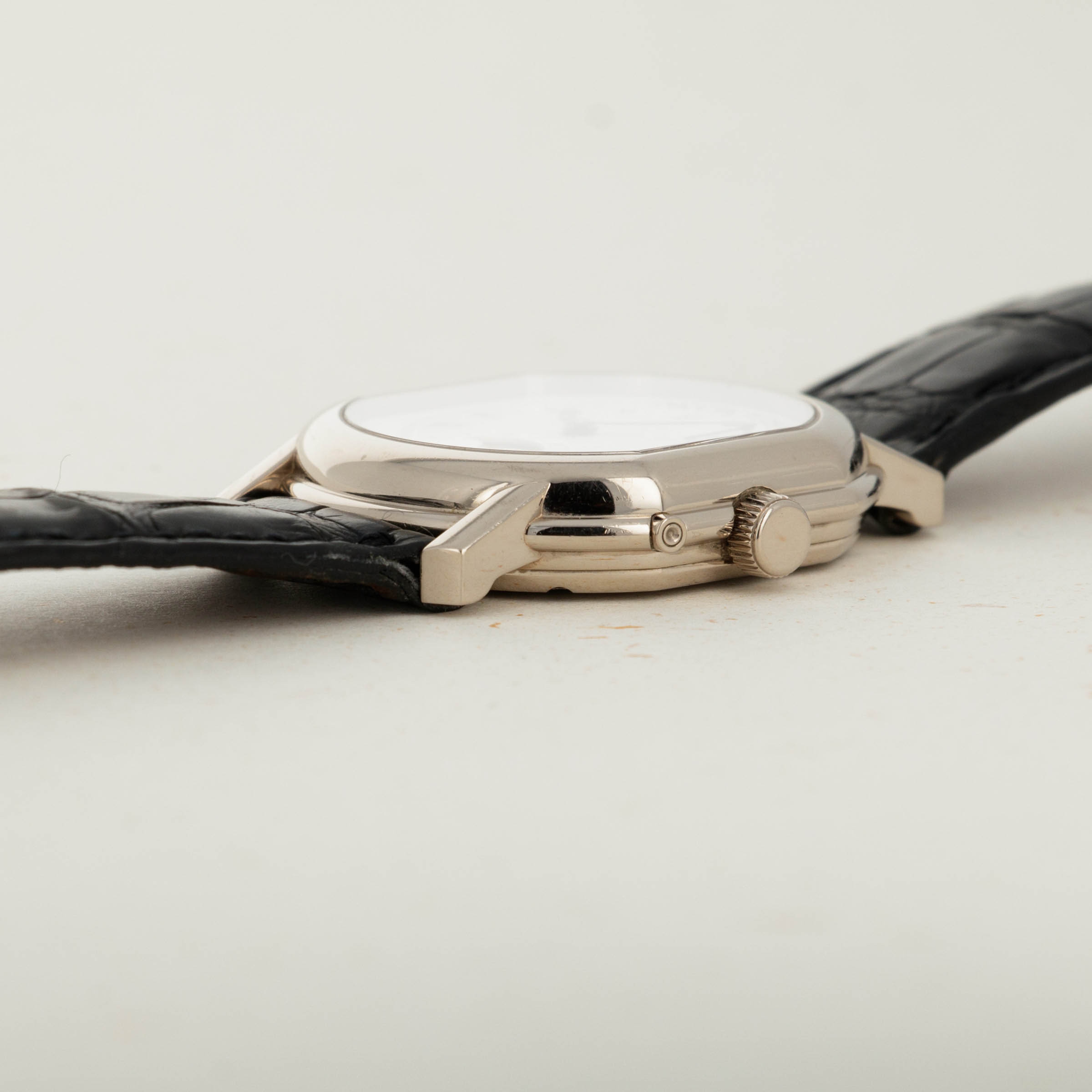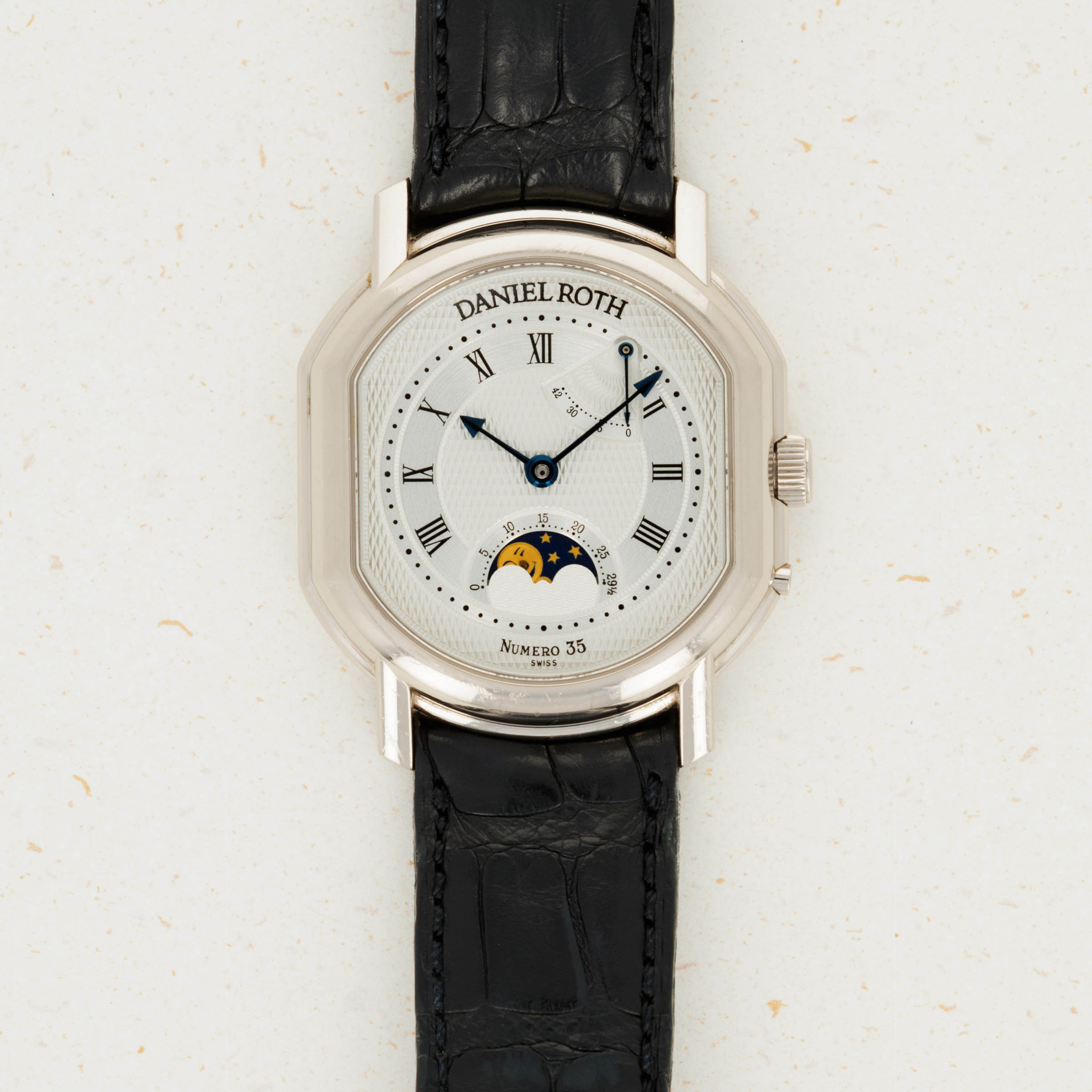 Founded in 1989, Daniel Roth is long-established as one of the early entrants in the independent watchmaking space that has since ballooned with brands like Urkwerk, MB&F, and Richard Mille launching from the foundations that Daniel Roth laid. With their distinctive styling, fresh take on design, and technical prowess, the watchmaker quickly rose to fame. Launched in 2000 as a limited-edition collection of 50 pieces to celebrate the turn of the Millenium prior to the brand's acquisition by Bulgari, this stunning piece is an emblematic example of Daniel Roth's watchmaking style. Featuring an 18kt white gold case, this Ellipsocurvex Moonphase features a stunning silver dial with pyramidal diamond-shaped engravings and concentric satin-finishings throughout its surface. Highlighting its two complications, a moonphase indicator and power-reserve indicator are two unique wavy textures that stand out with stunning effect. Pairing distinctive blued steel hands with heritage-inspired black Roman numerals and a blue and gold moon phase, this timepiece’s styling is unique in that it blends design cues rooted in watchmaking tradition with Daniel Roth's own innovative take on the industry’s processes; namely through their signature ellipsocurvex case - much like how Richard Mille and Franck Muller's use of the tonneau case has become an emblematic piece of their design and aesthetic too.